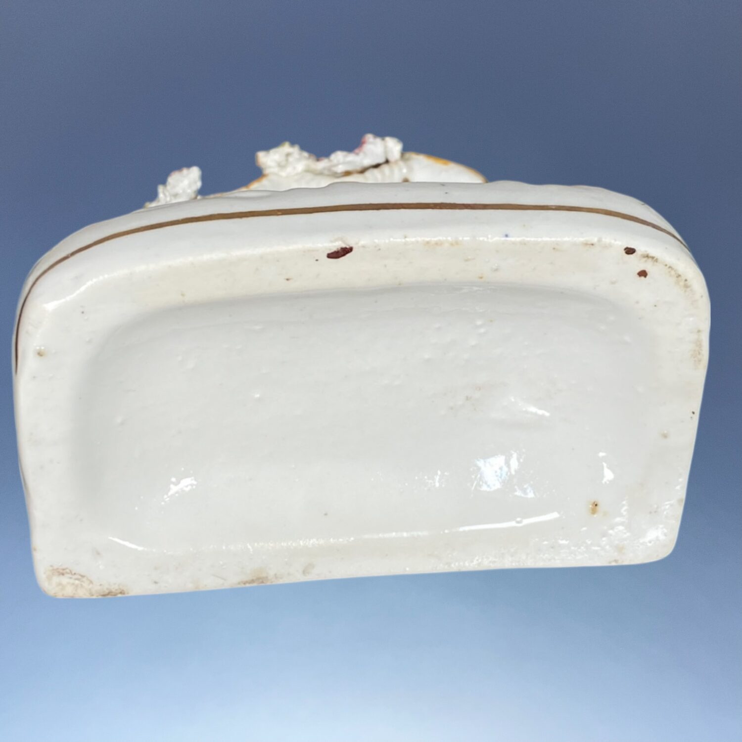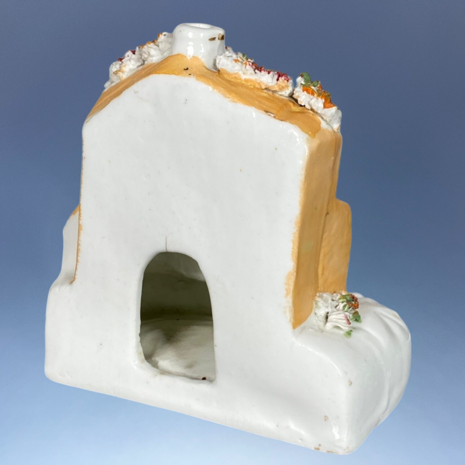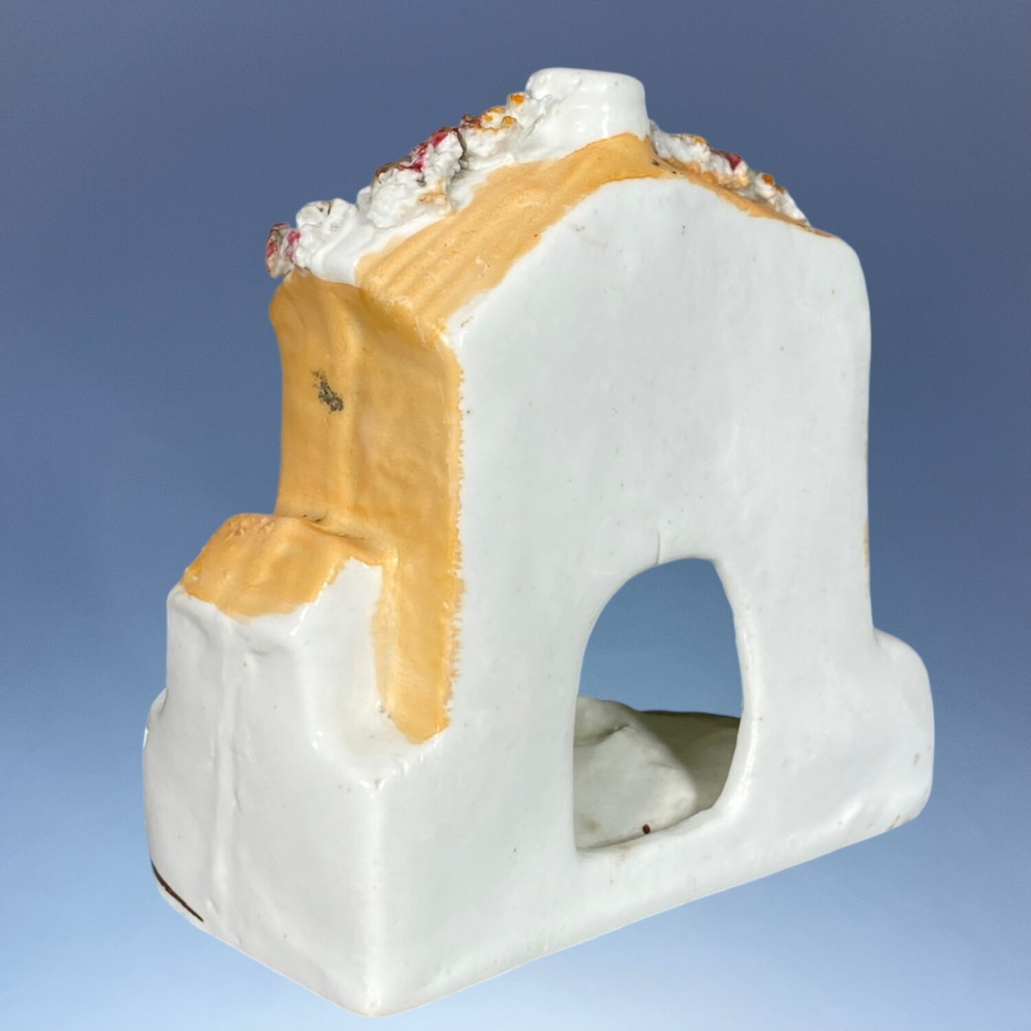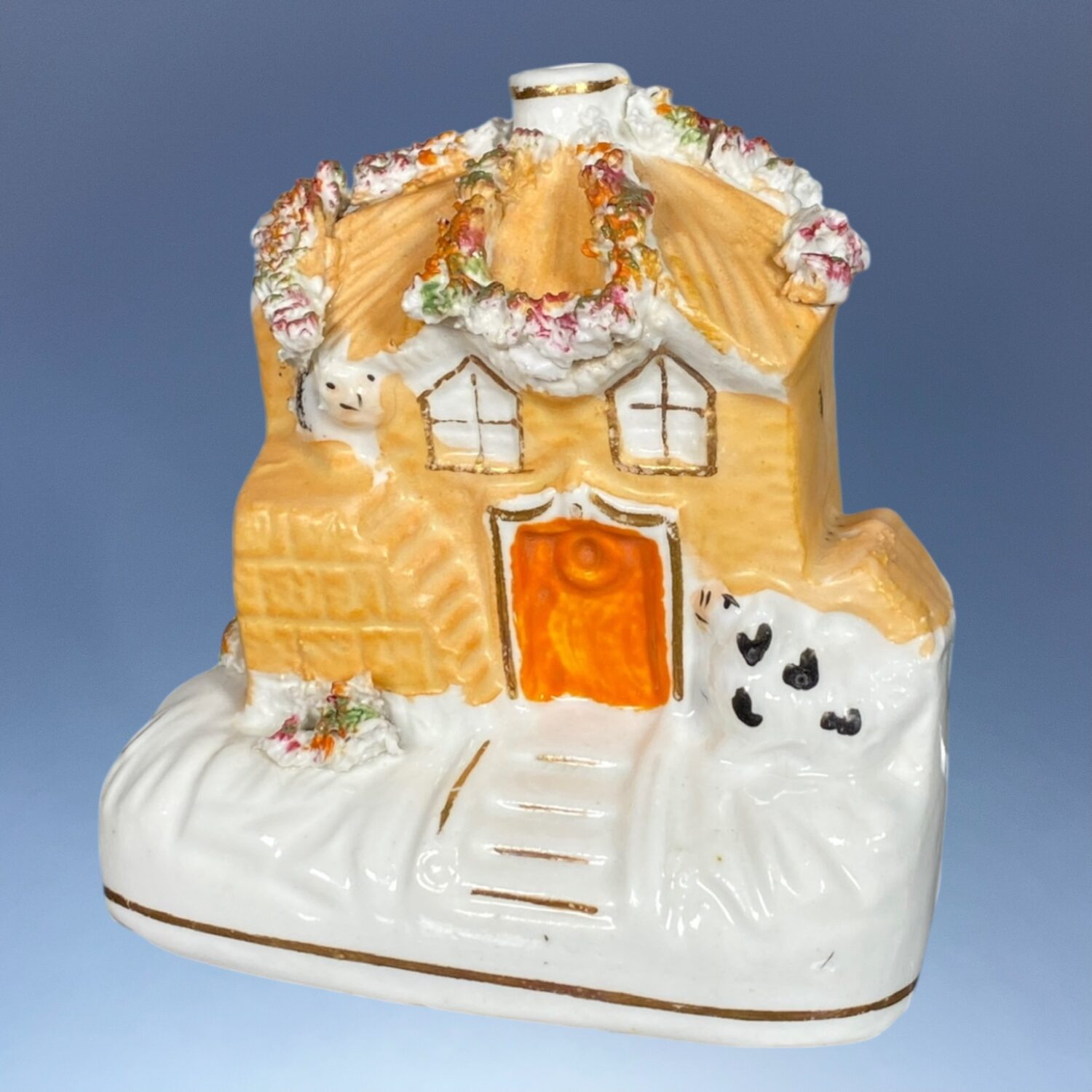 Antique Staffordshire porcelain yellow cottage pastille burner with cat and dog beside the orange front door.