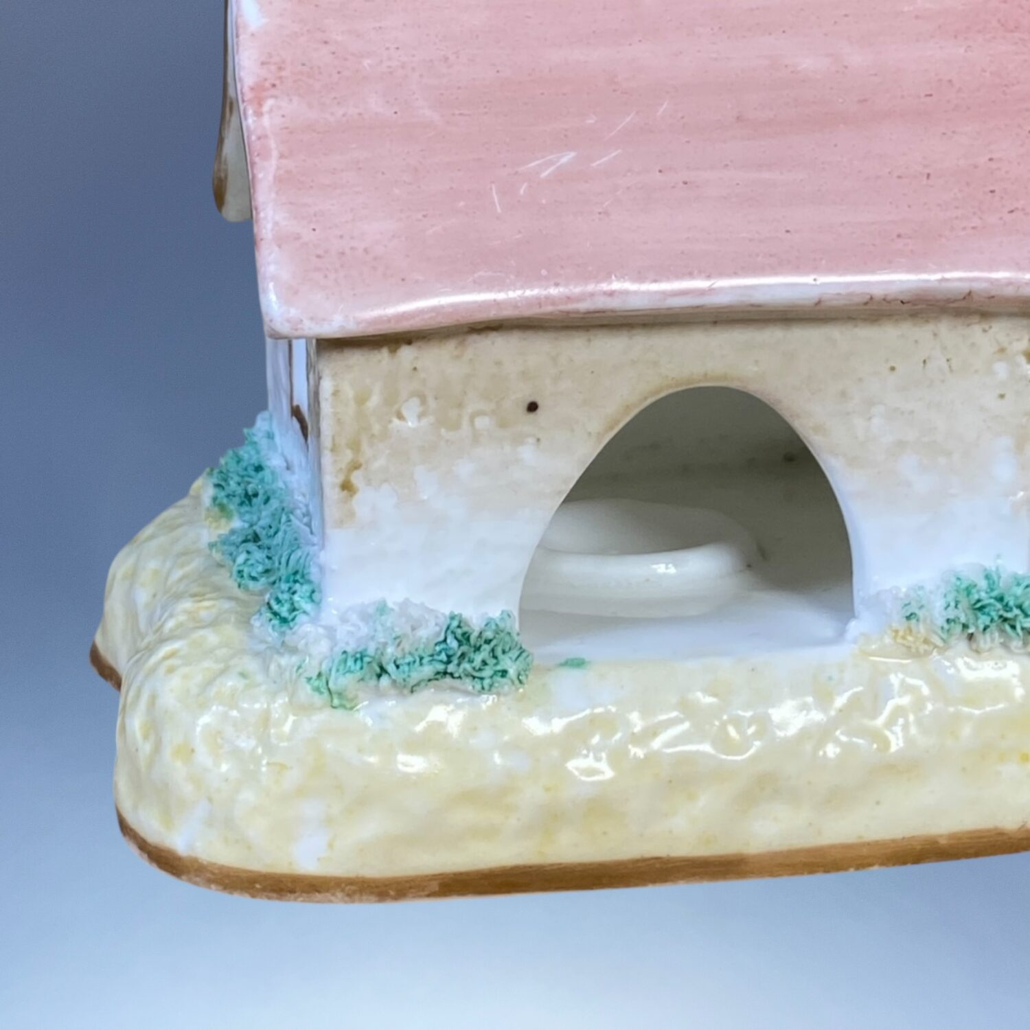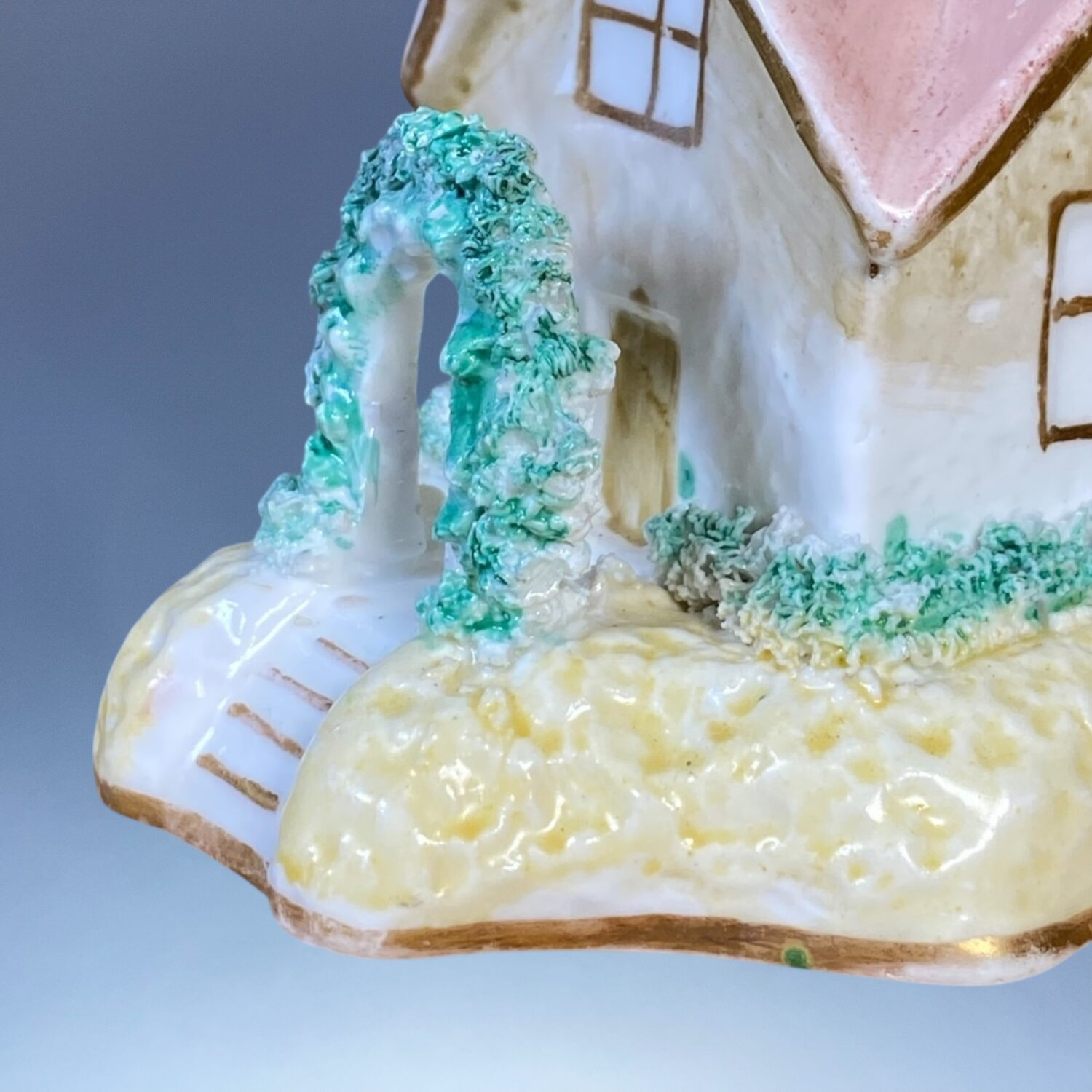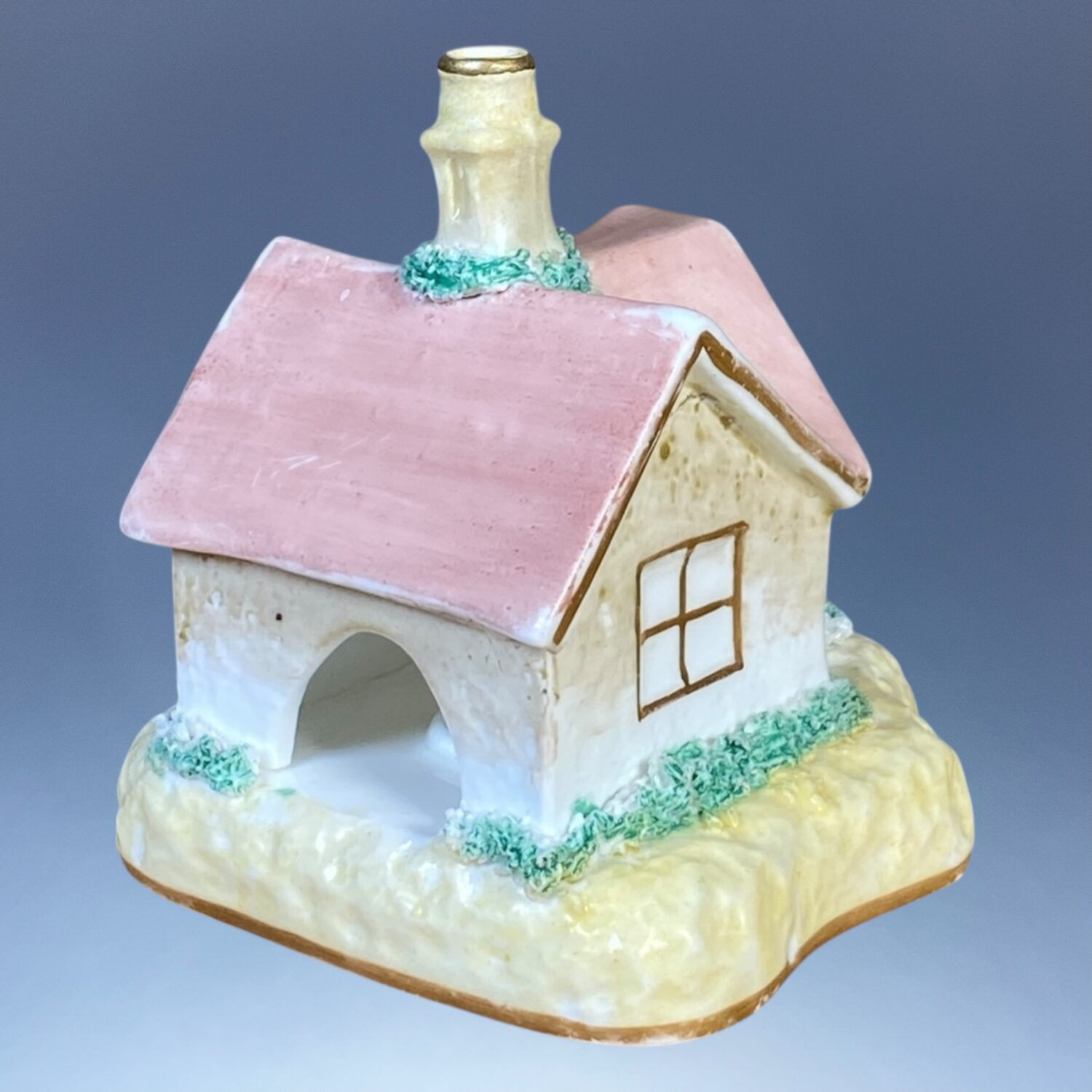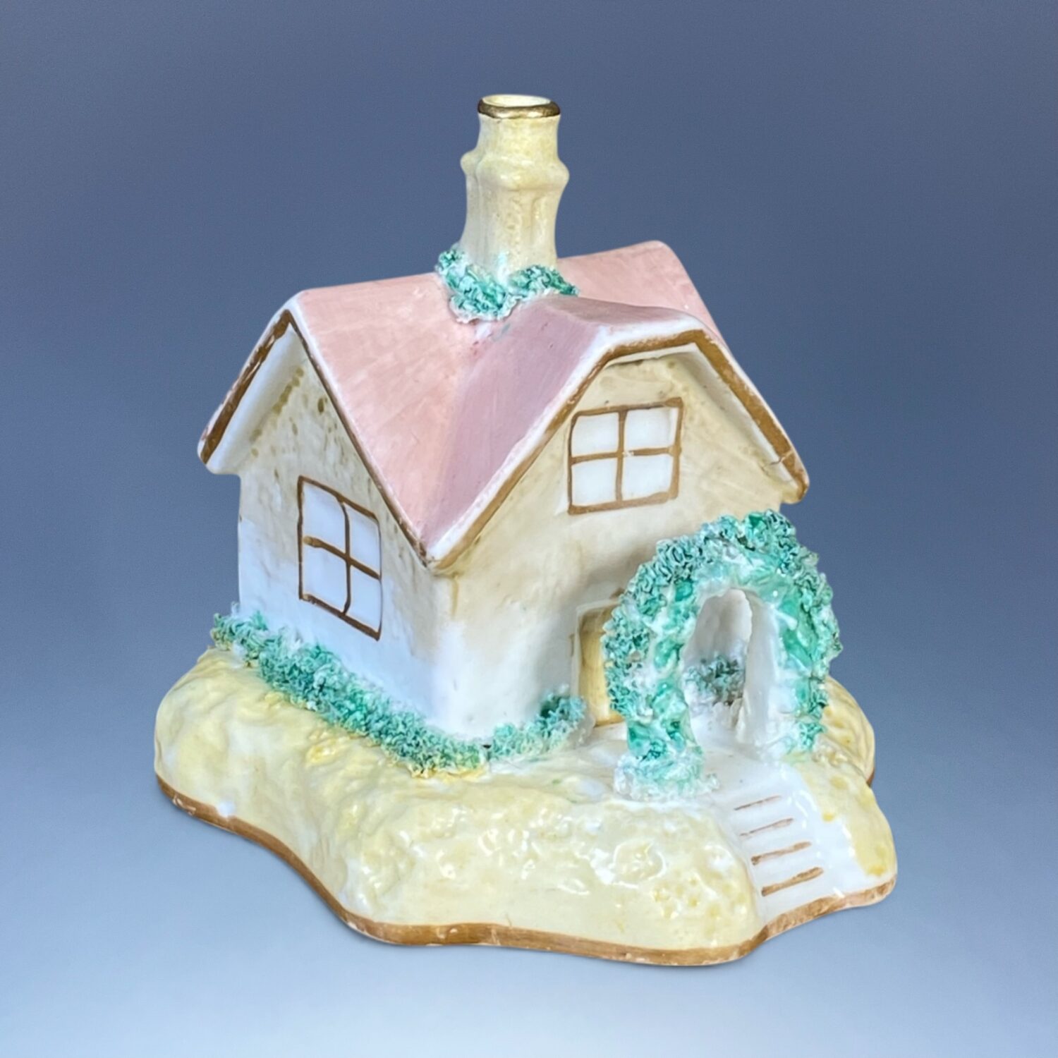 Staffordshire porcelain small cottage pastille burner with pale yellow base and a rose arch around the door.