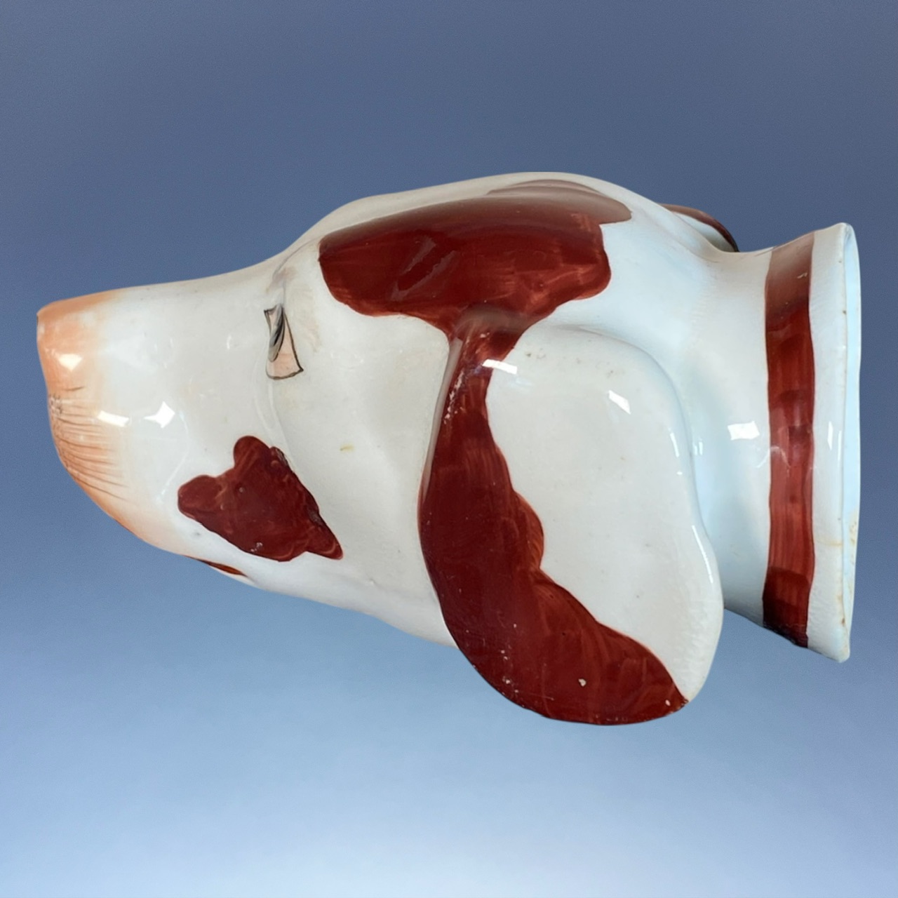 19th century Staffordshire porcelain Stirrup Cup in the form of a Hound’s Head, with ‘liver’ coloured markings and brown collar.