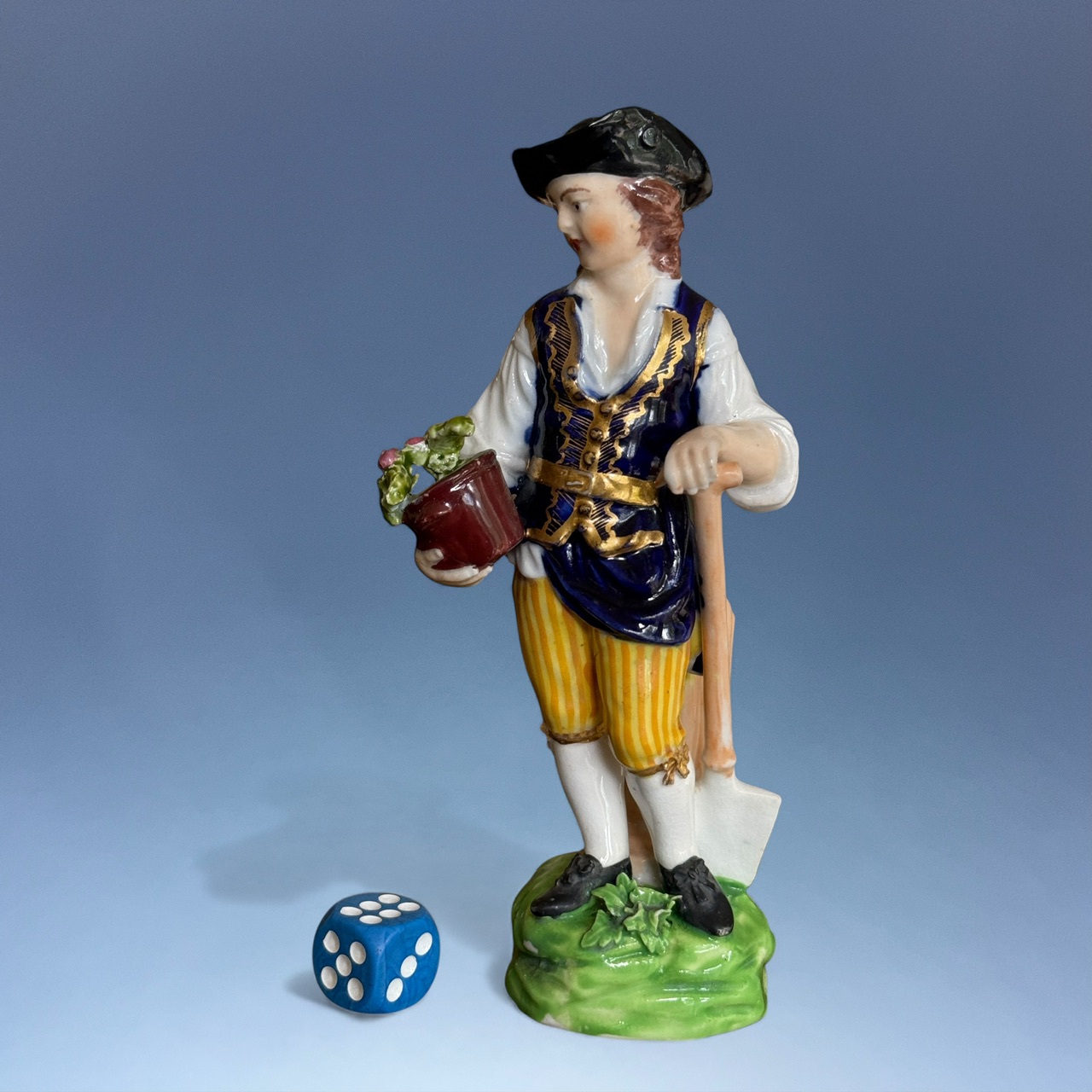 Derby porcelain (Robert Bloor period) small figure of a gardener, holding a spade and a potted plant.