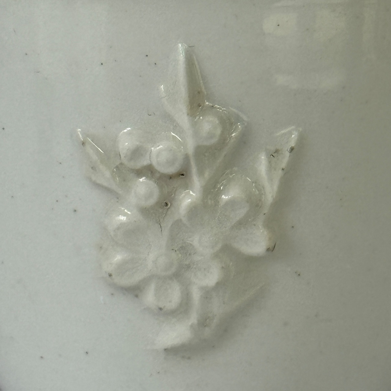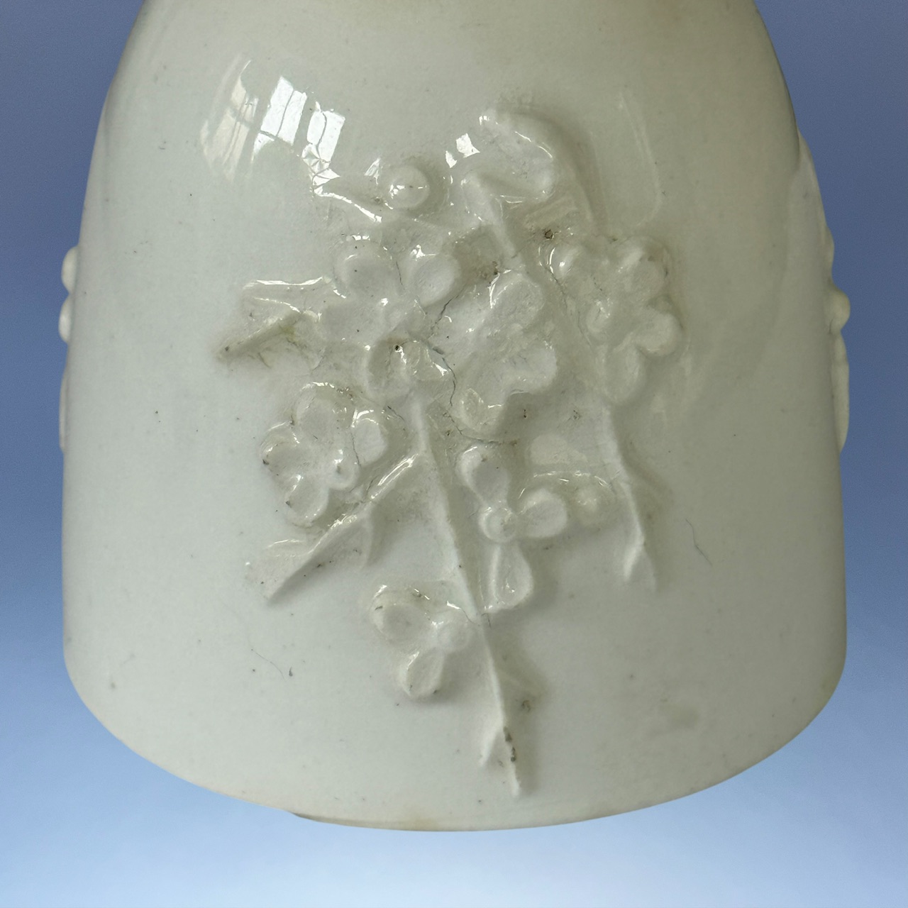 18th century BOW porcelain coffee cup, decorated with three applied ‘prunus’ sprays.