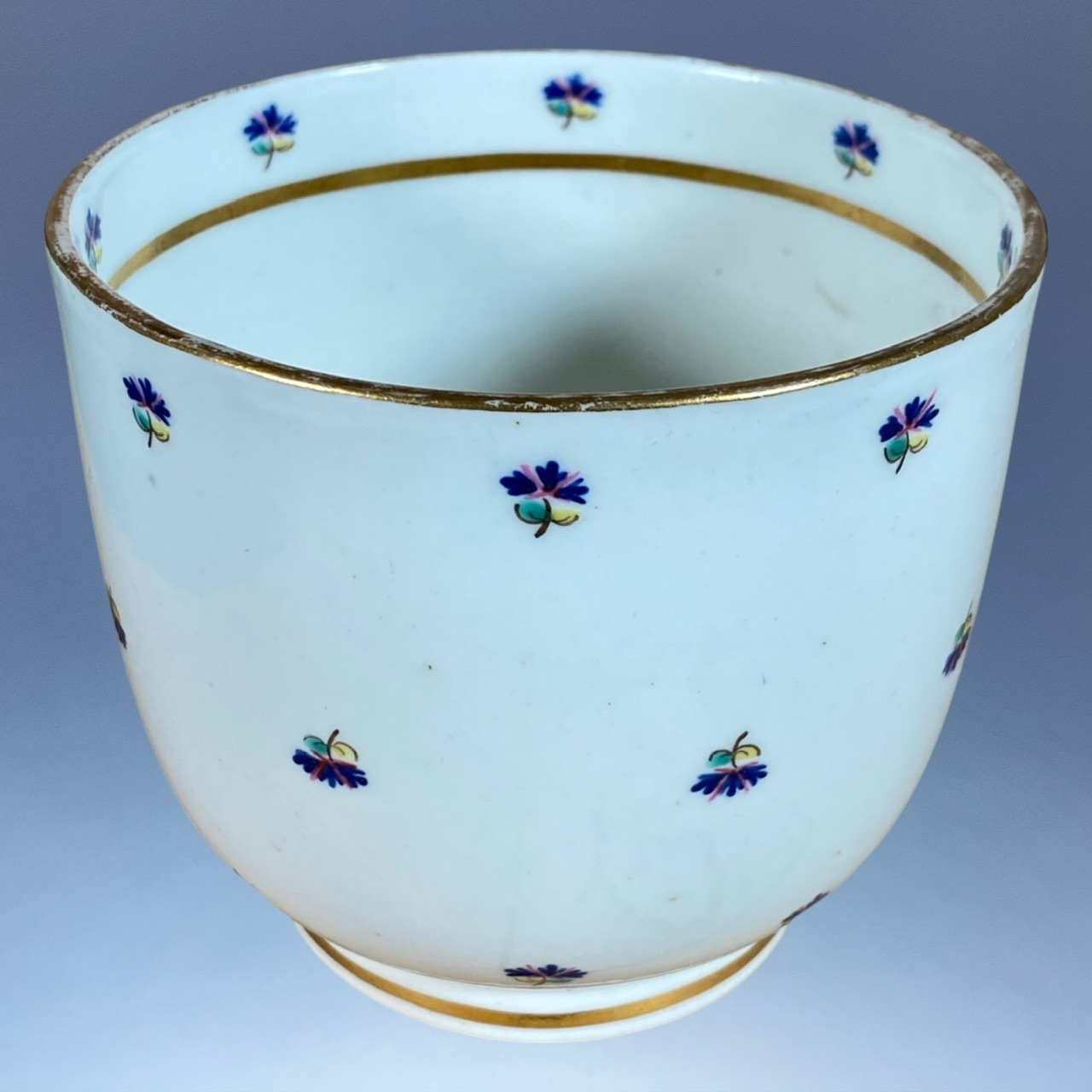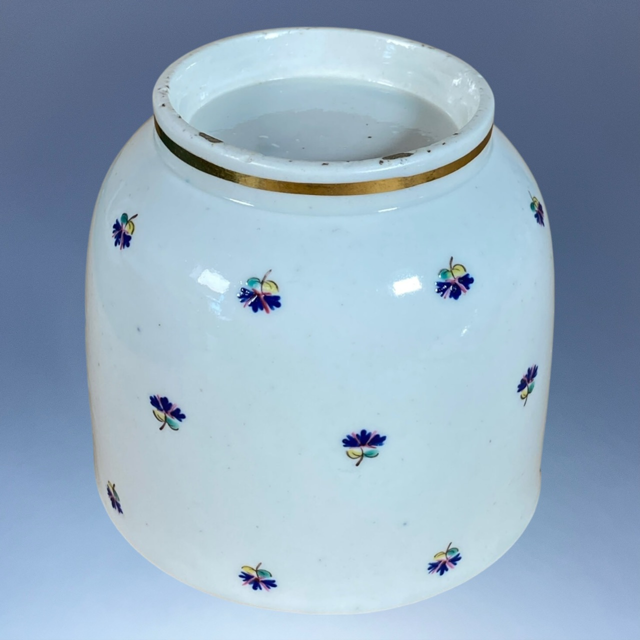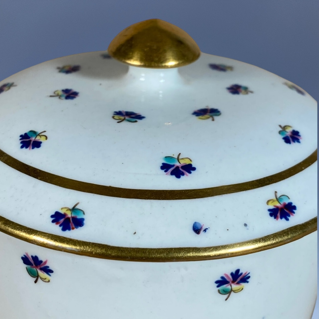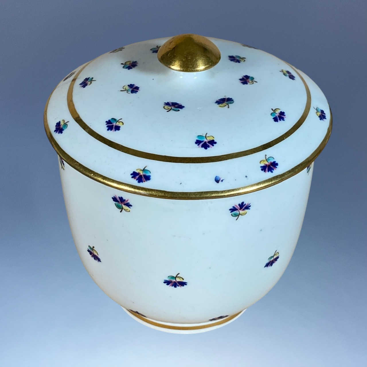 Late 18th century English soft paste porcelain sucrier and cover, decorated with enamelled ‘French Sprigs’ and gilding.