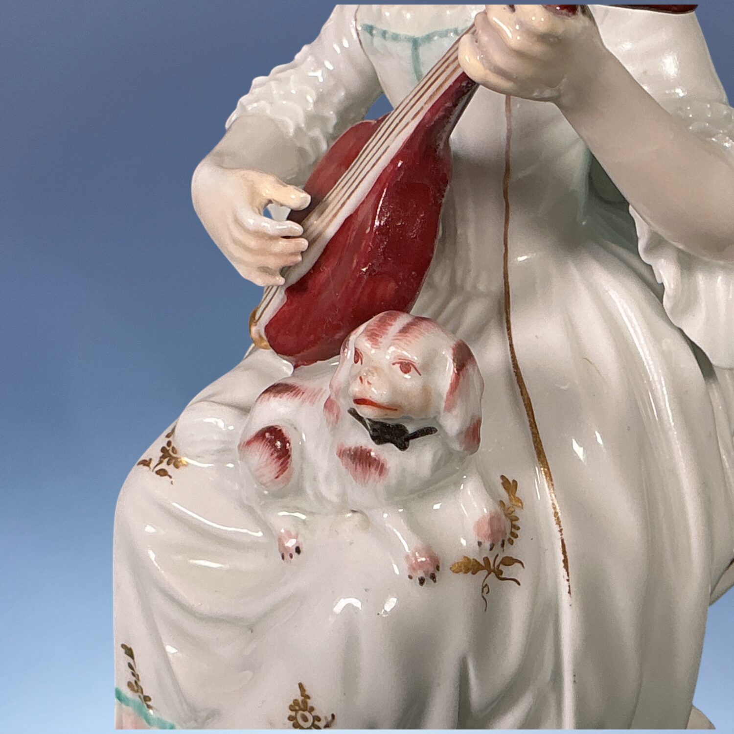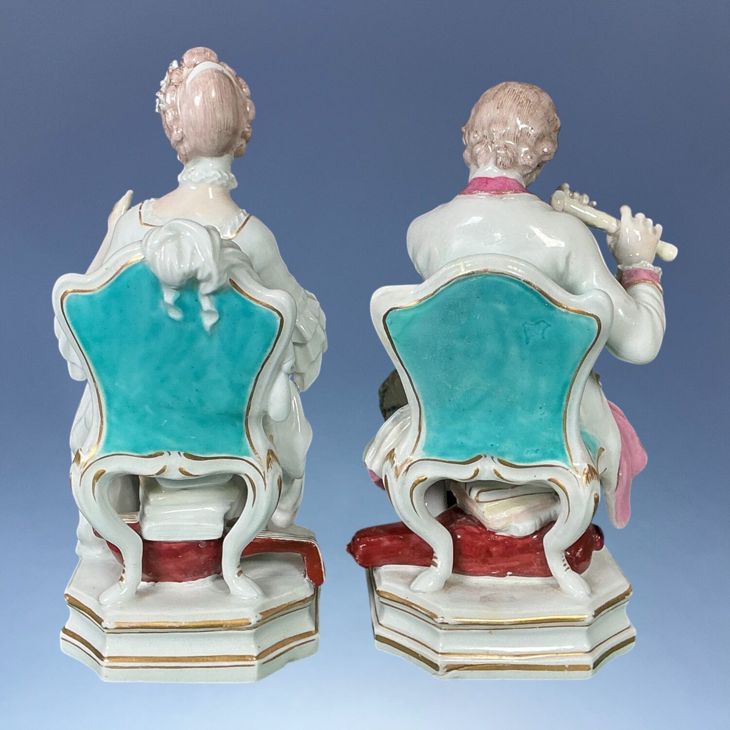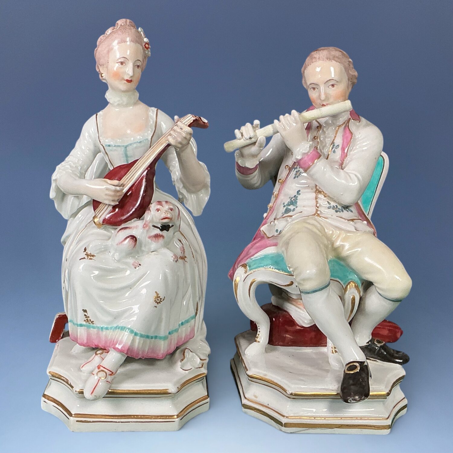 A good pair of 18th century Chelsea-Derby porcelain figures of seated musicians, he playing a flute and his companion a Lute.