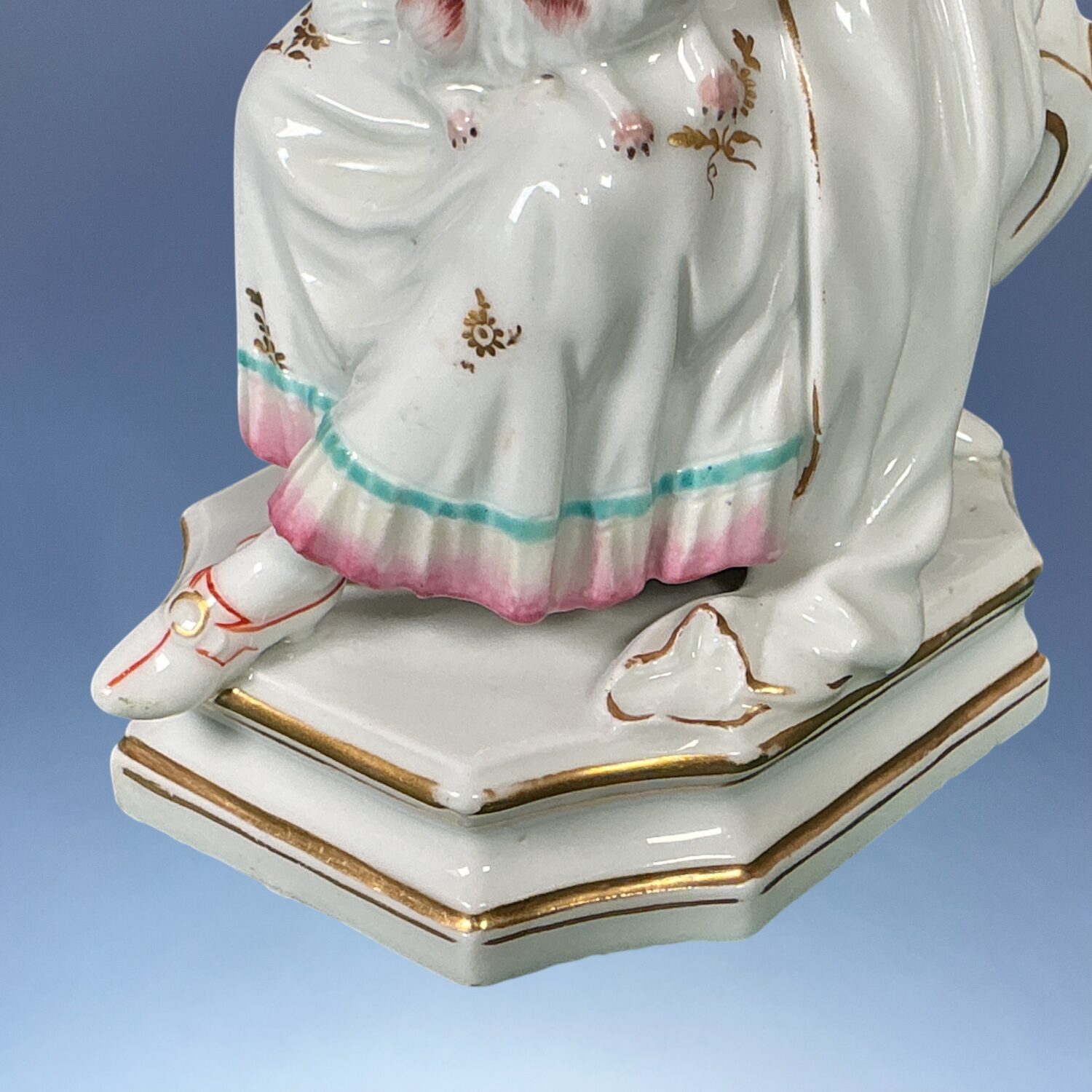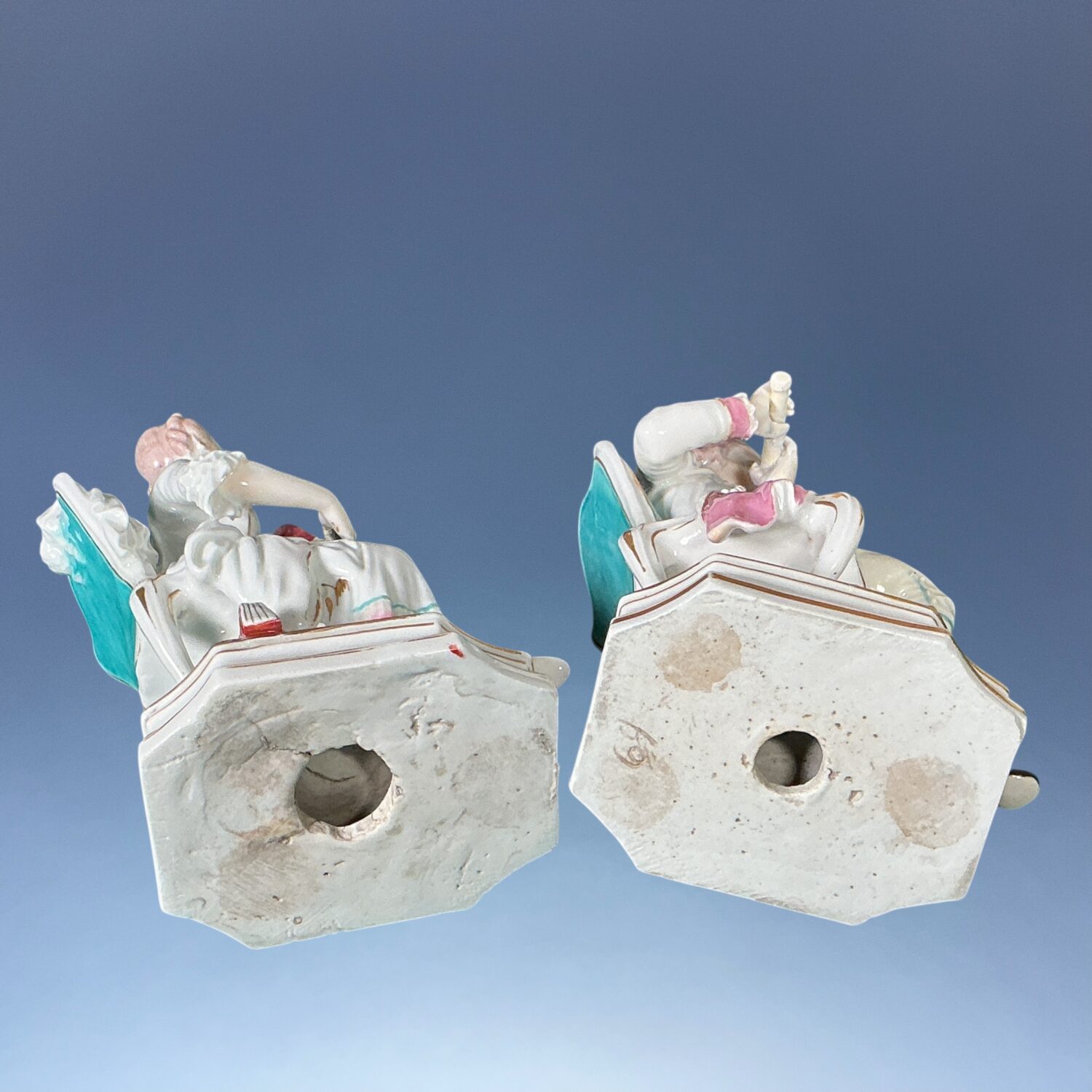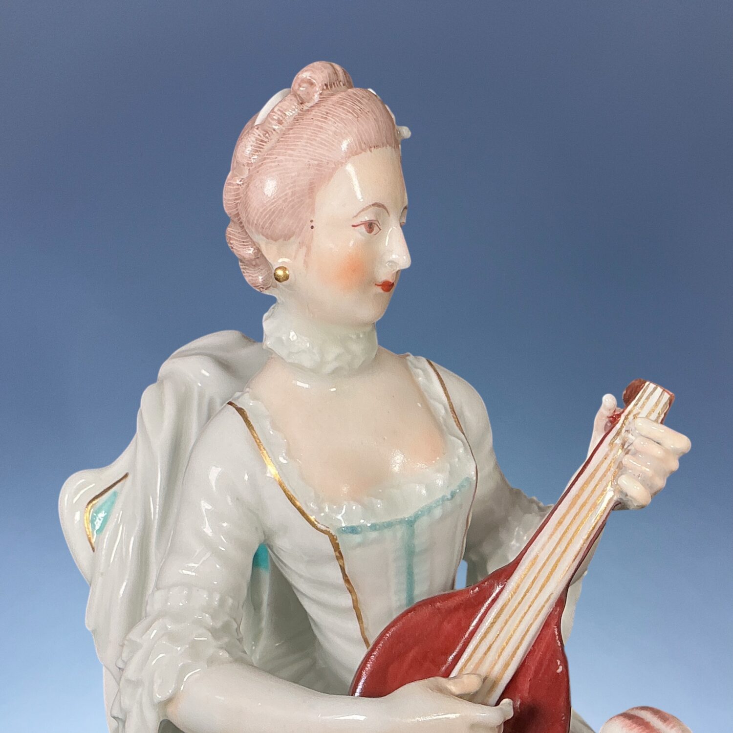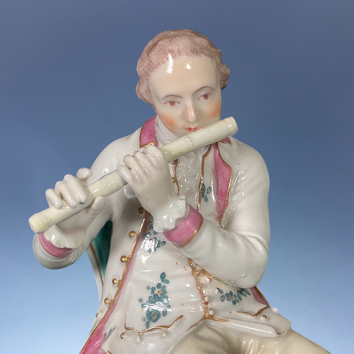 A good pair of 18th century Chelsea-Derby porcelain figures of seated musicians, he playing a flute and his companion a Lute.