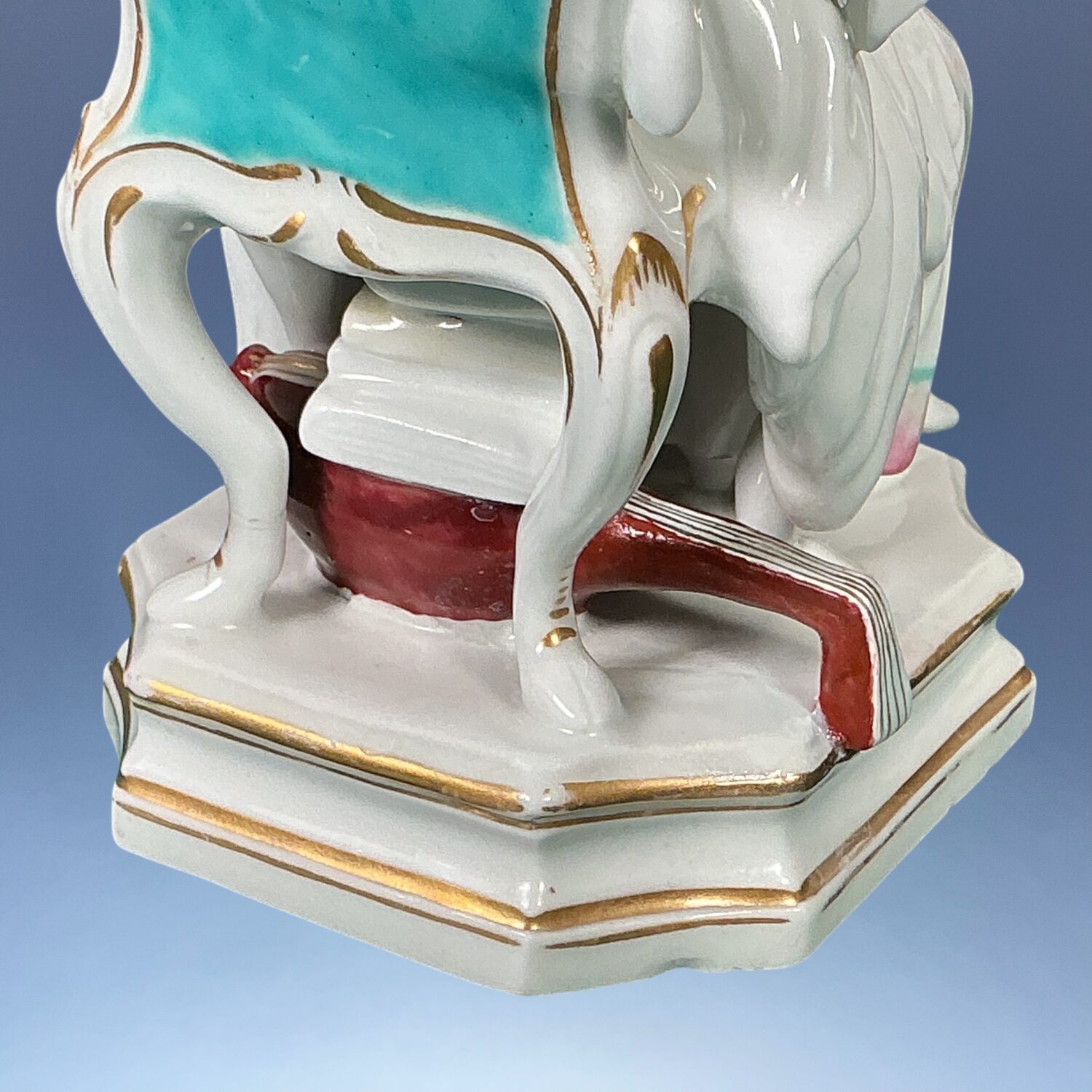 Man: Some very good restoration to his flute and fingers, back corner of chair.