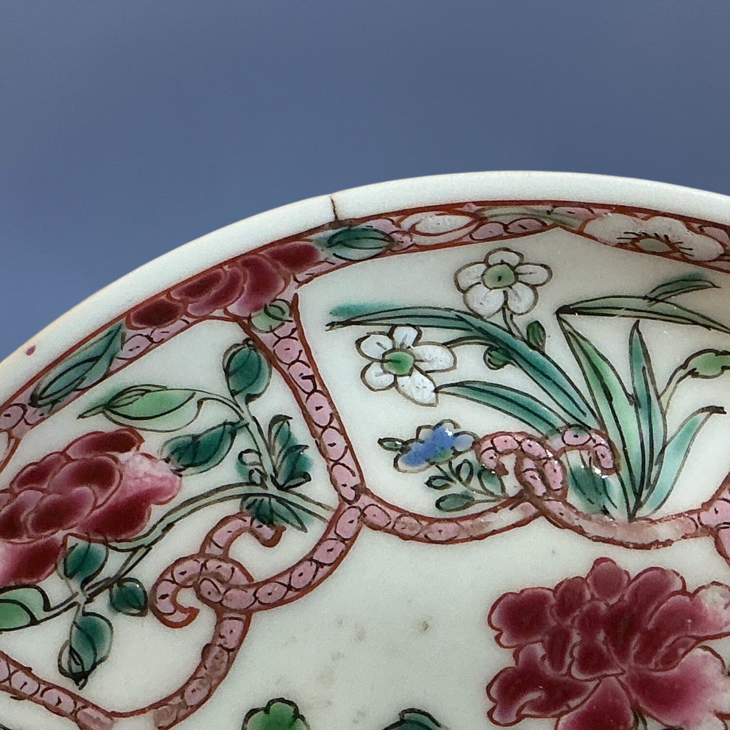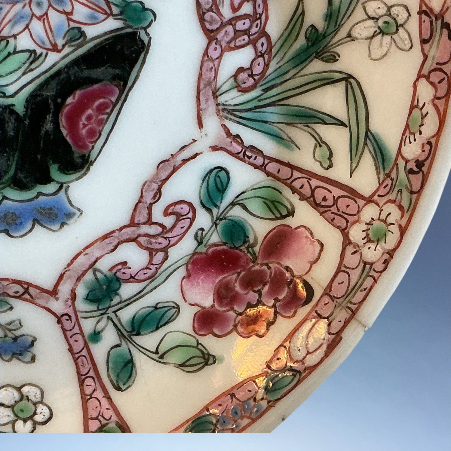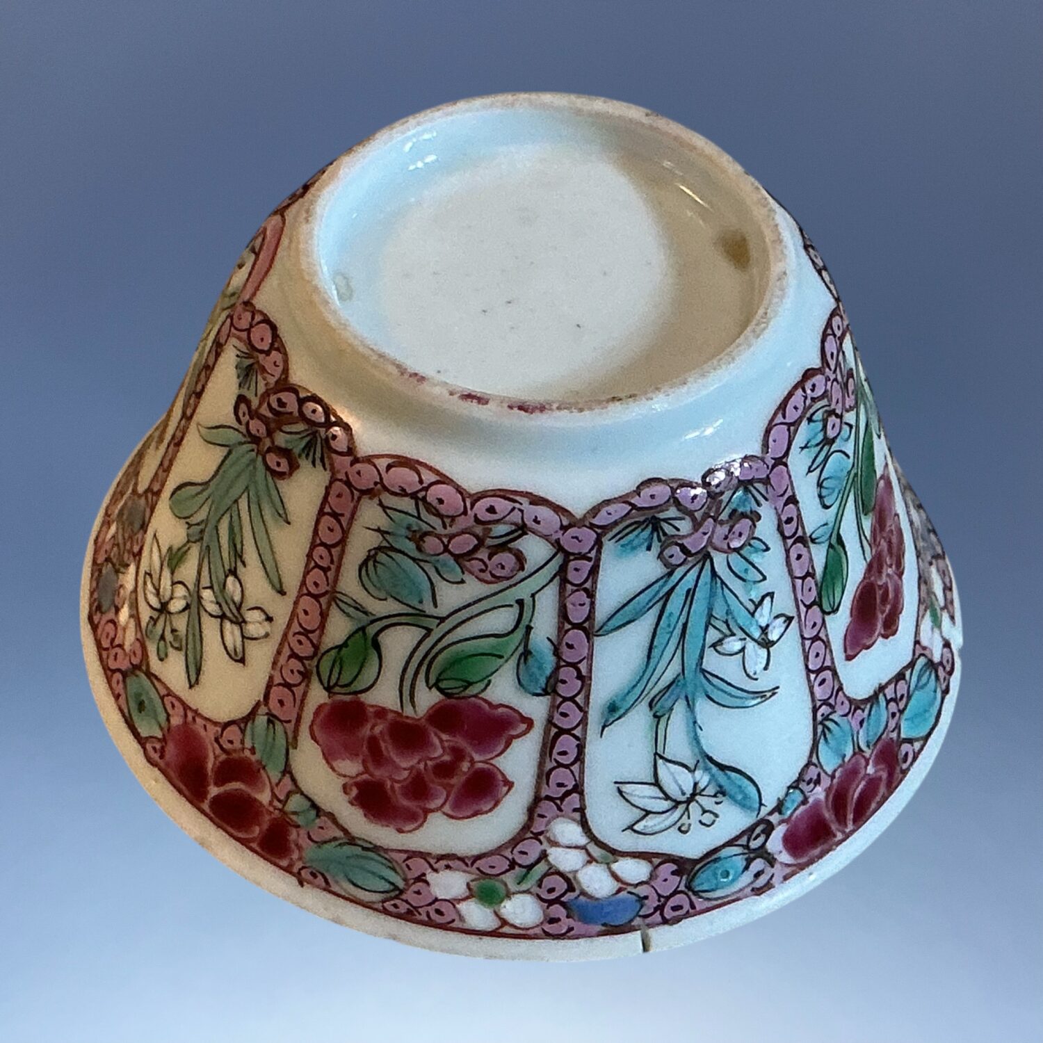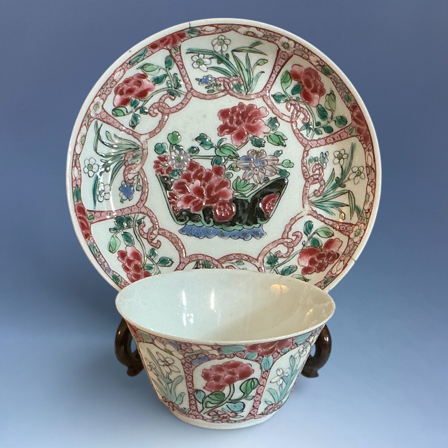 18th century Chinese export porcelain Tea bowl and saucer, painted in famille rose enamels with a basket of flowers, within a border of floral panels.