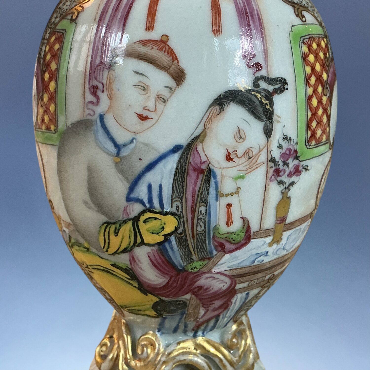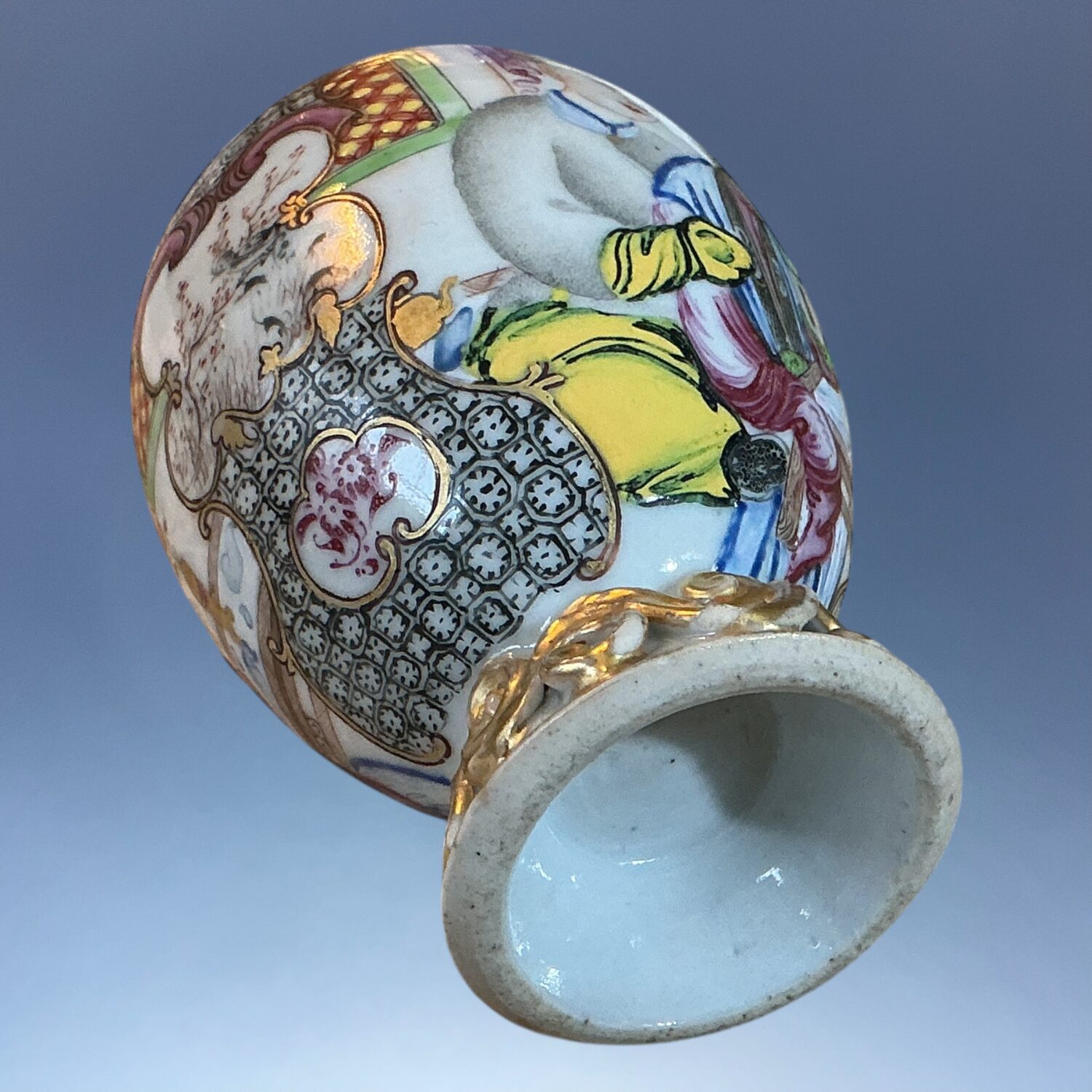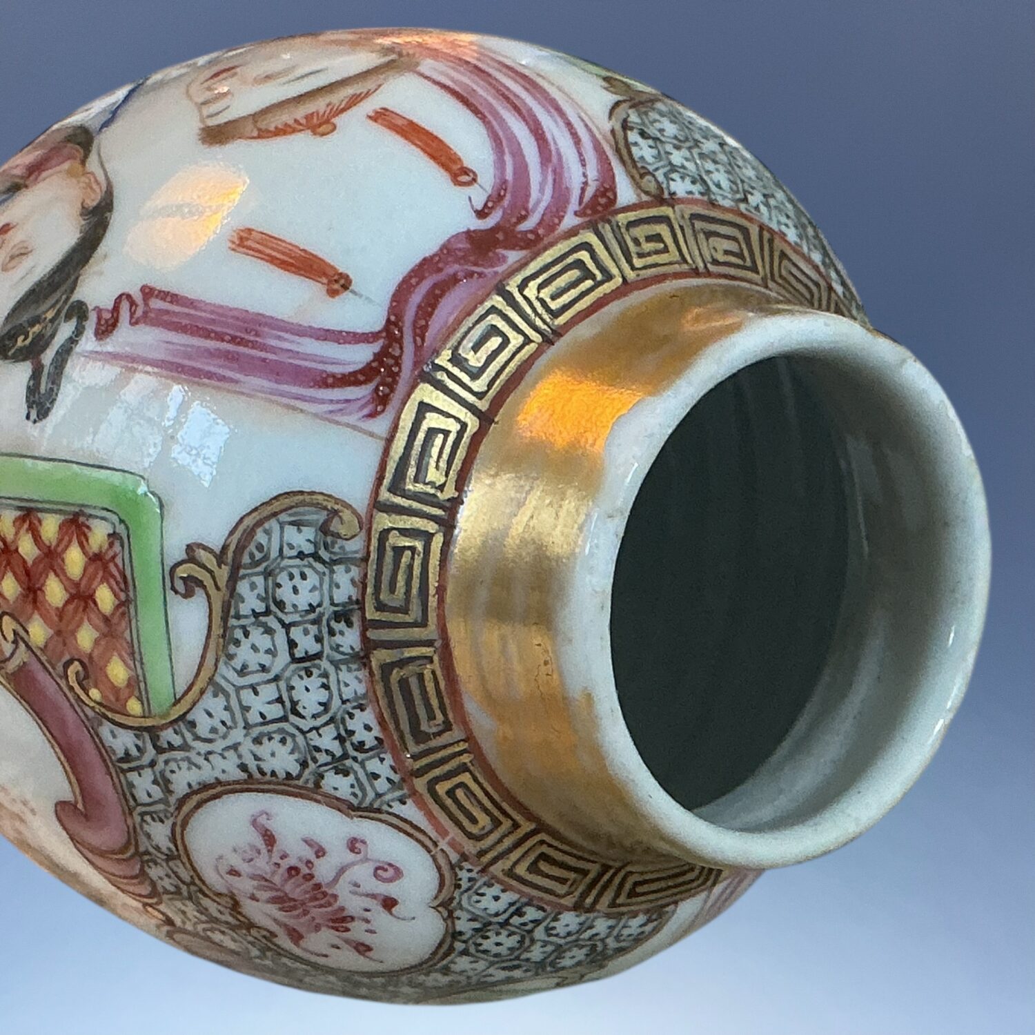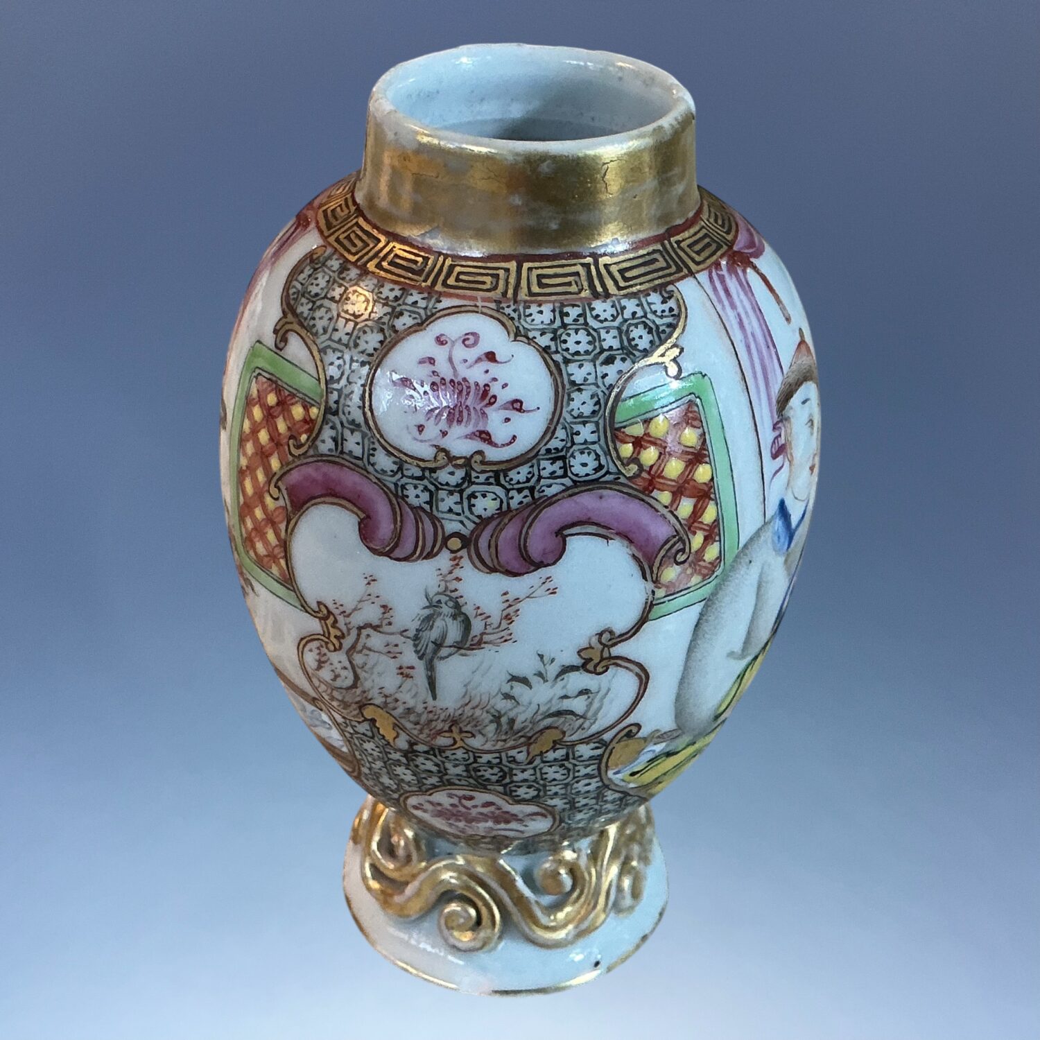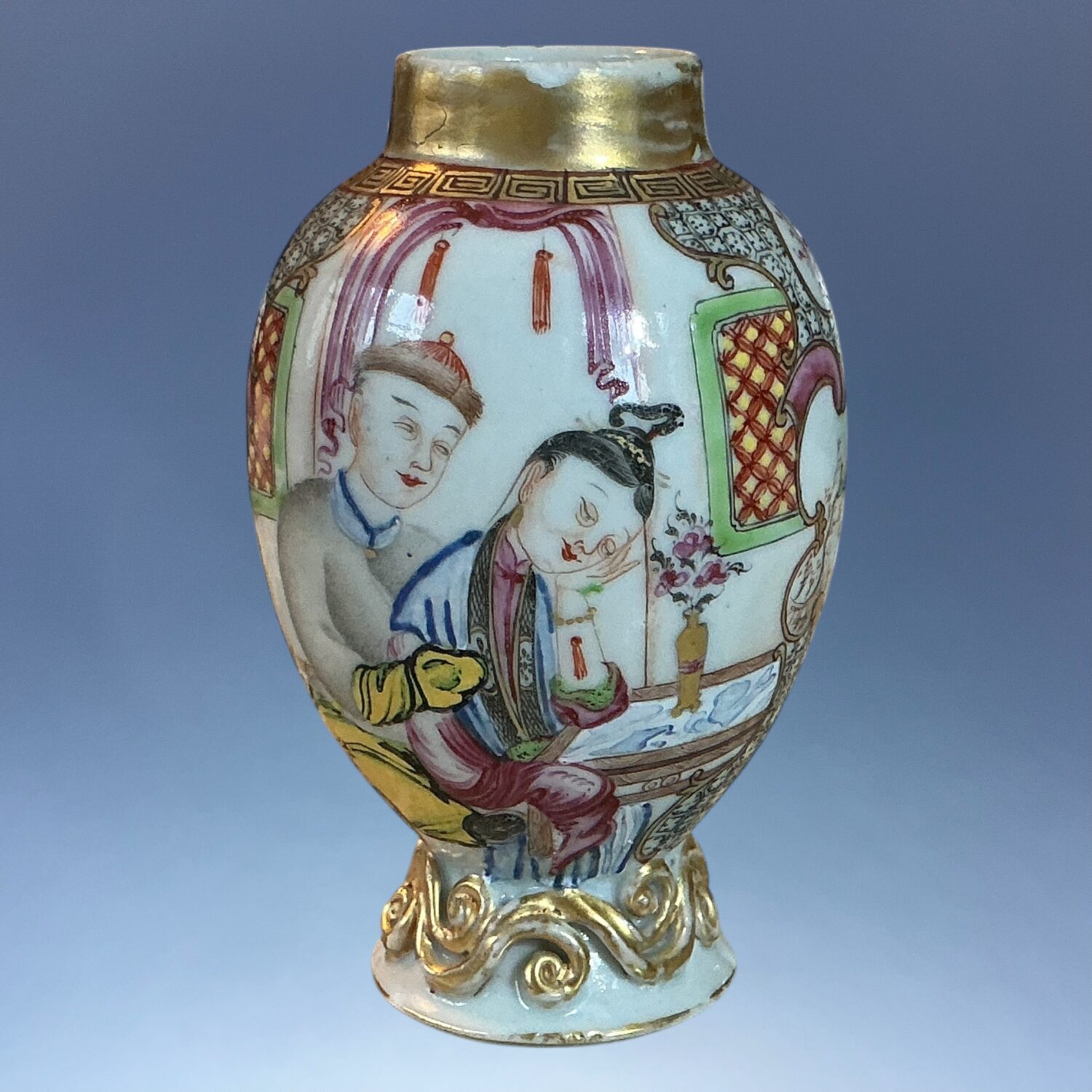 Good quality 18th century Chinese export porcelain ovoid tea caddy, with finely painted panels of ‘Mandarin’ figures.