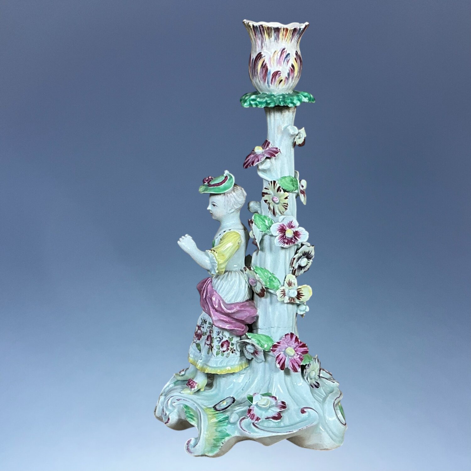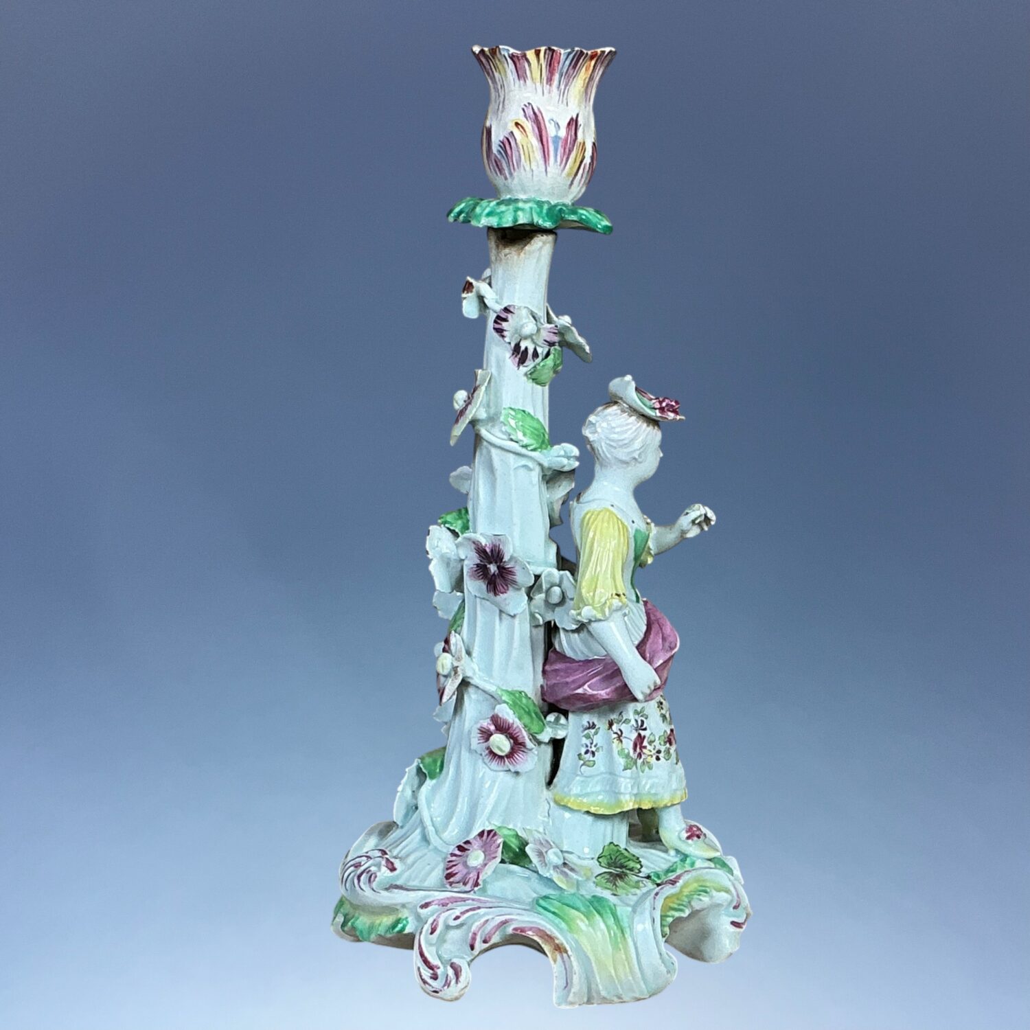 C18th century Derby porcelain candlestick figure of a girl holding a flower, standing on a scroll moulded circular base, decorated with large applied flowers.