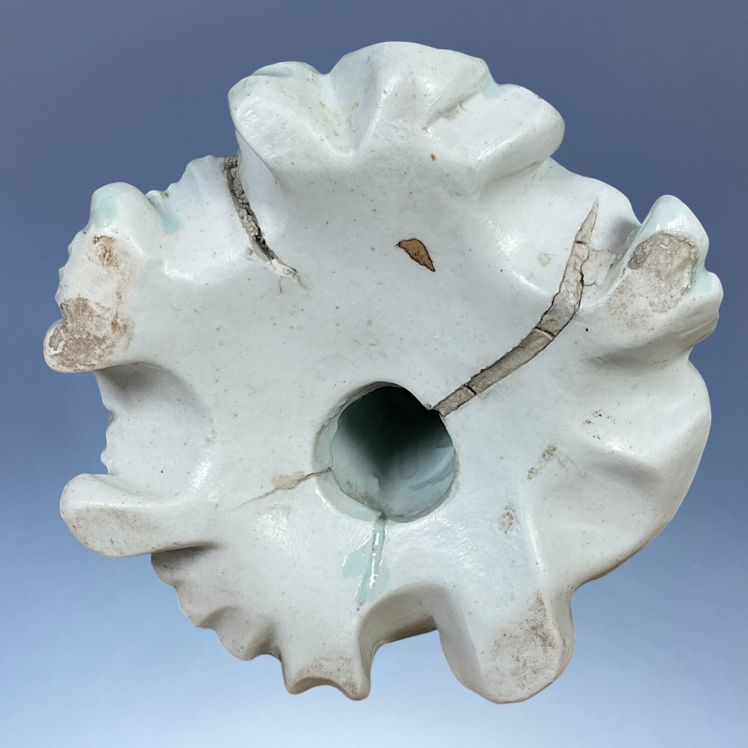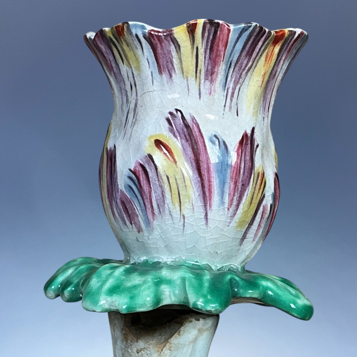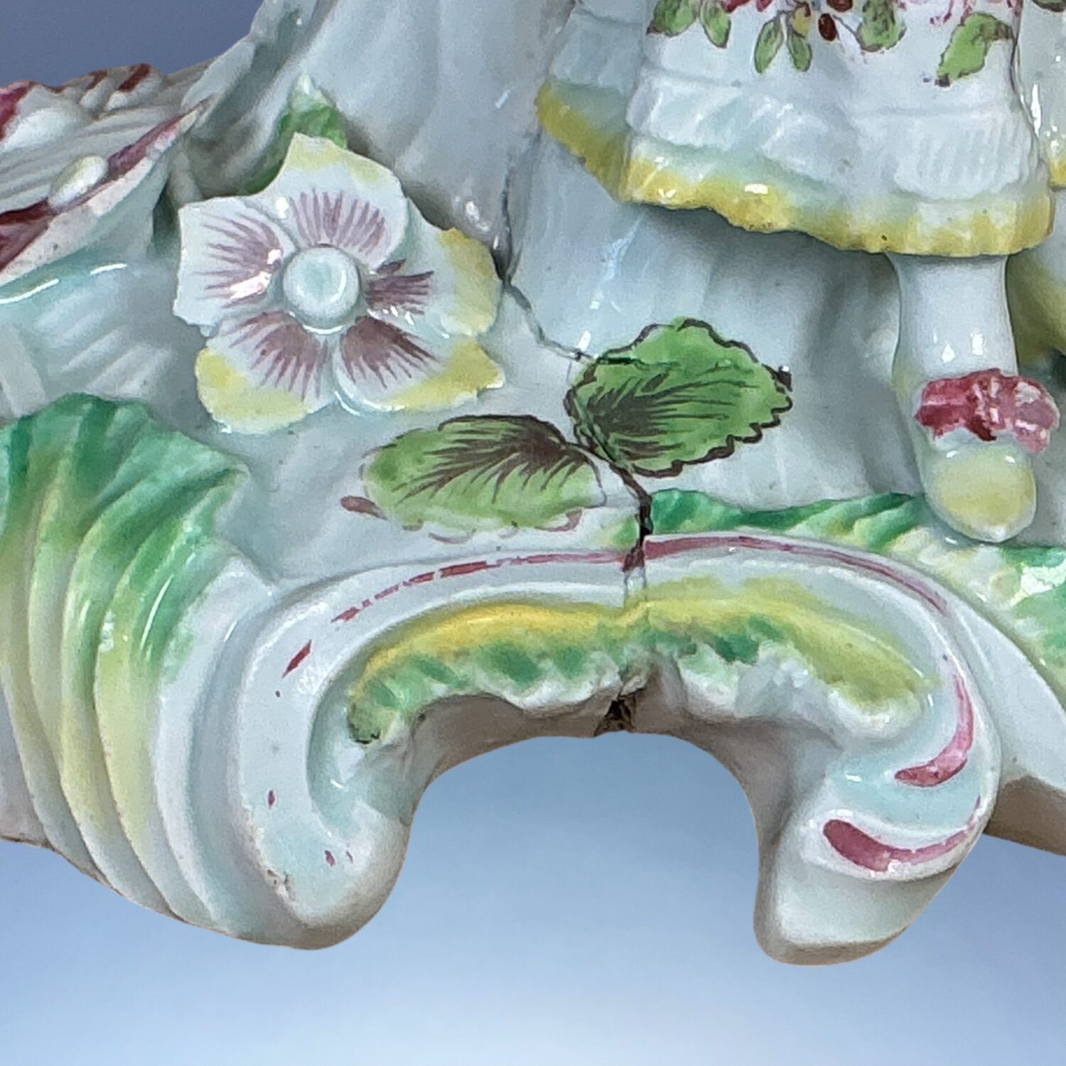 Note the painted leaves on the base which partly disguise the original firing ‘shrinkage’ cracks.