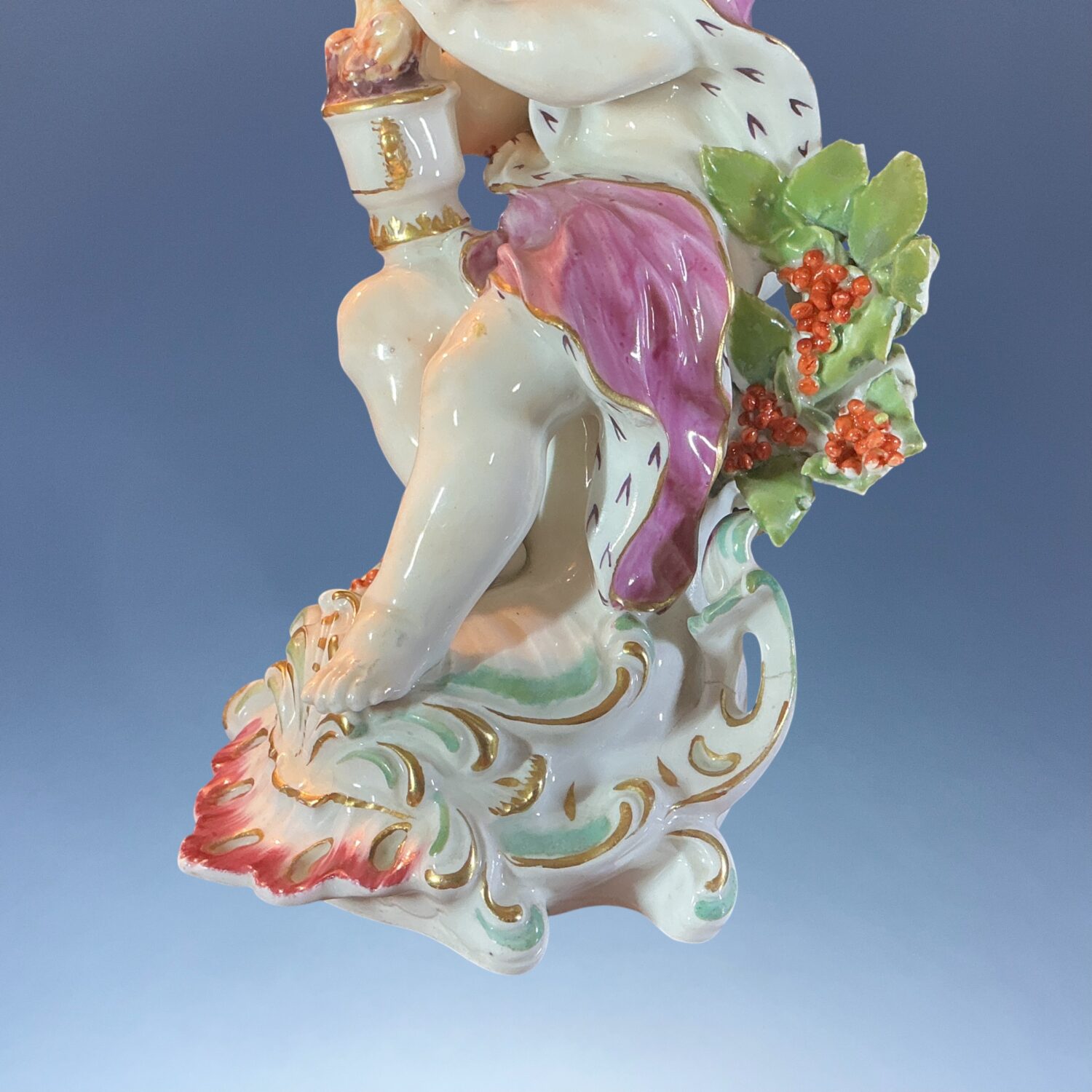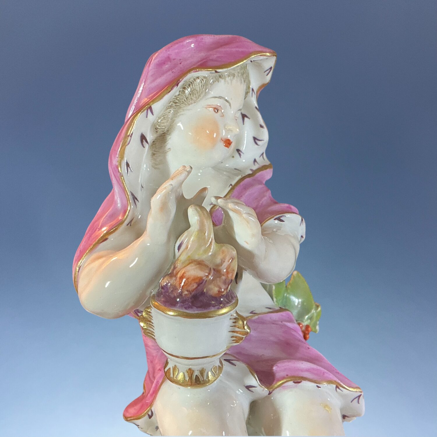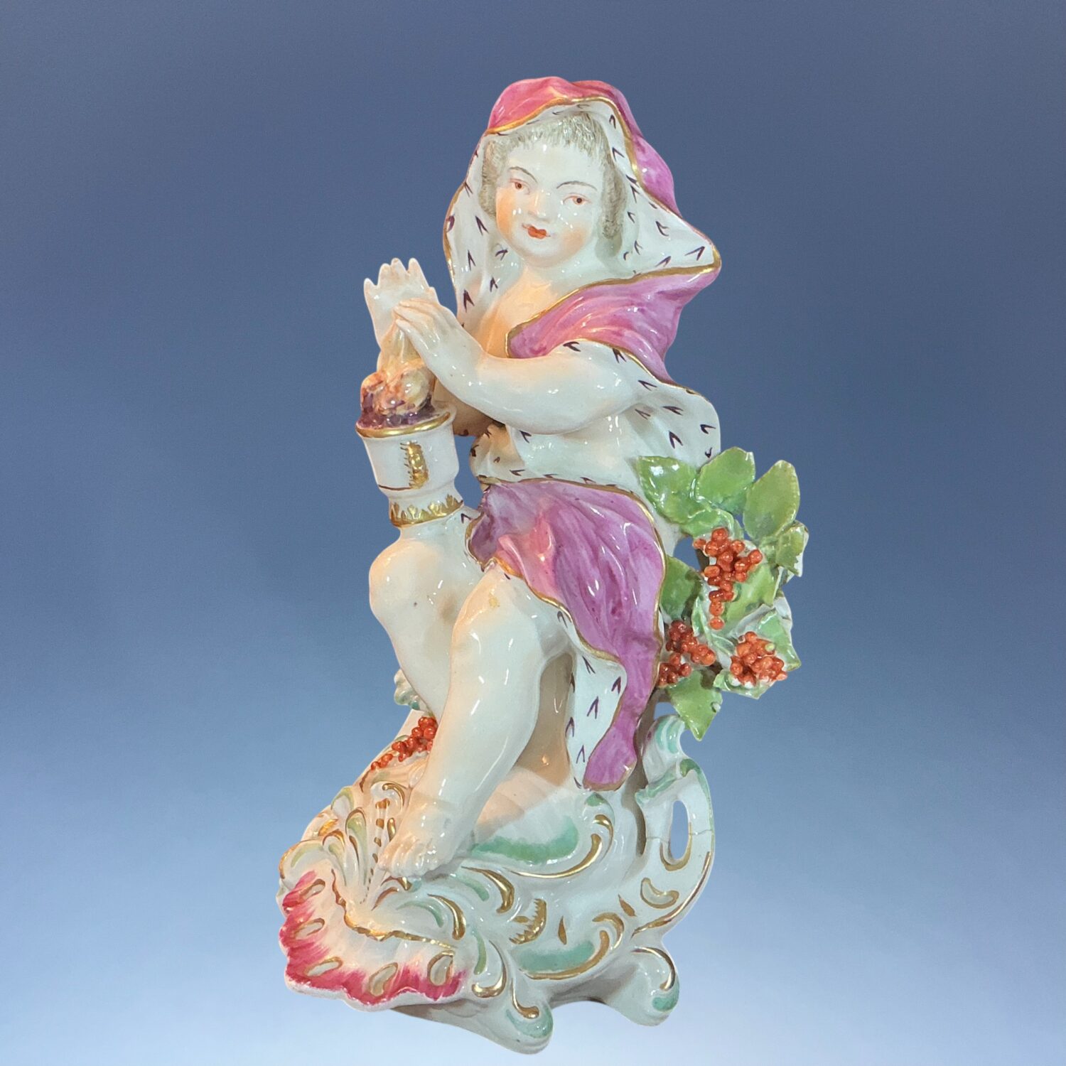 18th century Derby porcelain seated figure of a putto, emblematic of Winter, wearing an ermine lined cloak and holding a brazier, from a set of four ‘Infant Seasons’ on a raised, scroll moulded base.