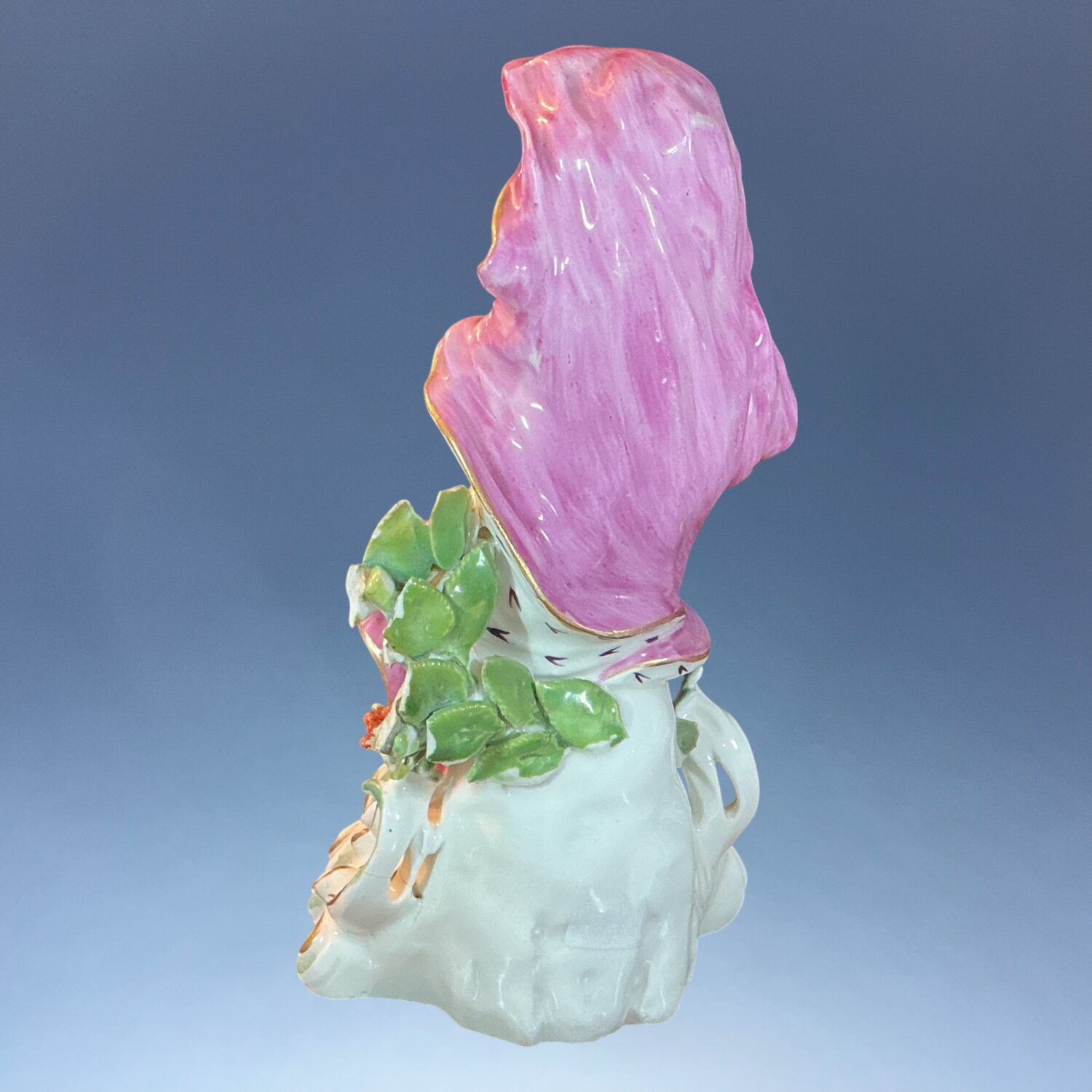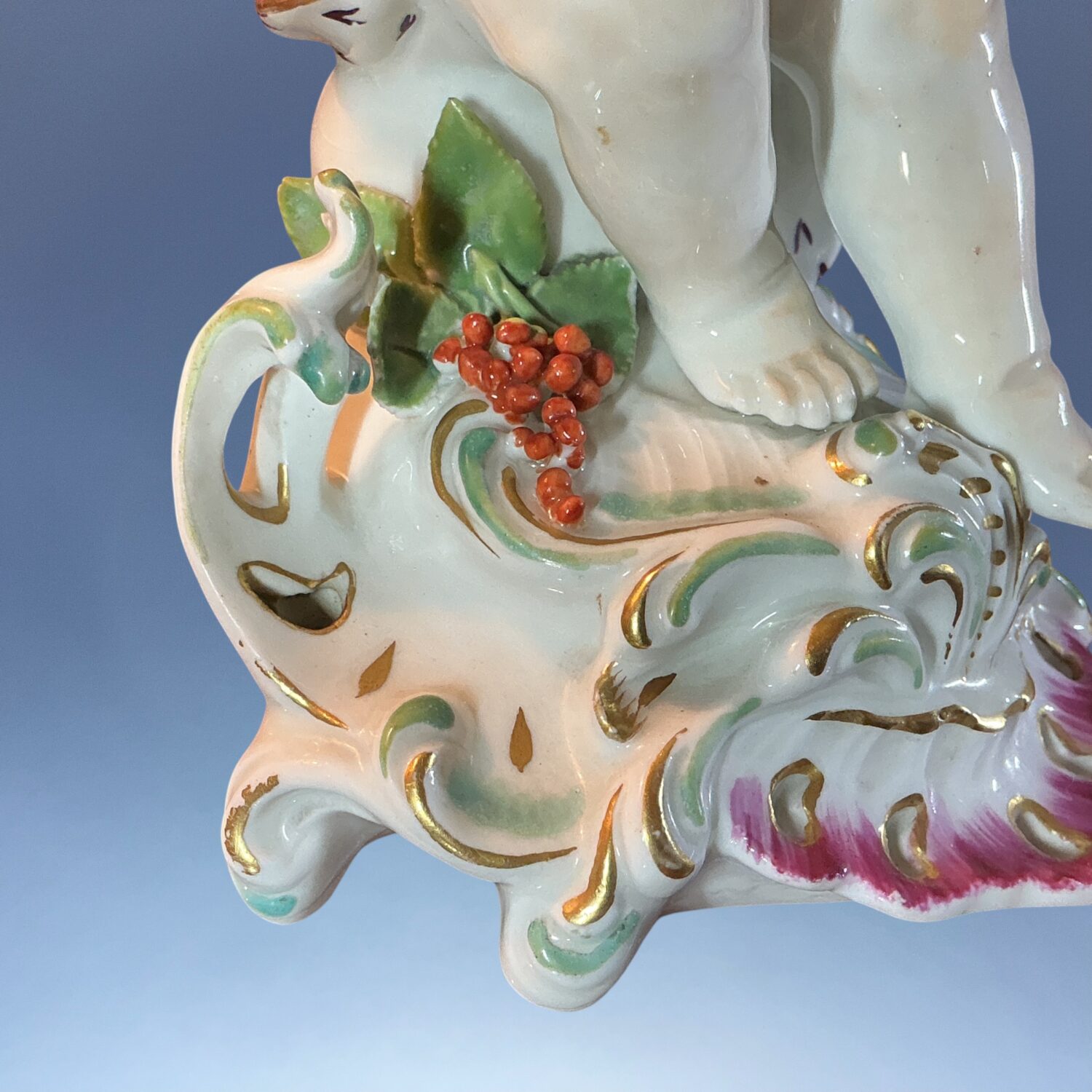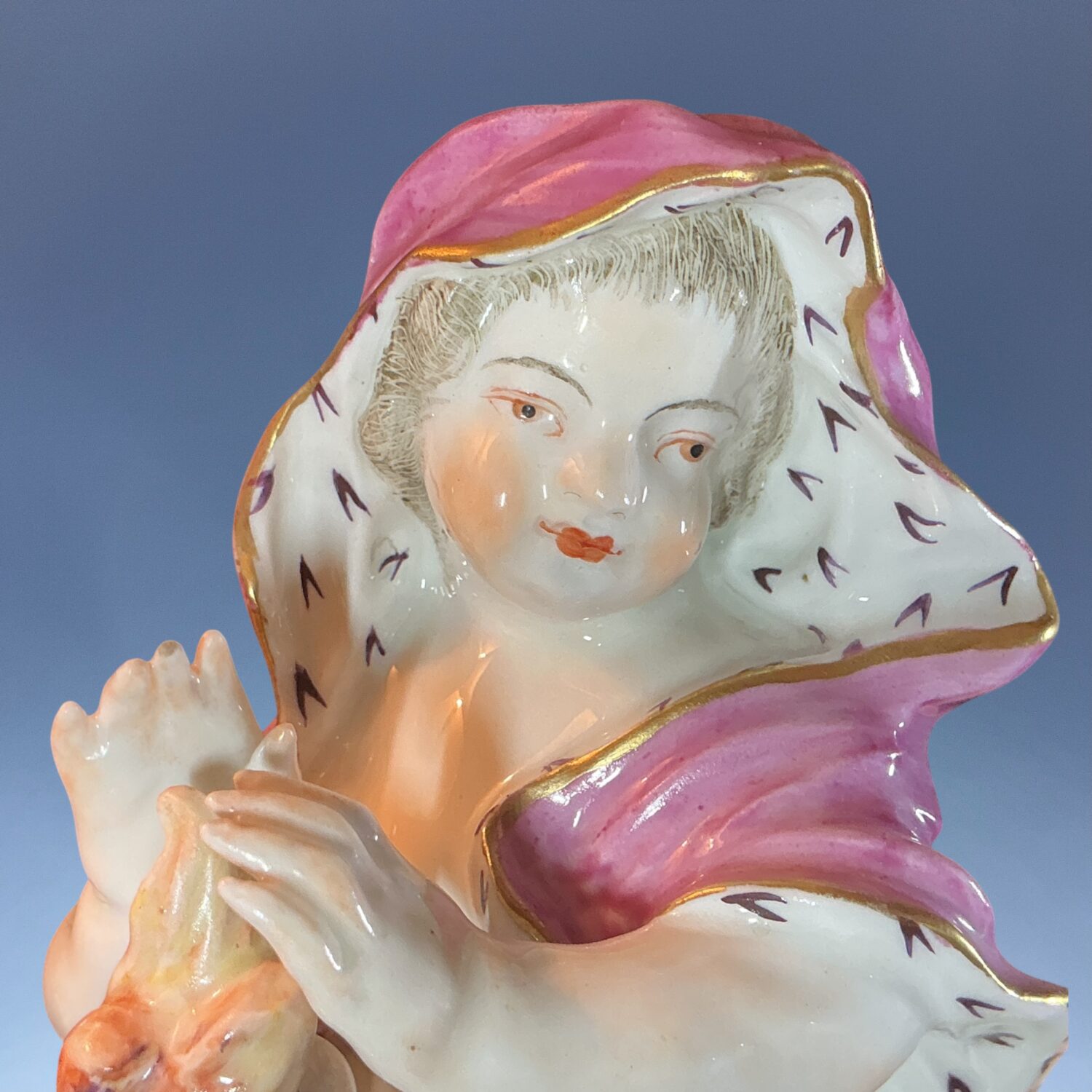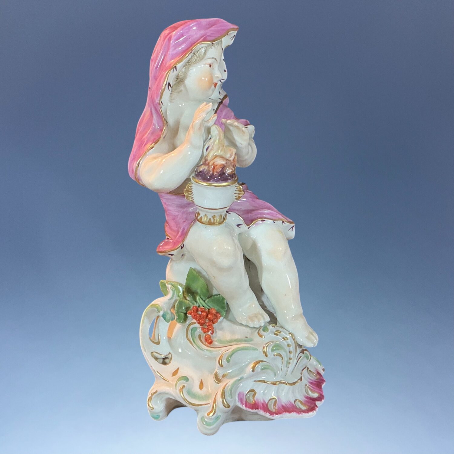18th century Derby porcelain seated figure of a putto, emblematic of Winter, wearing an ermine lined cloak and holding a brazier, from a set of four ‘Infant Seasons’ on a raised, scroll moulded base.