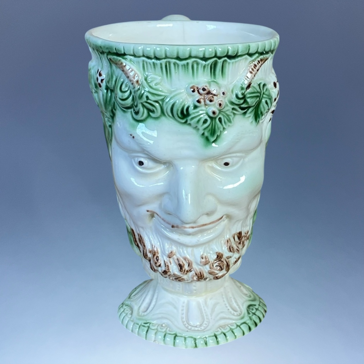 18th century Staffordshire creamware Satyr face mug, well moulded and decorated with splashes of green coloured glaze.