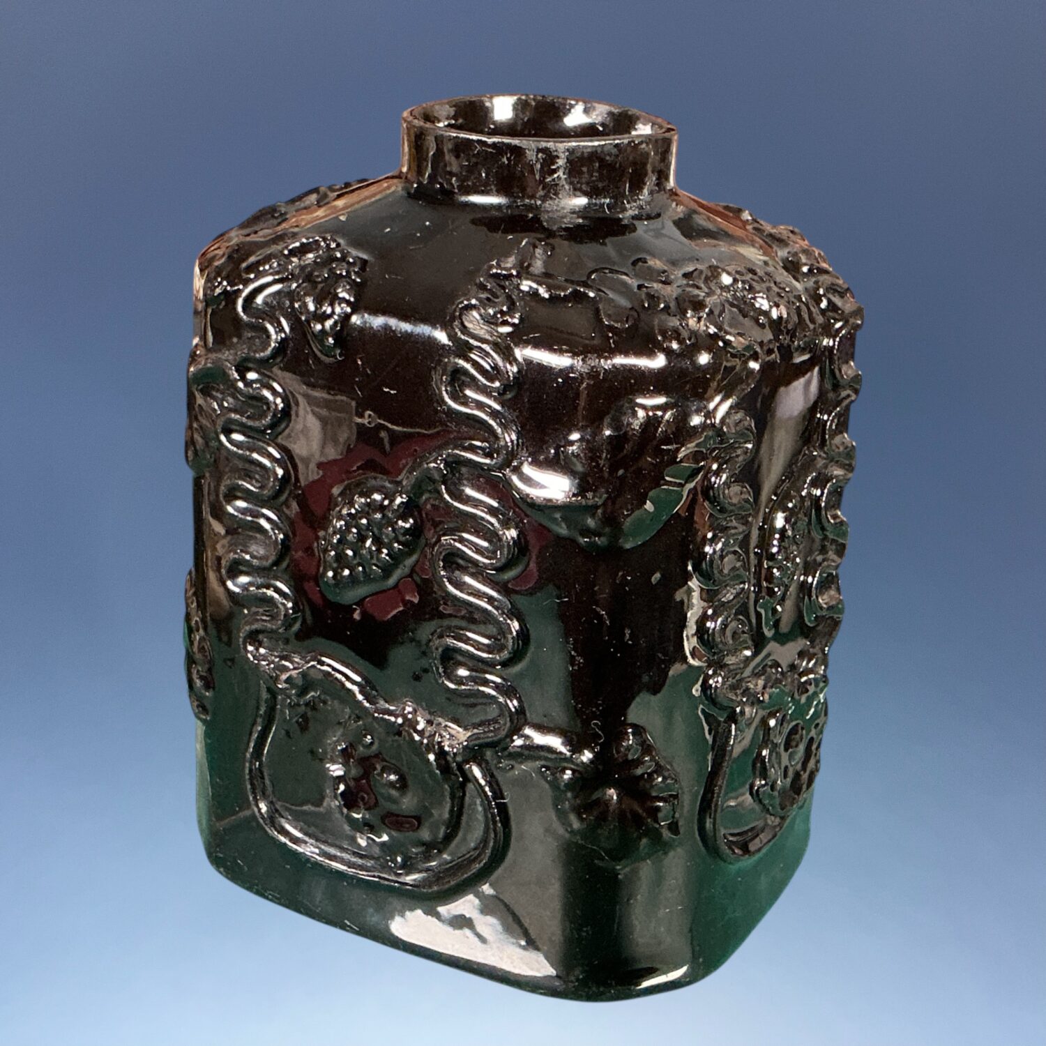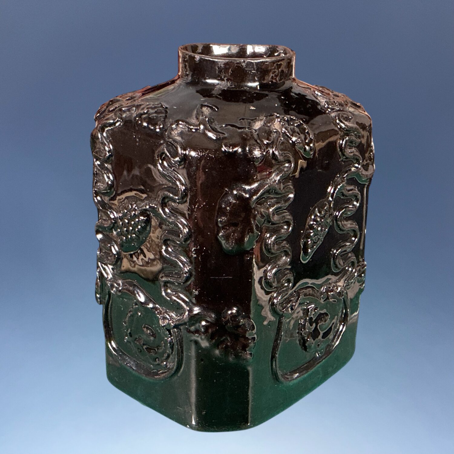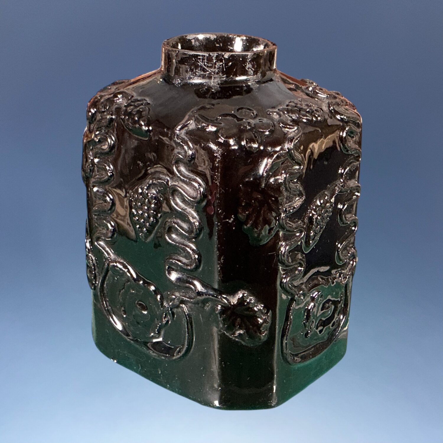 18th Century English black glazed, red earthenware ‘Jackfield’ type Tea Canister, with vine and grape relief moulding.