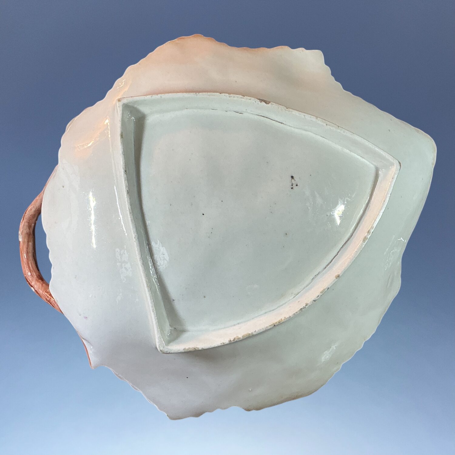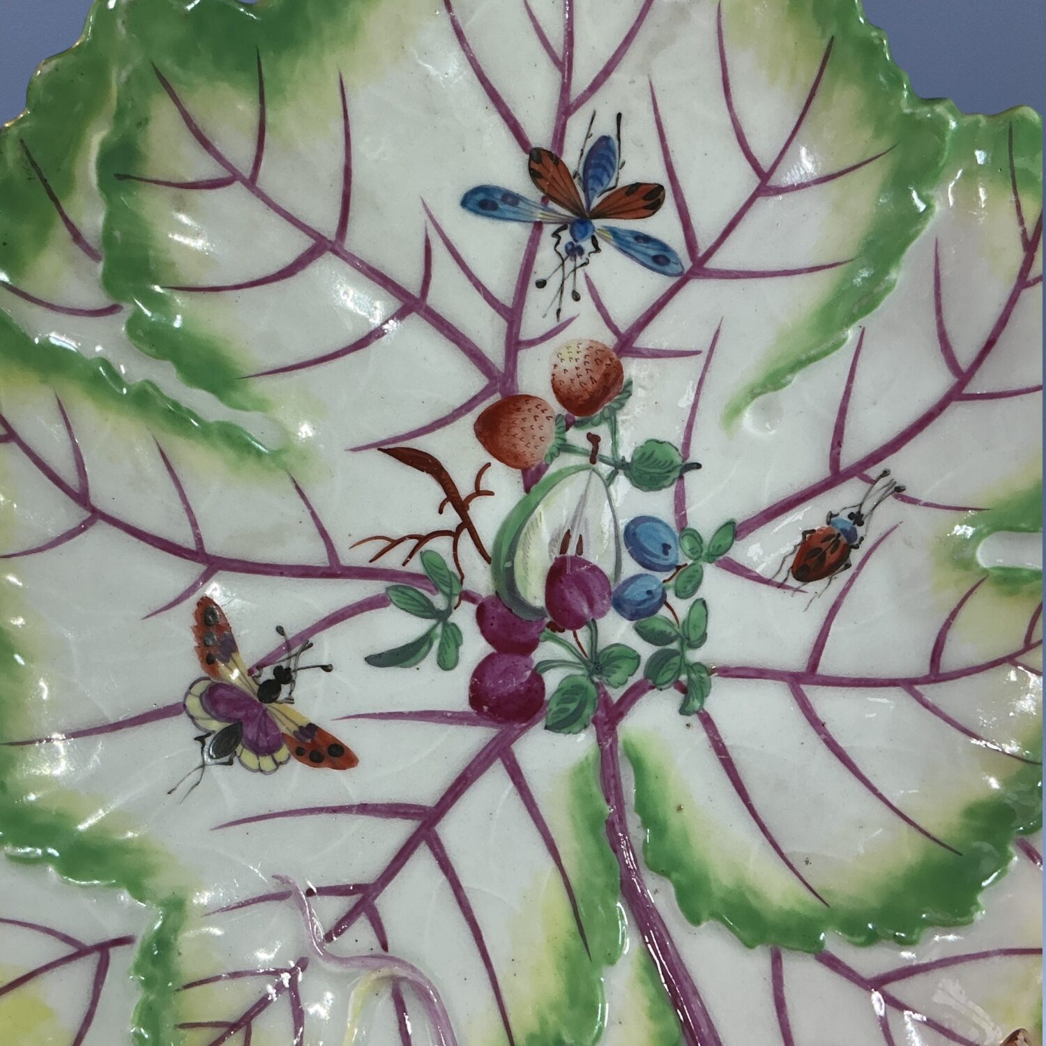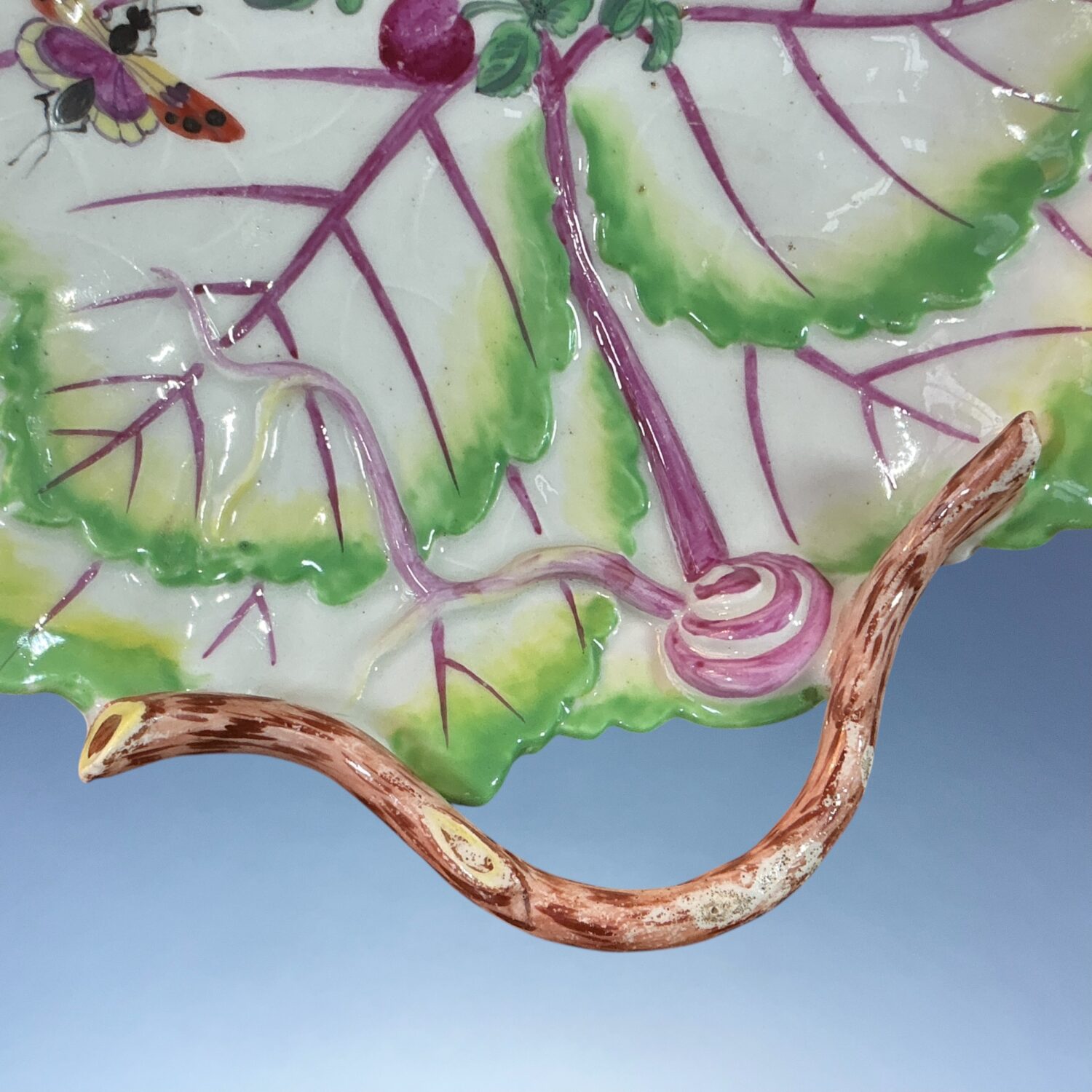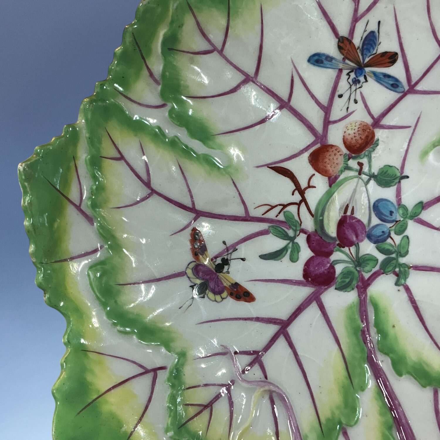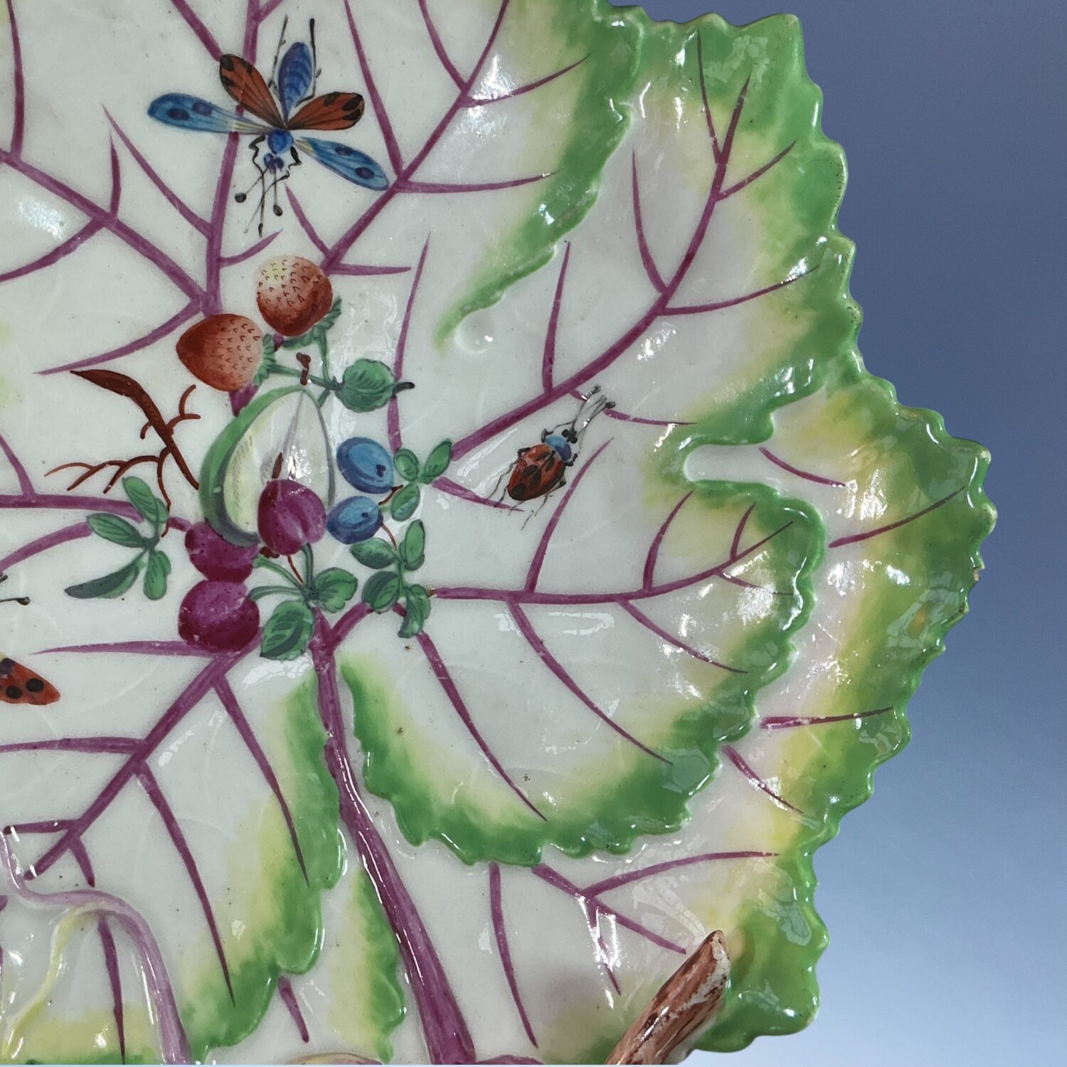 18th century Worcester (Dr Wall/1st period) soft paste porcelain leaf shape dish with handle, decorated with hand painted ‘cut fruit’ and insects in polychrome enamels.