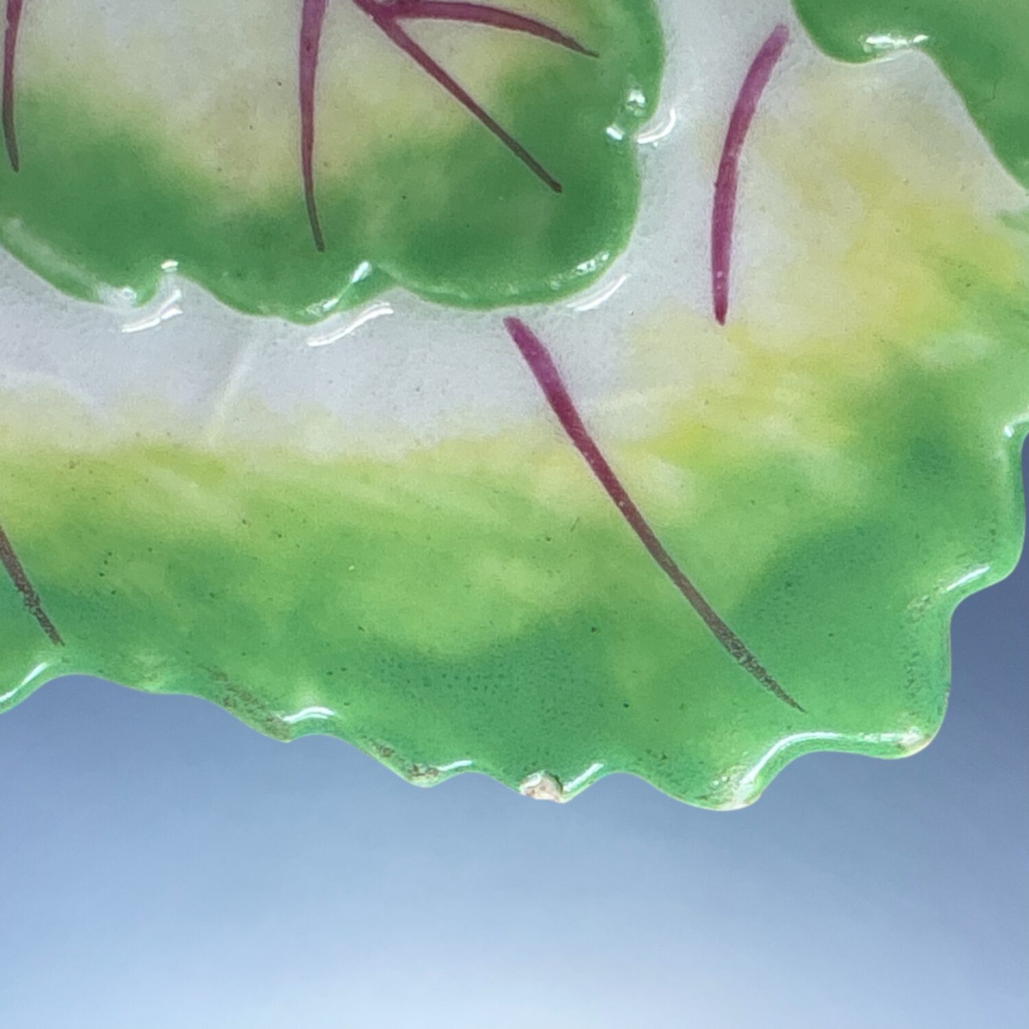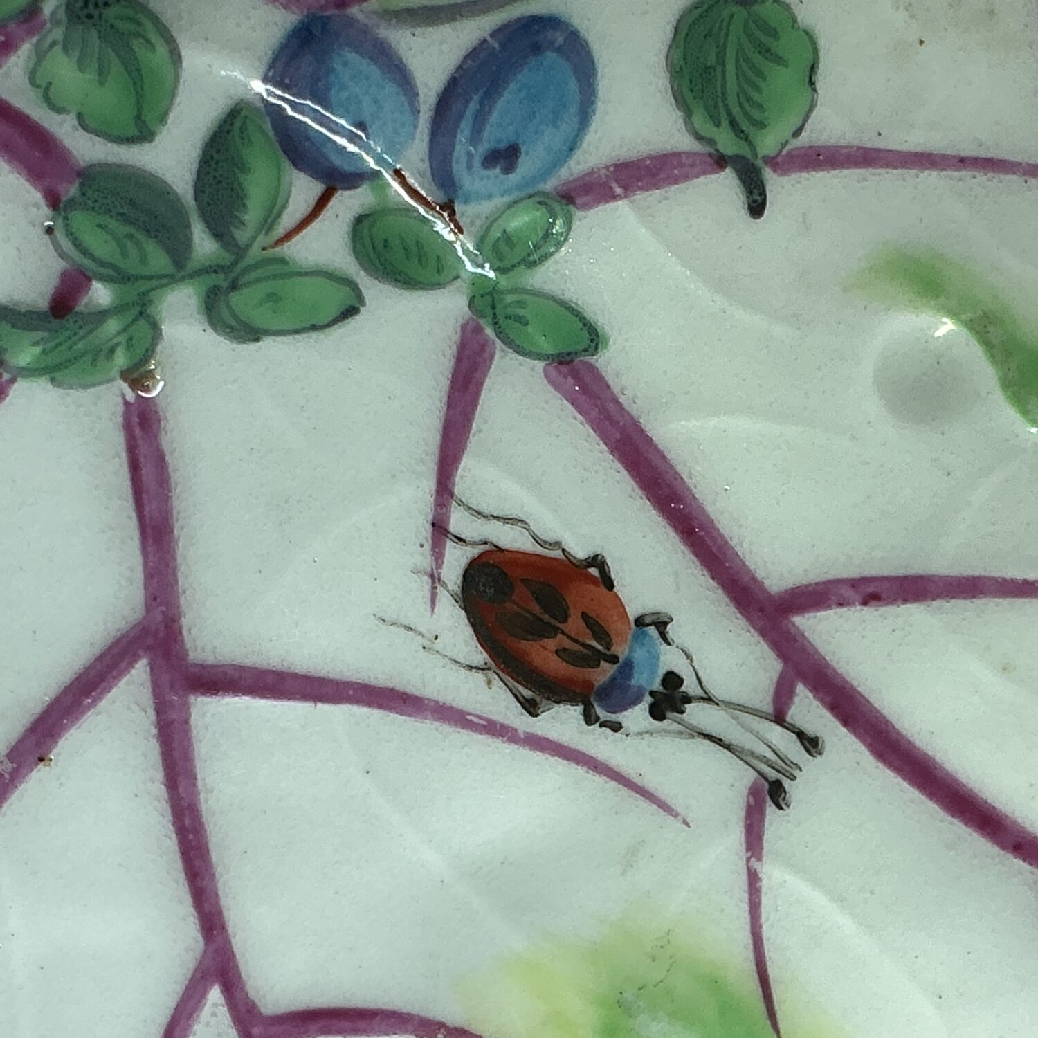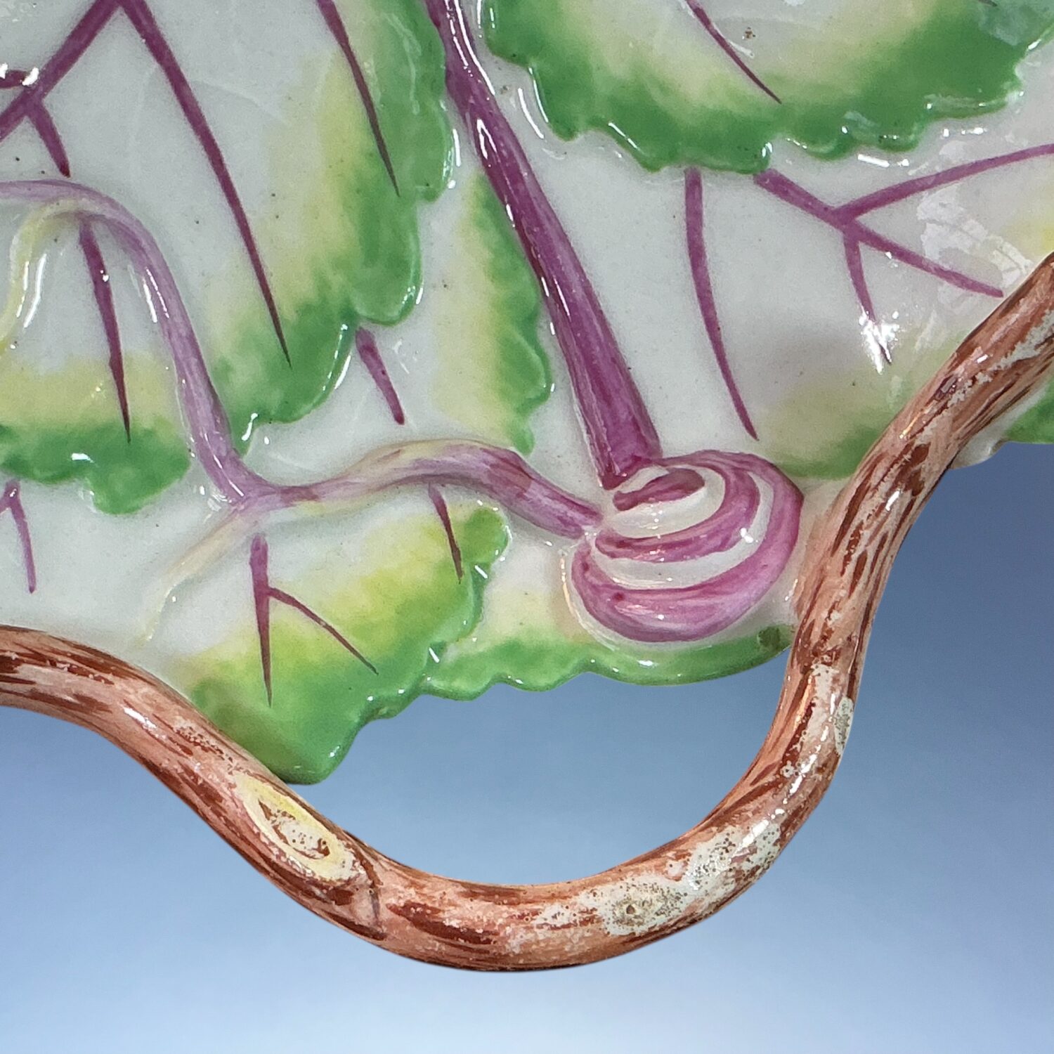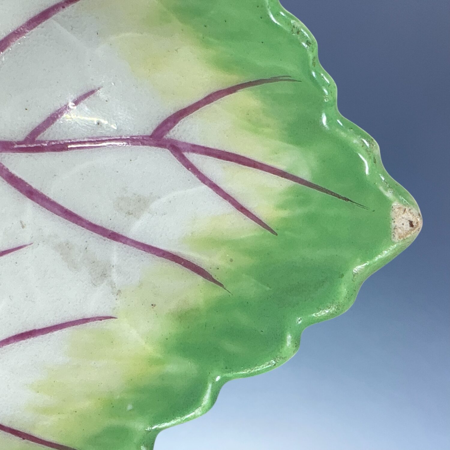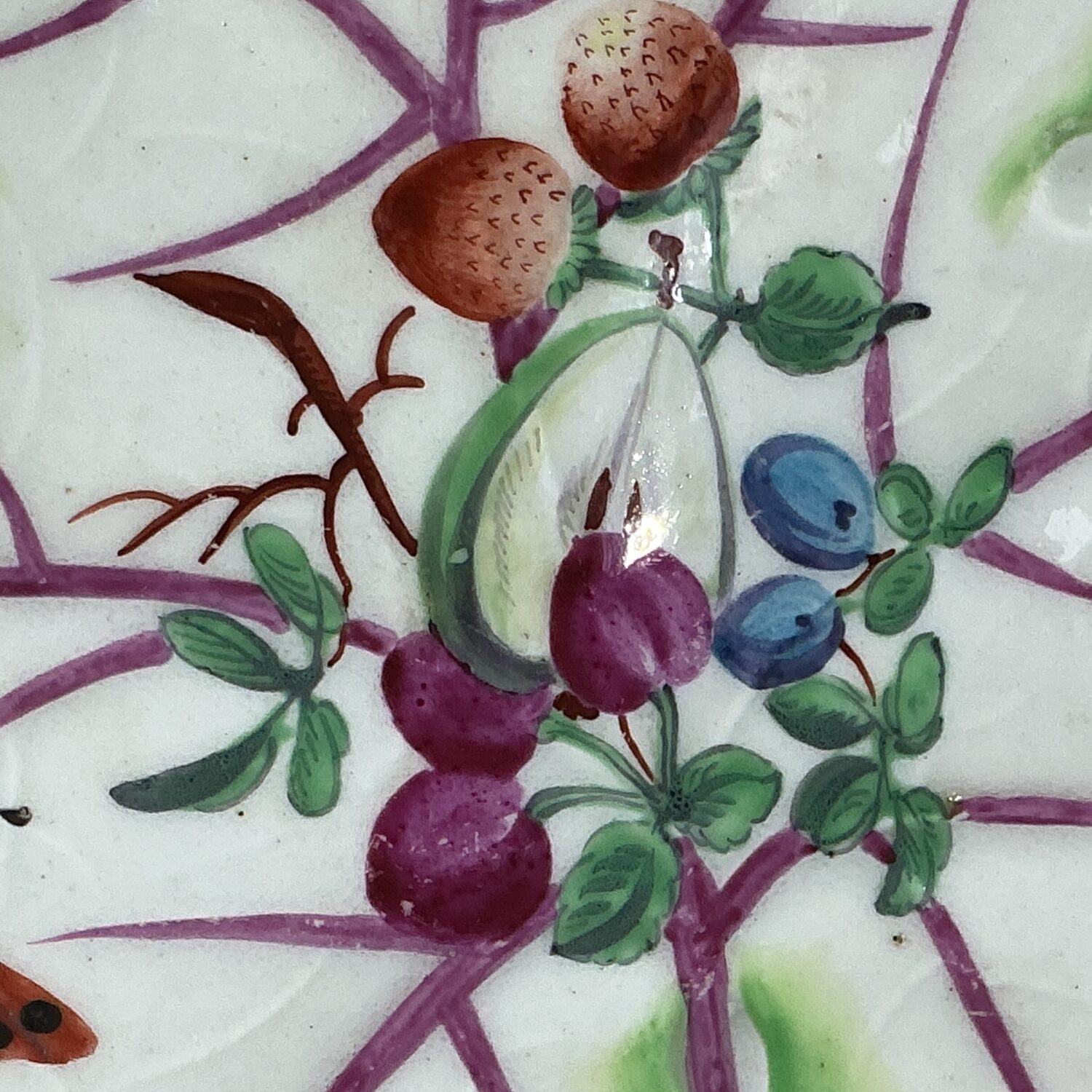 18th century Worcester (Dr Wall/1st period) soft paste porcelain leaf shape dish with handle, decorated with hand painted ‘cut fruit’ and insects in polychrome enamels.