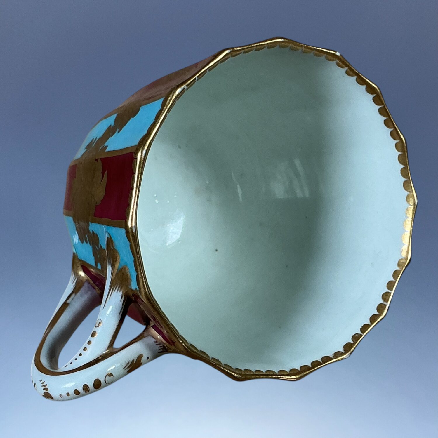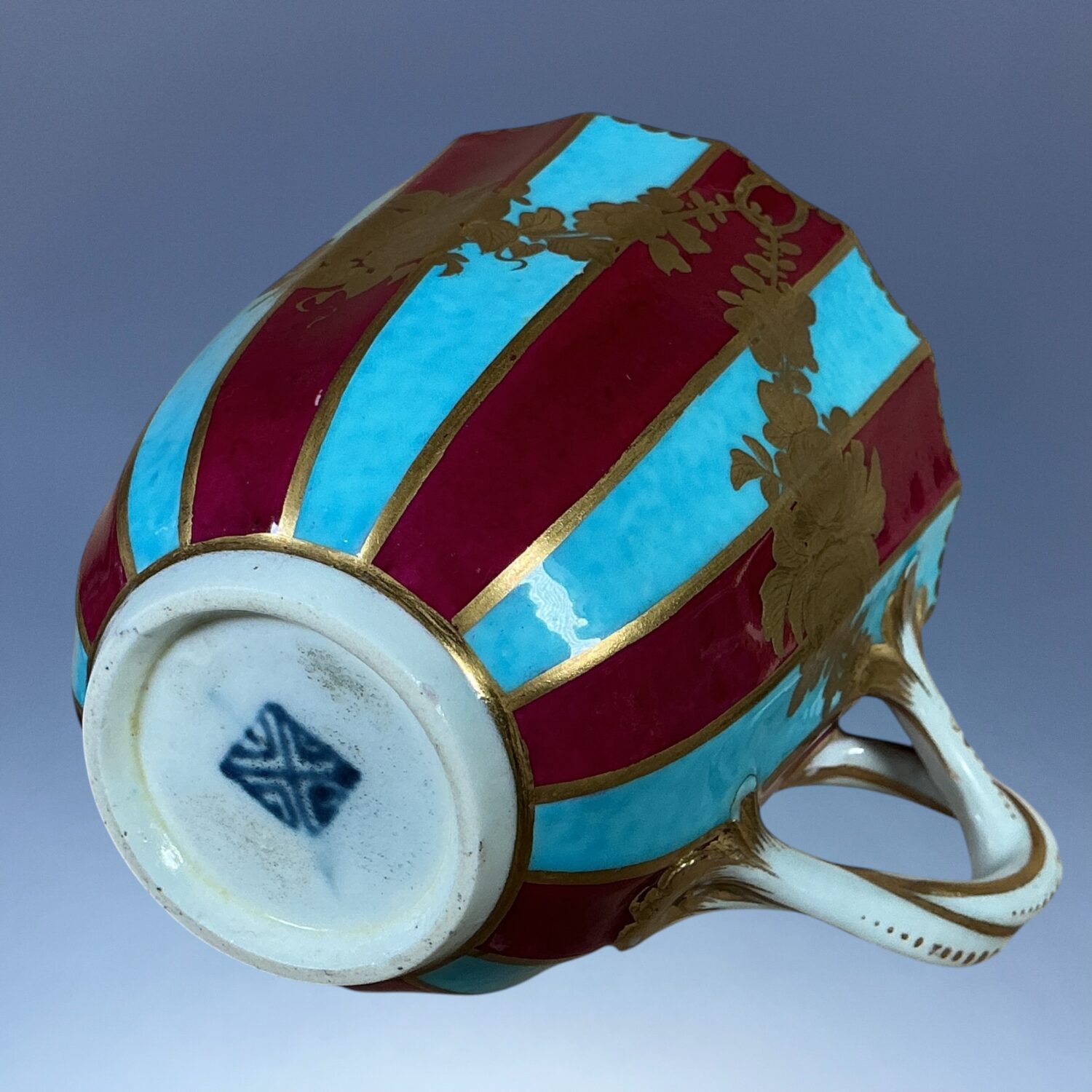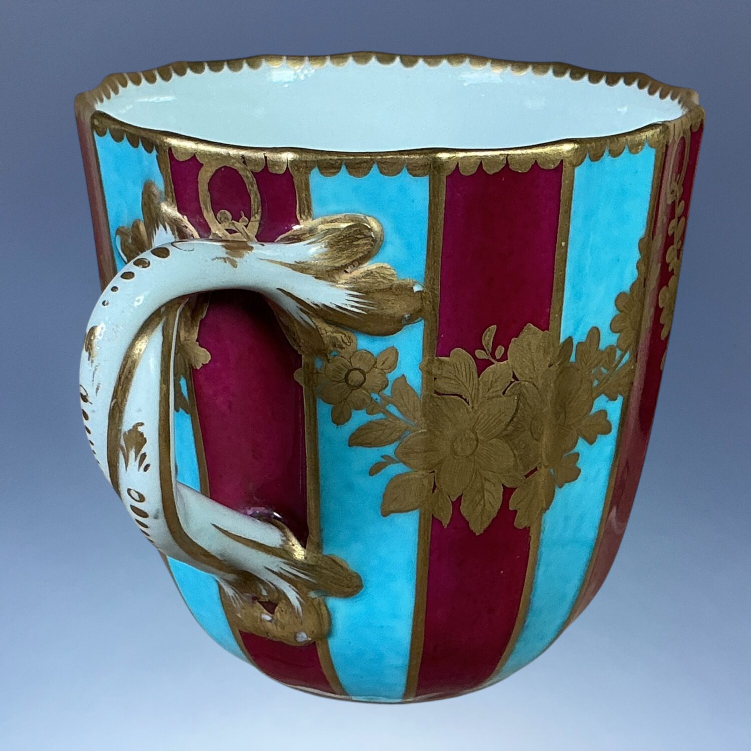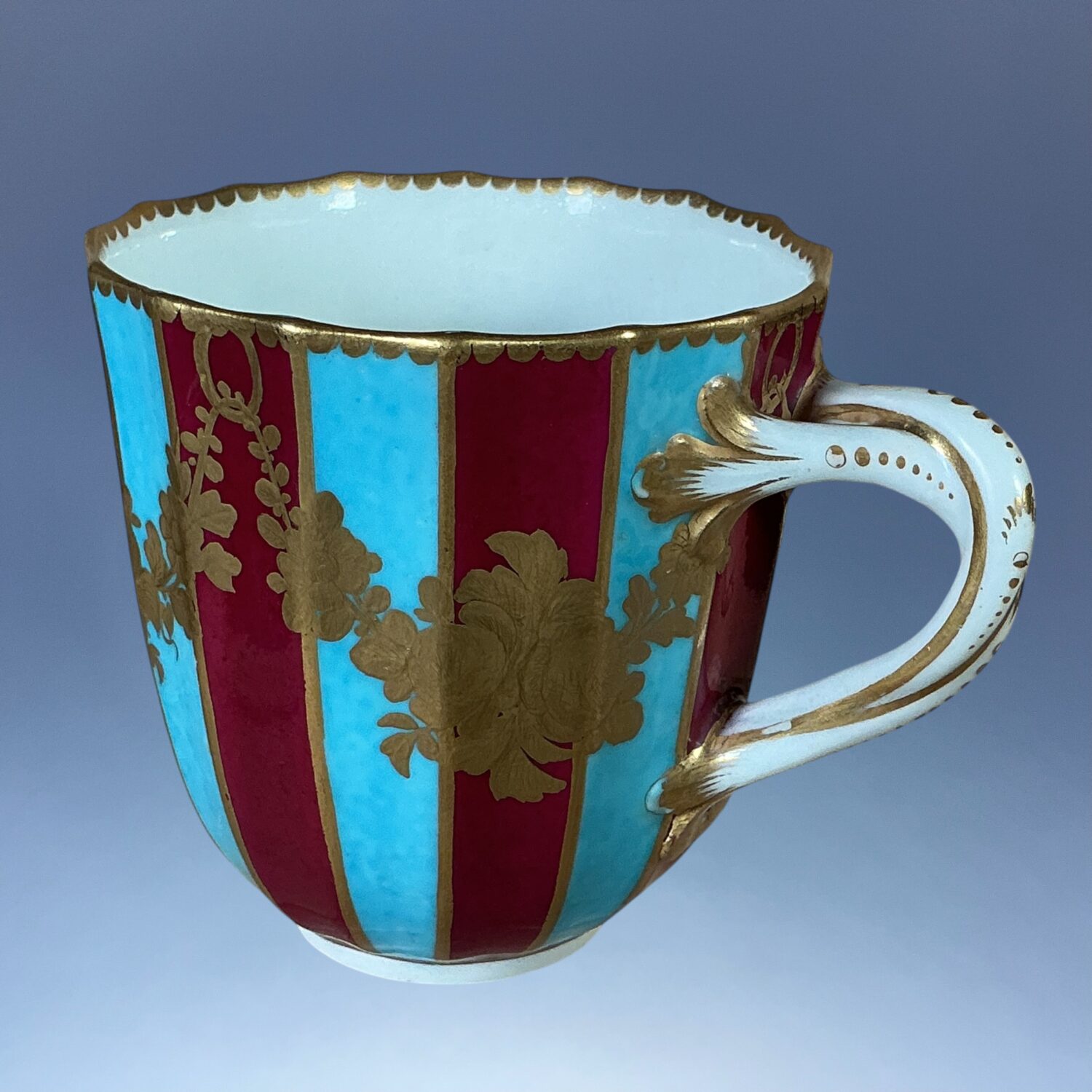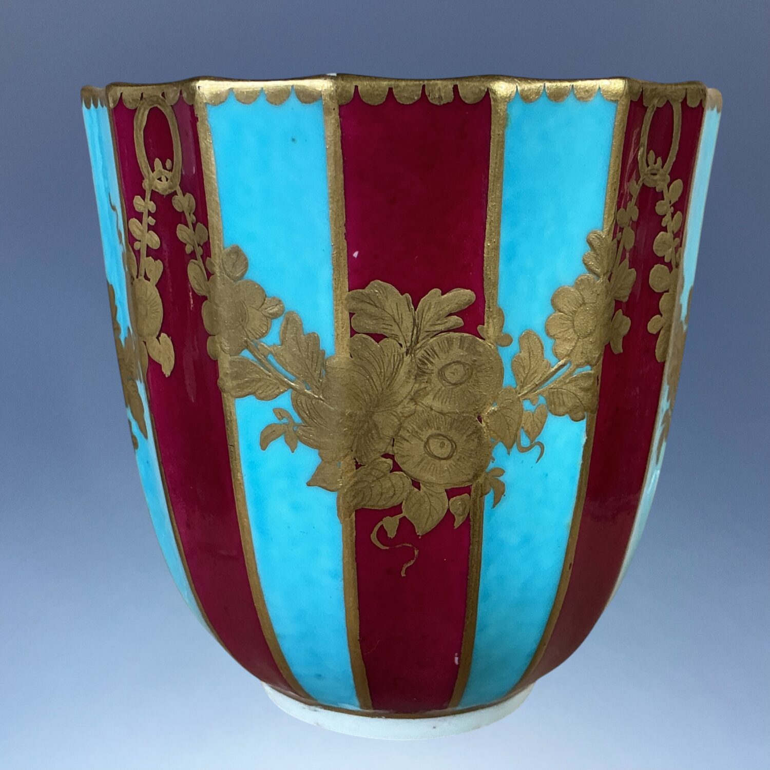 Dr Wall or 1st period, Worcester porcelain large fluted coffee cup, boldly *decorated with alternating claret and turquoise stripes with swags of flowers in chiselled gilding.