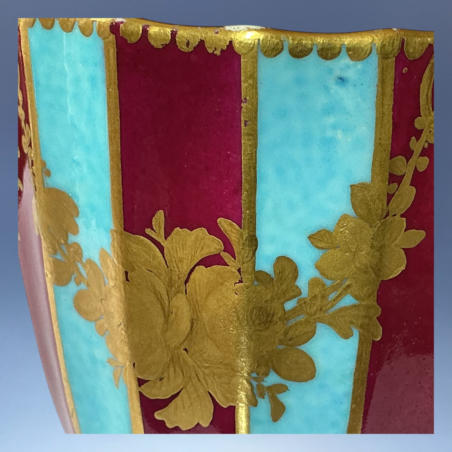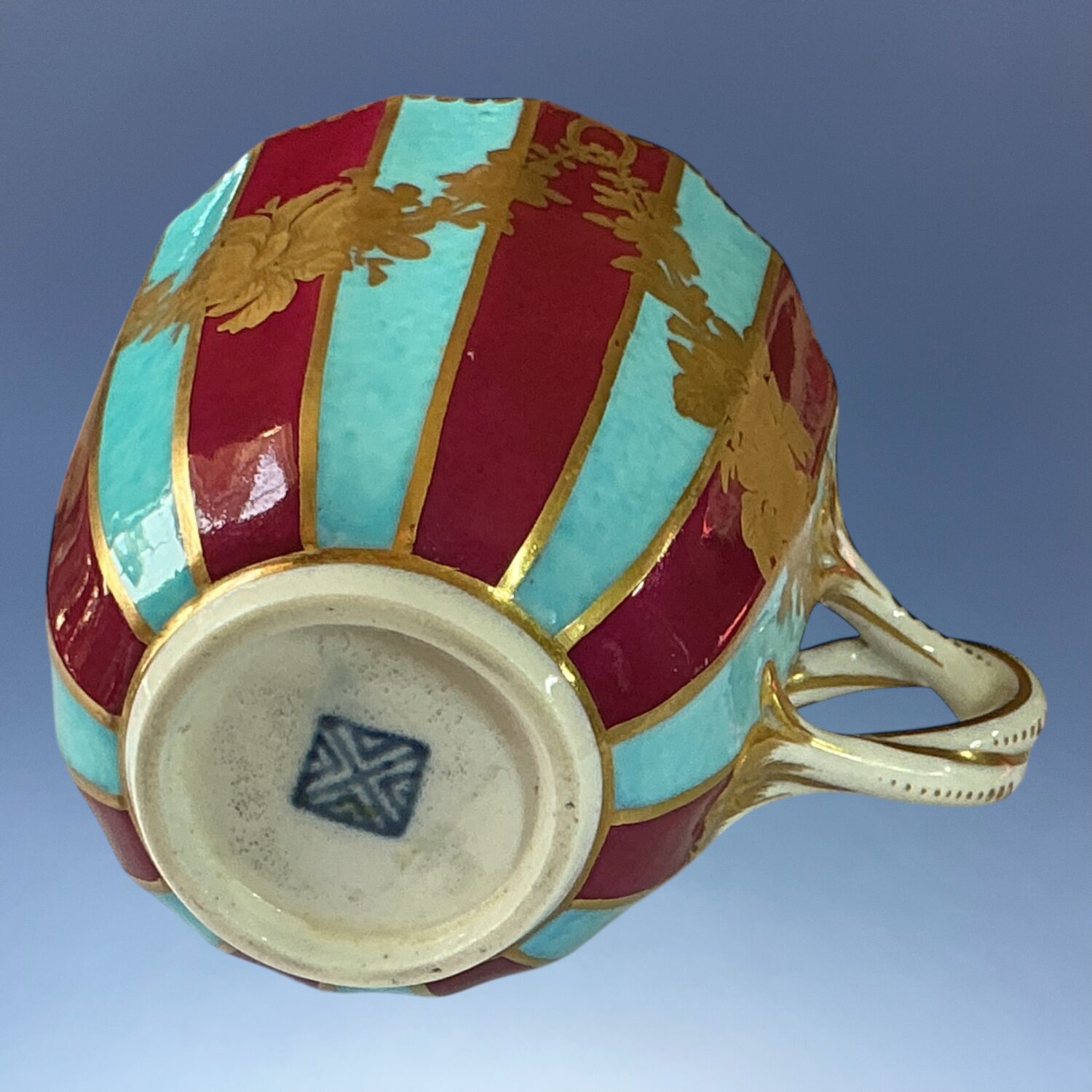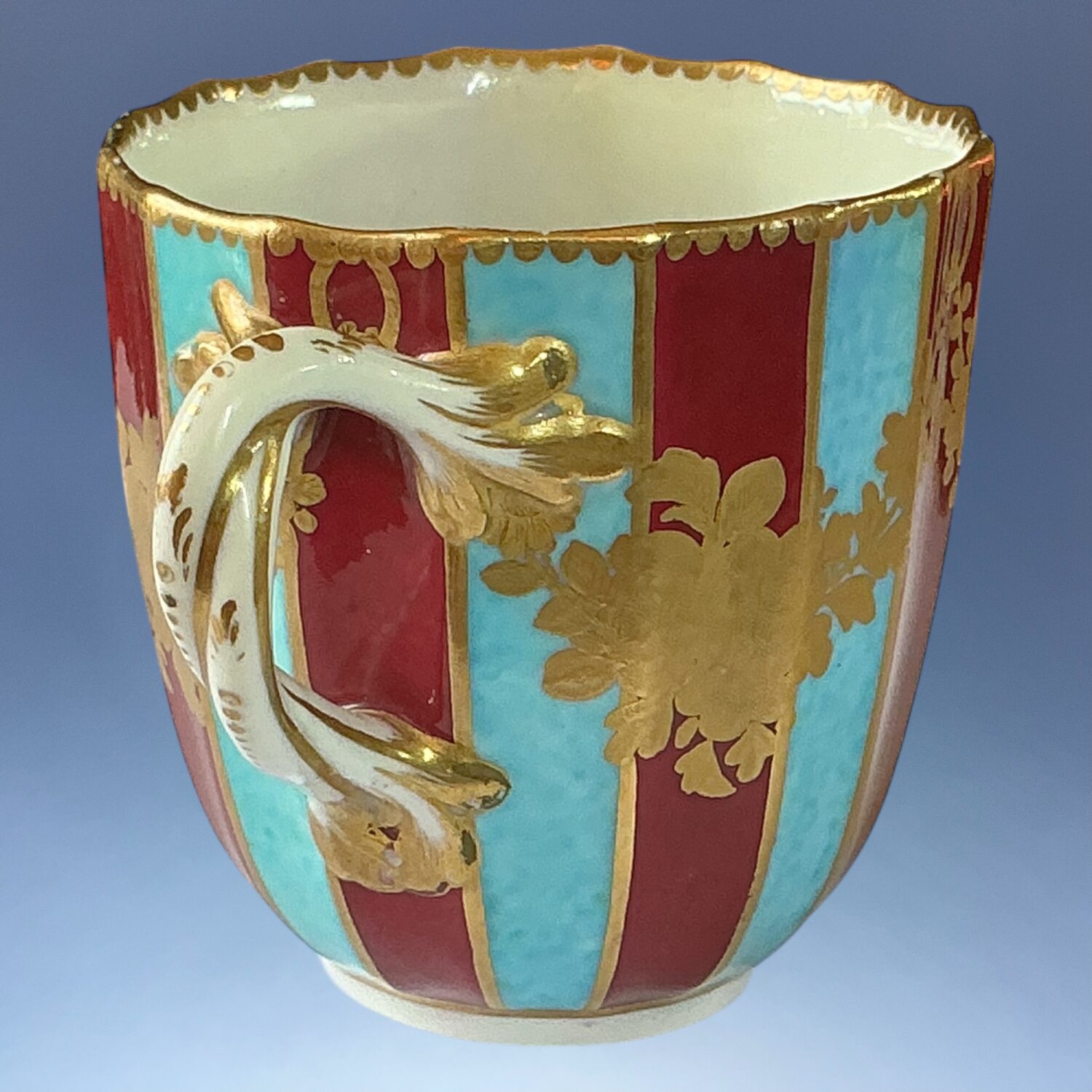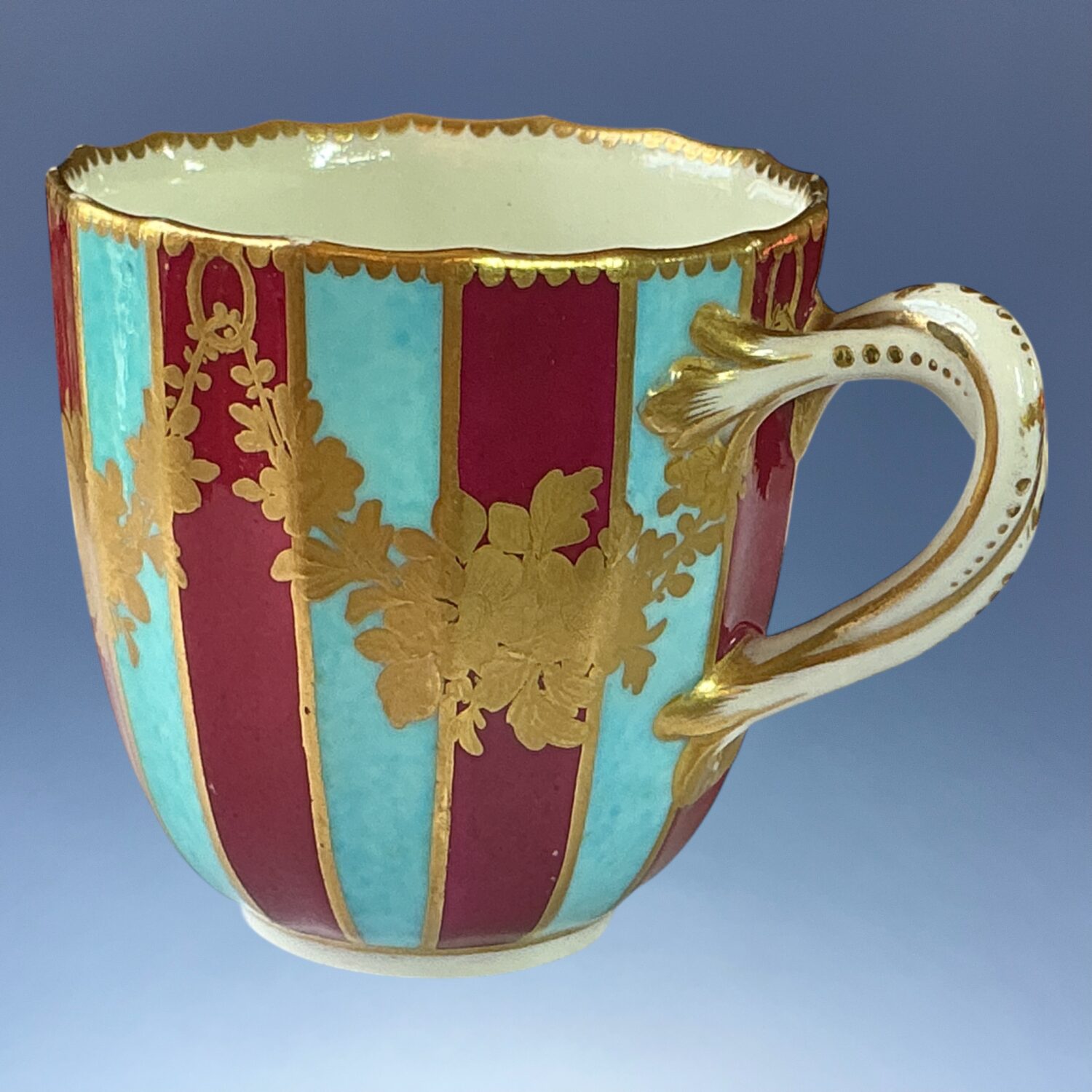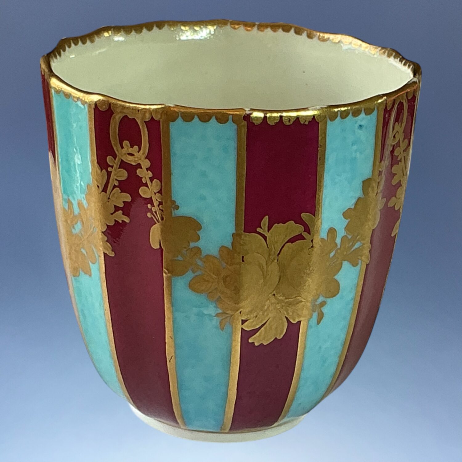 Dr Wall or 1st period, Worcester porcelain large fluted coffee cup, boldly *decorated with alternating claret and turquoise stripes with swags of flowers in chiselled gilding.