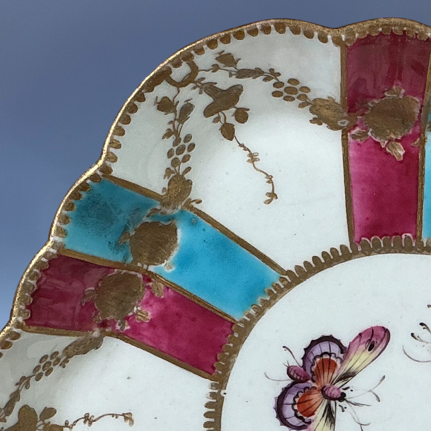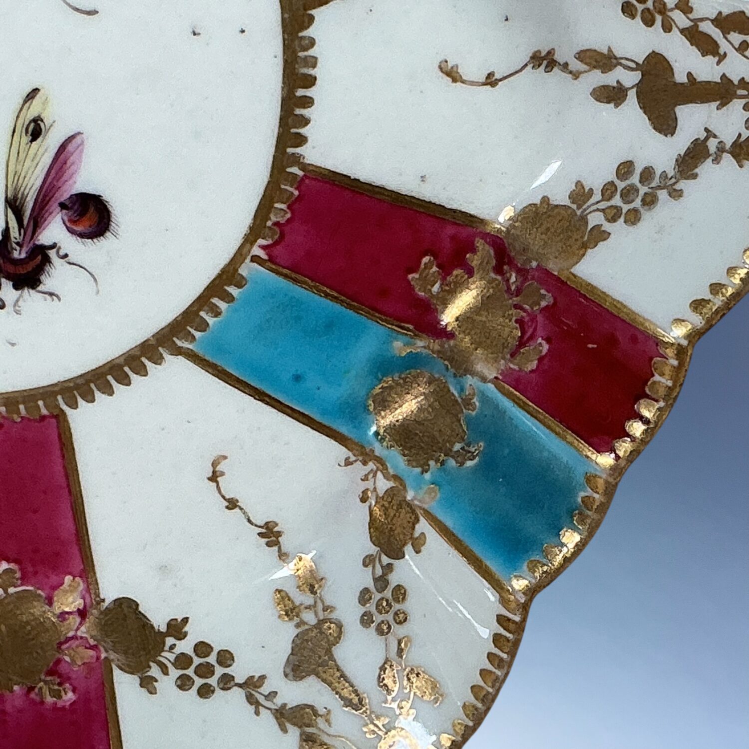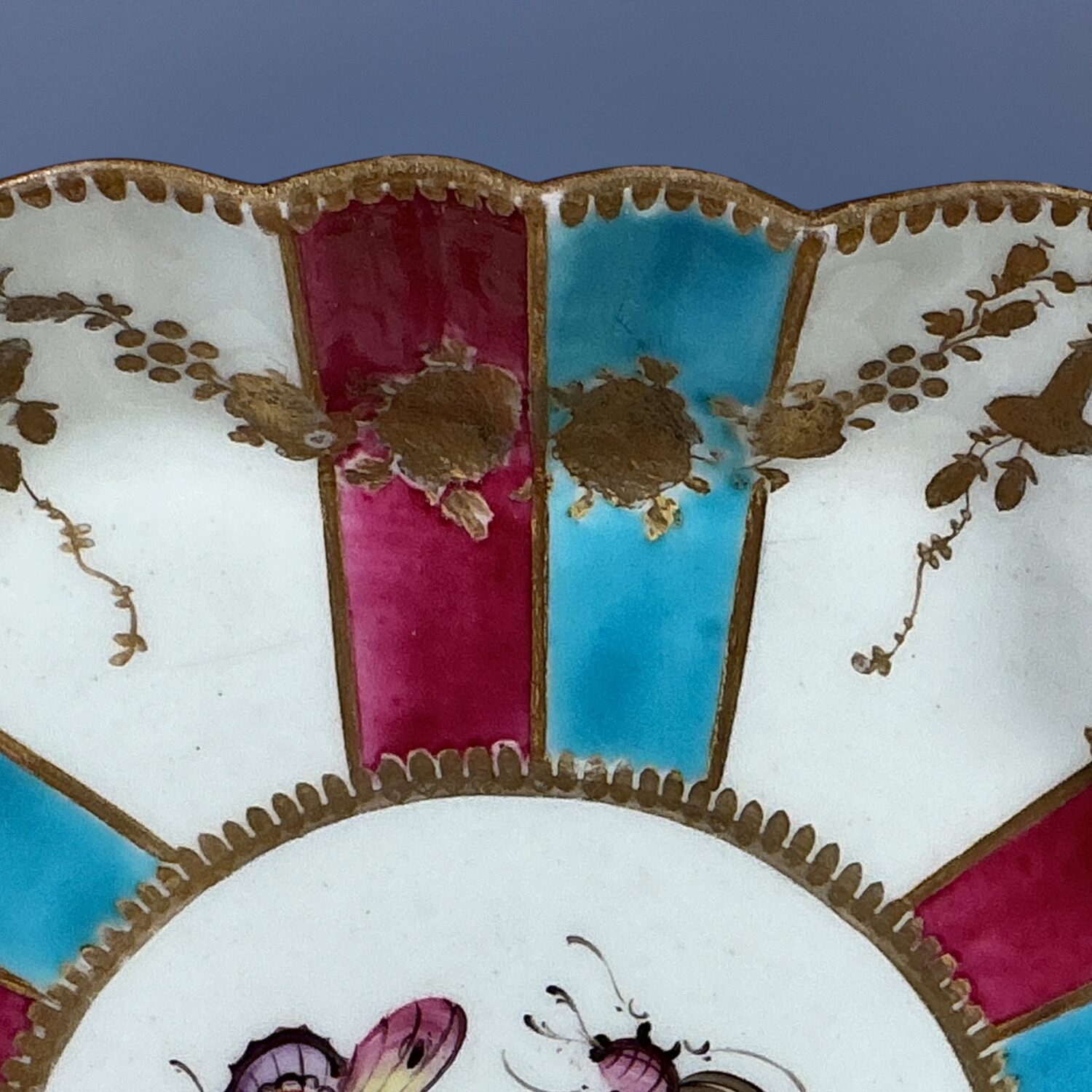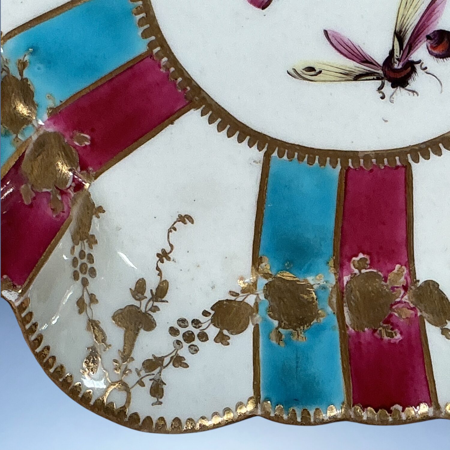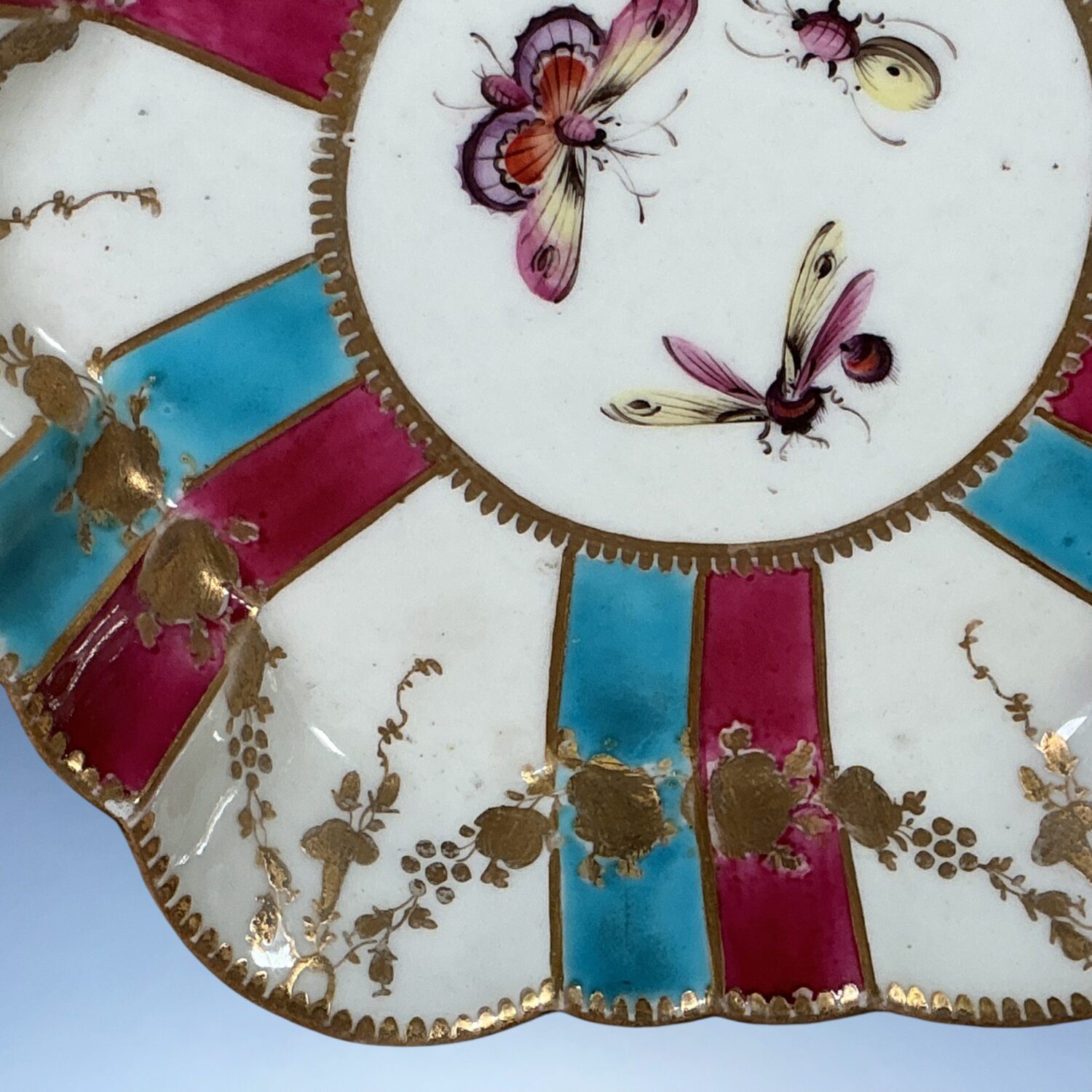 An attractive 18th century Worcester porcelain hexagonal teapot-stand, decorated with radiating claret and turquoise stripes, gilt floral swags and scattered insects painted in polychrome enamels, likely re-decorated or ‘improved’ during the late 19th or early 20th century,