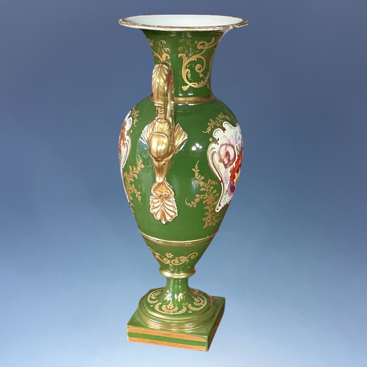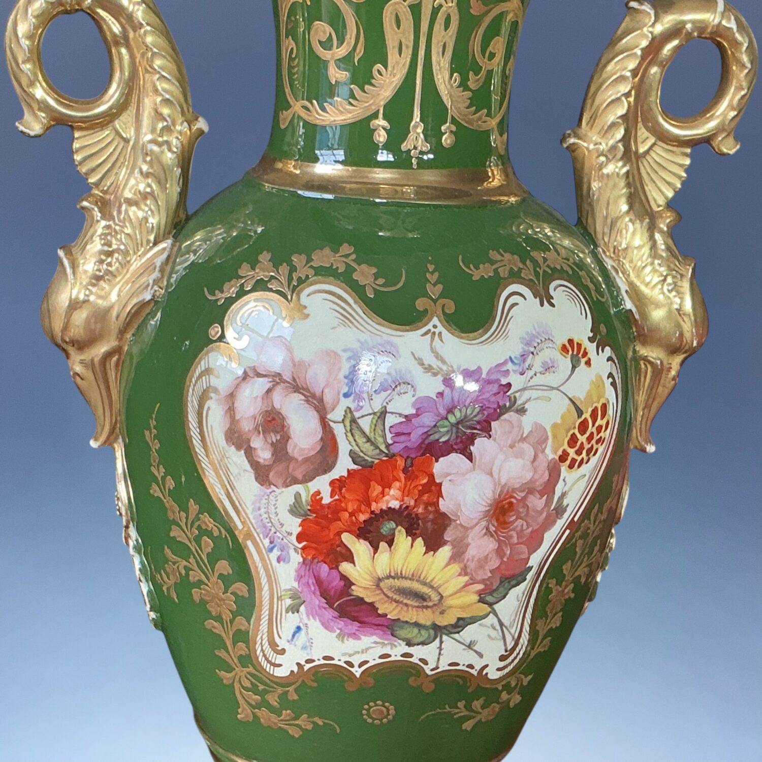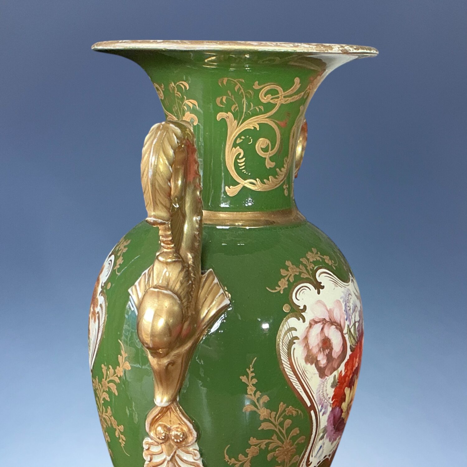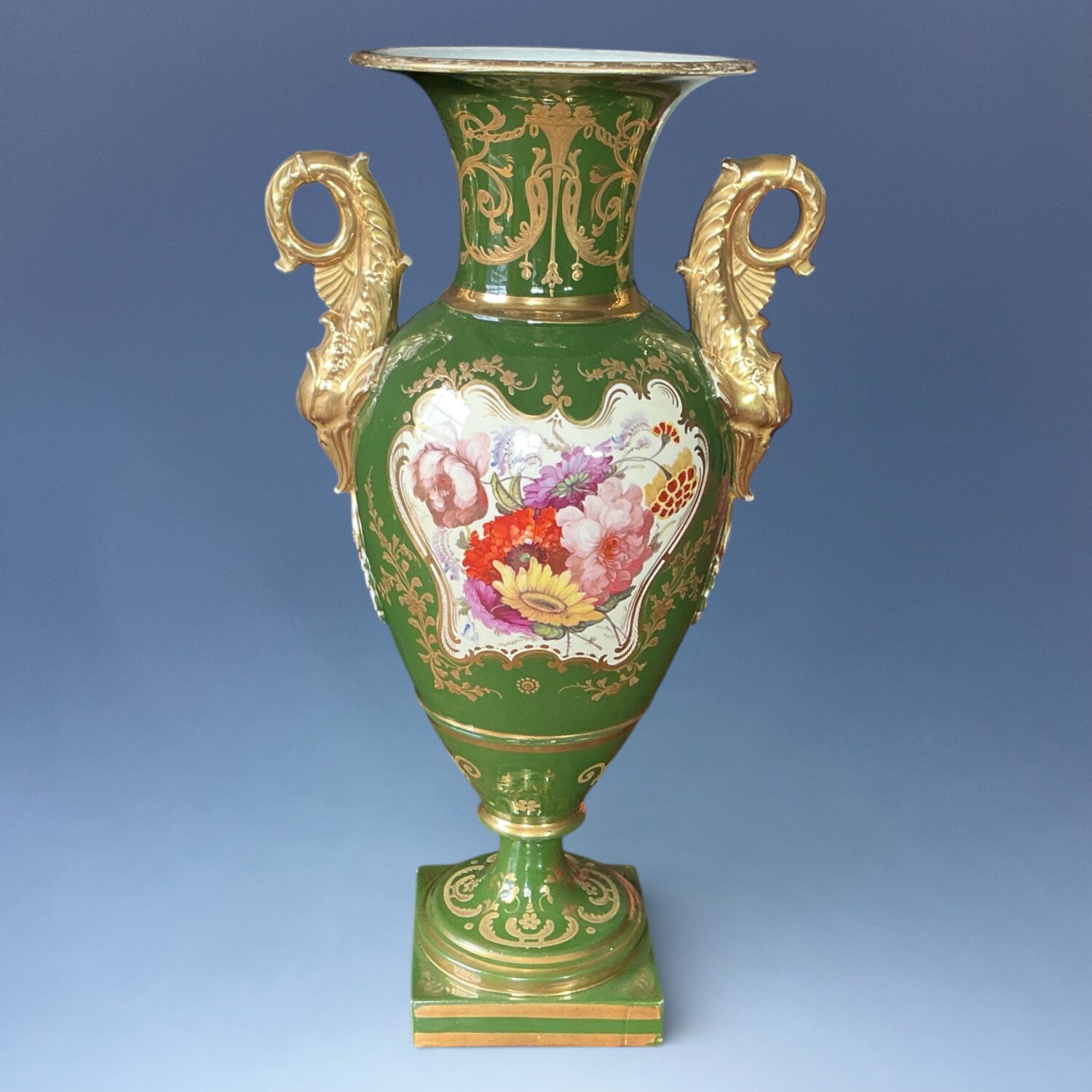 A very decorative early 19th century English porcelain vase with Dolphin handles, decorated with a finely painted reserve of flowers, the reverse with a landscape scene, against a very rich green ground with elaborate raised and burnished gilding.
