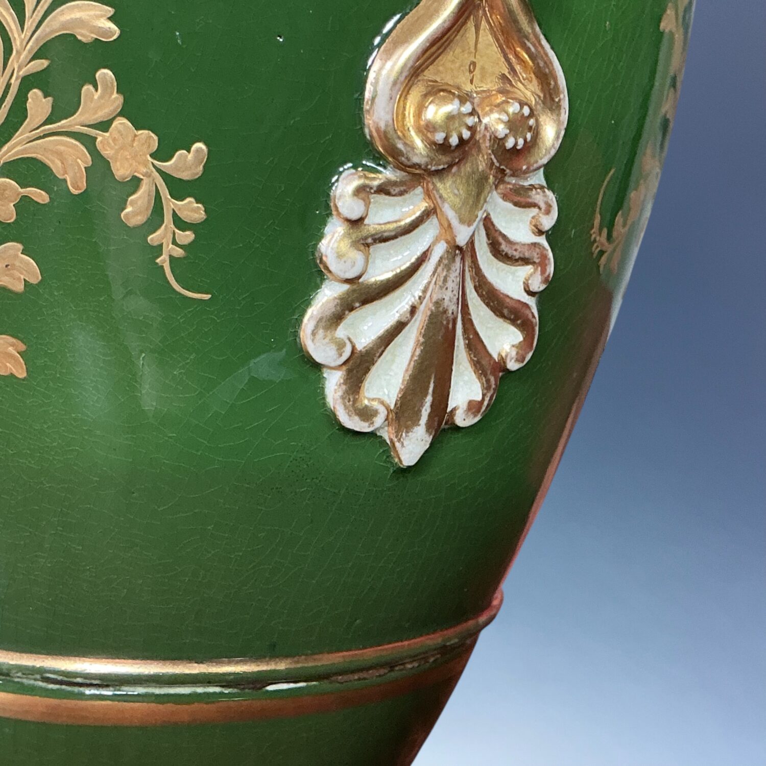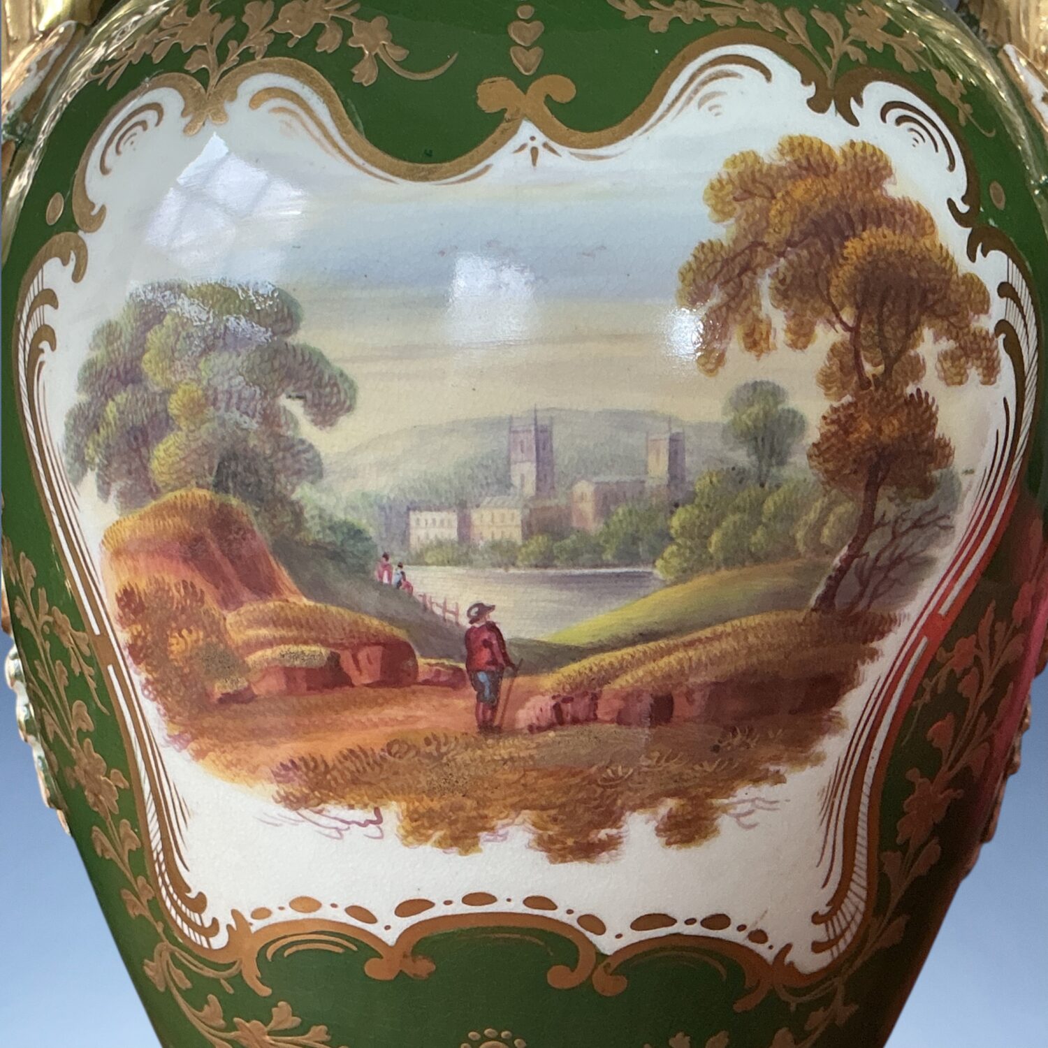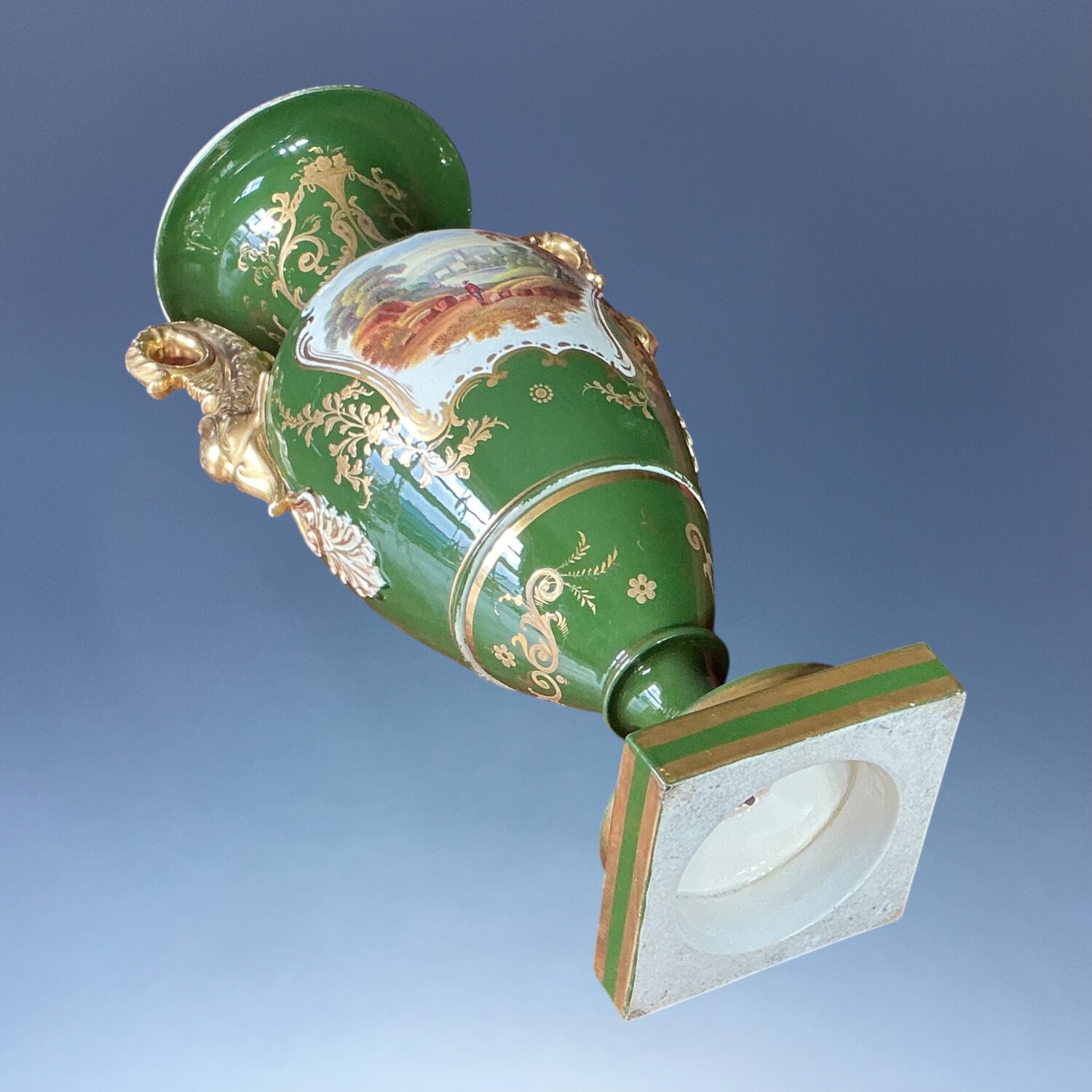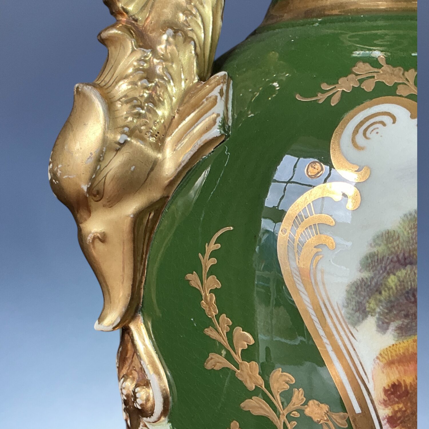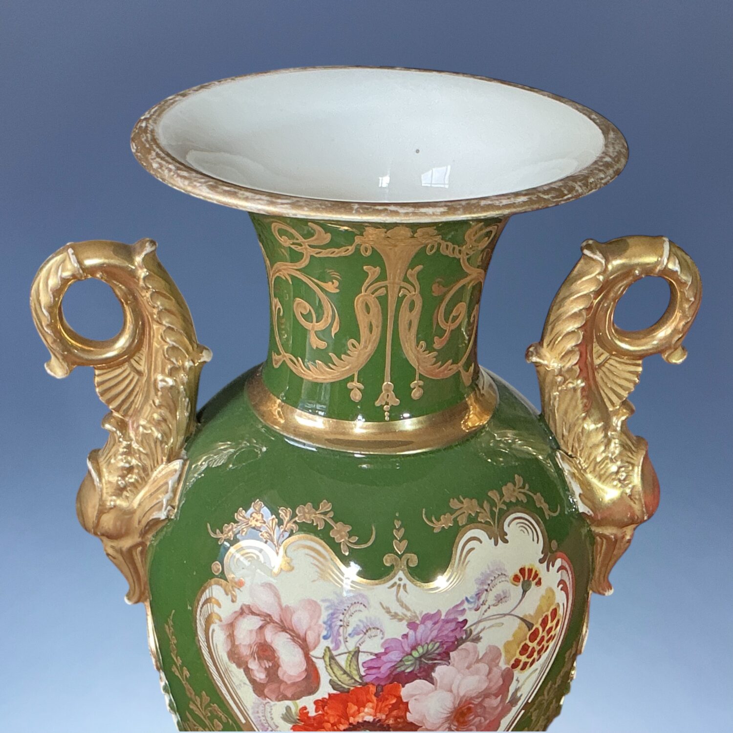 A very decorative early 19th century English porcelain vase with Dolphin handles, decorated with a finely painted reserve of flowers, the reverse with a landscape scene, against a very rich green ground with elaborate raised and burnished gilding.