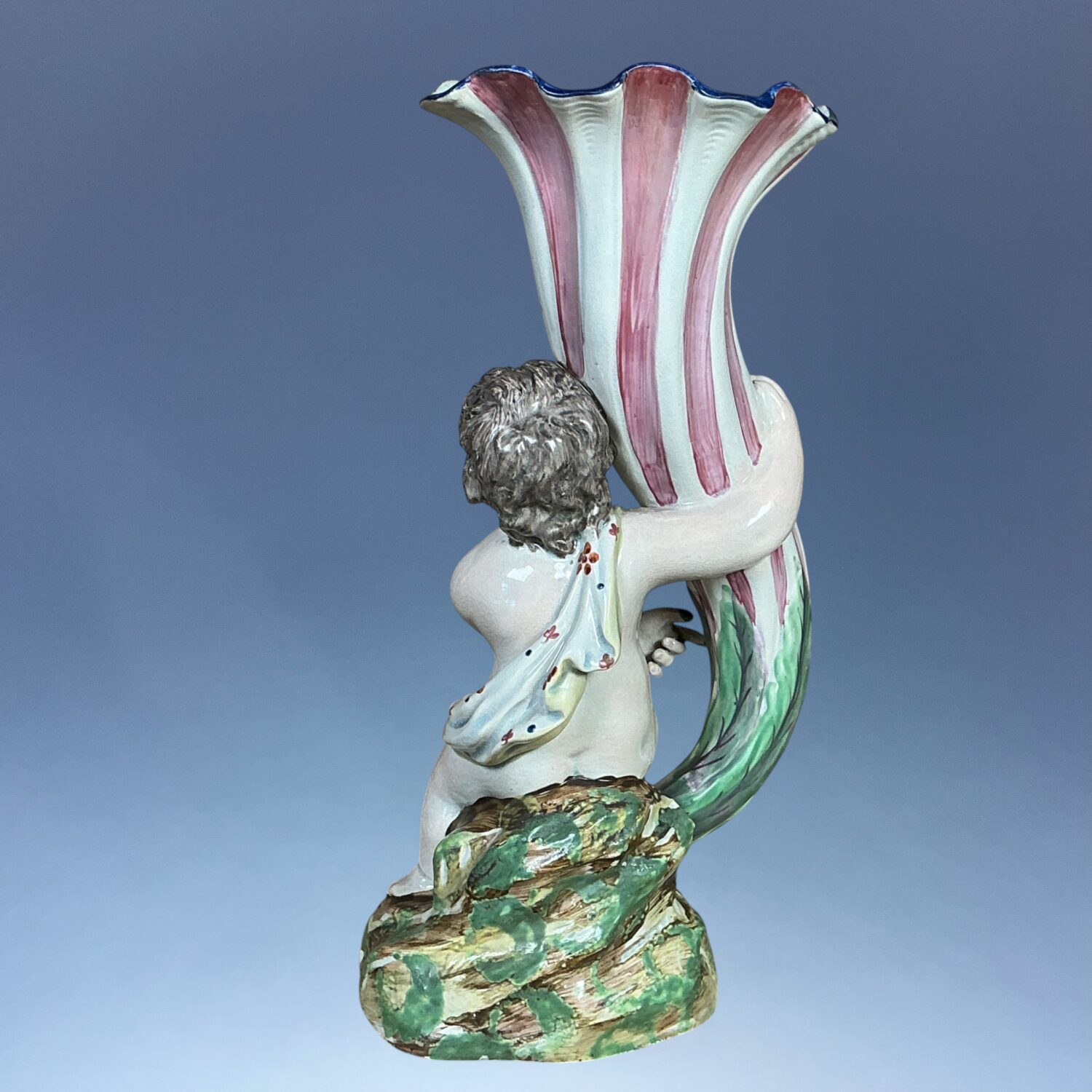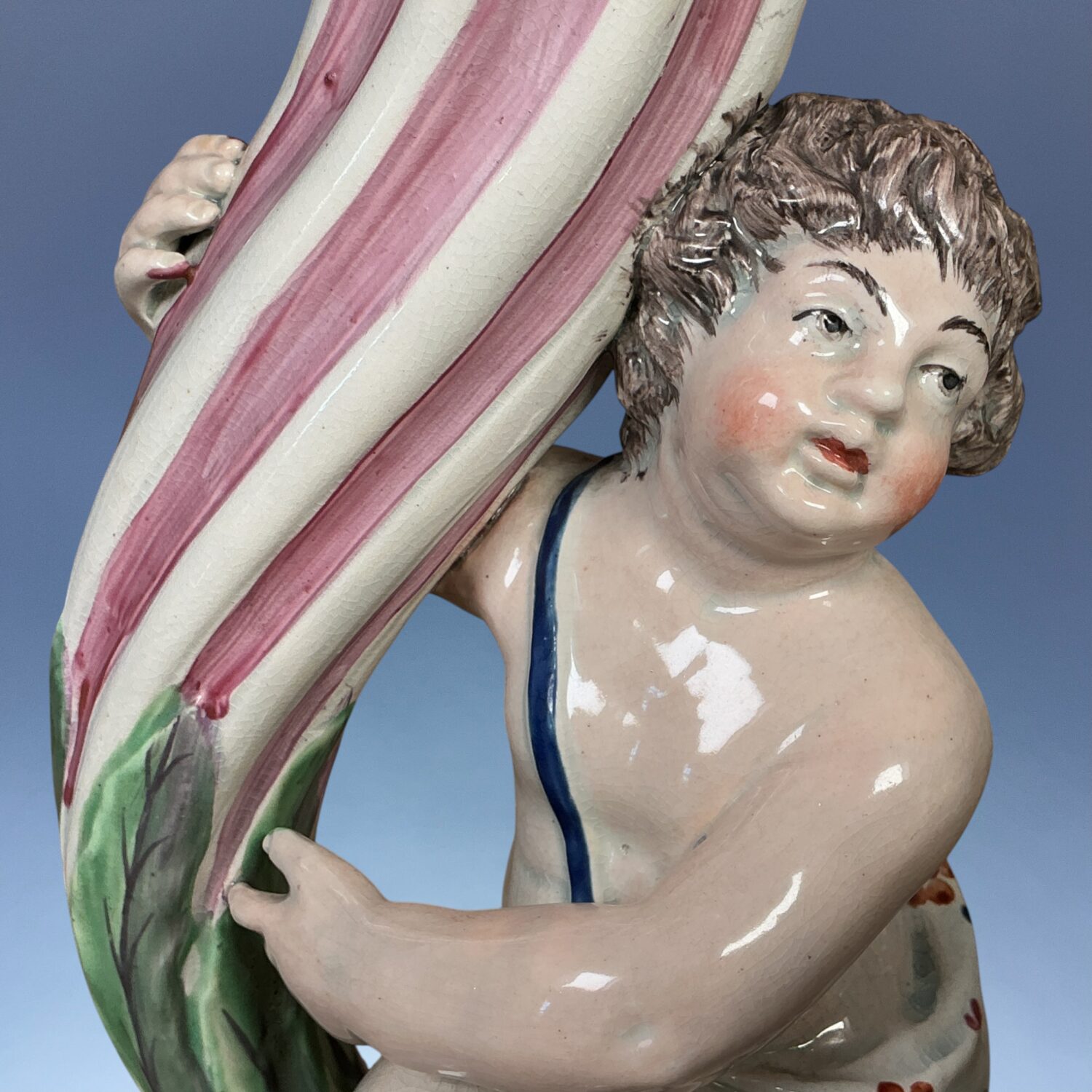 Early 19th century Staffordshire pottery spill holder in the form of a cherub holding a large wrythen moulded cornucopia.