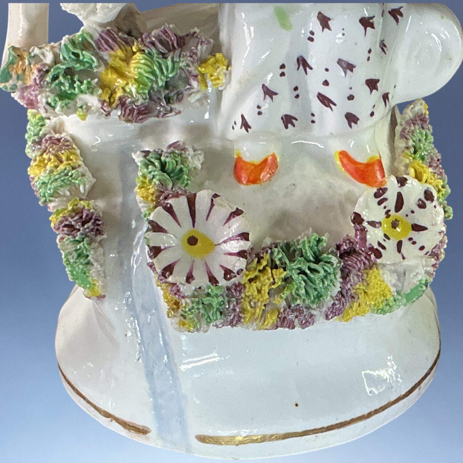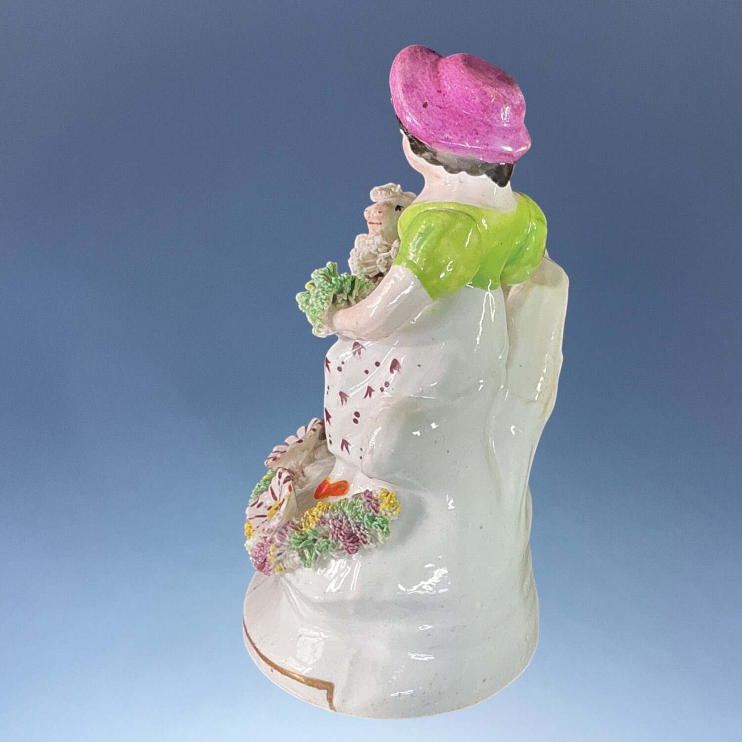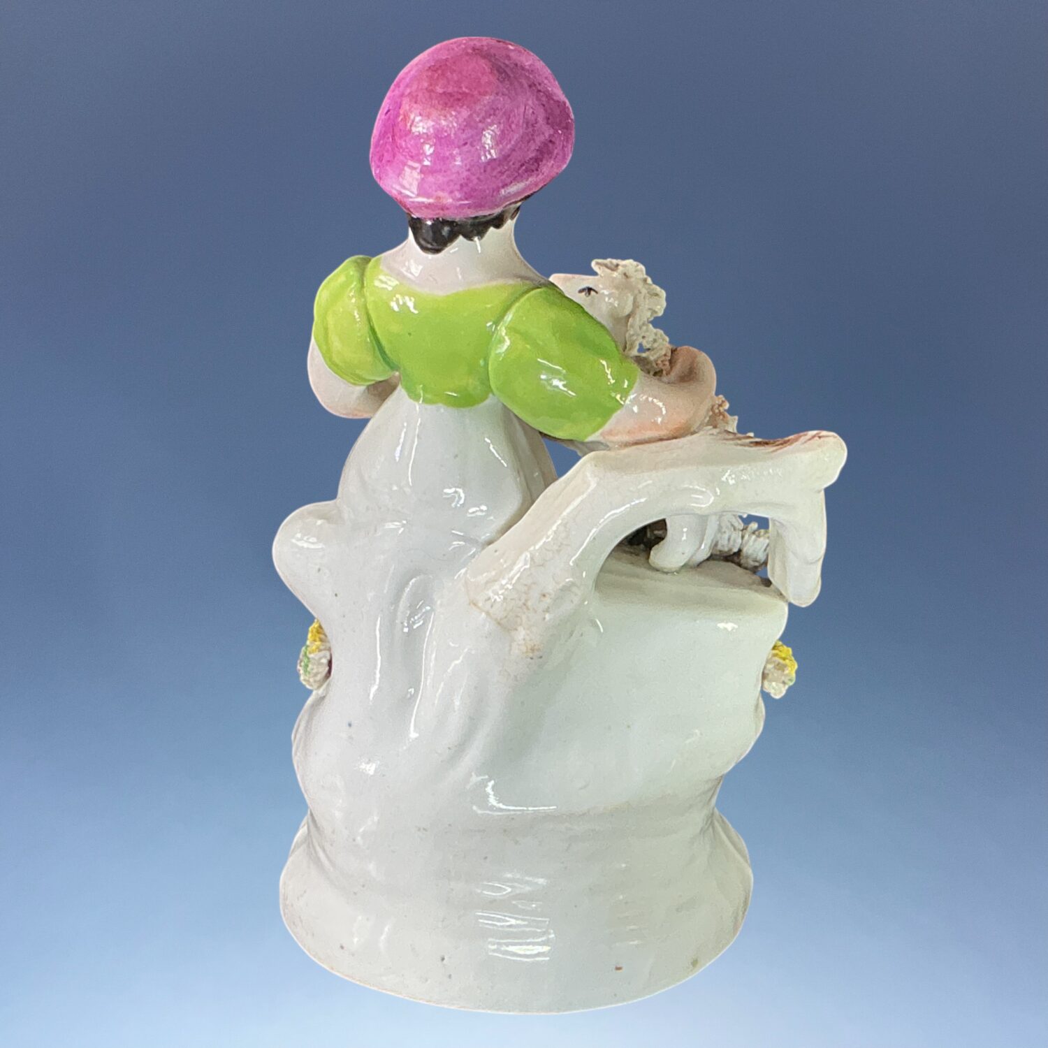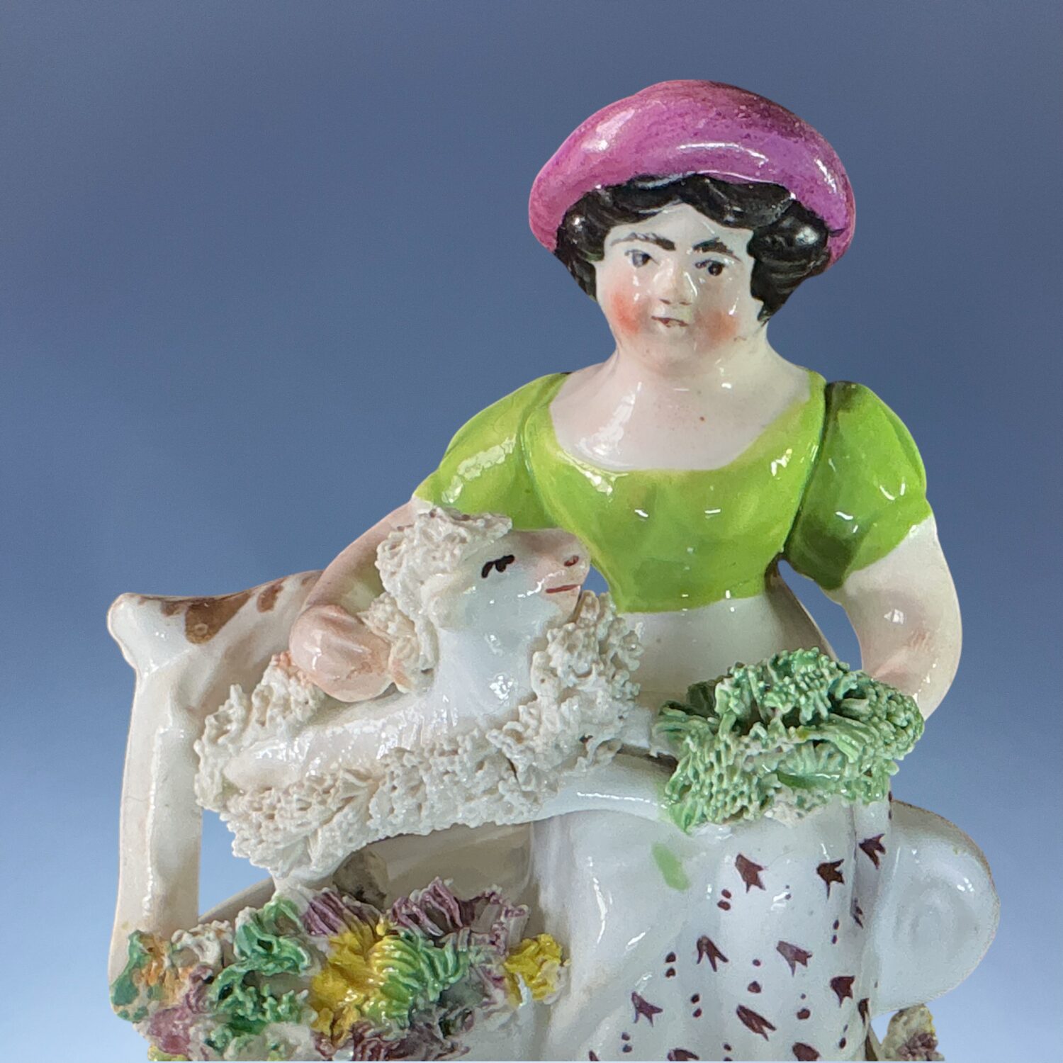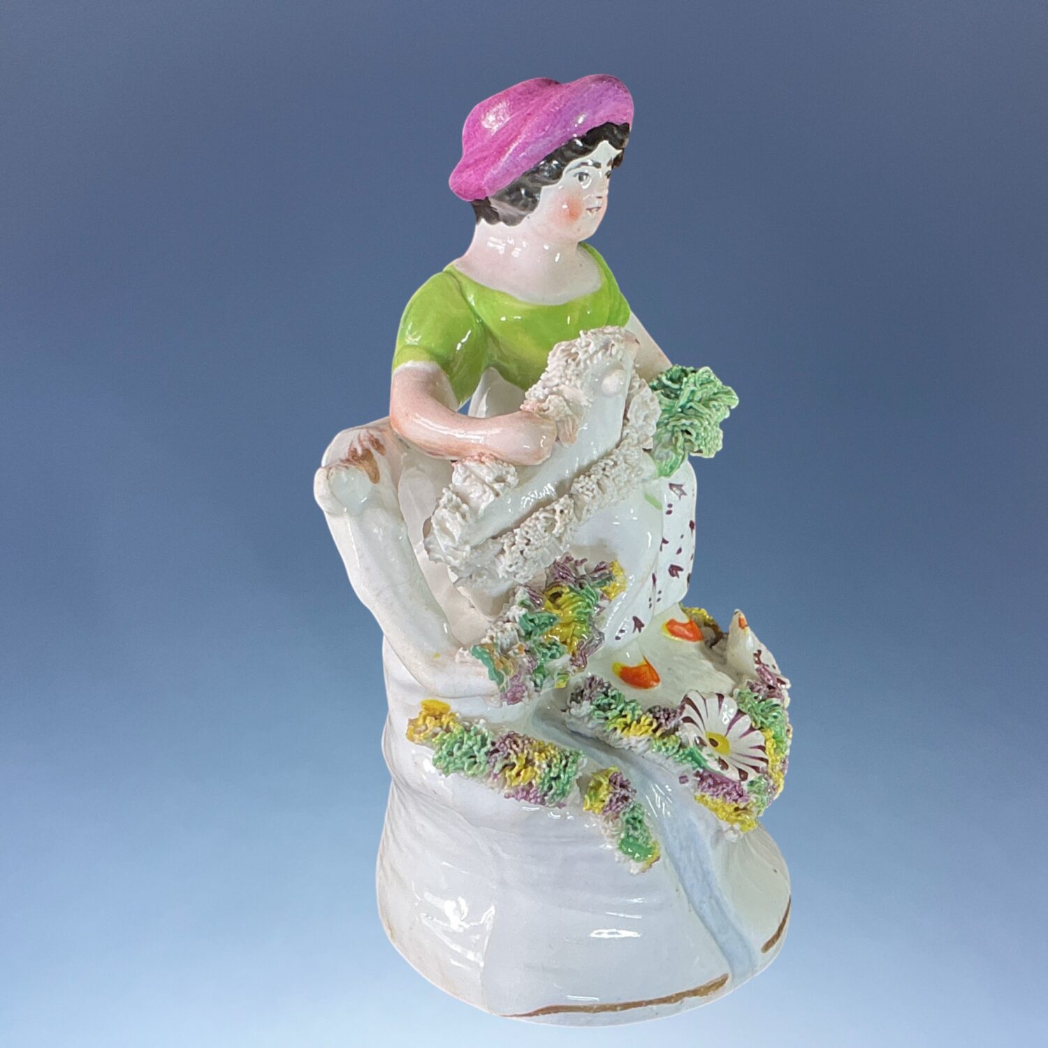 19th century Staffordshire porcelain small figure of a girl, seated on a tree stump with a goat at her side.