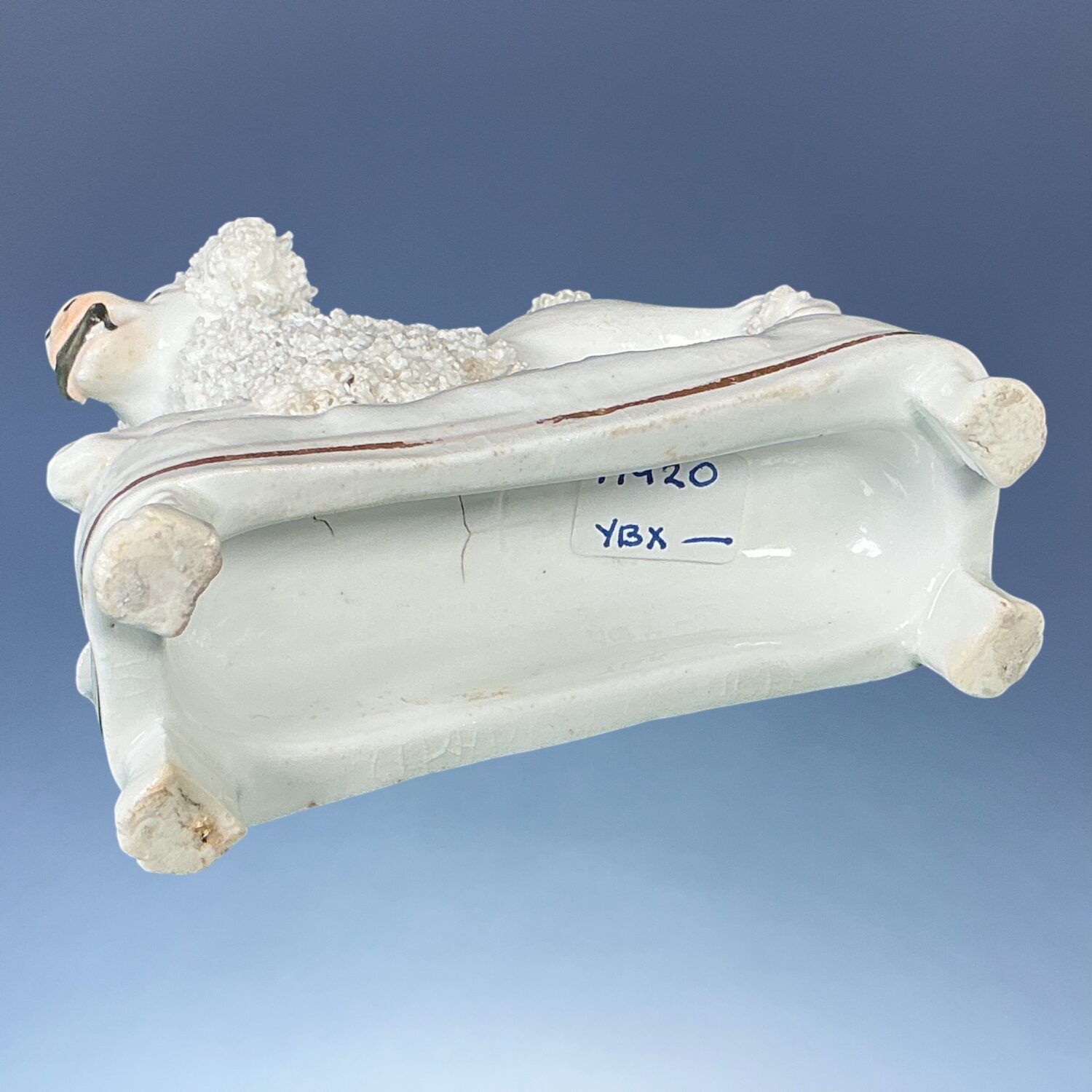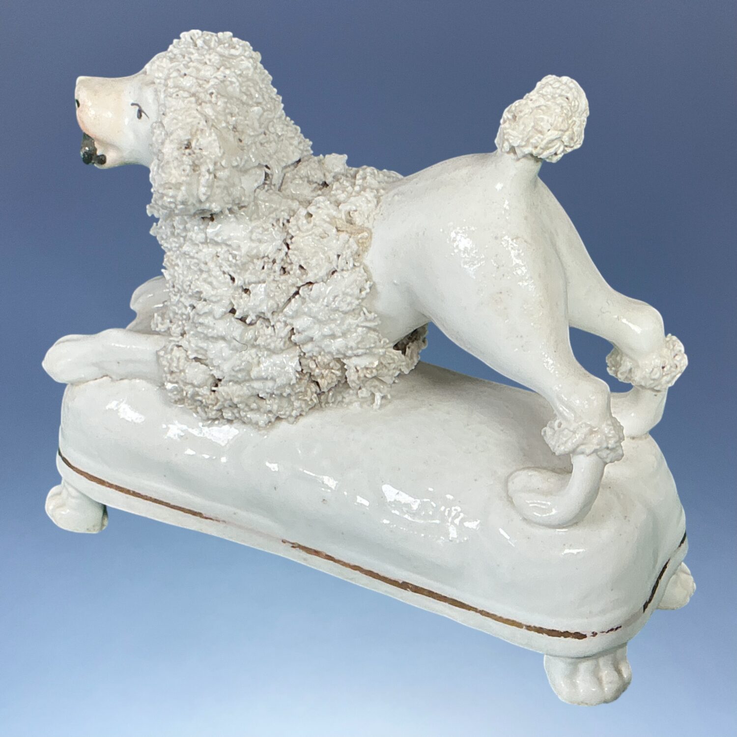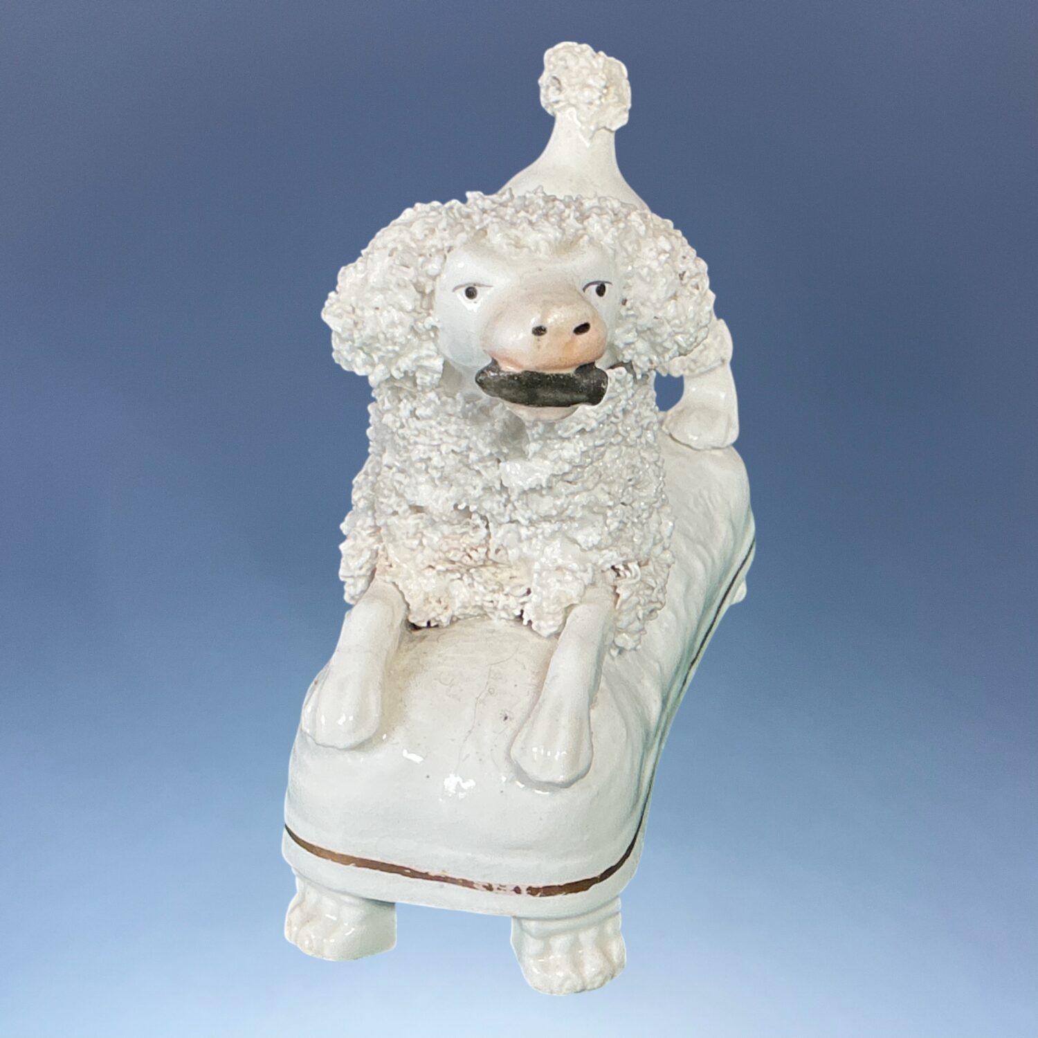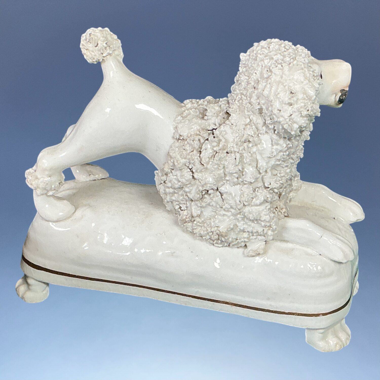A good quality 19th century Staffordshire porcelain model of a crouching Poodle holding a stick in its mouth, on a rectangular mound base with gilt line and four moulded ‘paw’ feet.