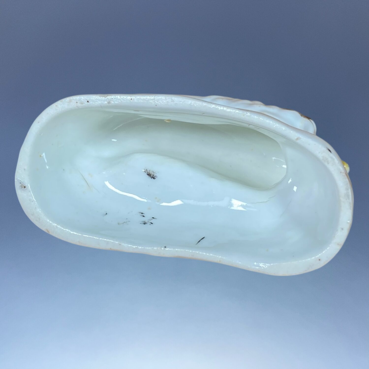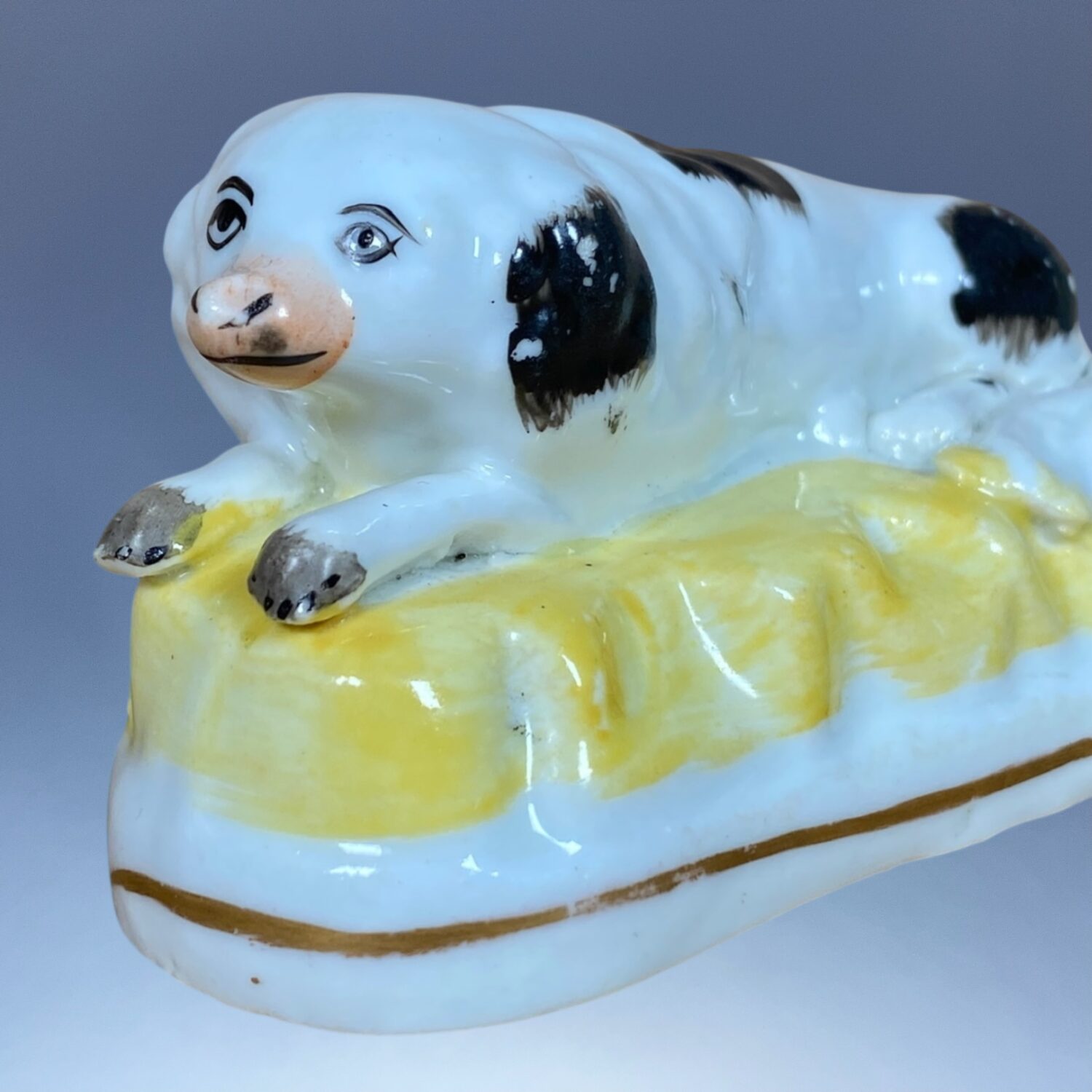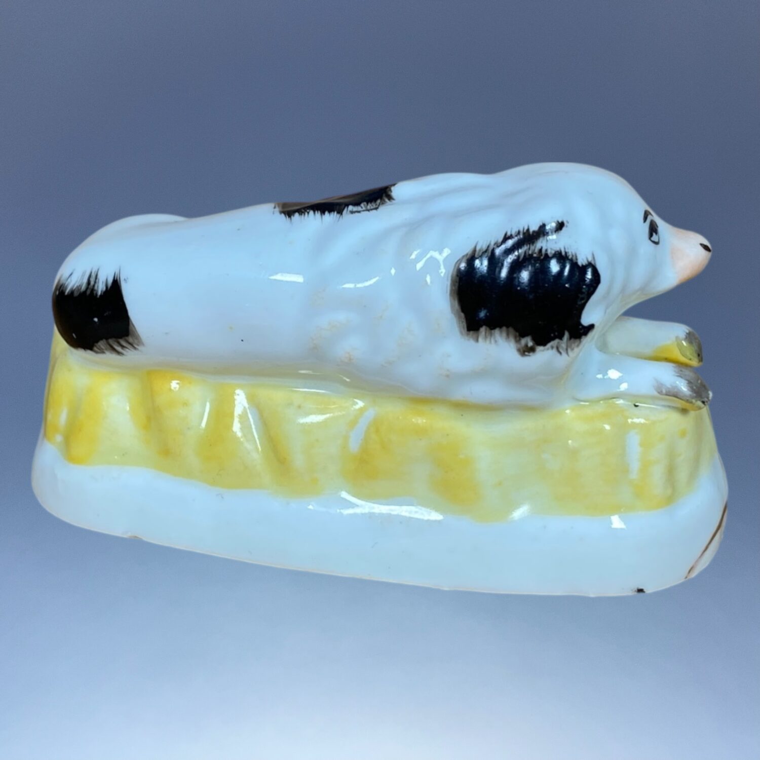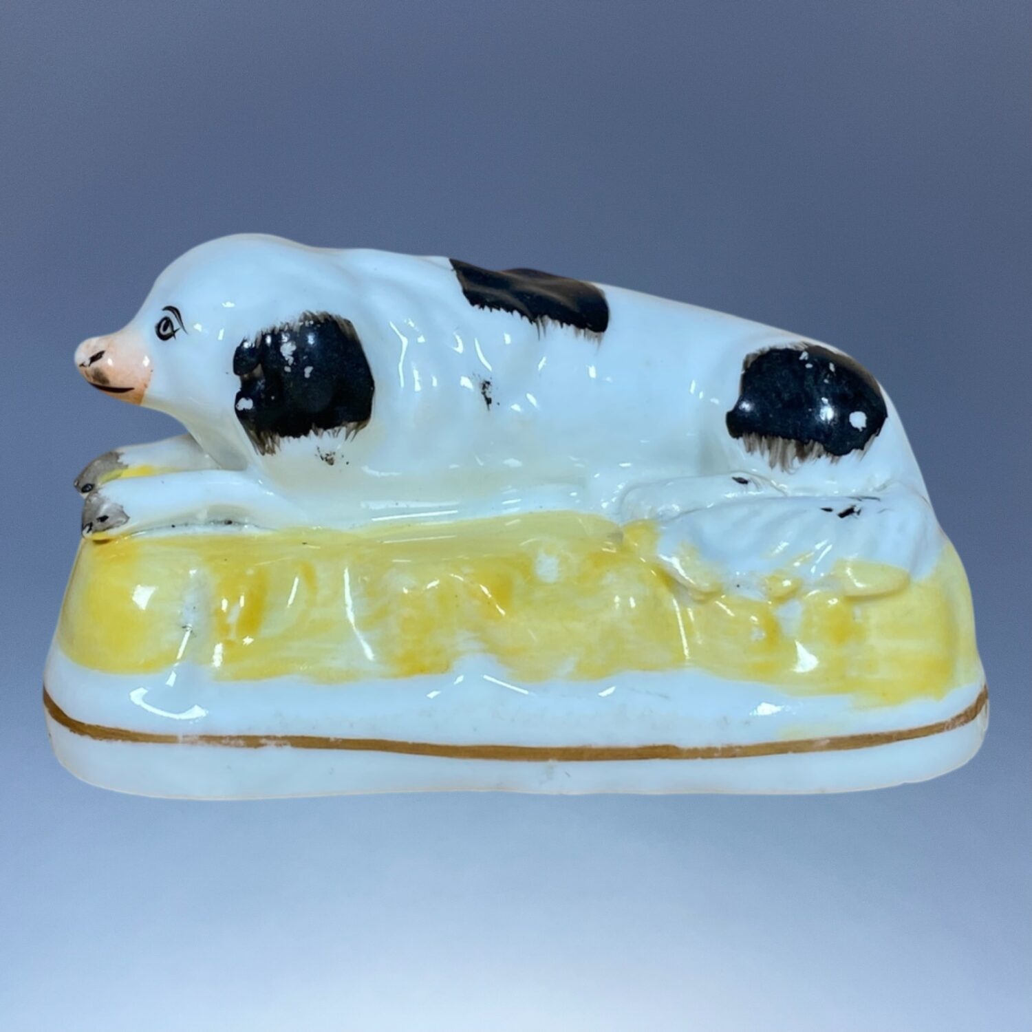 C19th Staffordshire Porcelain black & white Dog (Spaniel?) recumbent on a Yellow Base with gilt line..
