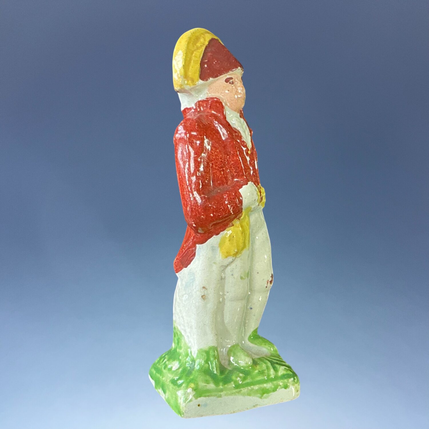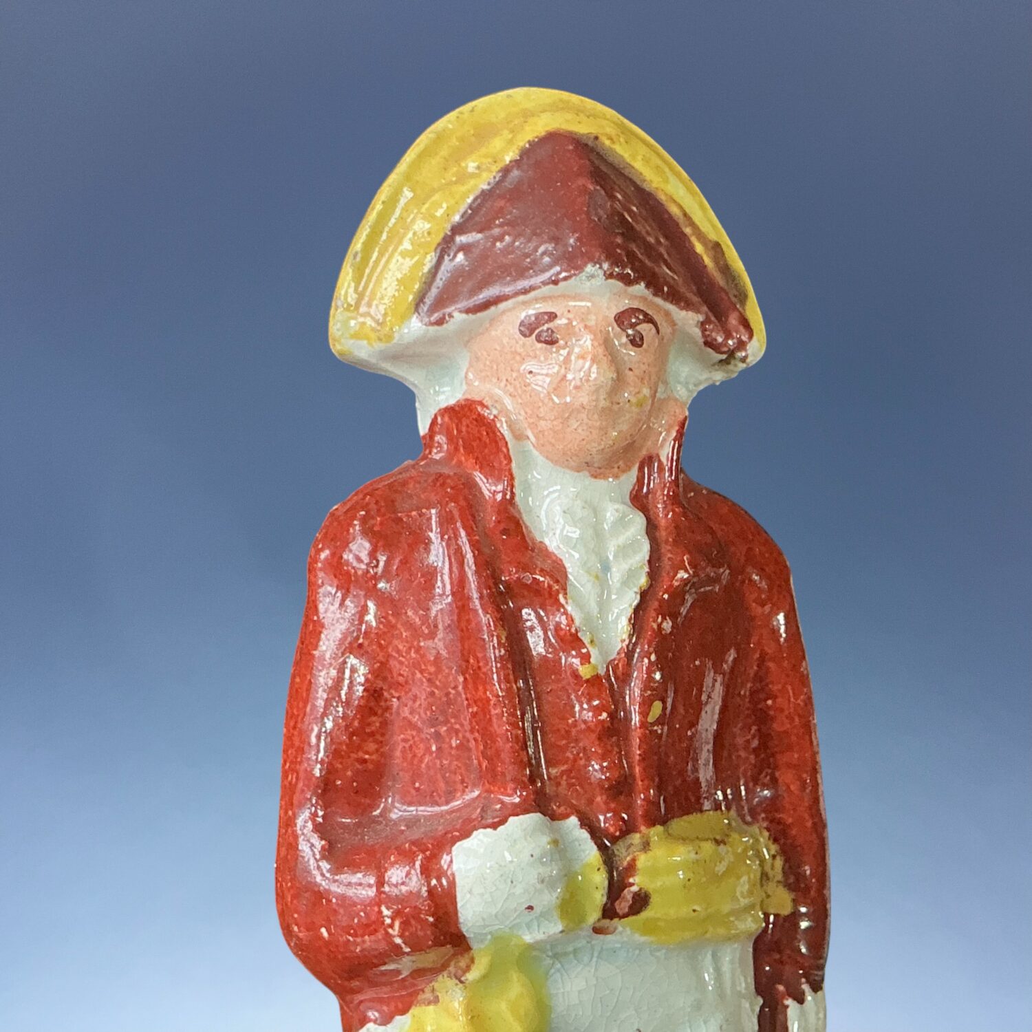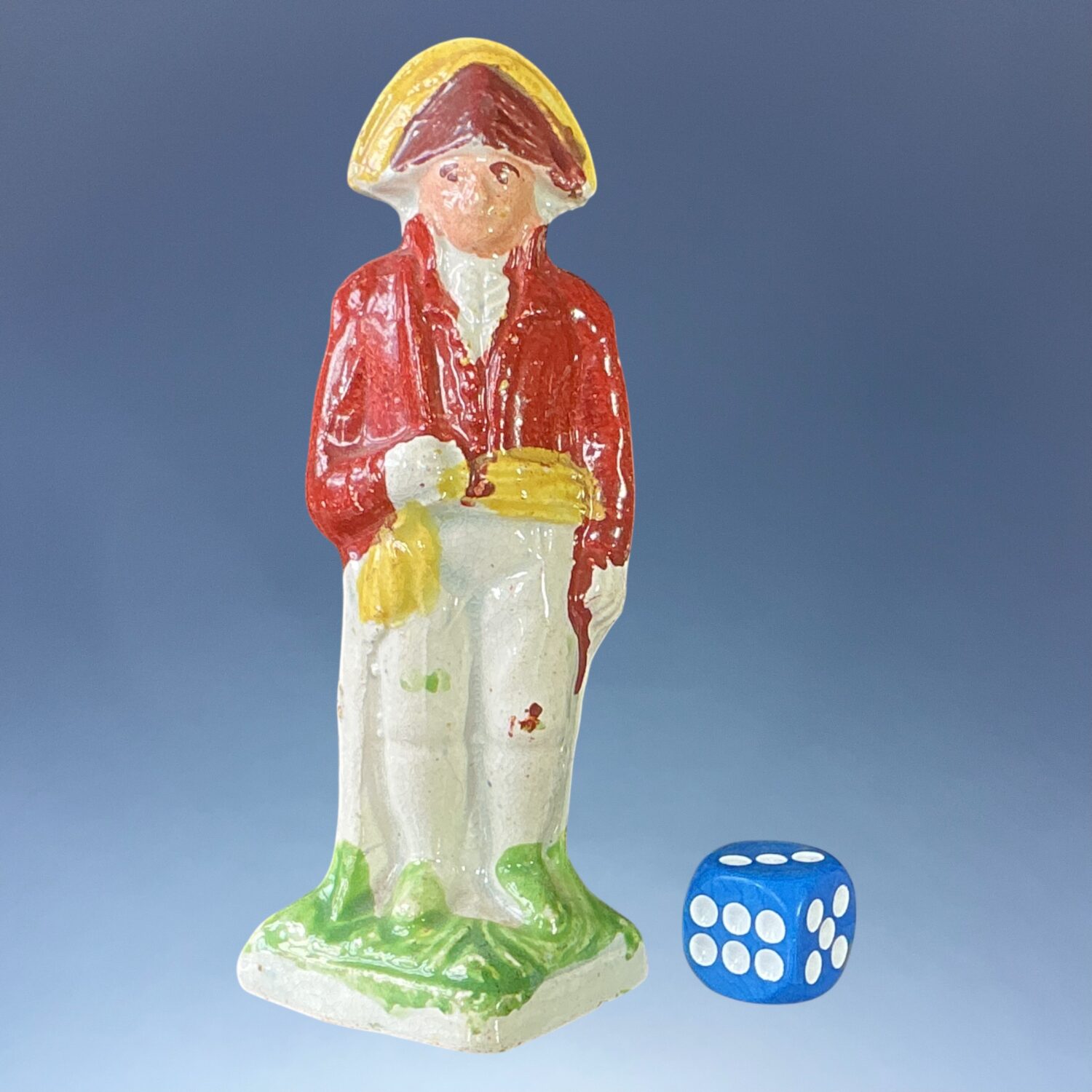 A scarce early 19th century Staffordshire pottery miniature figure of The Duke of Wellington (?) holding a sword.