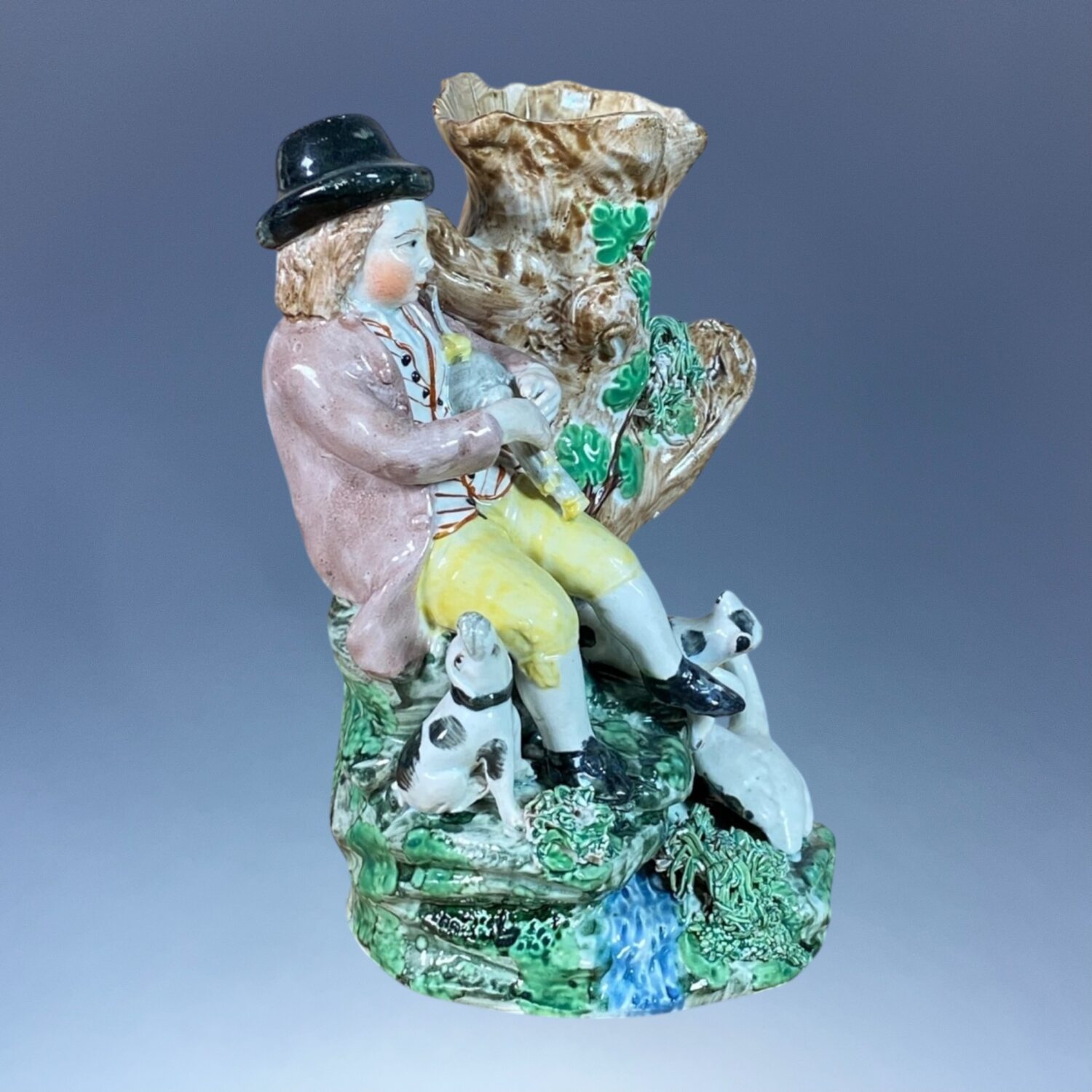 Early 19th century Staffordshire pottery group of a boy bagpiper sitting beside an open tree spill holder, he has two dogs and a swan on the base at his feet.