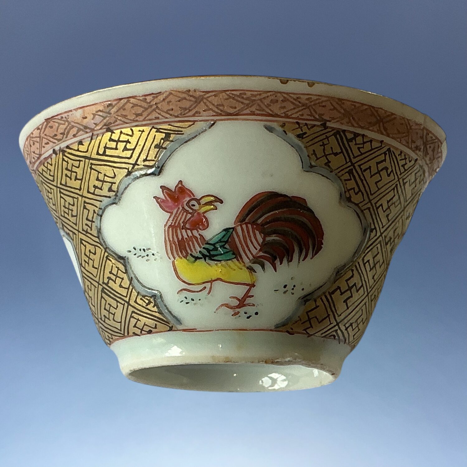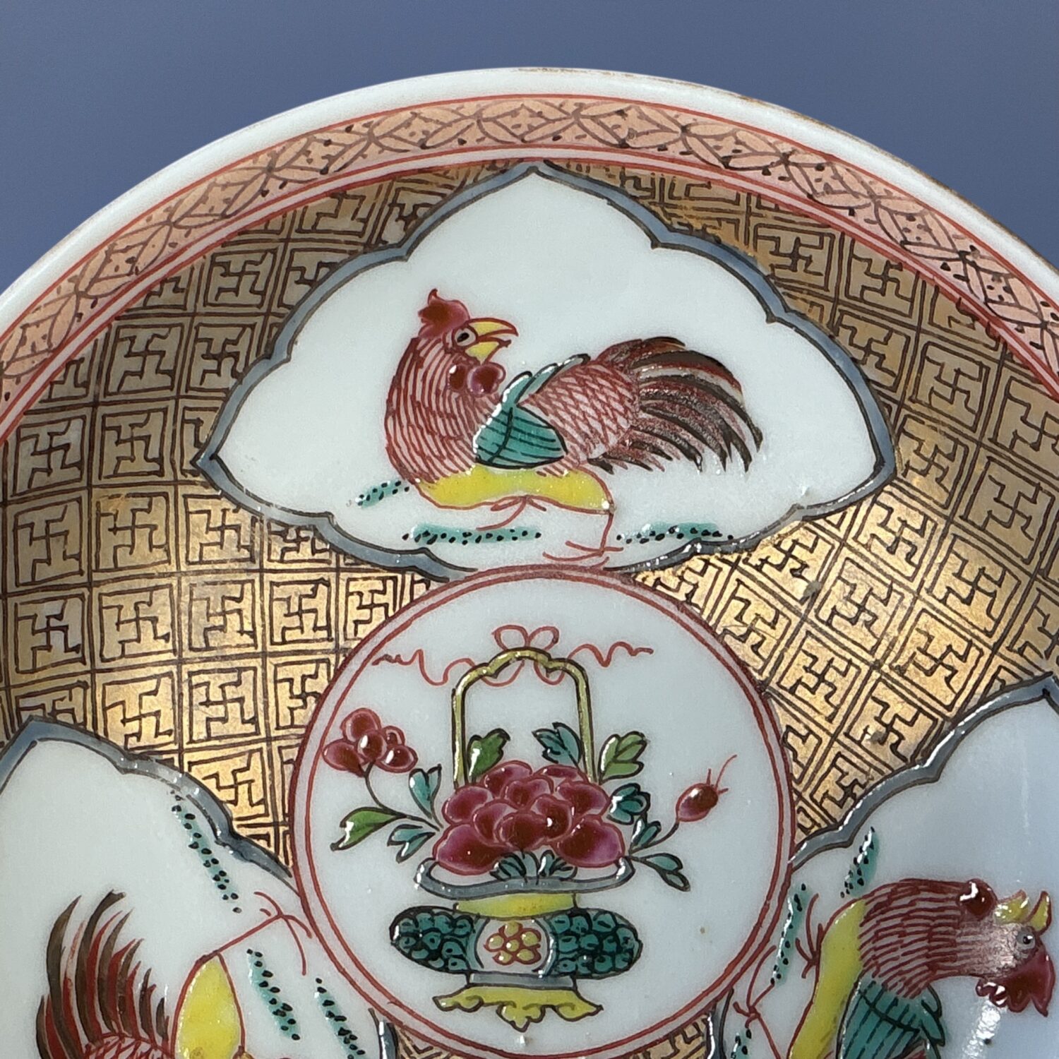 18th century Chinese export porcelain saucer (+ teabowl), decorated with reserves of cockerels and a basket of flowers, painted in famille rose enamels against a gilt patterned ground. The teabowl is af but included for decorative appeal.