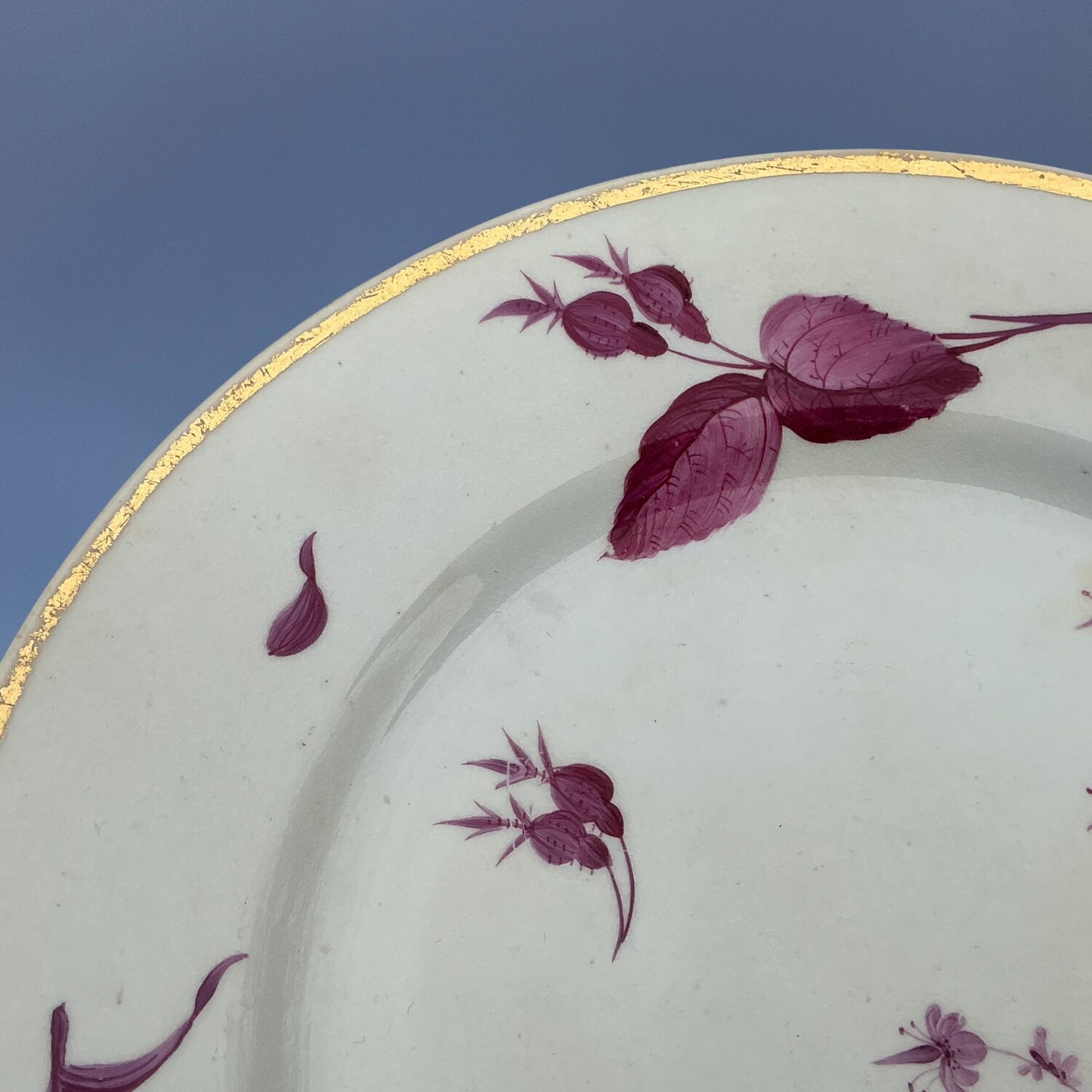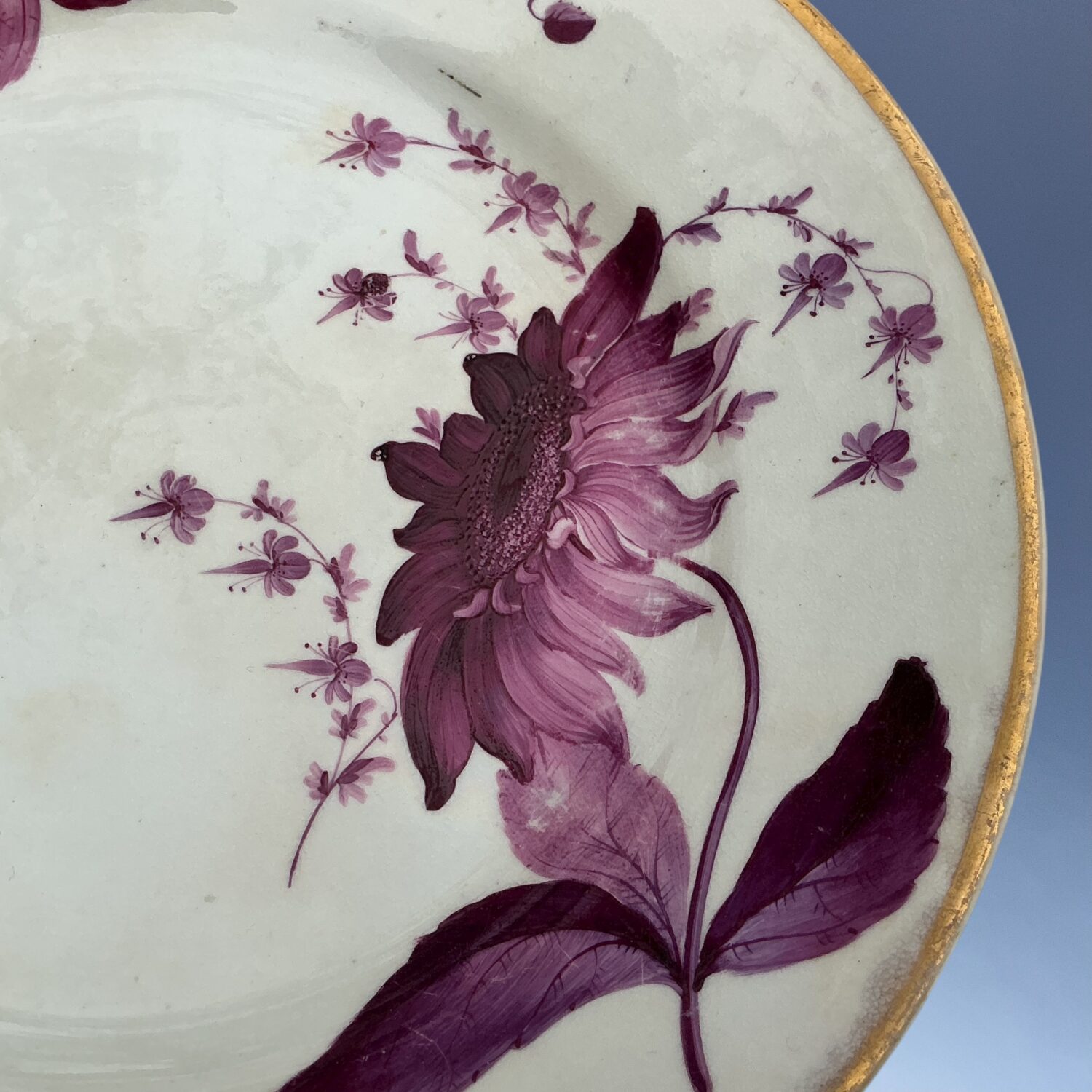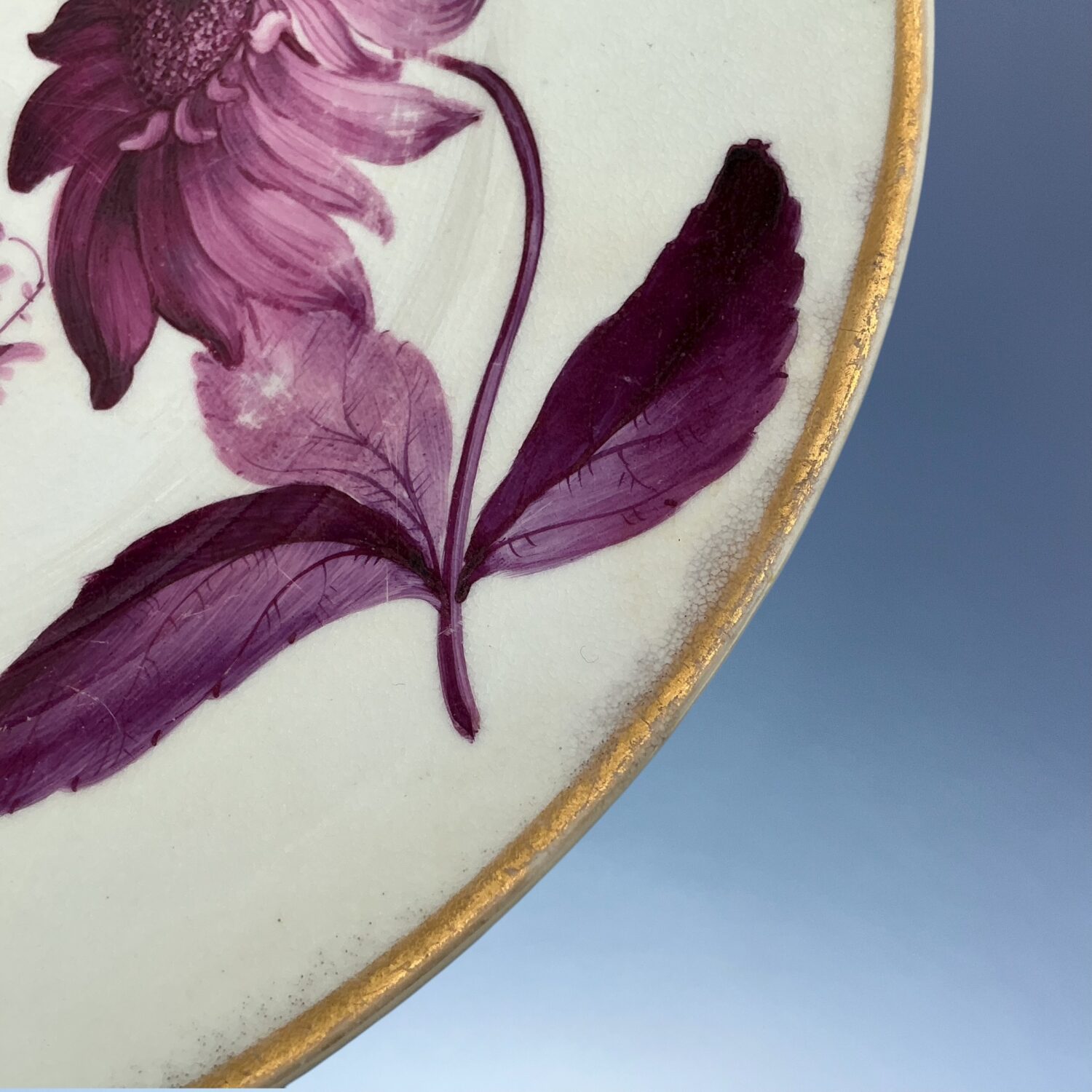 Early 19th century Derby porcelain dessert plate, hand painted with flowers in puce monochrome, within a gilt line rim.