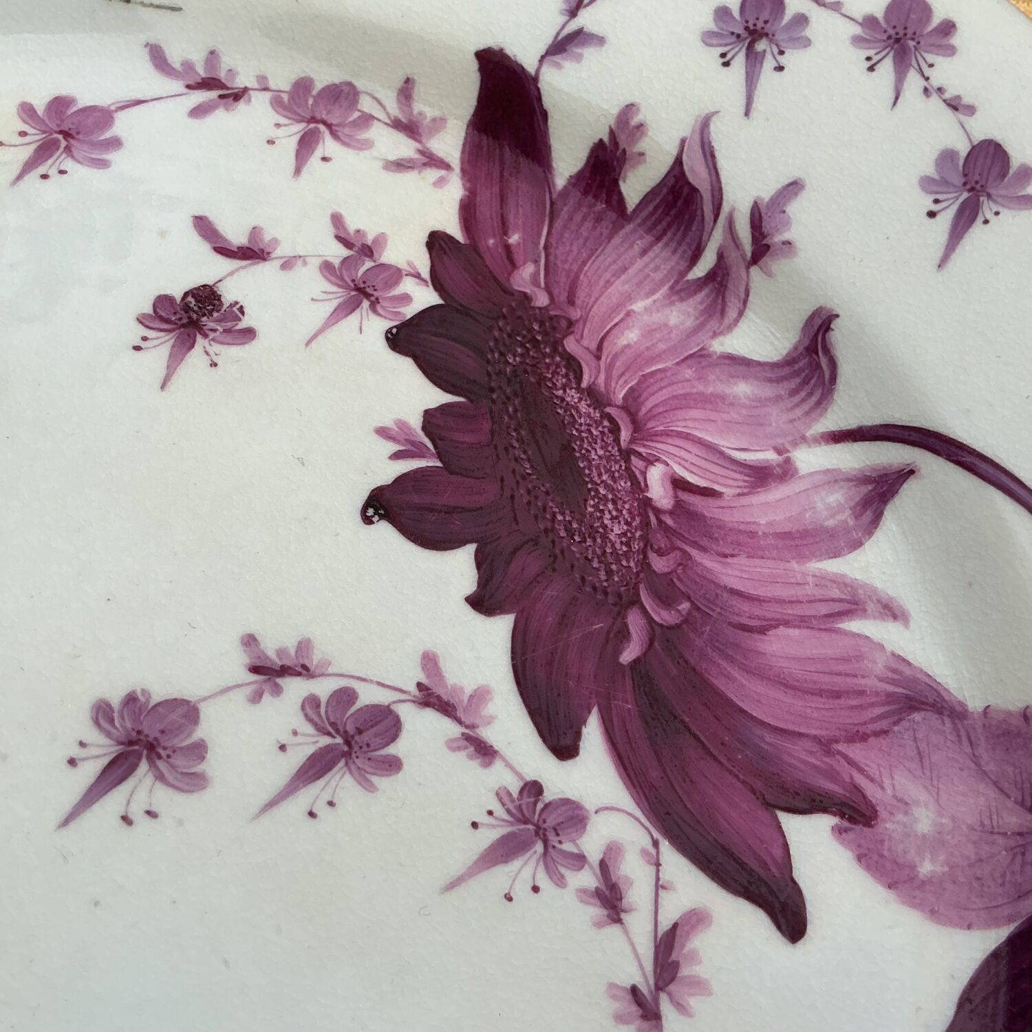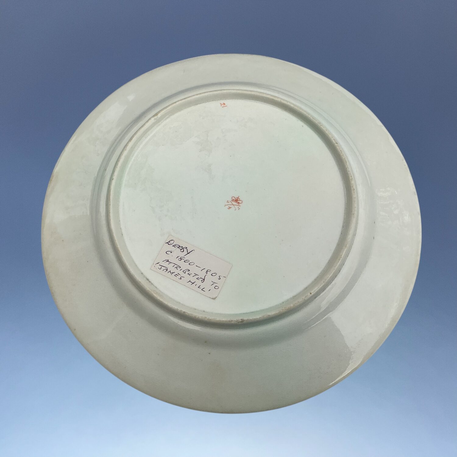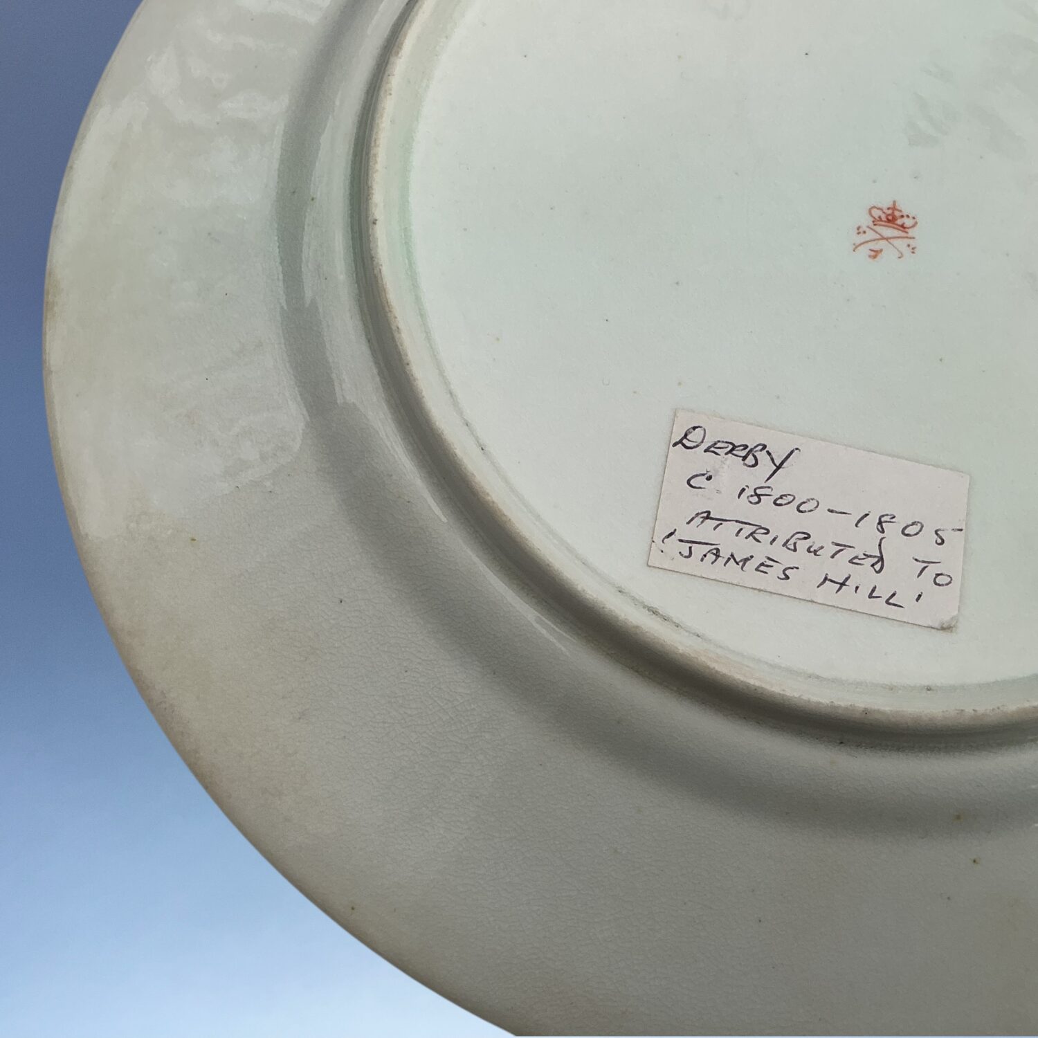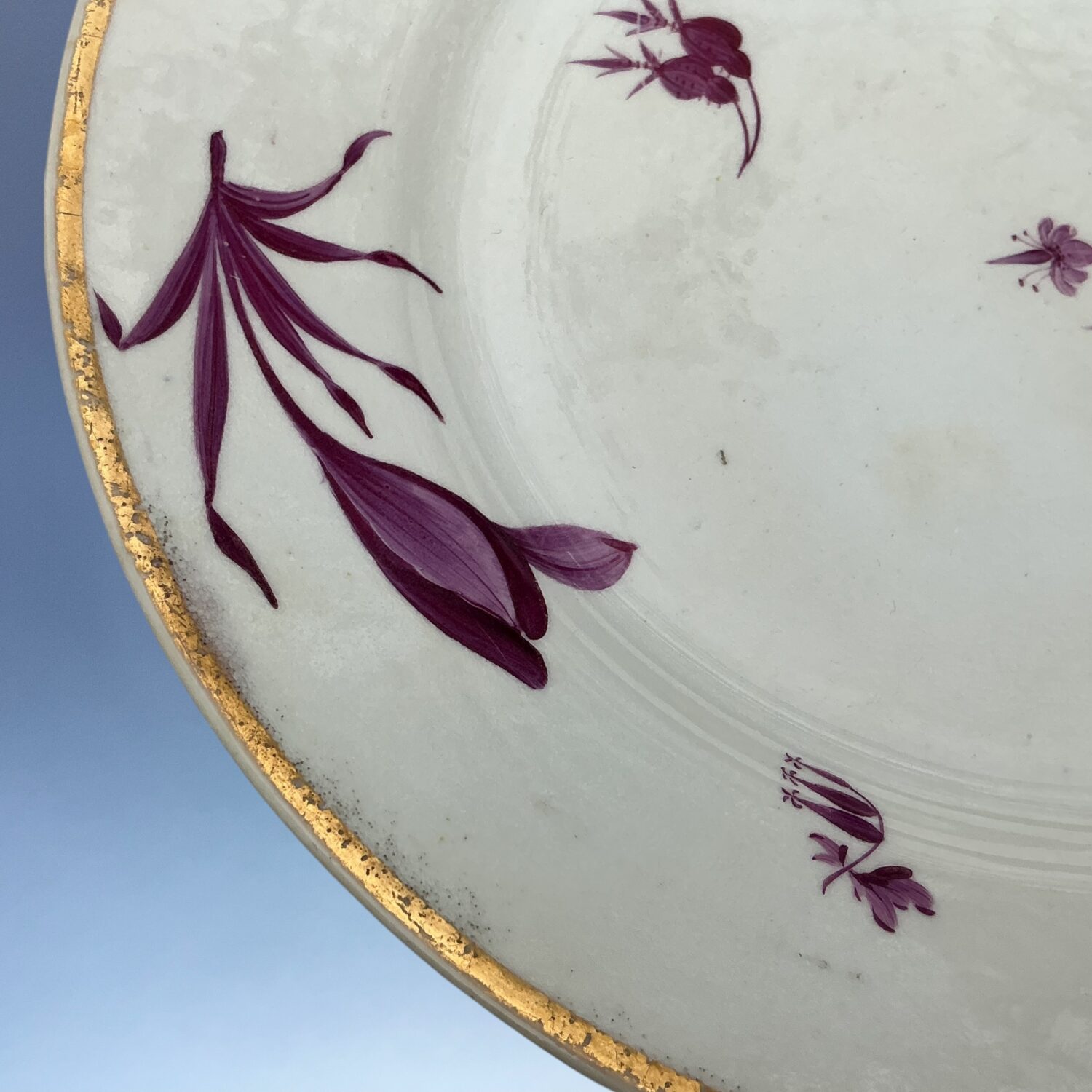 Early 19th century Derby porcelain dessert plate, hand painted with flowers in puce monochrome, within a gilt line rim.
