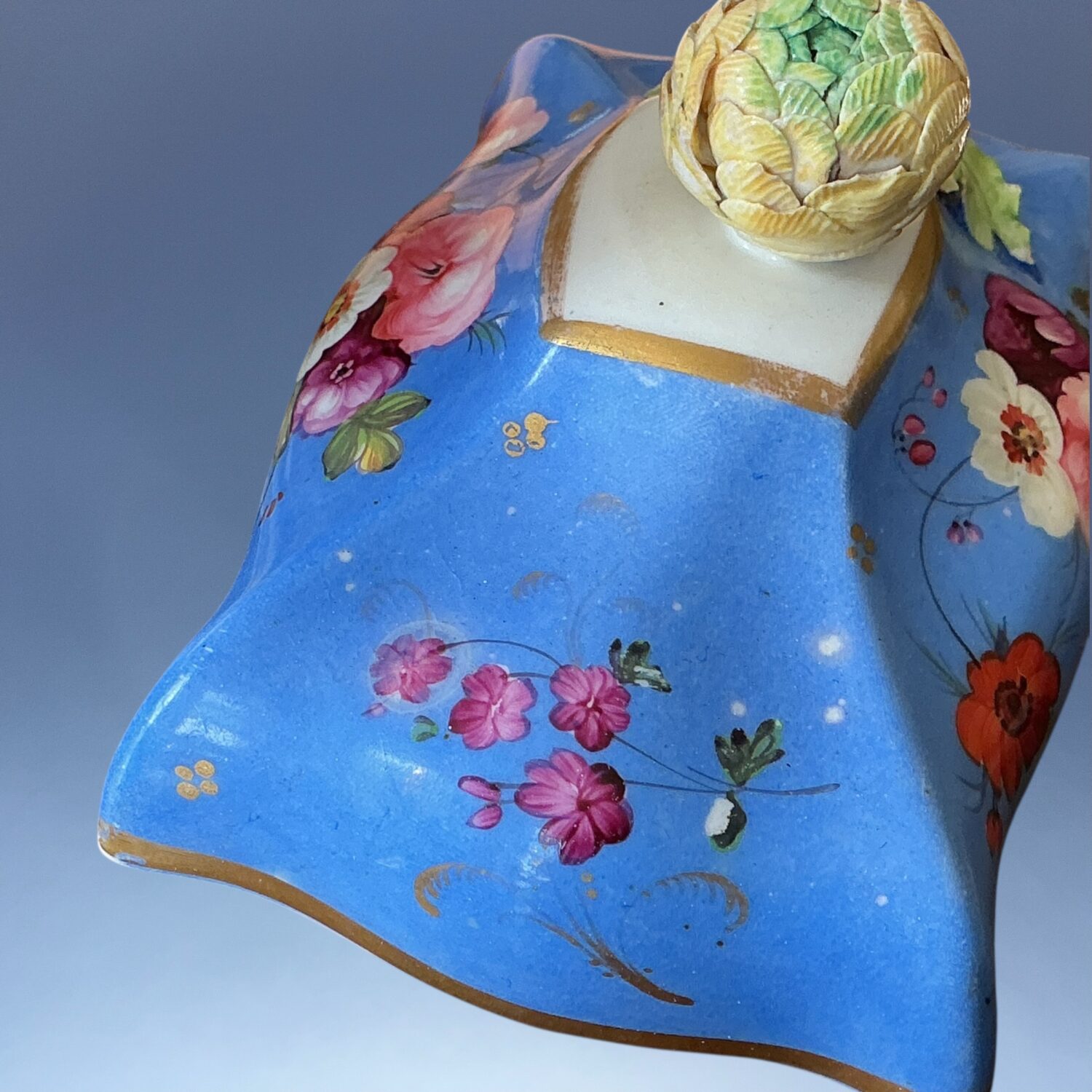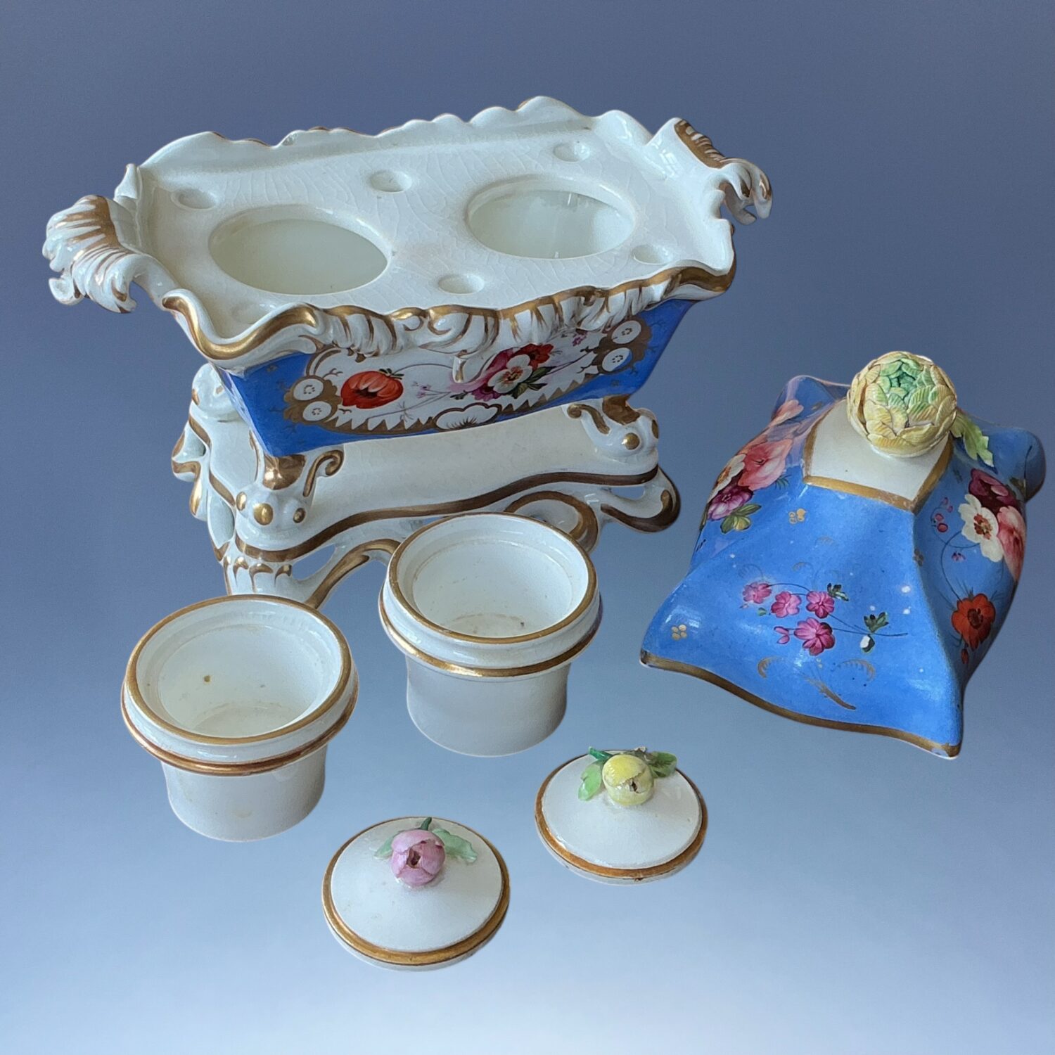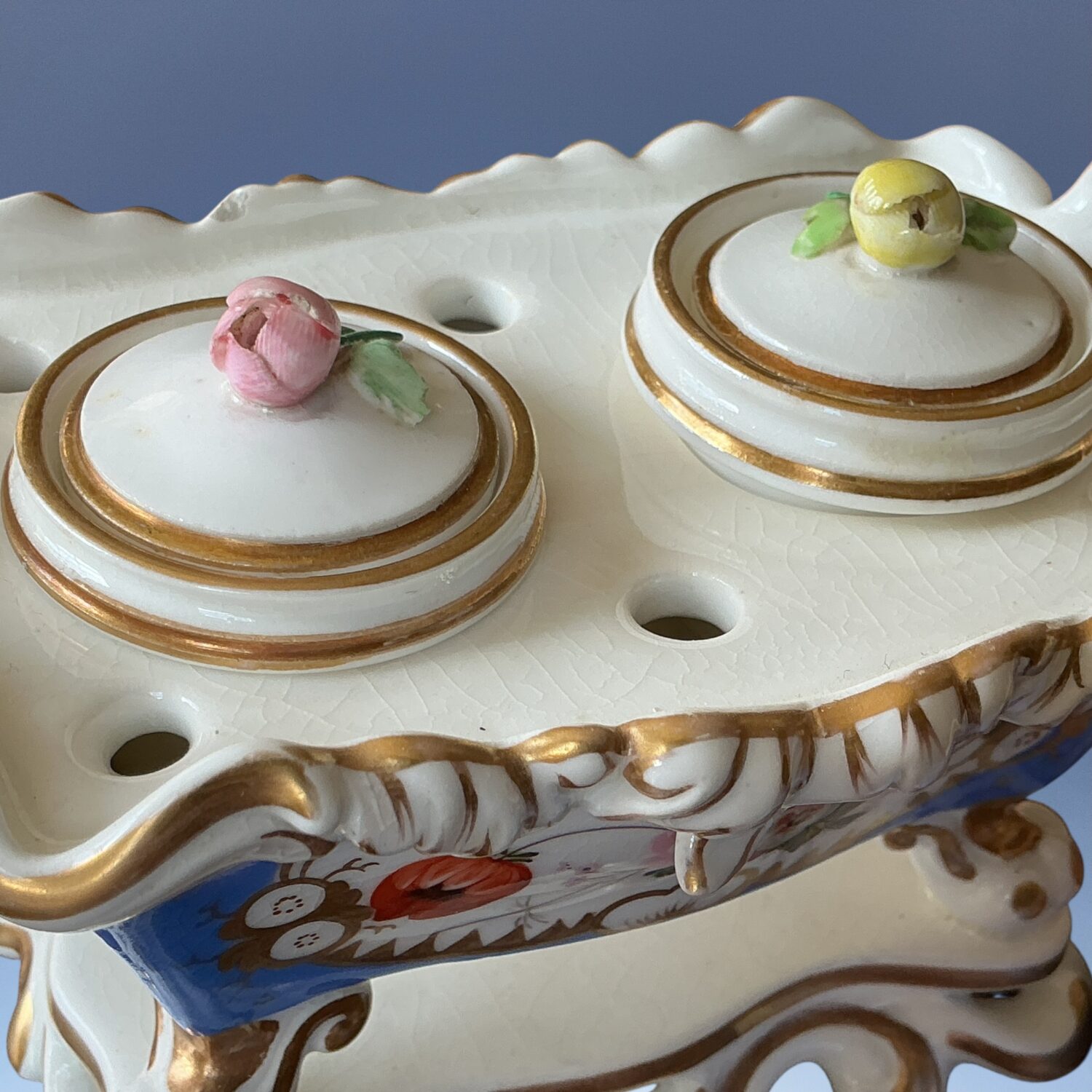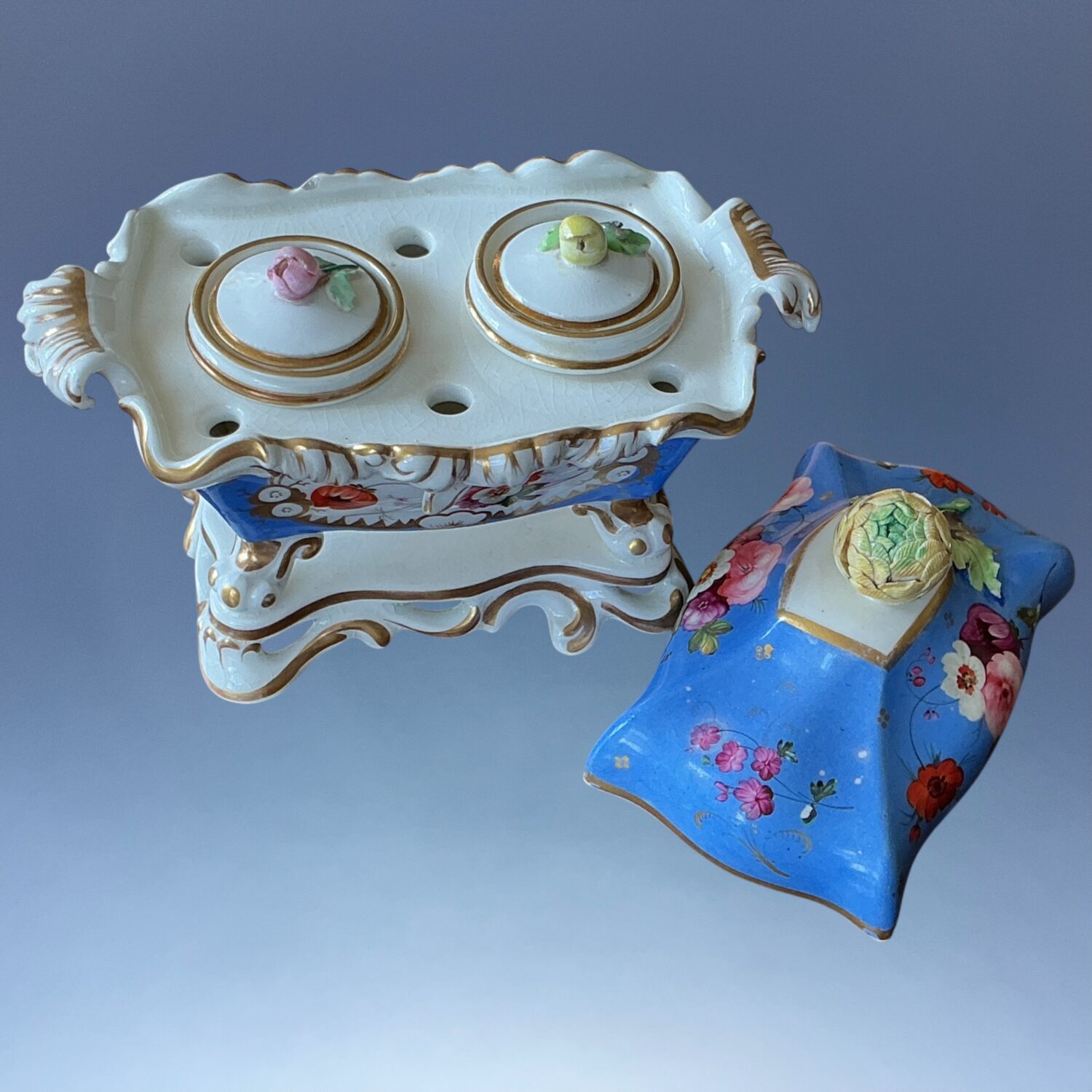 A very decorative early 19th century English porcelain inkstand & cover, with rococo style moulding and pierced plinth, the interior with two covered inkwells. Hand painted with flowers against a pale powder blue ground with gilding.