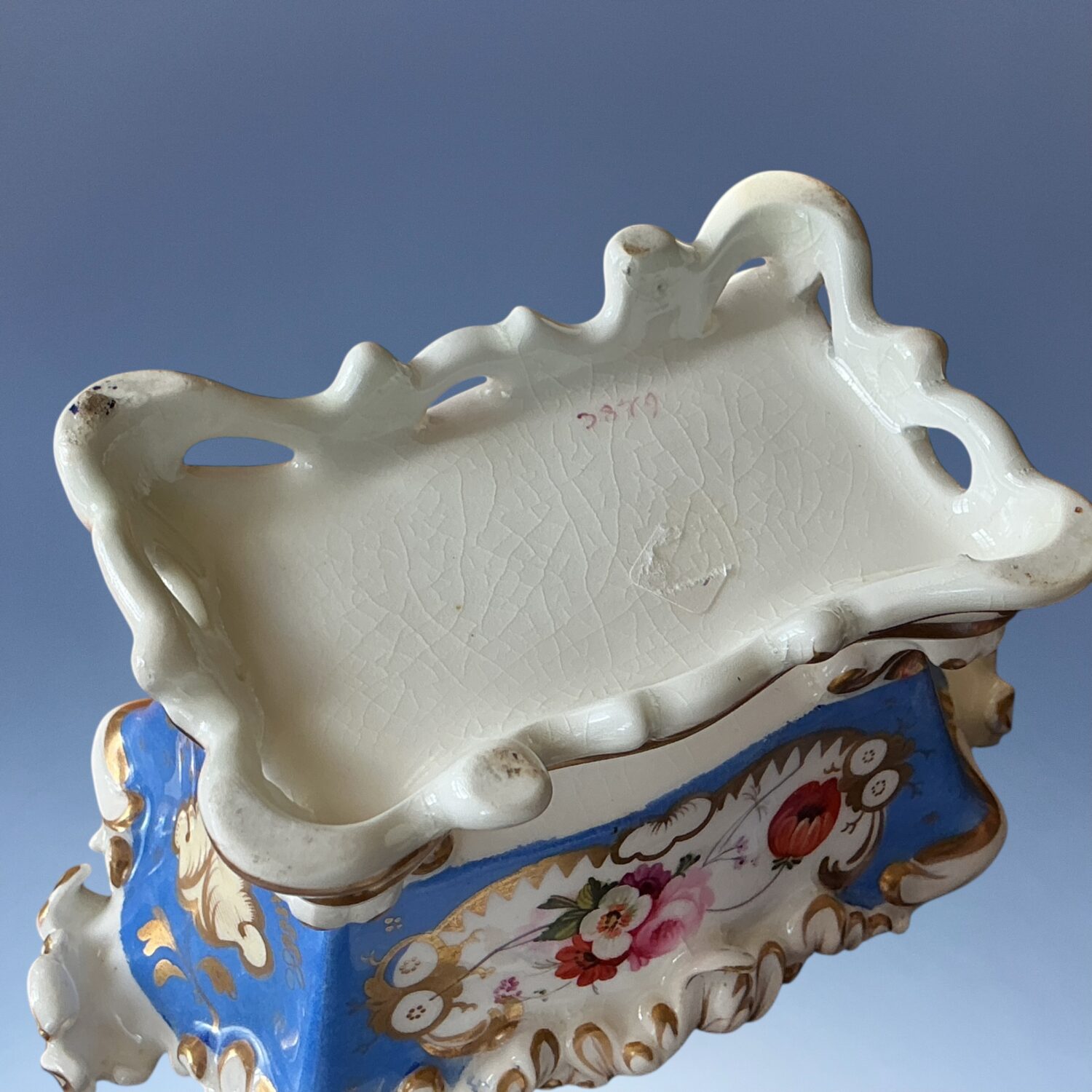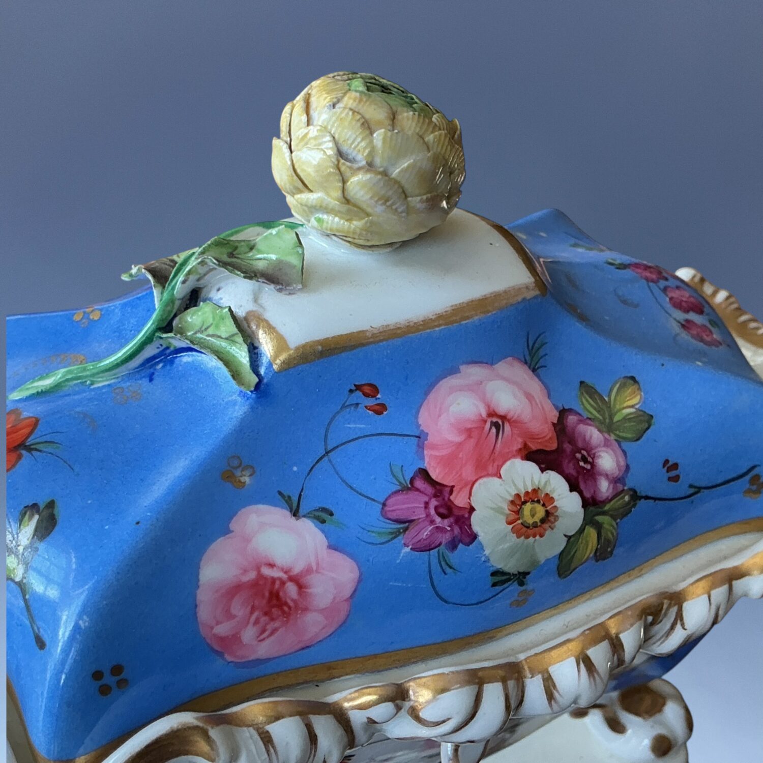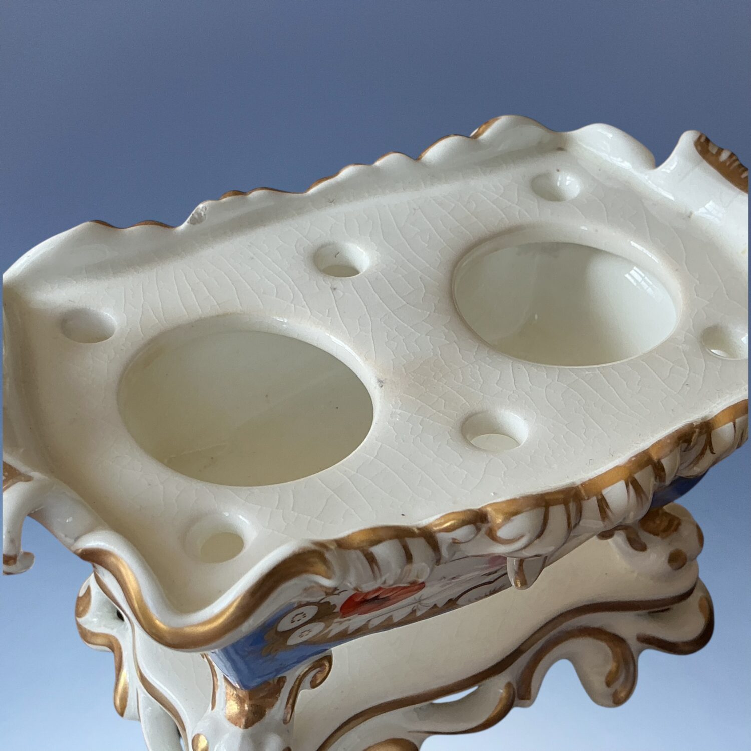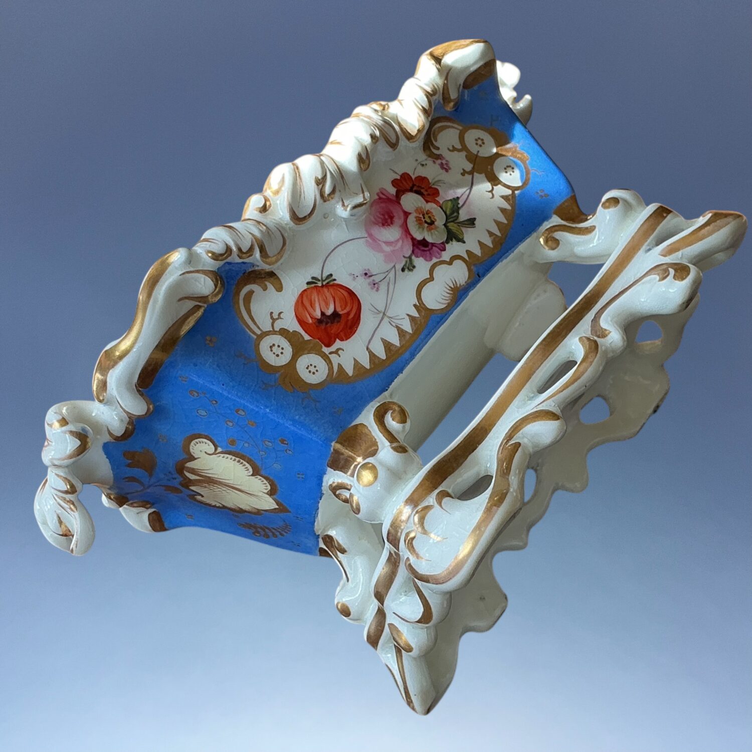 A very decorative early 19th century English porcelain inkstand & cover, with rococo style moulding and pierced plinth, the interior with two covered inkwells. Hand painted with flowers against a pale powder blue ground with gilding.