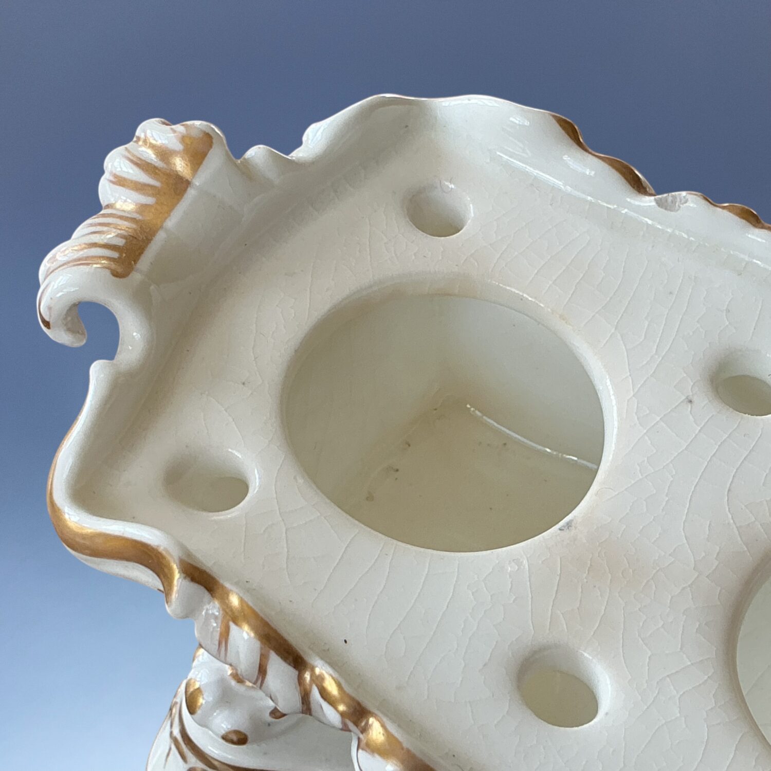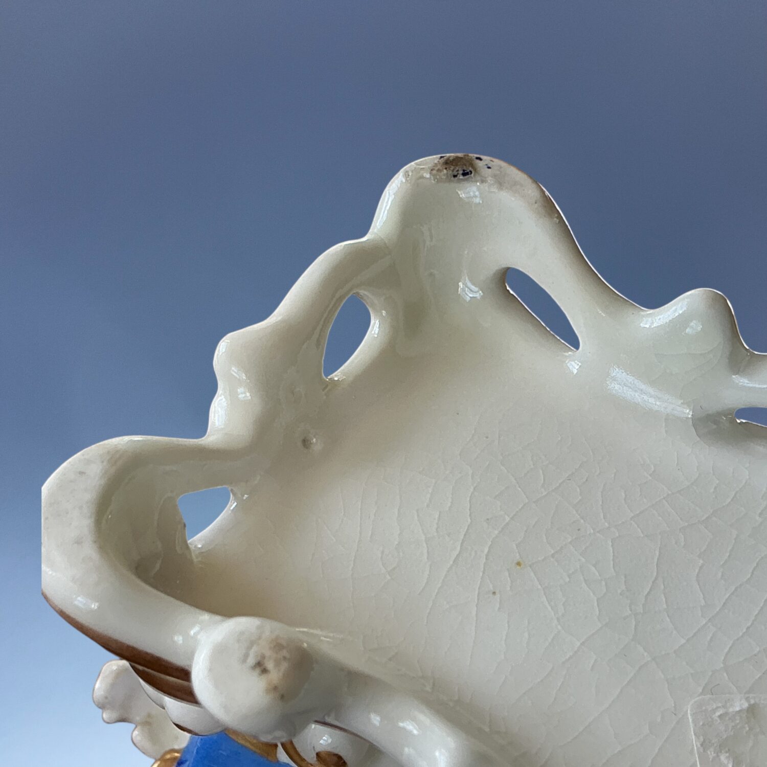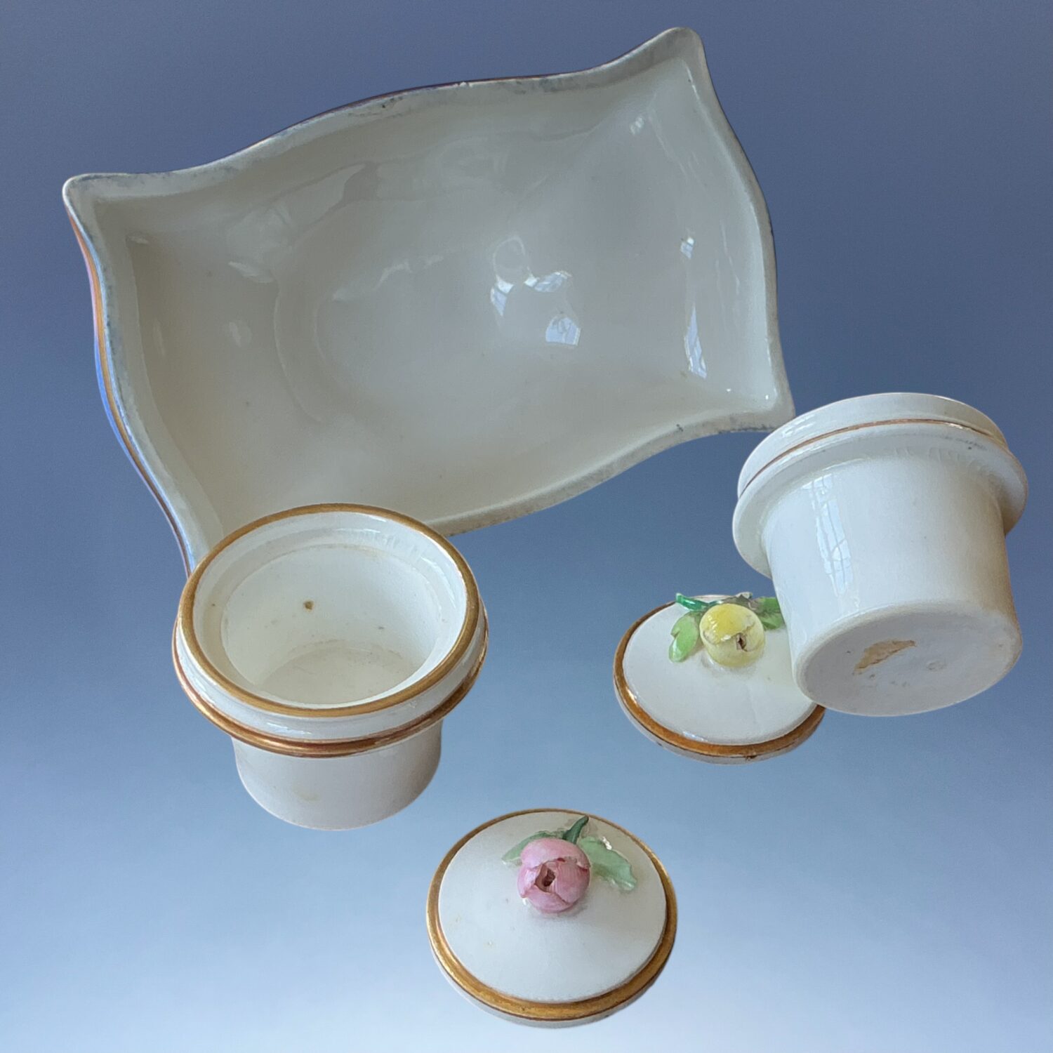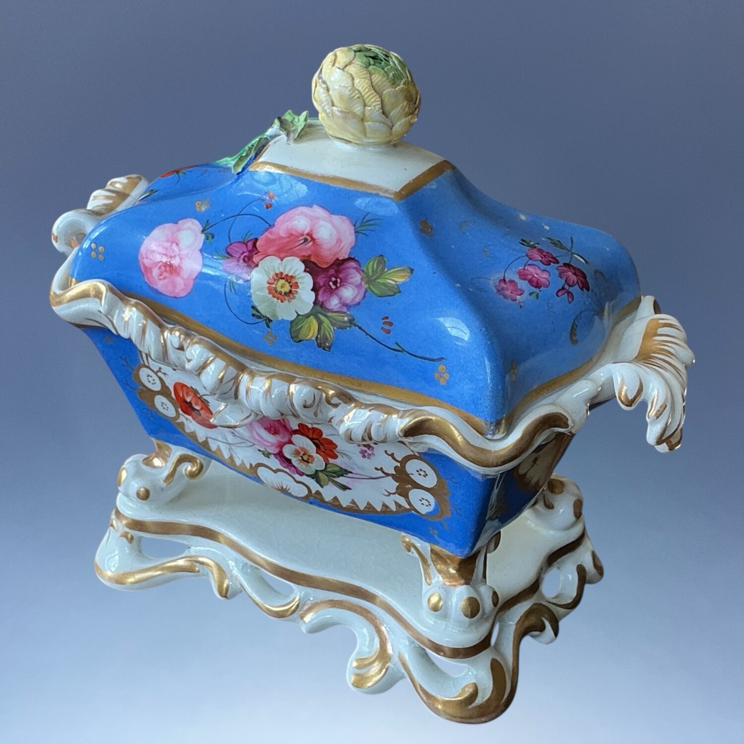 A very decorative early 19th century English porcelain inkstand & cover, with rococo style moulding and pierced plinth, the interior with two covered inkwells. Hand painted with flowers against a pale powder blue ground with gilding.