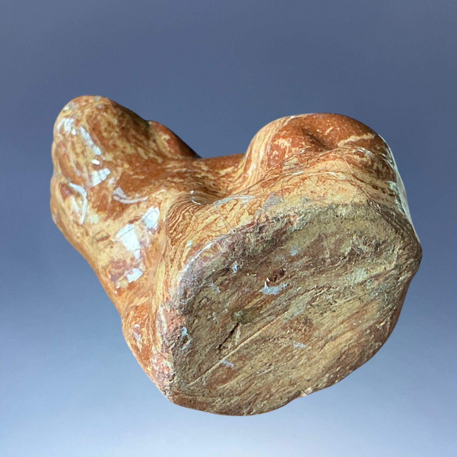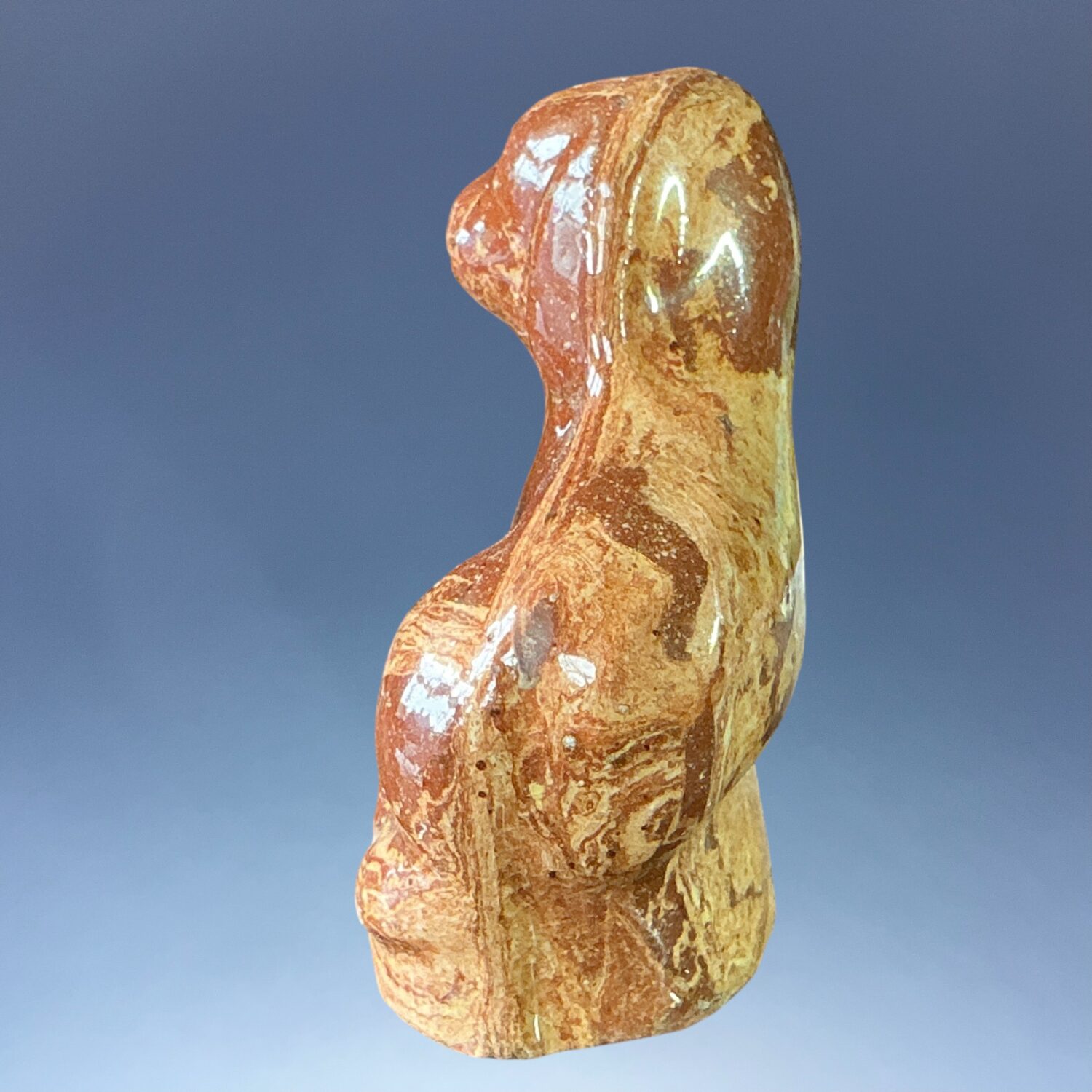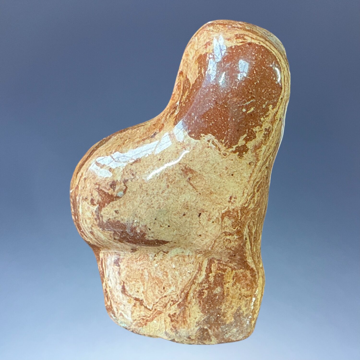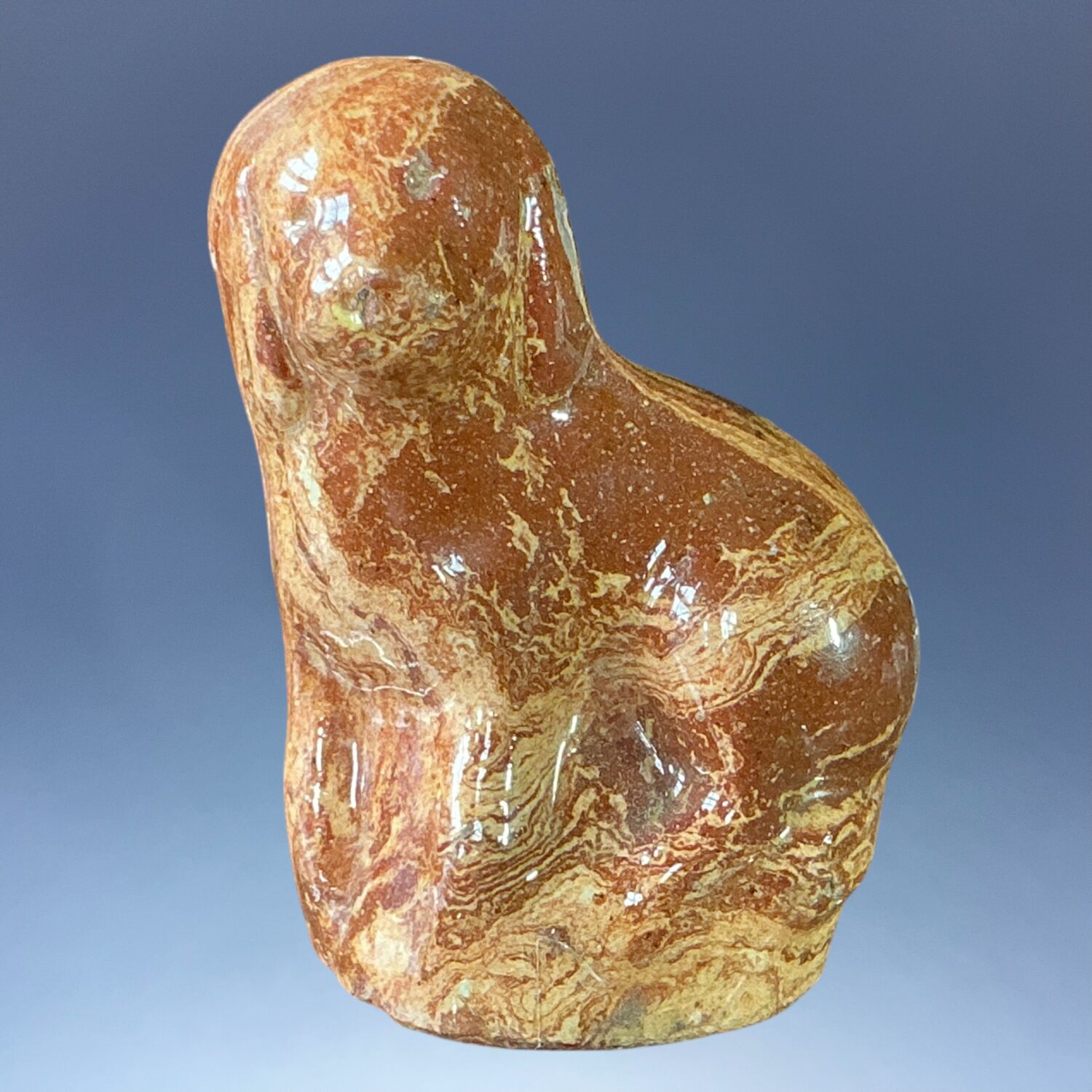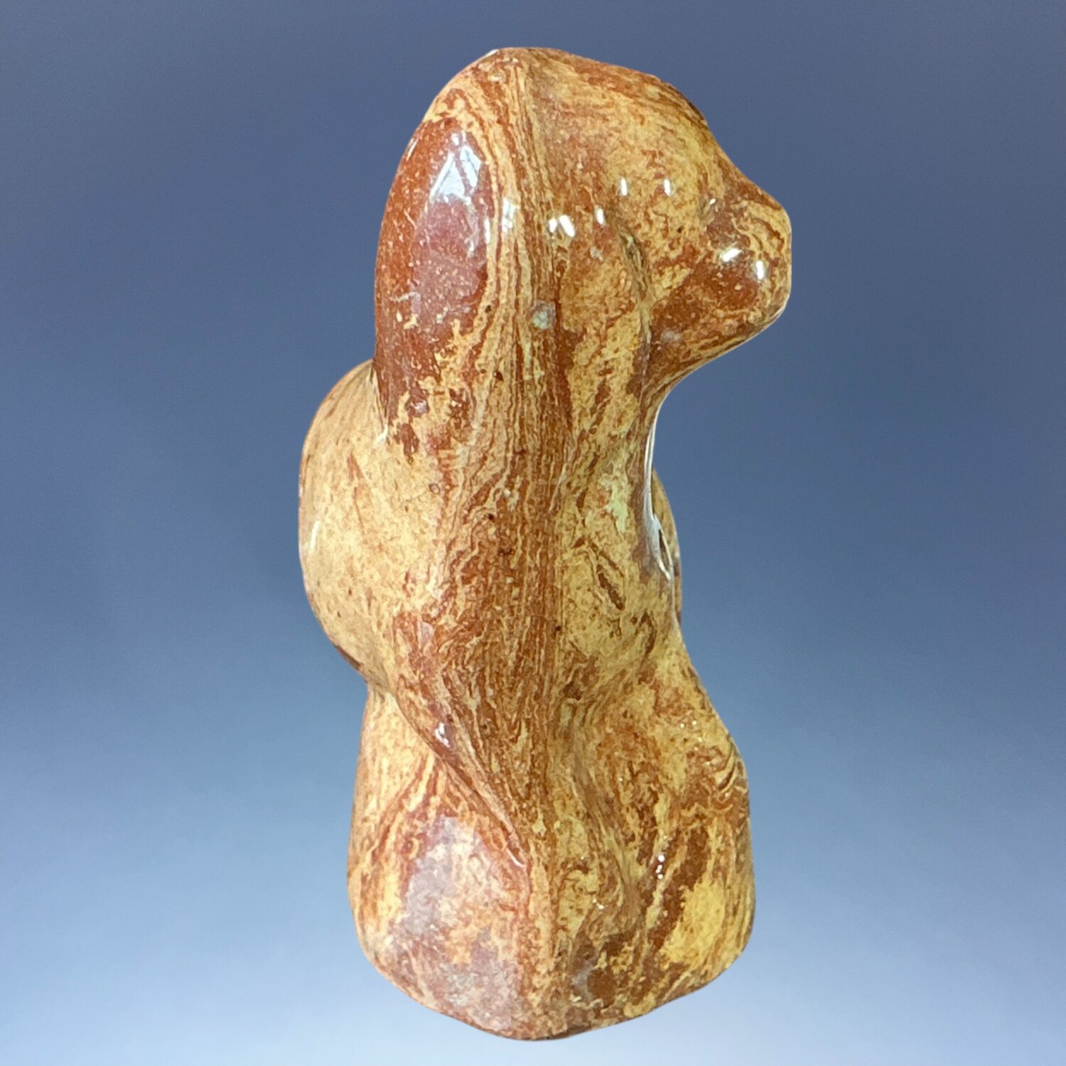 C19th solid Agate ware pottery model of a seated dog, press moulded and lead glazed.