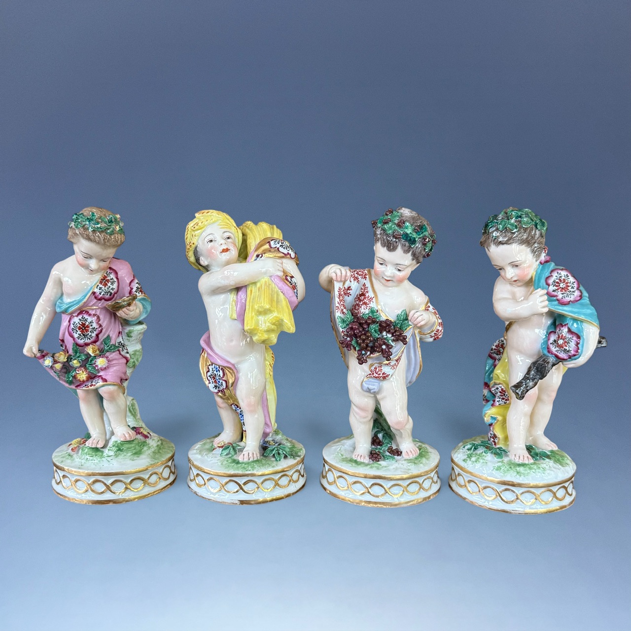 A decorative set of Continental porcelain figures representing the Four Seasons, Spring, Summer, Autumn & Winter. Standing on circular bases with gilt decoration.