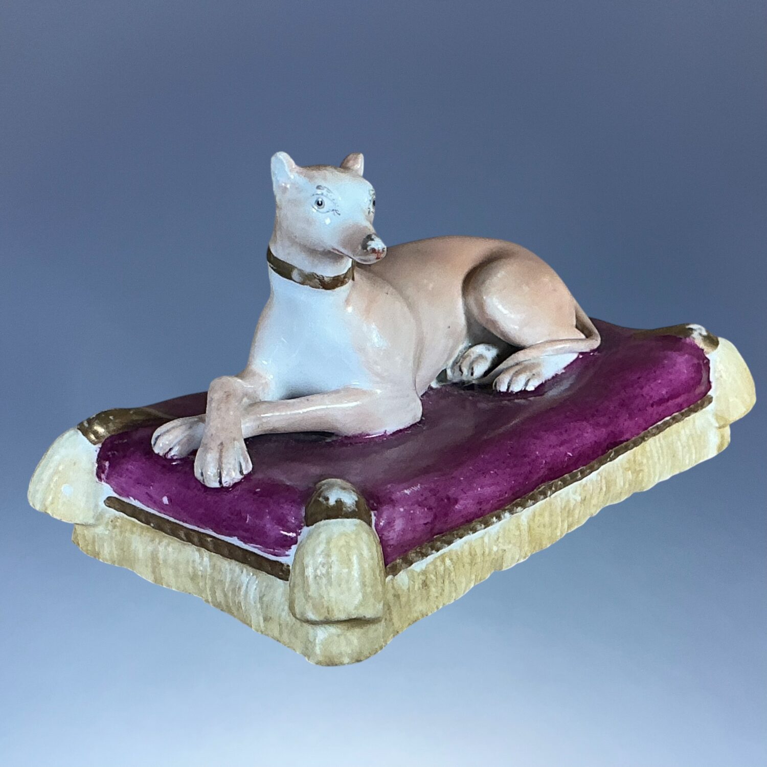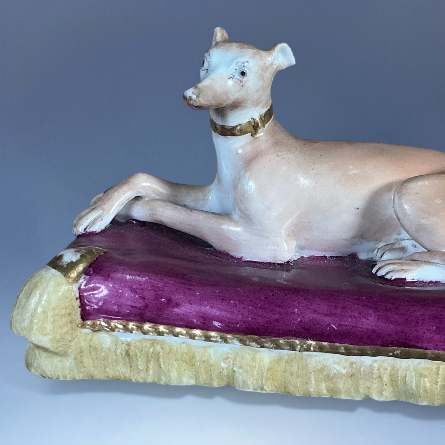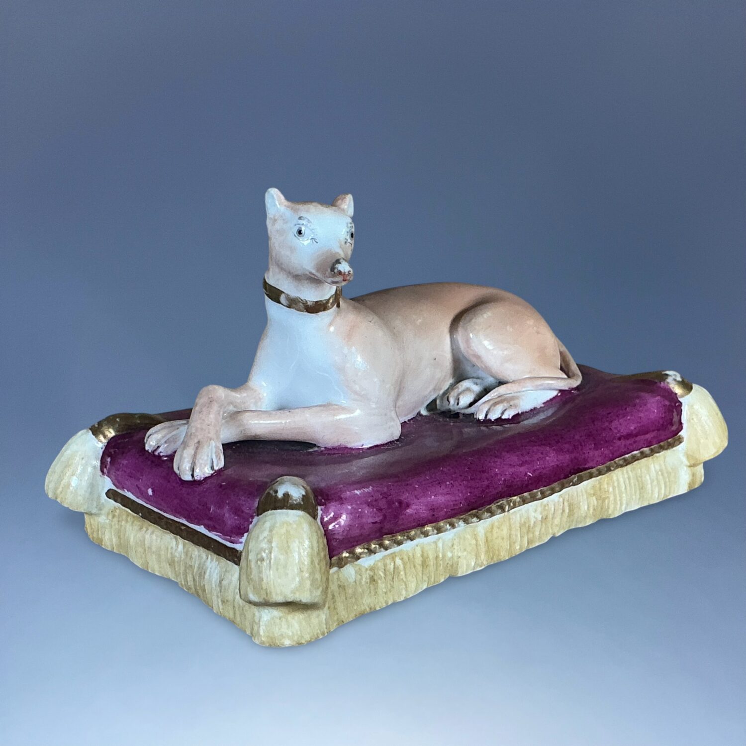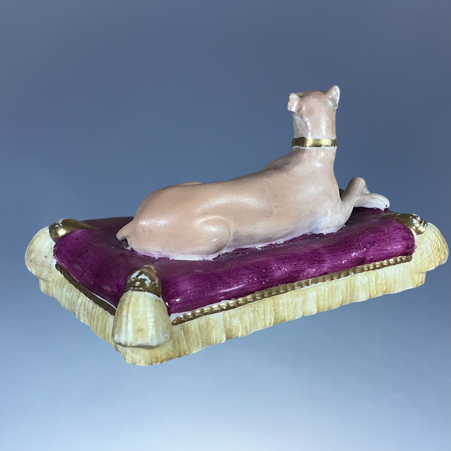 19th century Minton porcelain model of a recumbent Greyhound  or Whippet, on a rectangular, magenta coloured cushion base with yellow tassels and gilding.