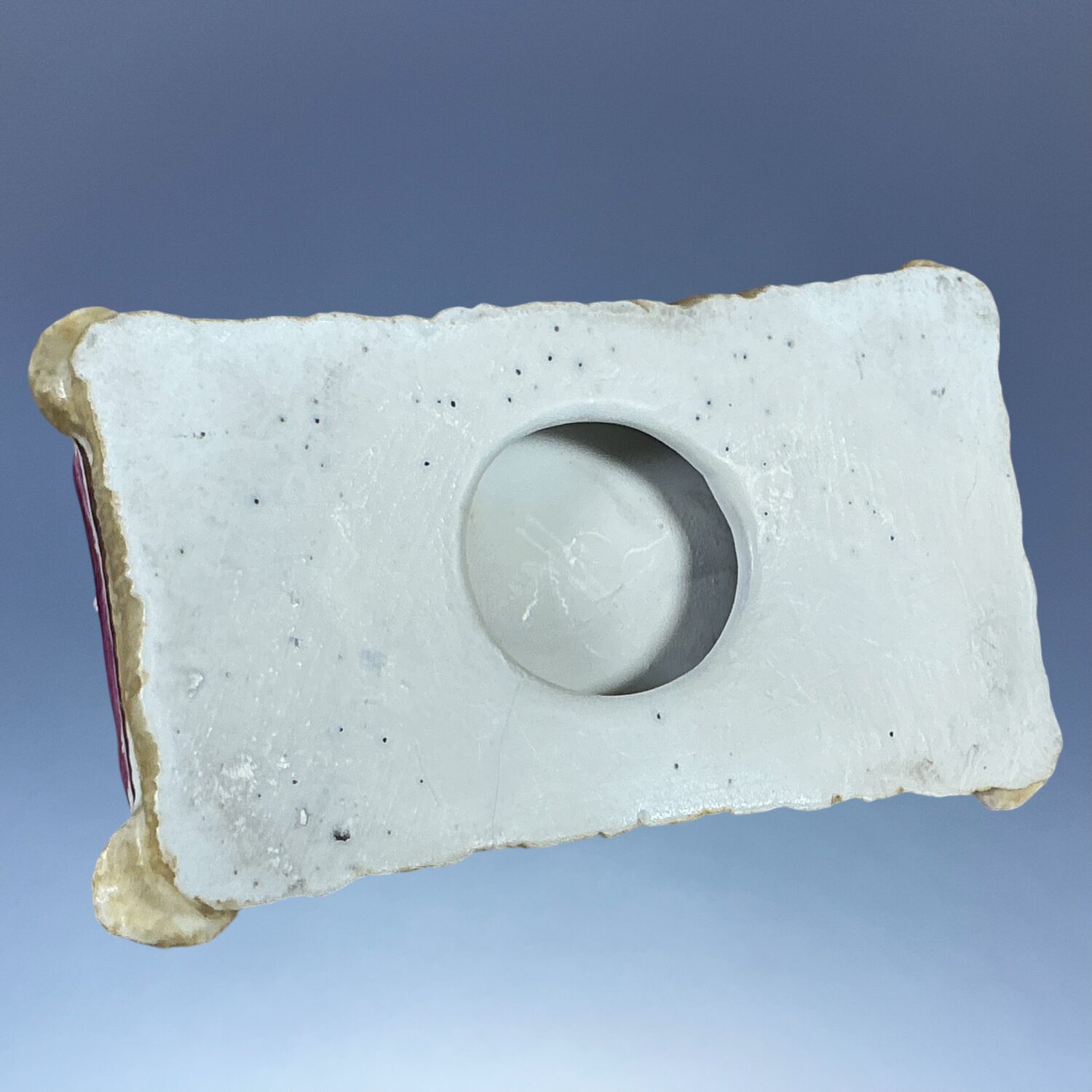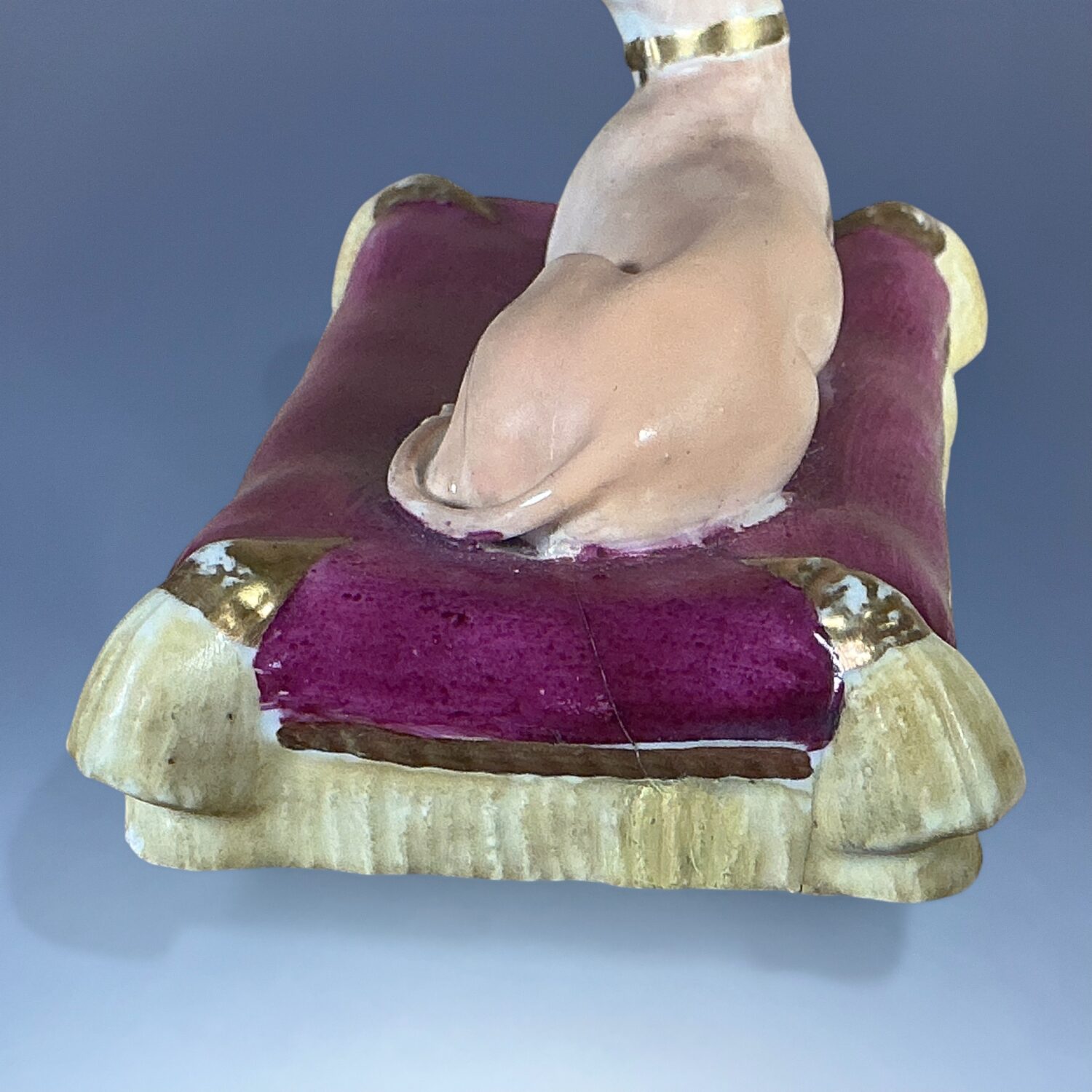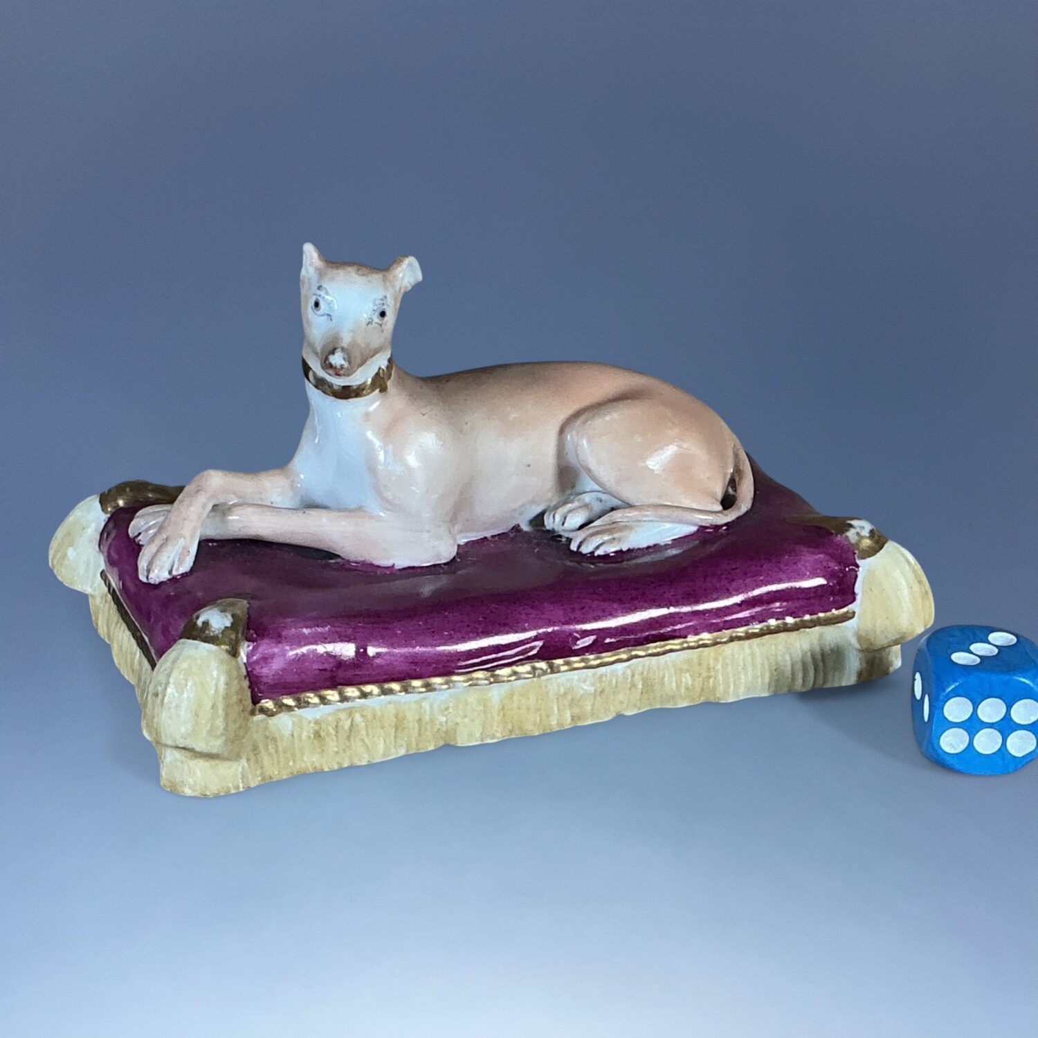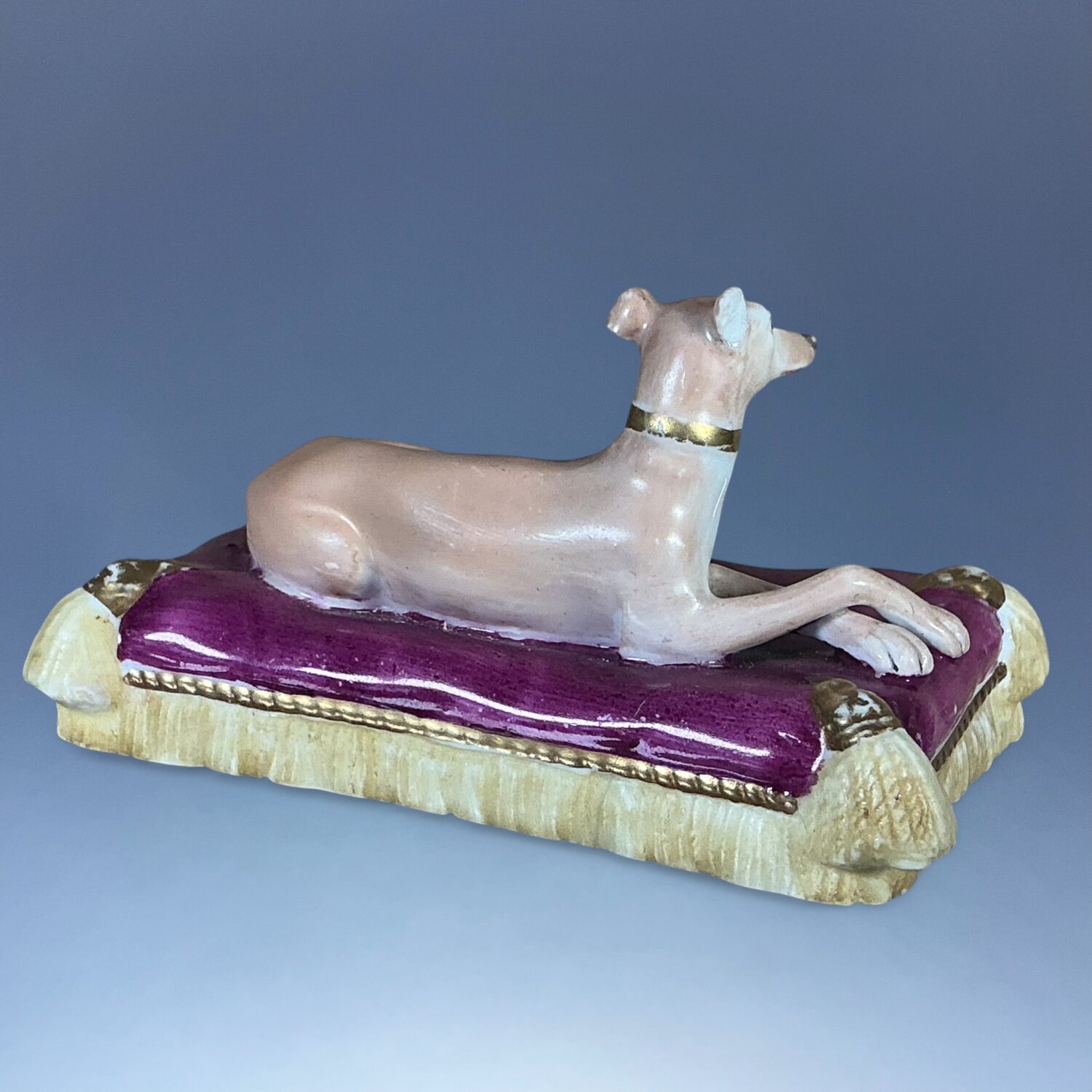 19th century Minton porcelain model of a recumbent Greyhound  or Whippet, on a rectangular, magenta coloured cushion base with yellow tassels and gilding.