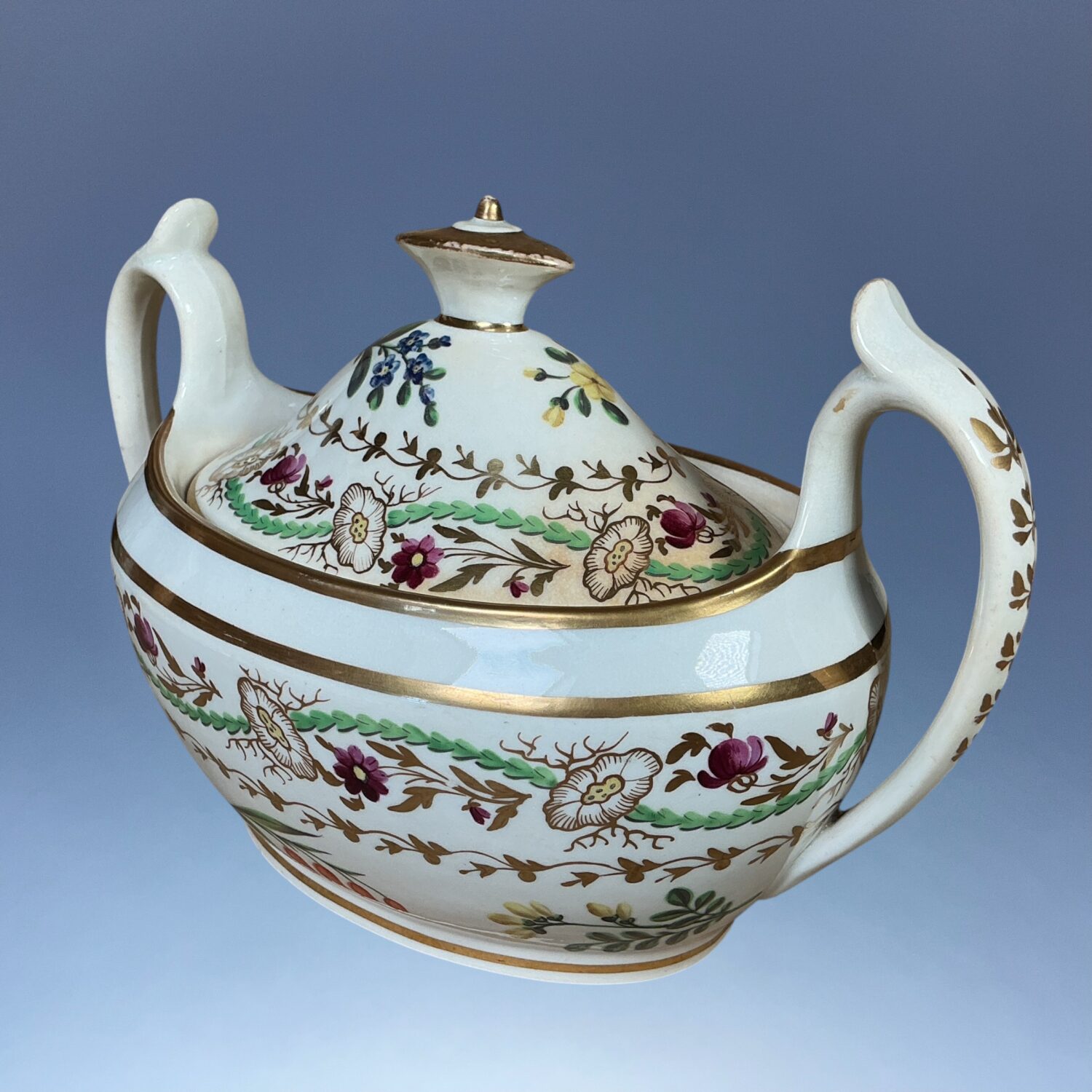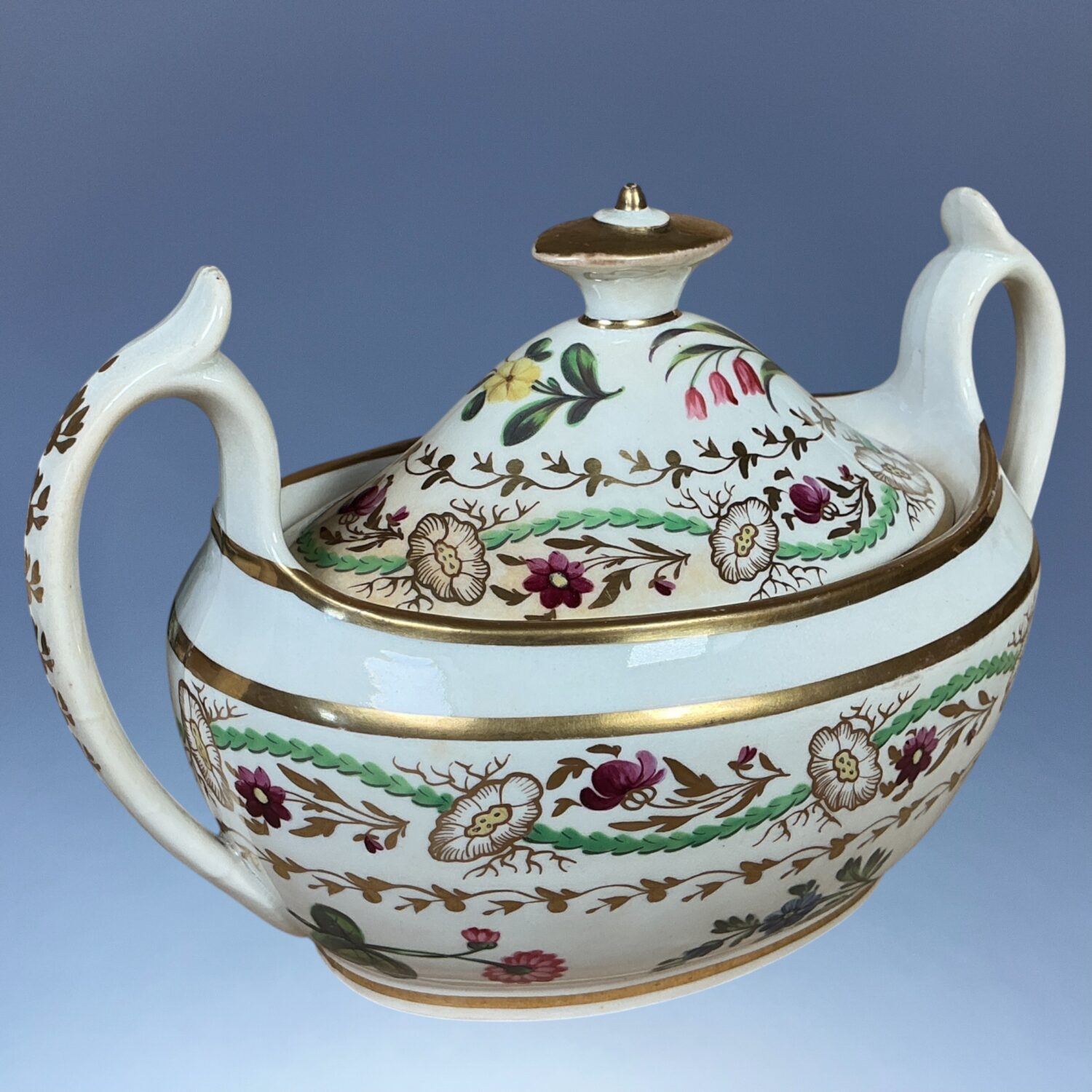 Early Minton porcelain two handled, oval sucrier and cover, decorated with individual botanical specimens and stylised flowers in gilt and monochrome enamel.
