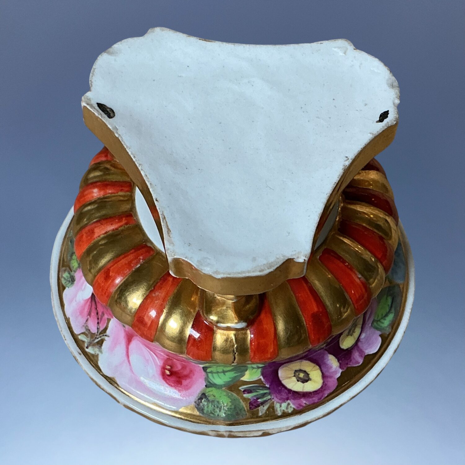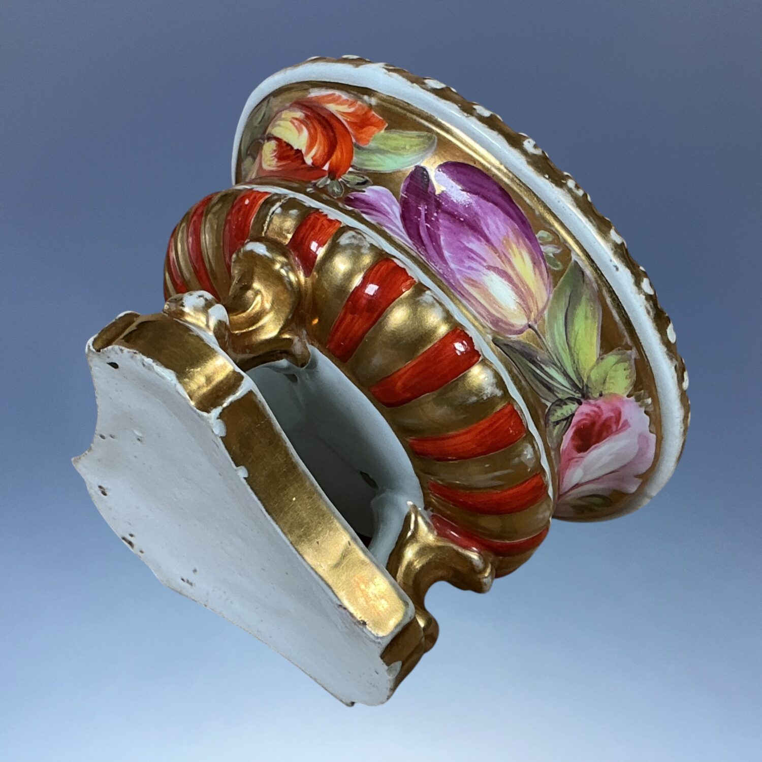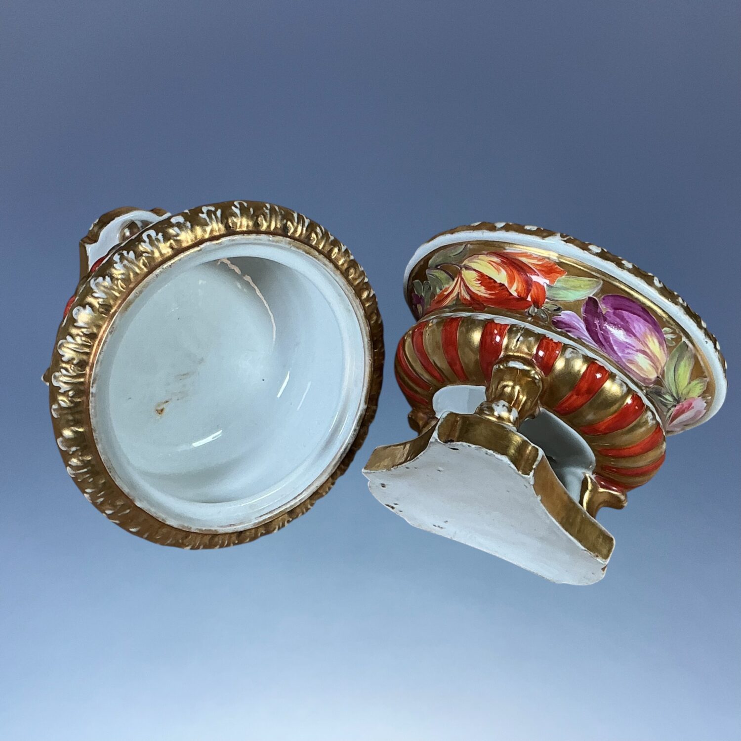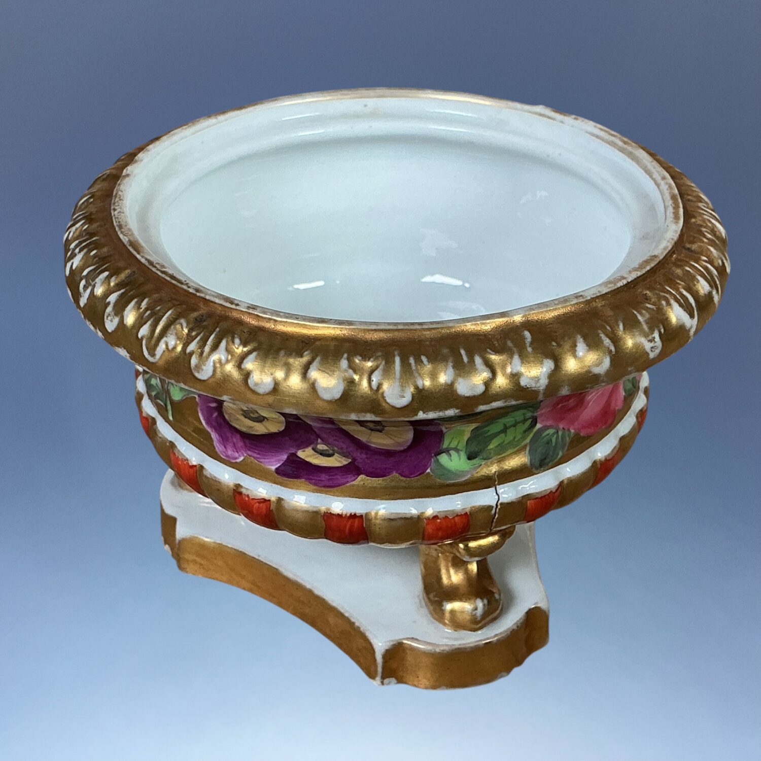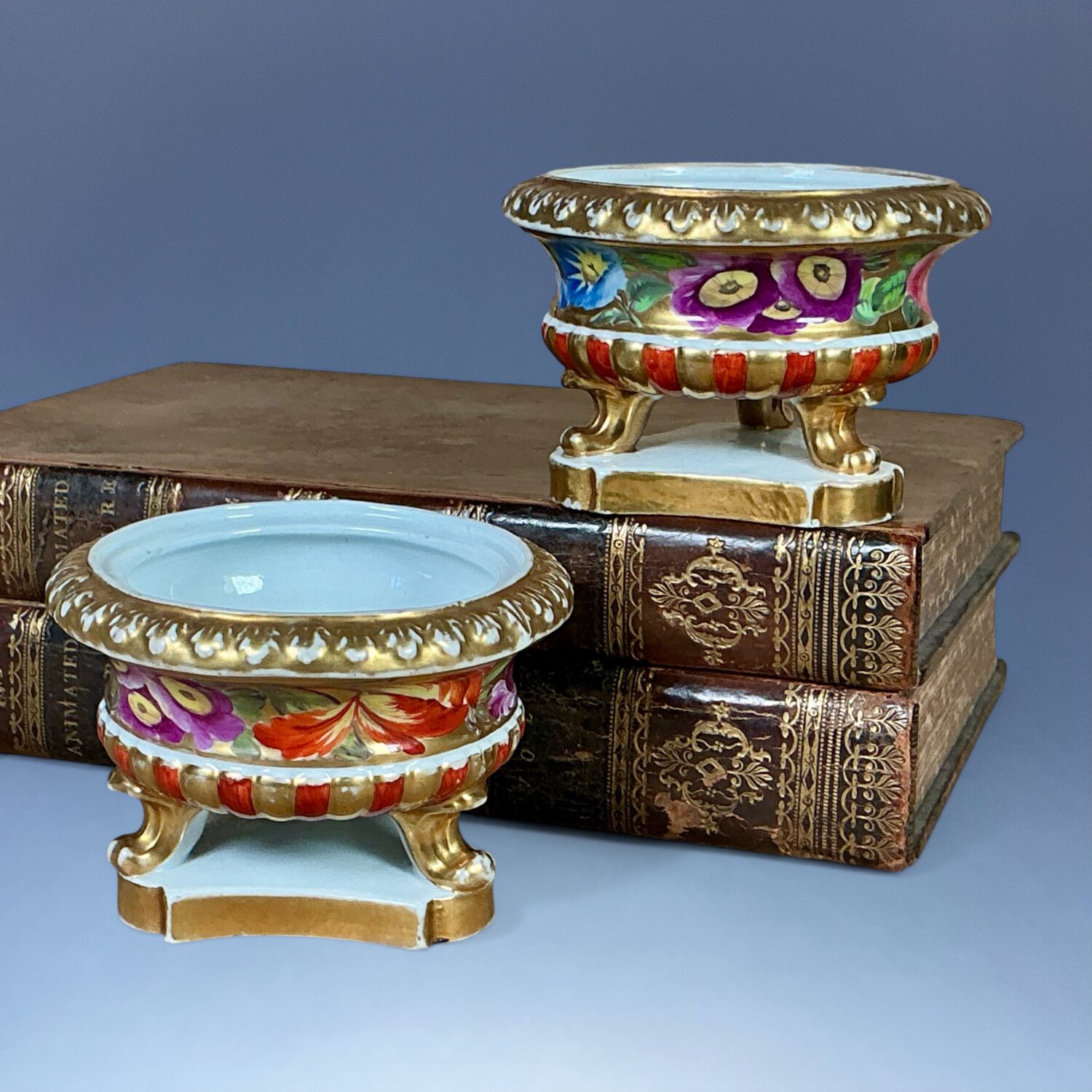 Pair of early 19th century English porcelain small bowls, standing on tree scroll moulded feet and with shaped triangular bases, decorated with hand painted flowers on a gilt background. One is pierced in the bottom. (Without lids)