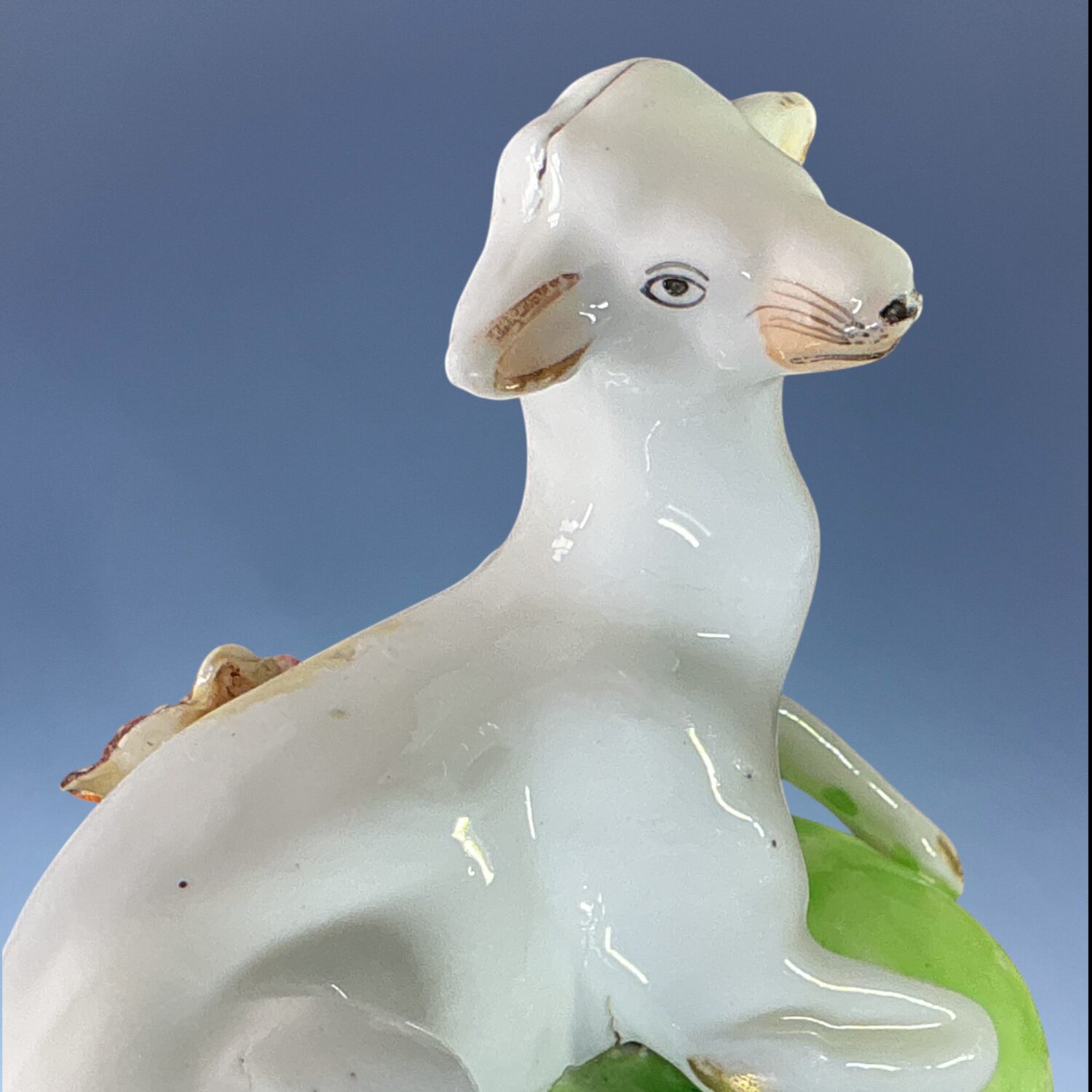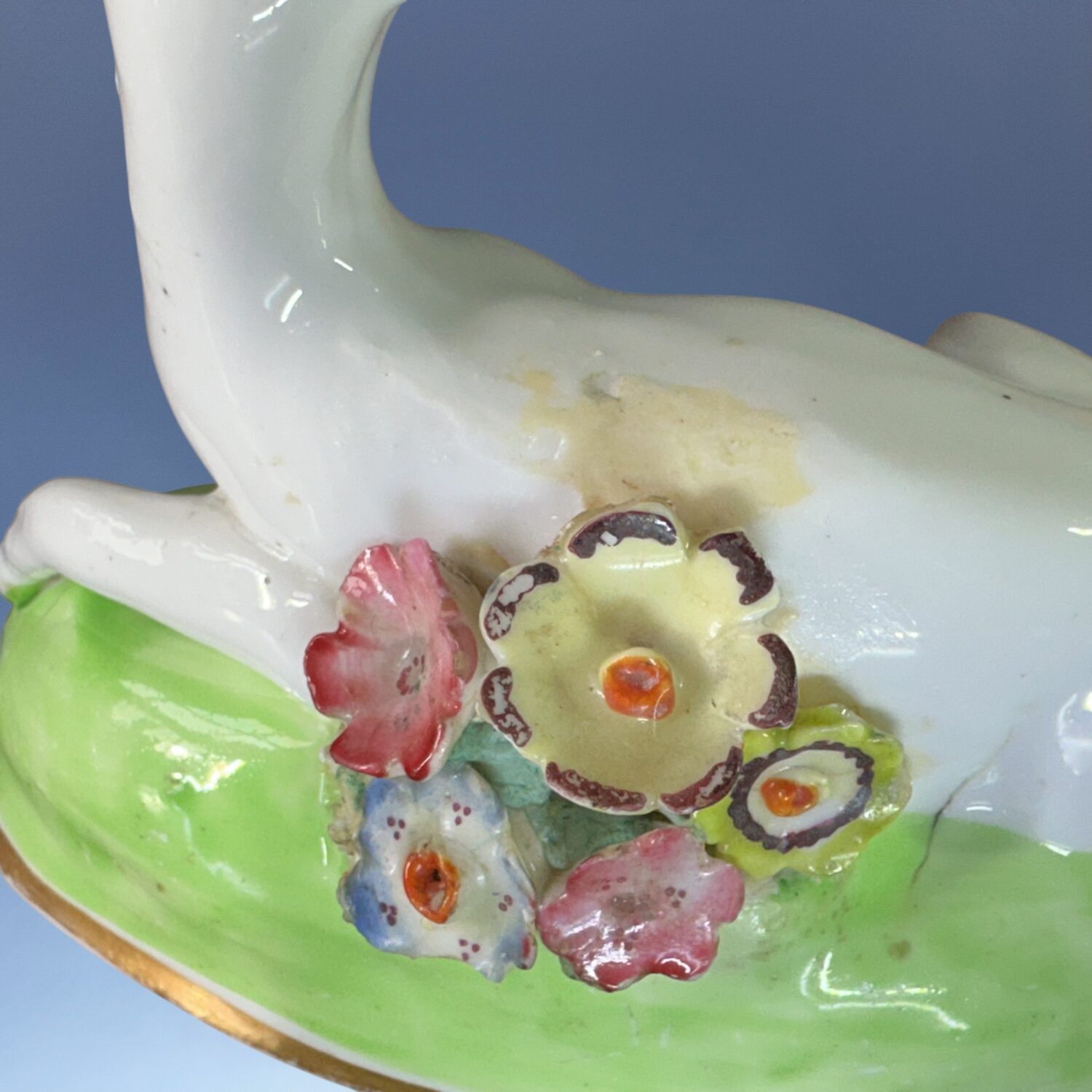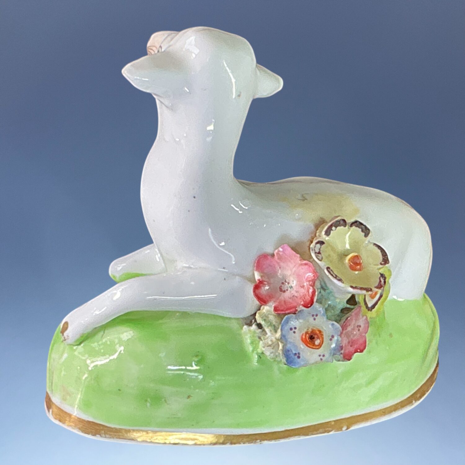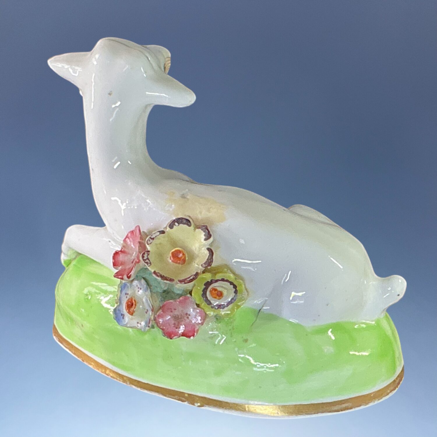 19th century Staffordshire porcelain model of a recumbent deer, on a lime green mound base with gilt line and applied flowers at the back..