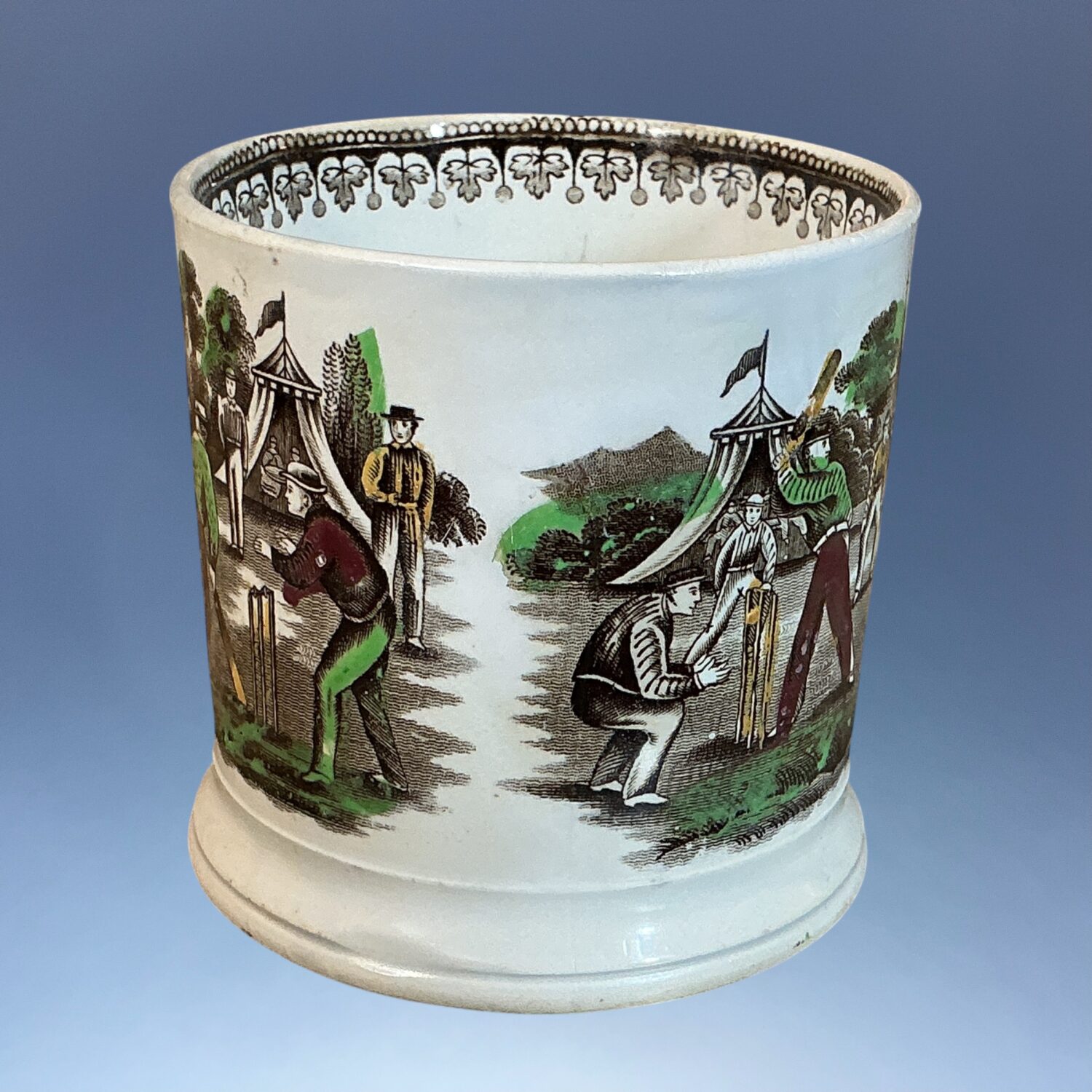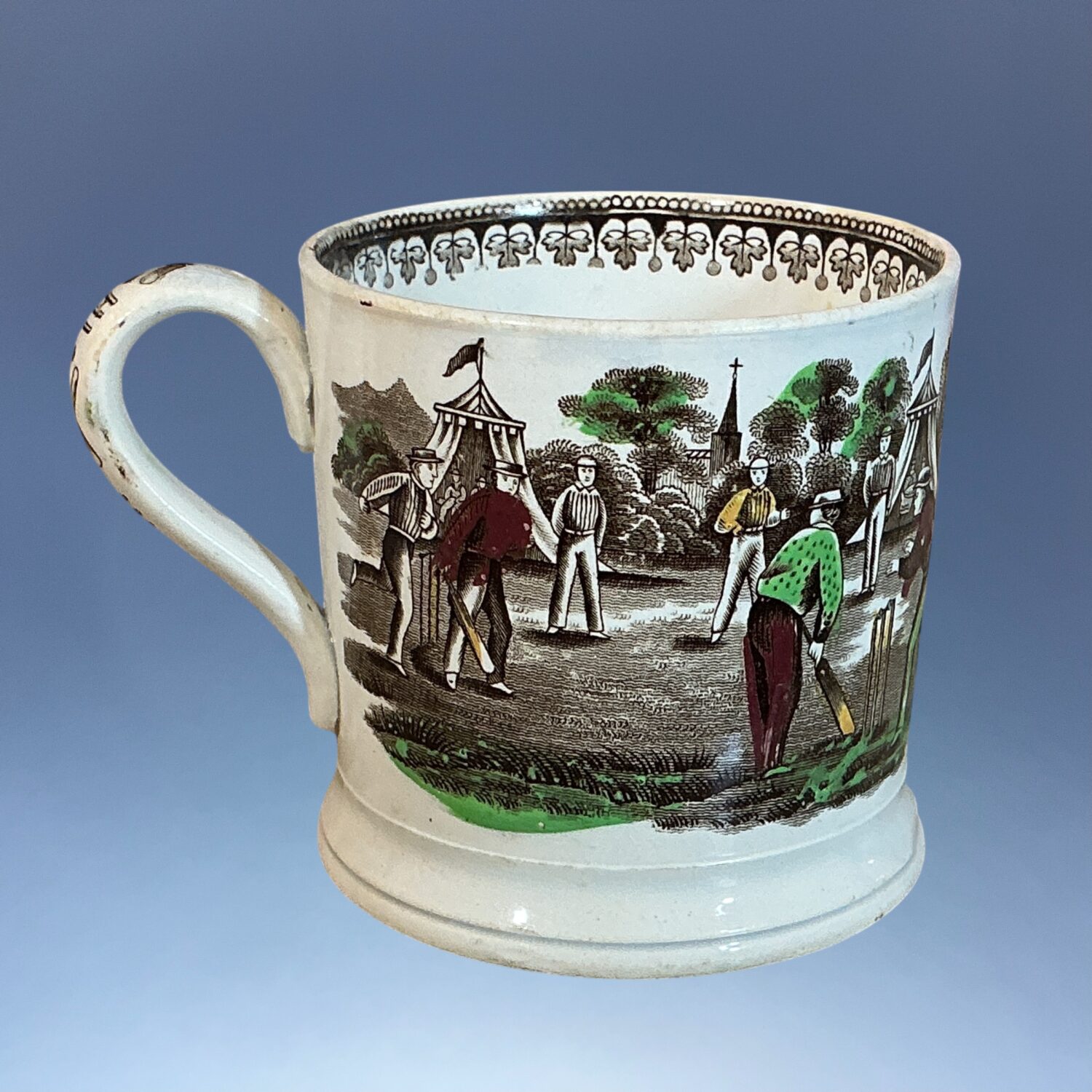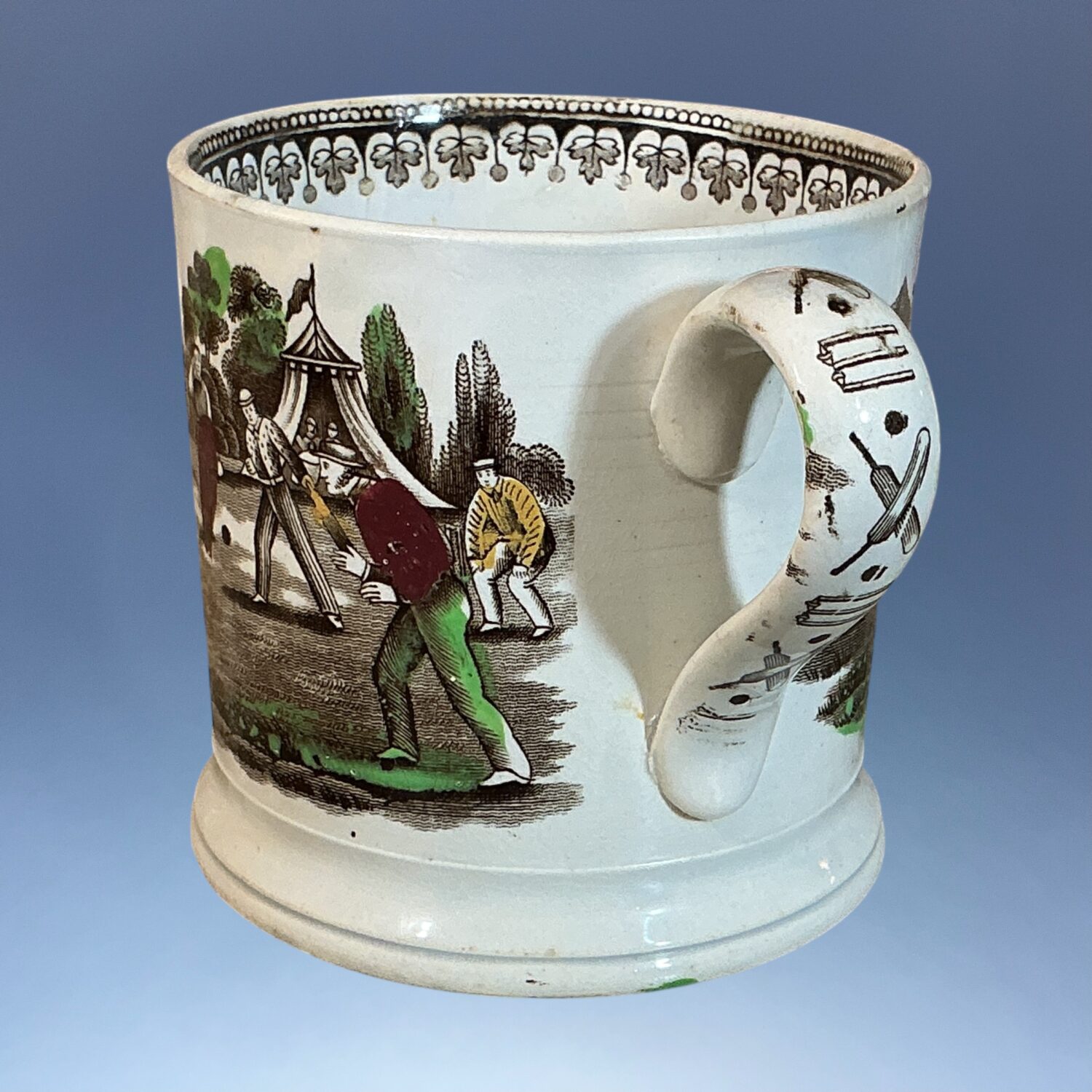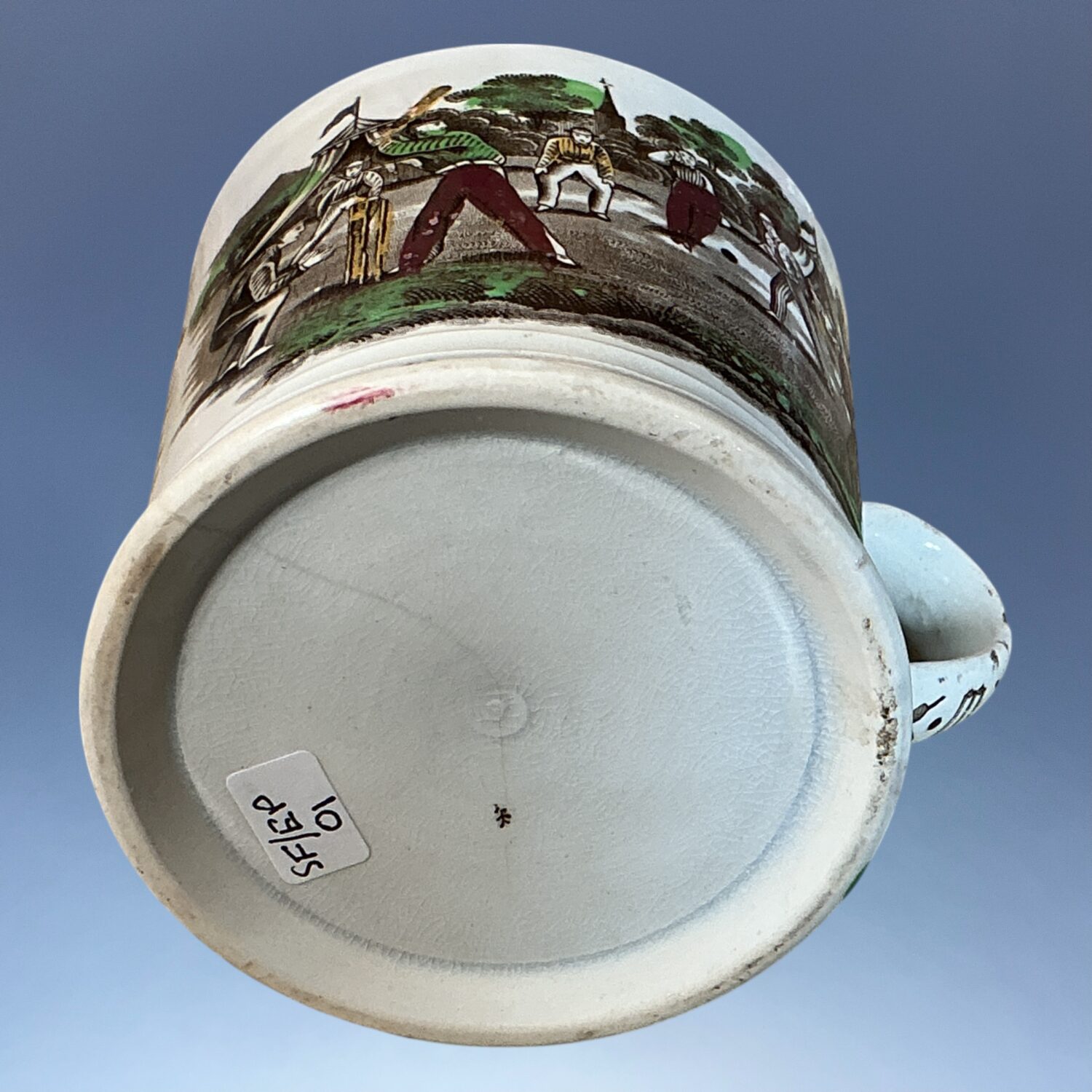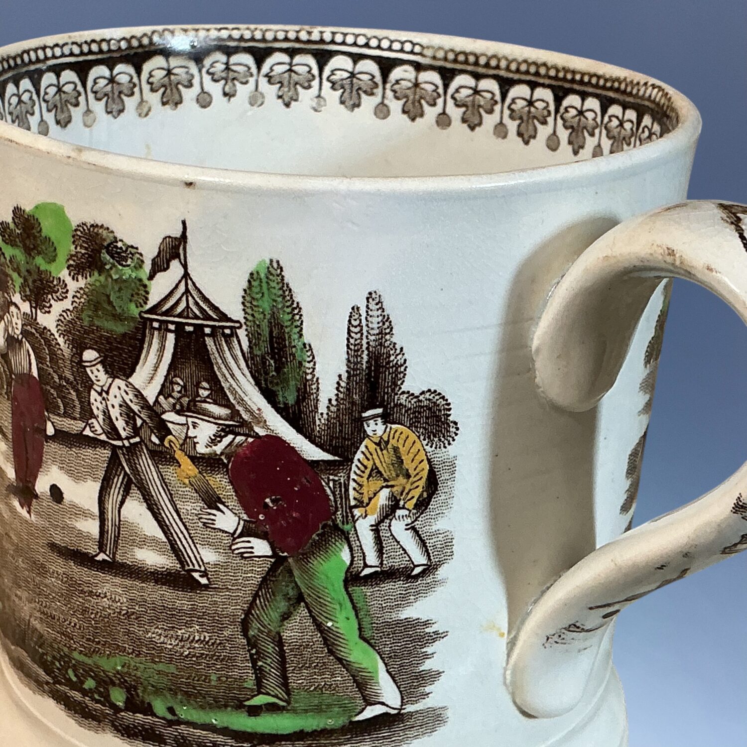 Mid 19th century Staffordshire earthenware cider mug, with transfer printed scenes of a Cricket match, printed in dark brown and coloured in with enamels.