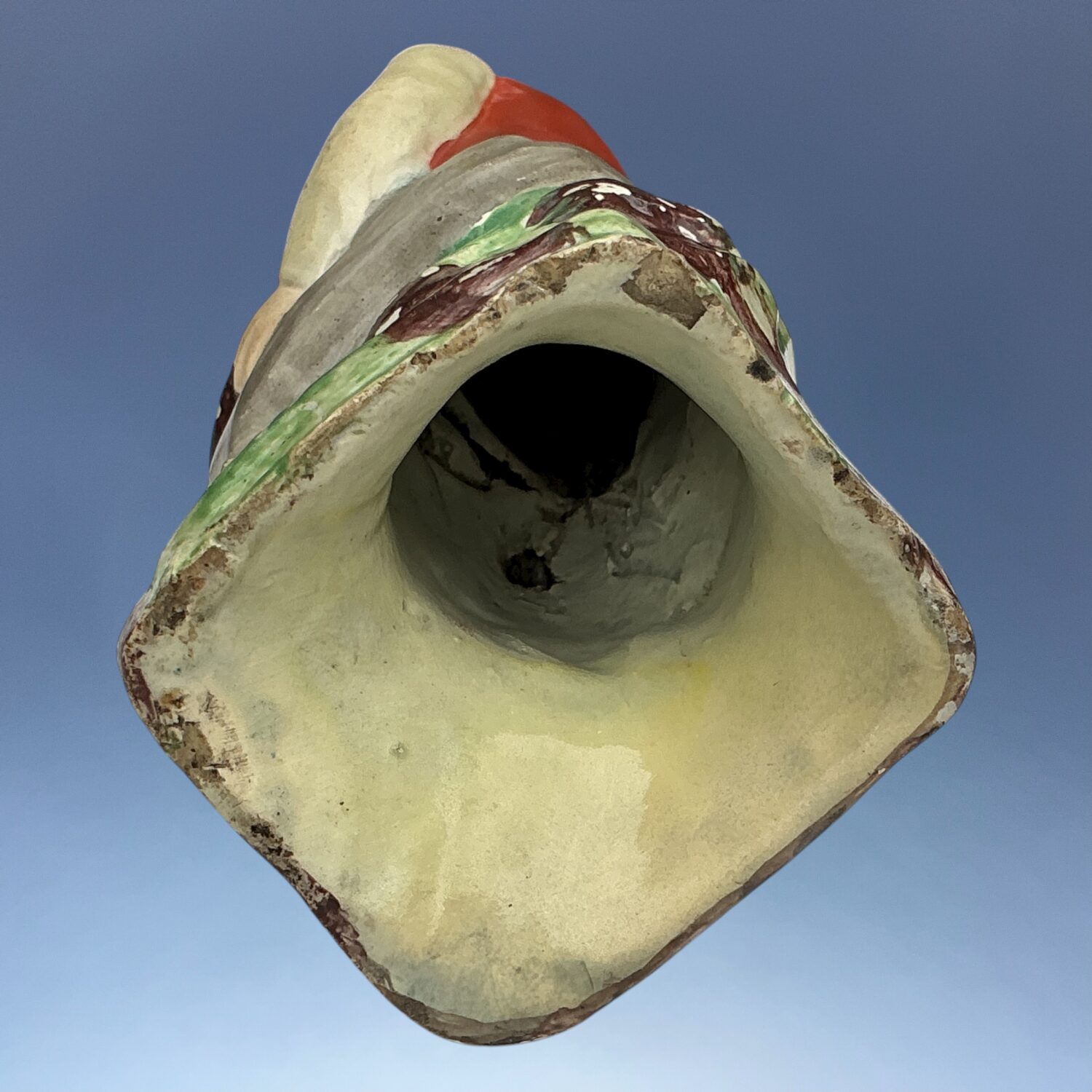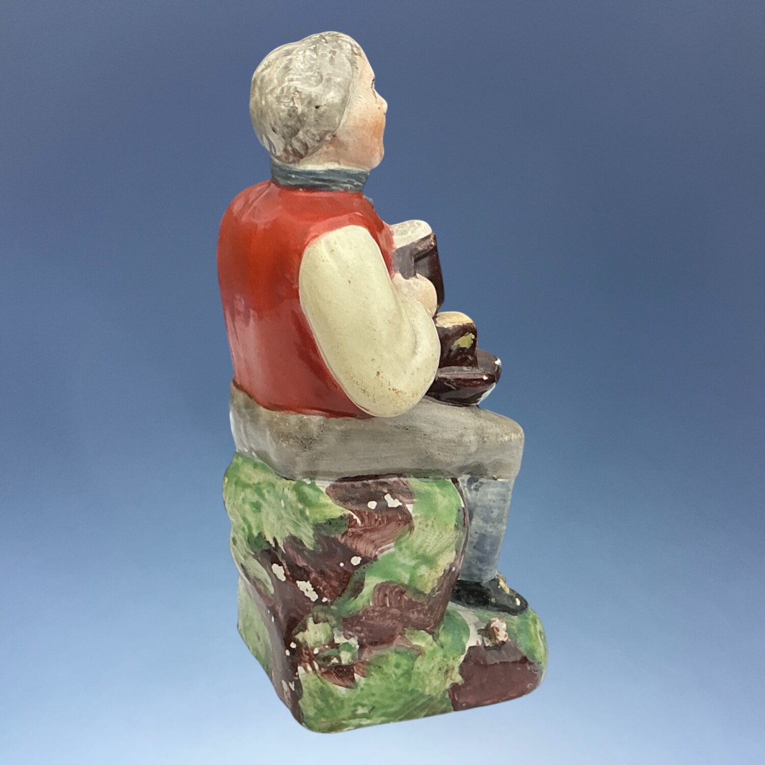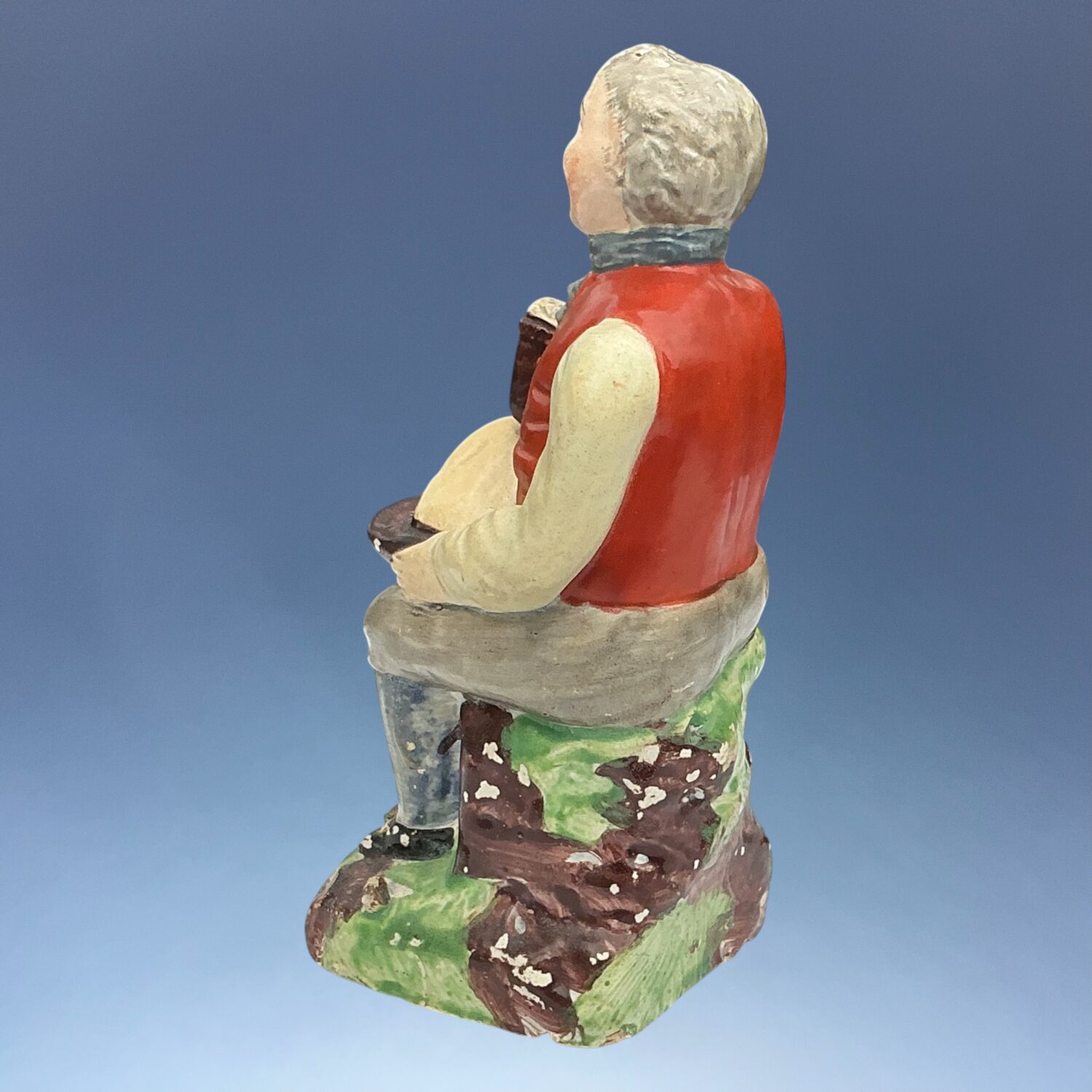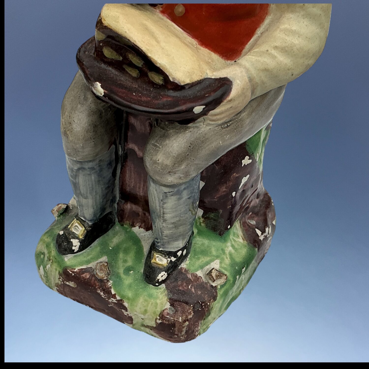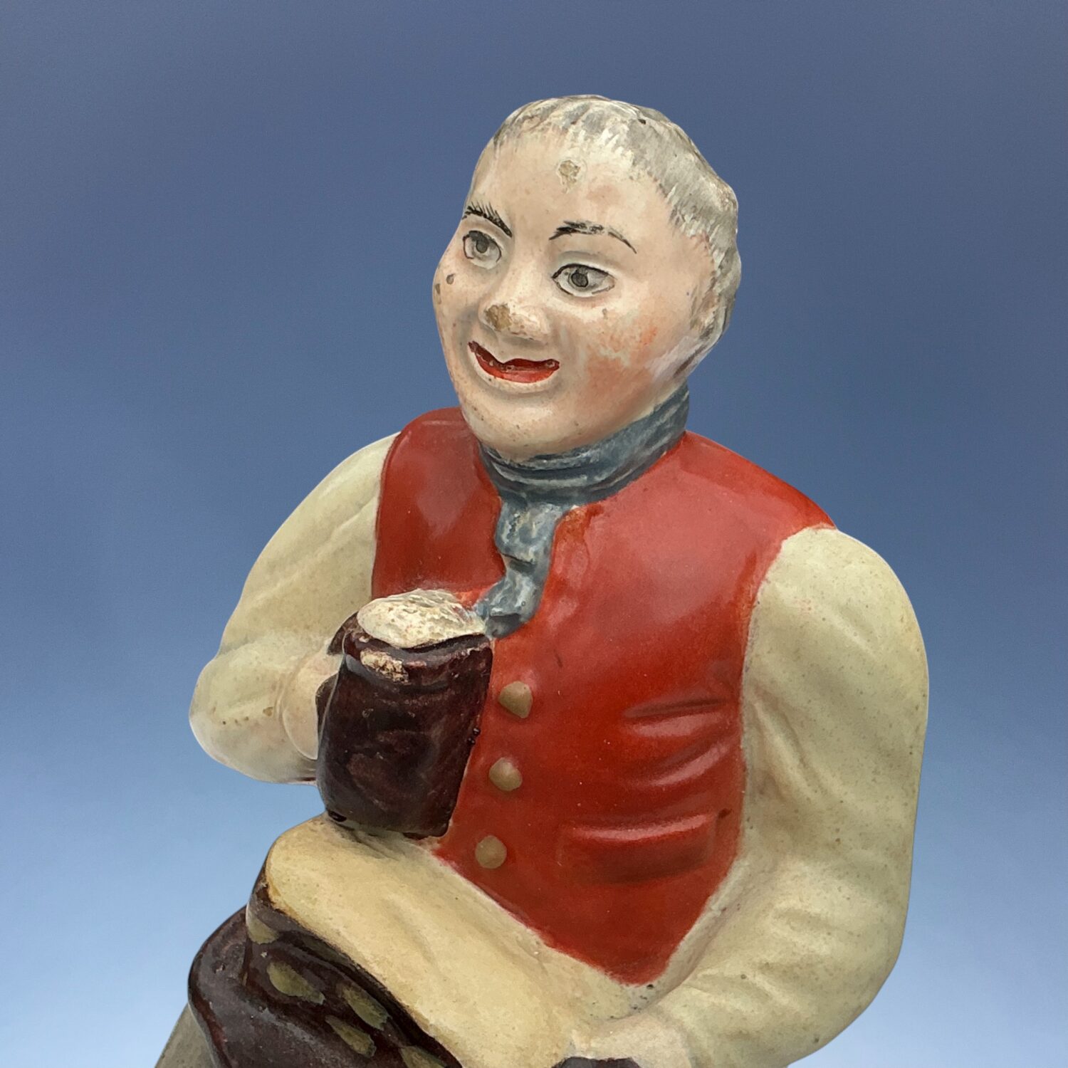 Early 19th century Staffordshire pottery seated figure of John Bull, holding a foaming mug of beer and a plate with a side of beef on his lap.