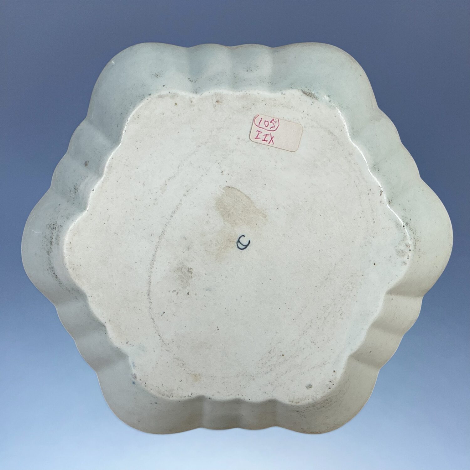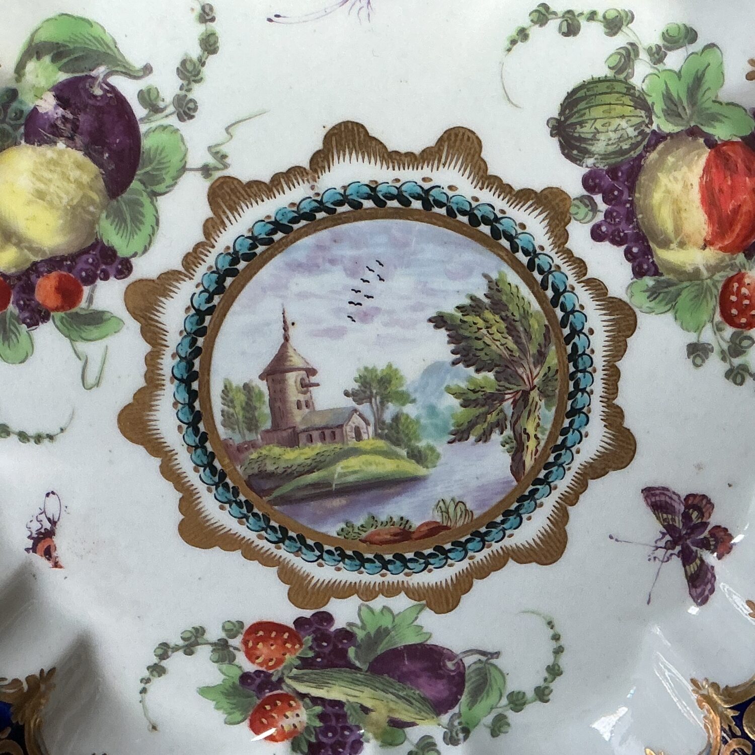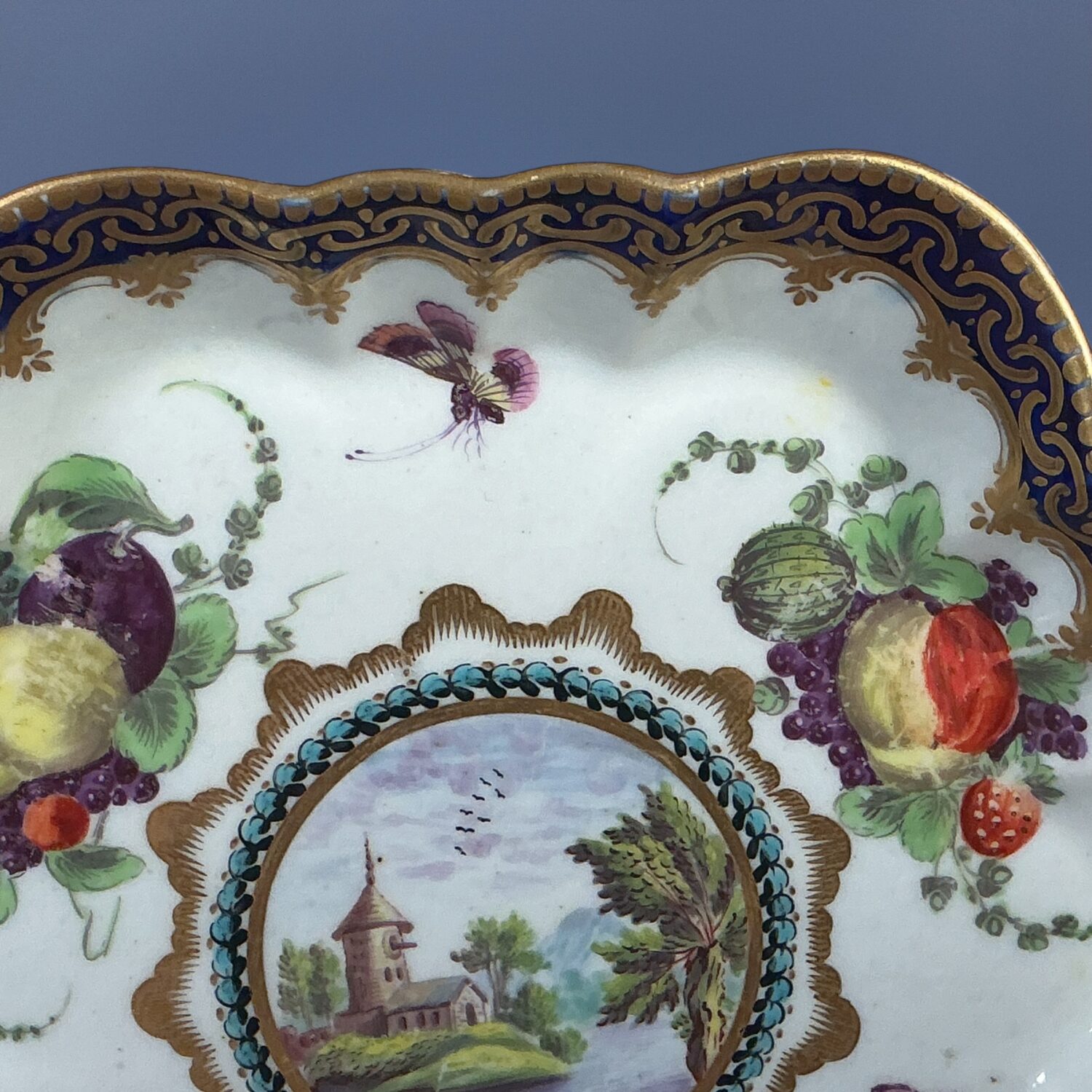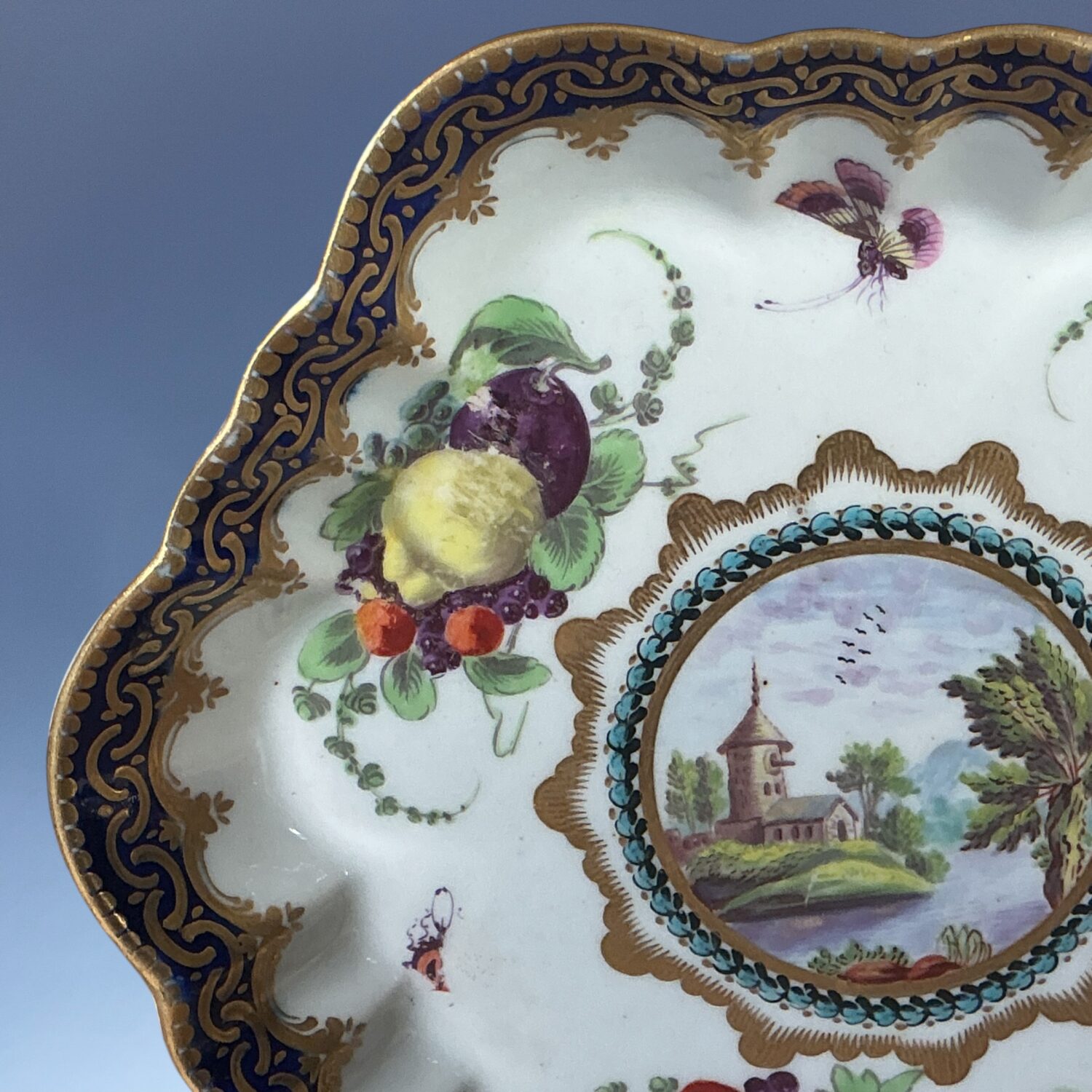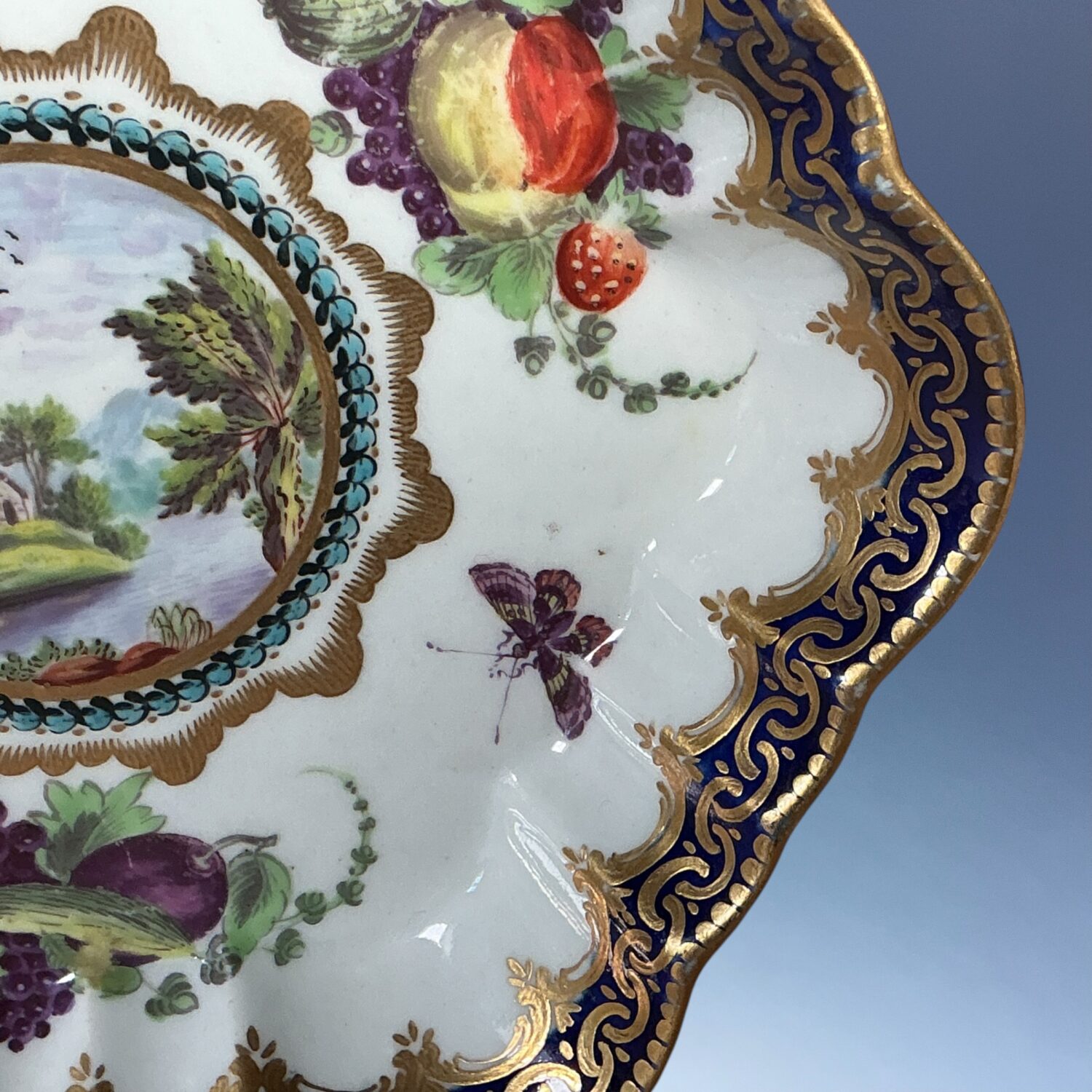 A very decorative 18th century Worcester (Dr Wall/1st period) porcelain hexagonal teapot-stand, decorated with the ‘Lord Henry Thynne’ type pattern, a central riverscape reserve with turquoise ‘husk’ border, colourful groups of fruit and scattered insects.