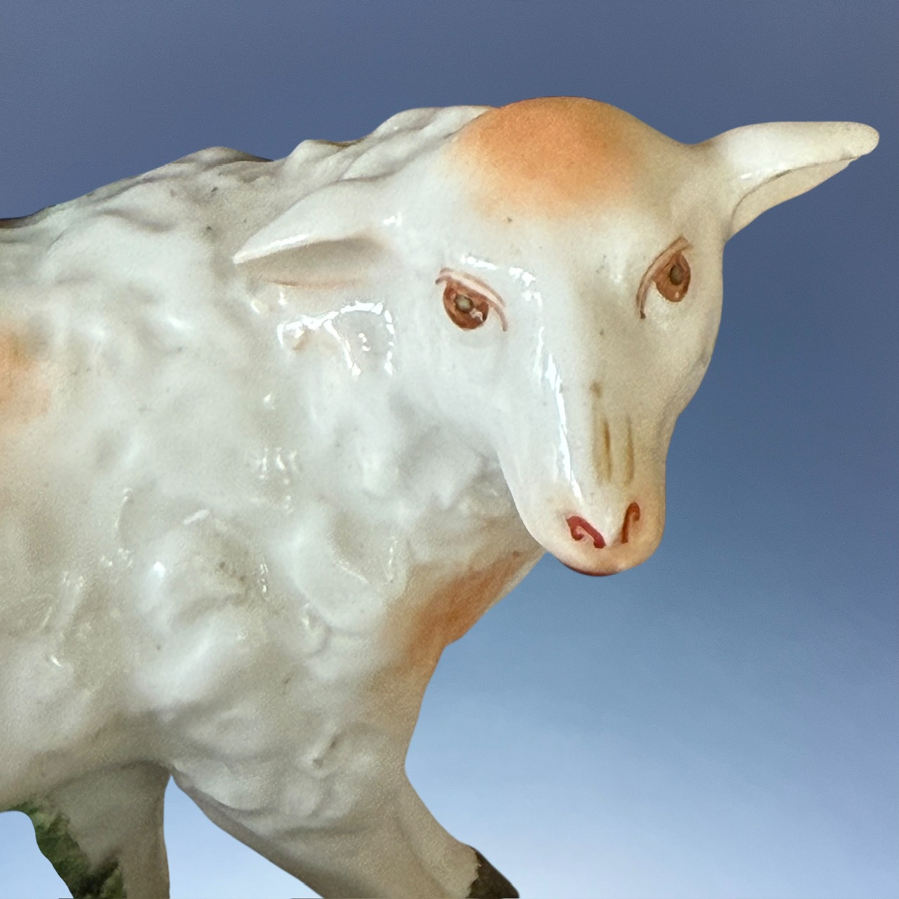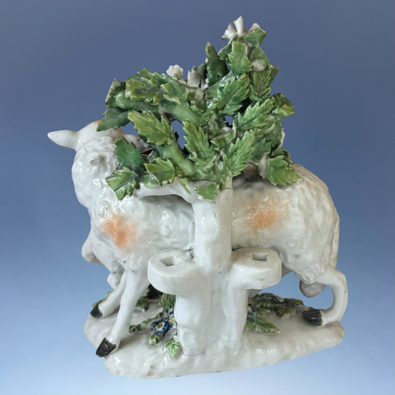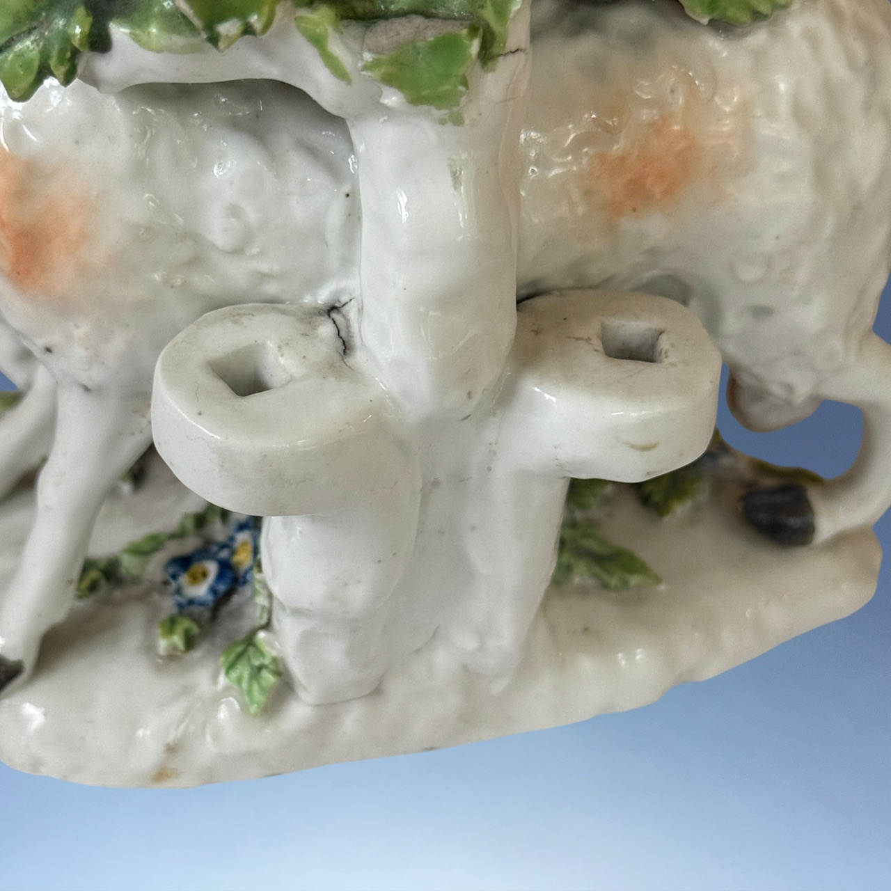18th century Derby porcelain large group of a ewe and lamb, on a mound base with applied flowers and bocage. The back of the bocage has two holders for optional/detachable candle sconce supports.