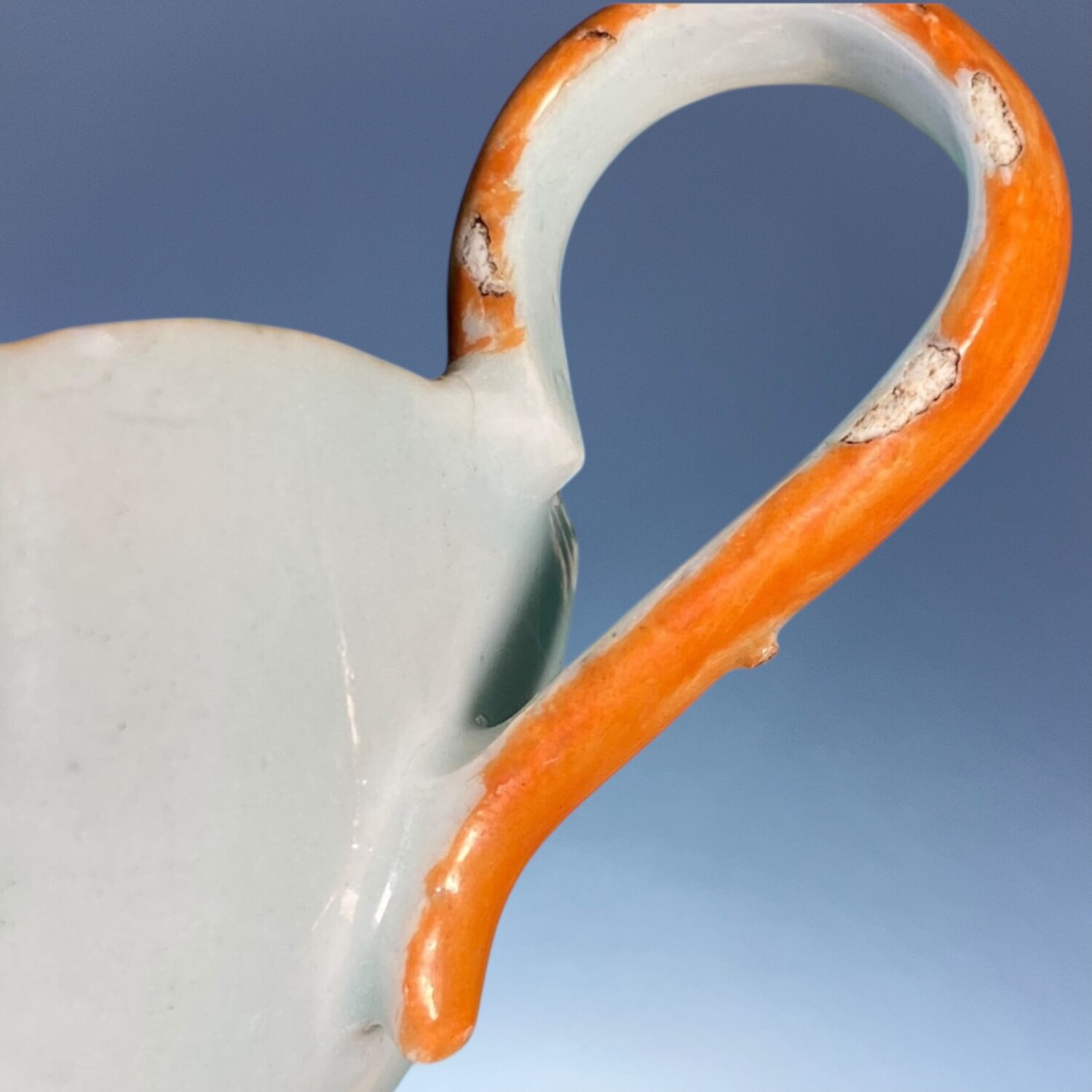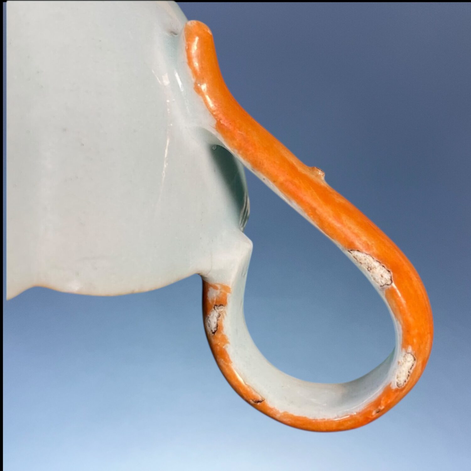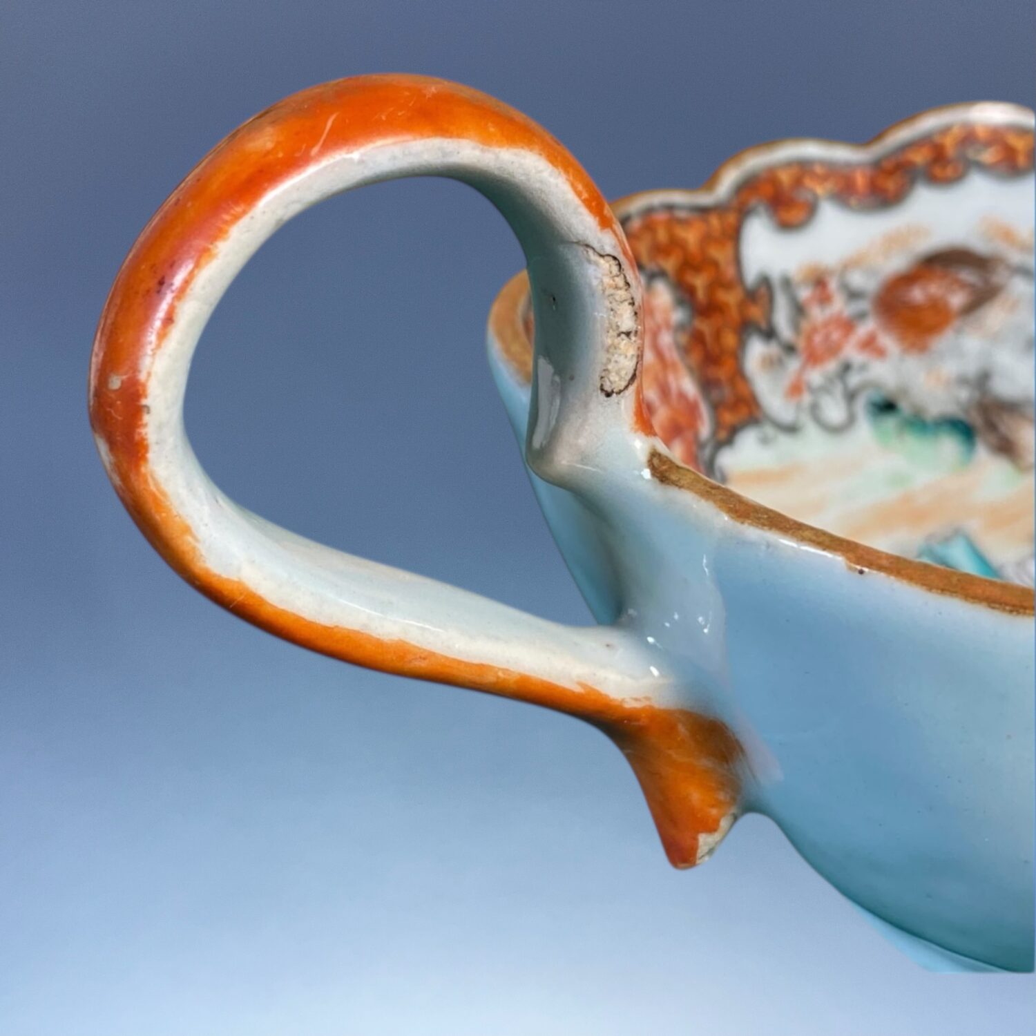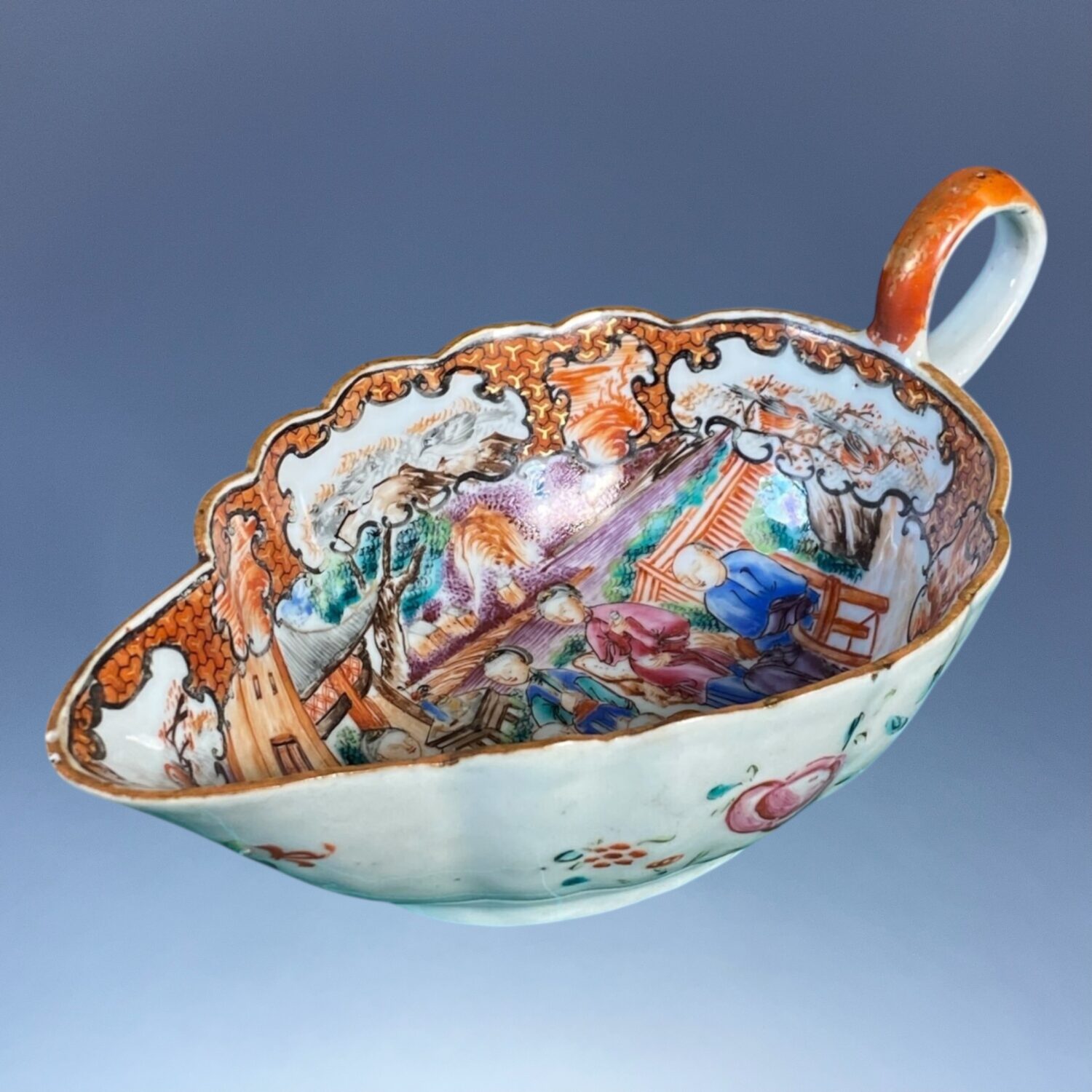 A good pair of 18th century Chinese export porcelain sauceboats, with brightly coloured ‘Mandarin’ scenes painted in famille rose enamels and gilding, against an orange and gilt diaper ground pattern.