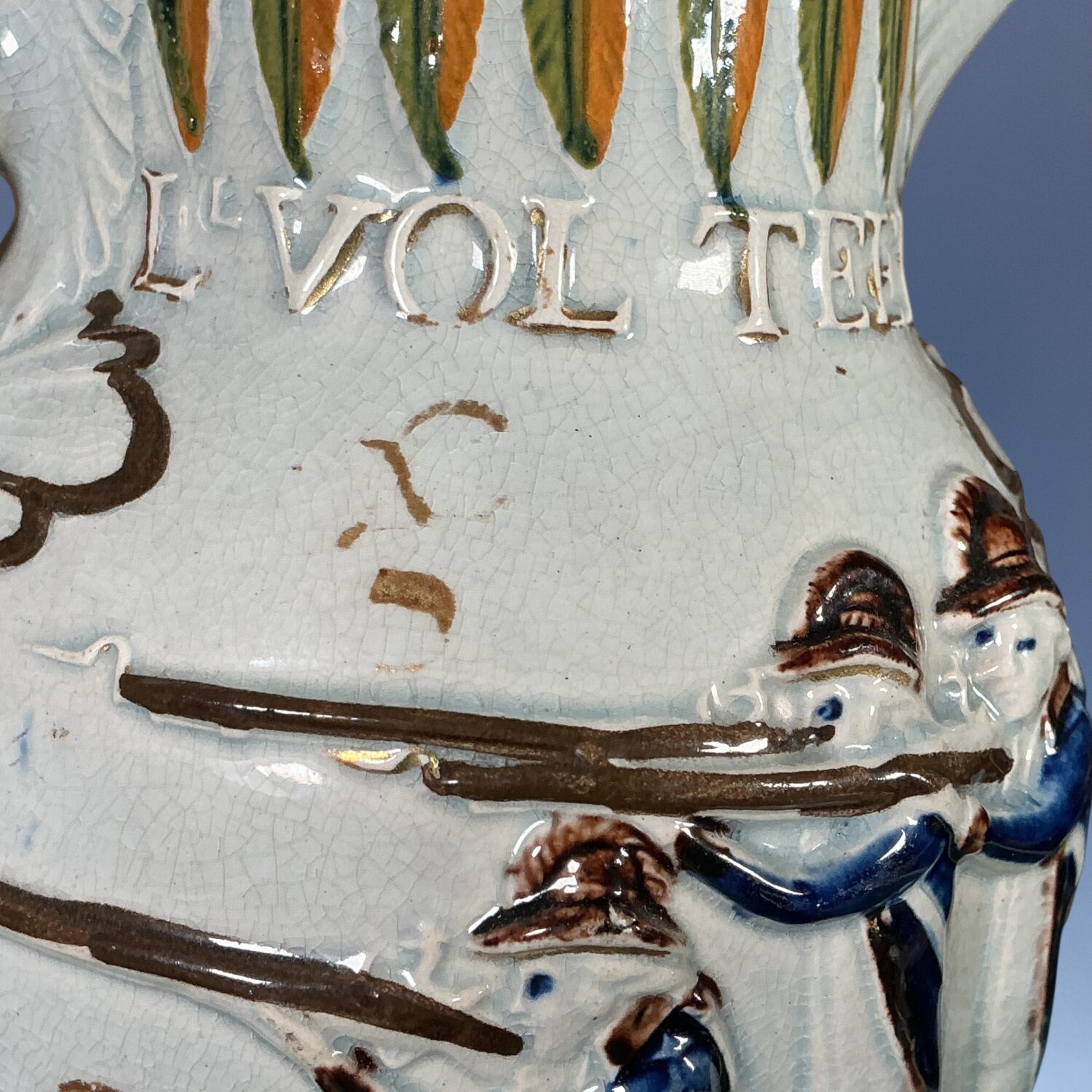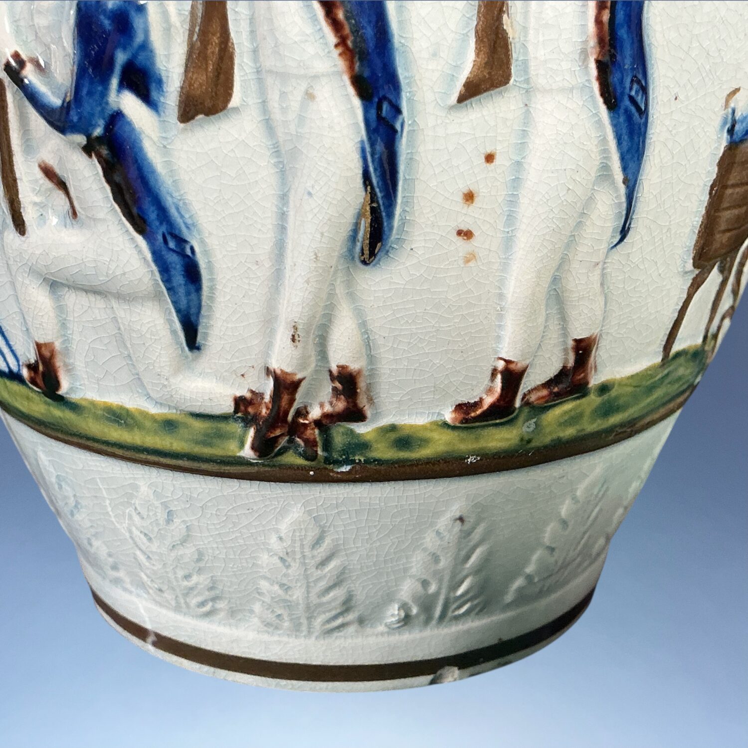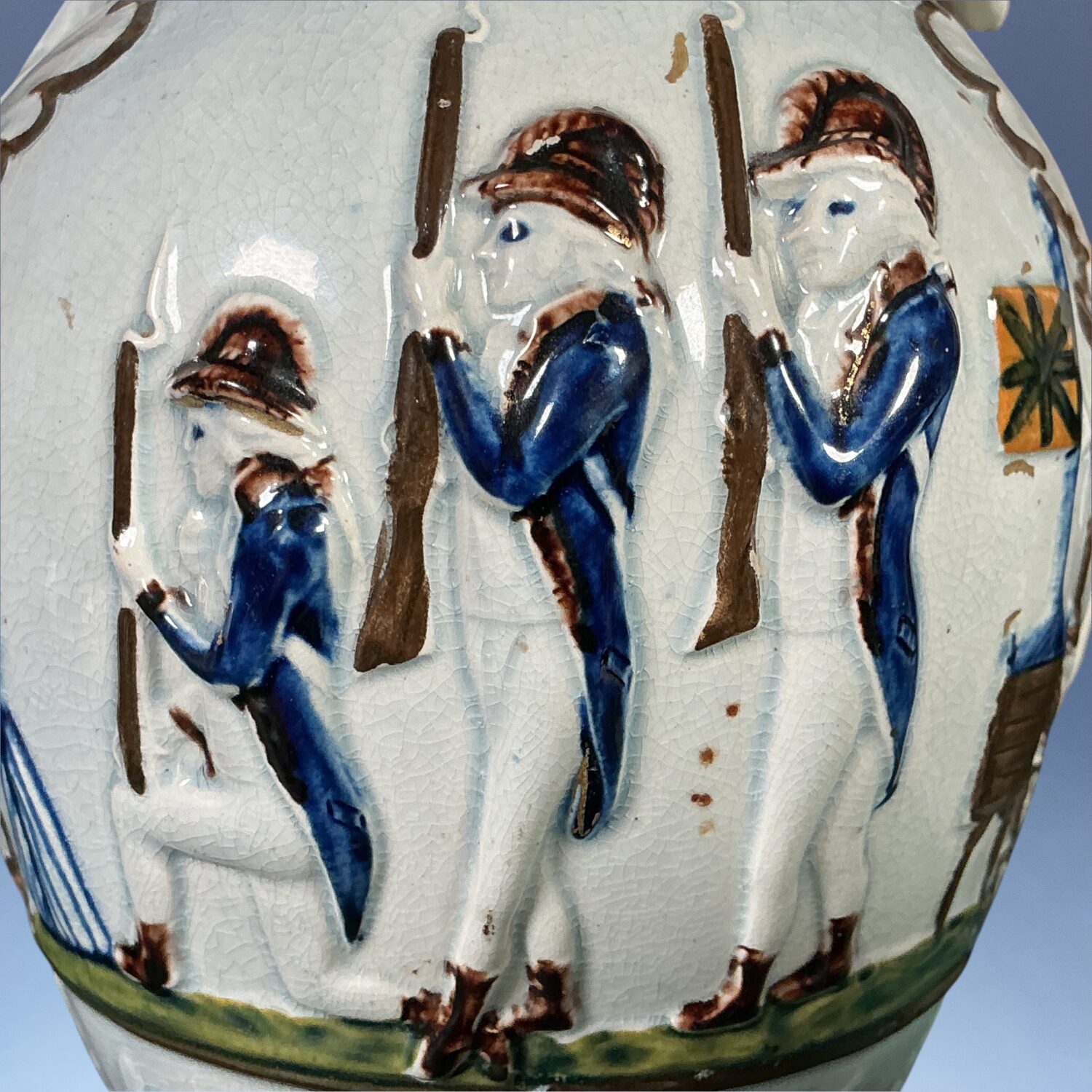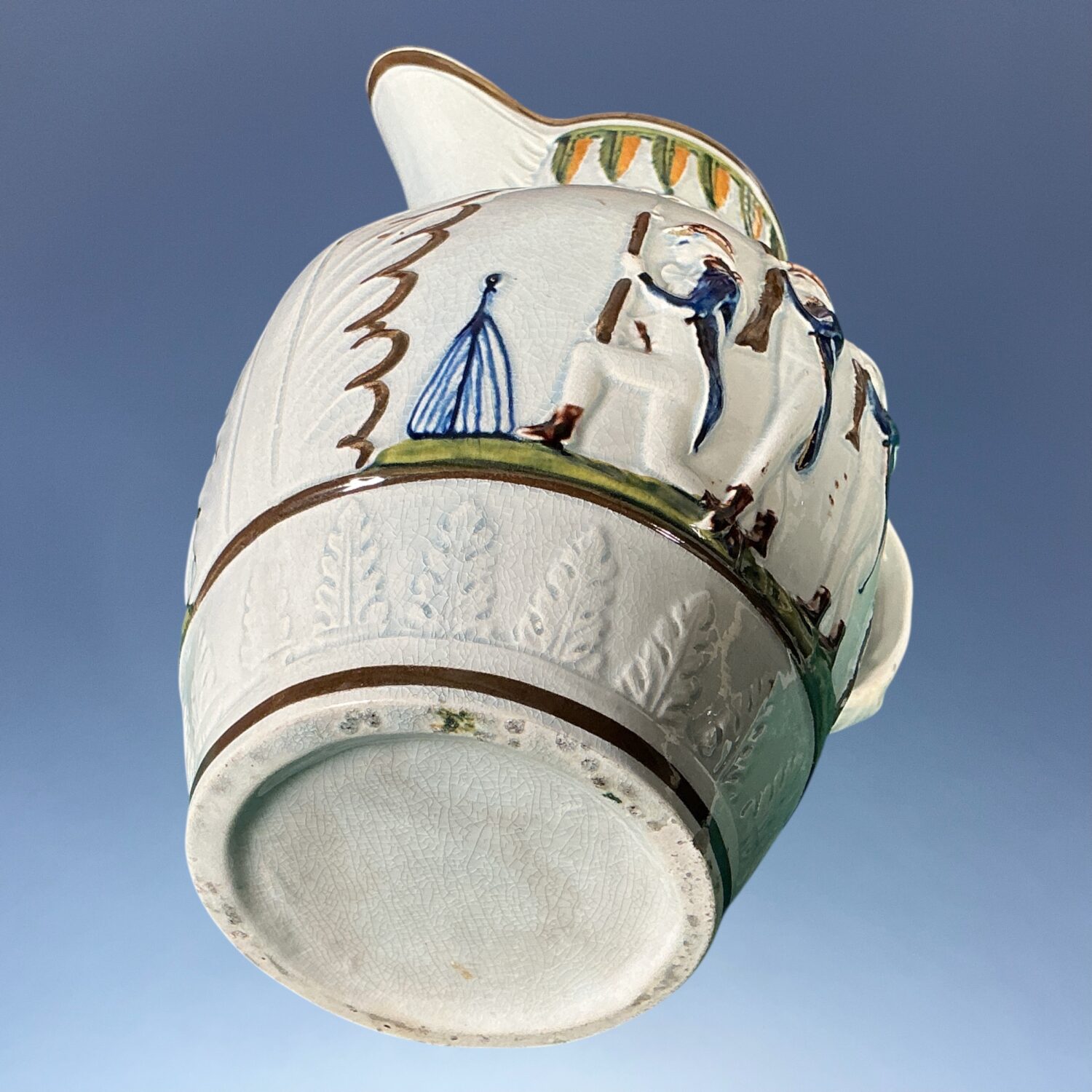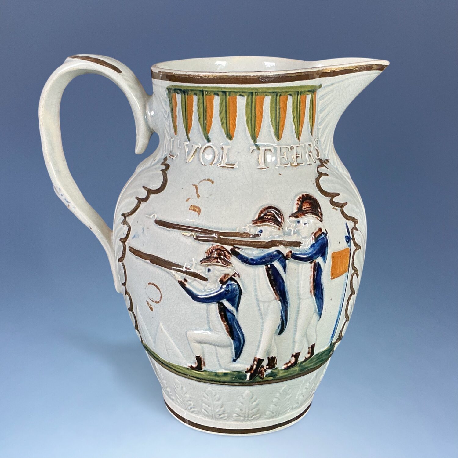 Early English, ‘Pratt Ware’ pottery jug with relief moulded decoration depicting ‘Loyal Volunteer’ soldiers, picked out in high temperature underglaze ‘Pratt type’ colours.