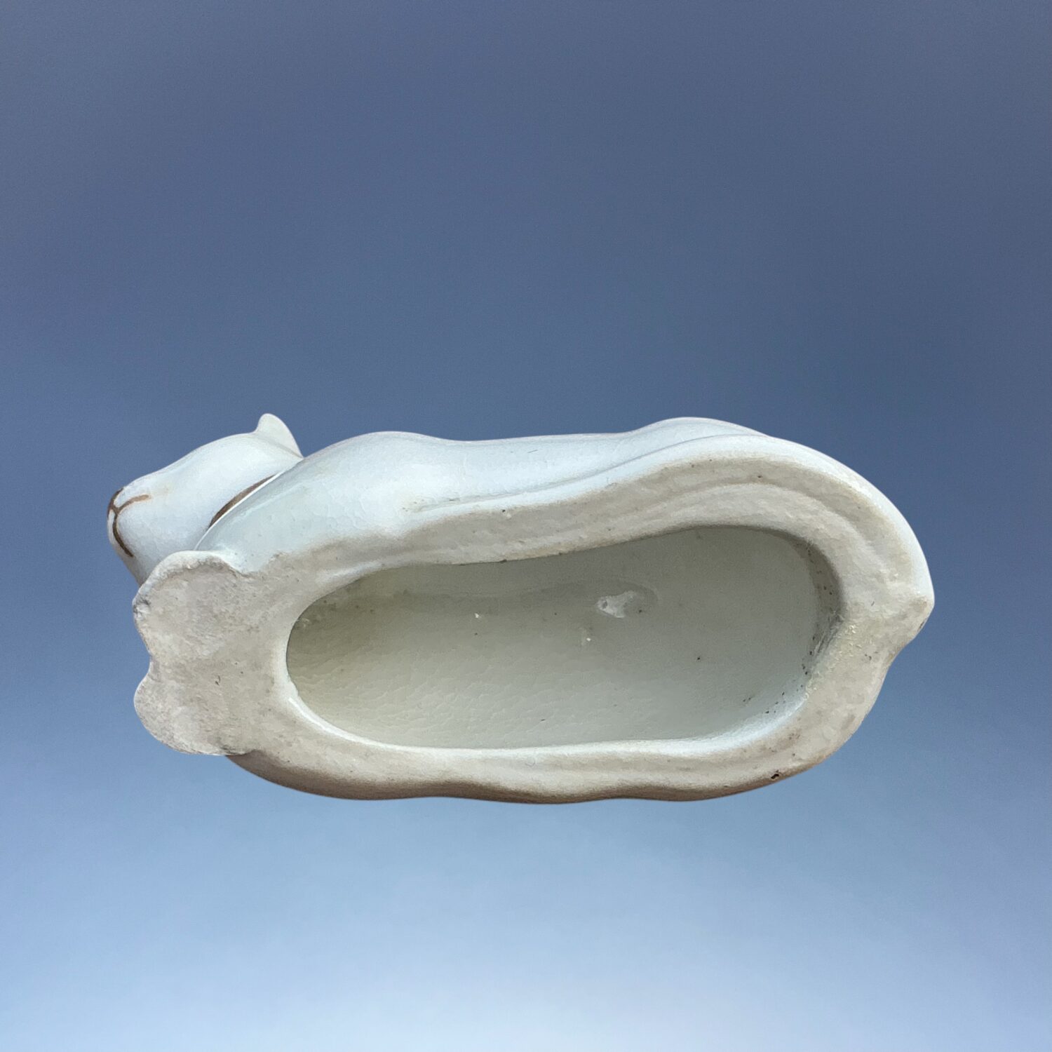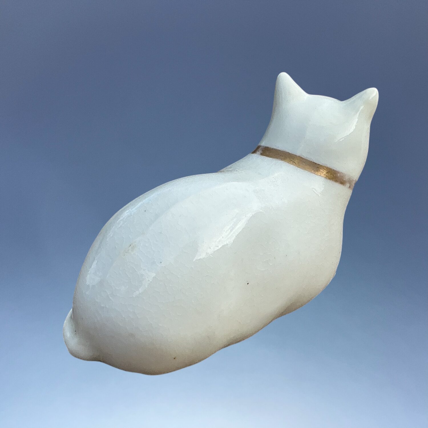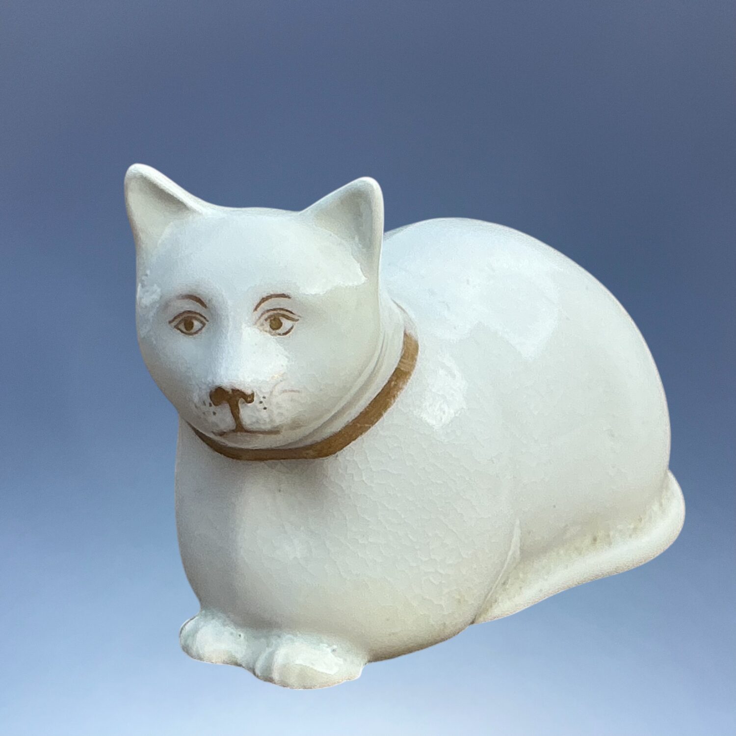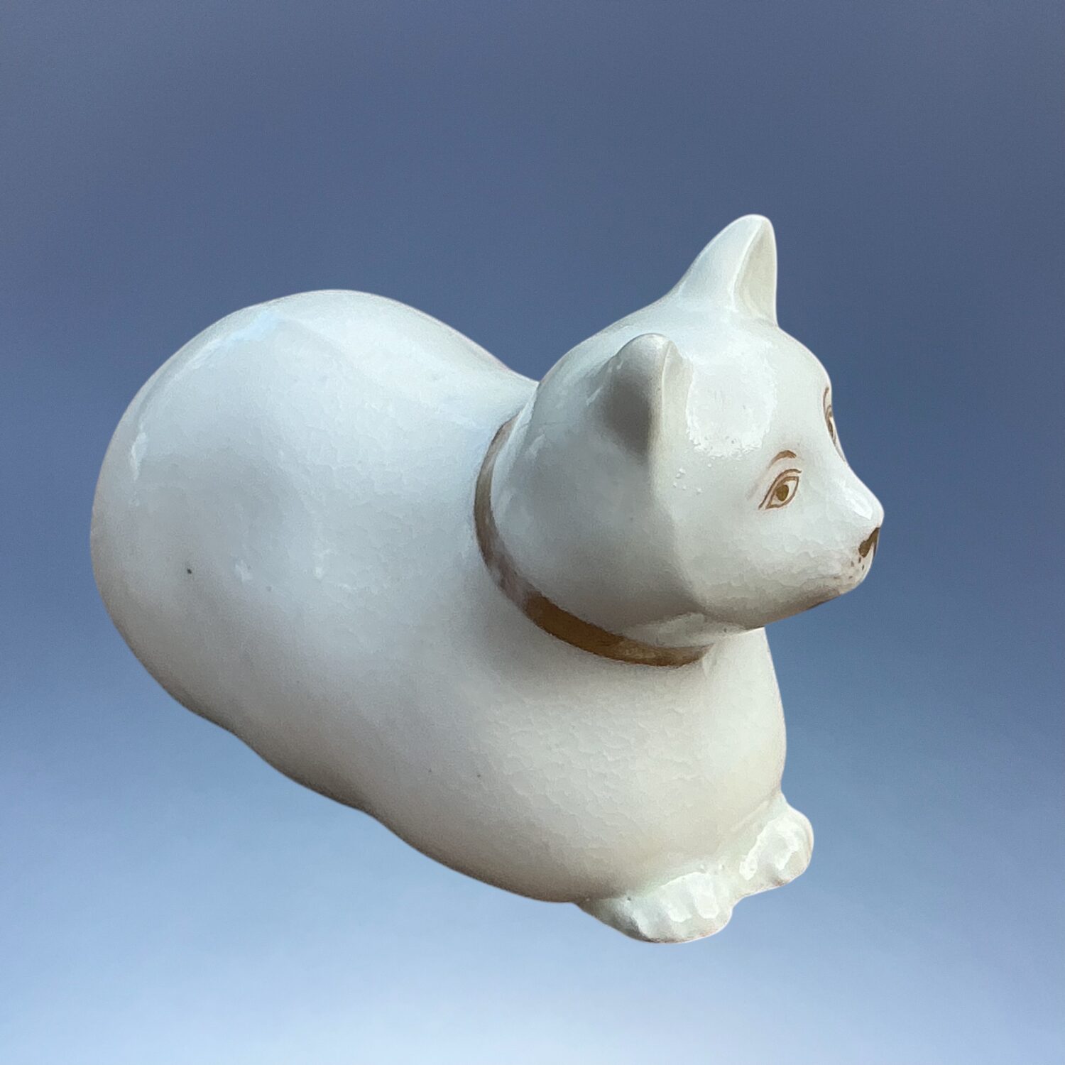 Early 19th century English porcelain model of a crouching cat, white with fine detail picked out in gilt.
